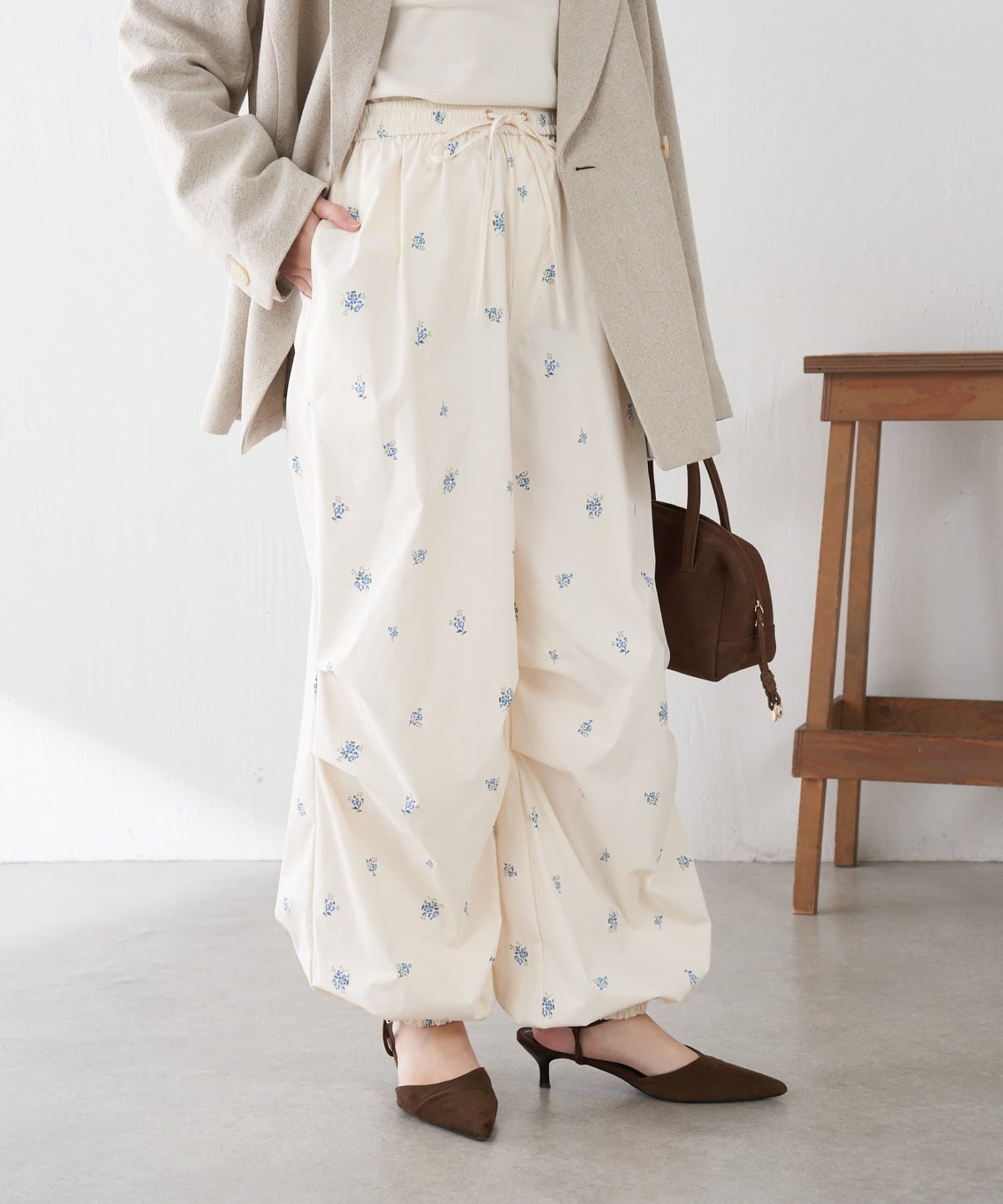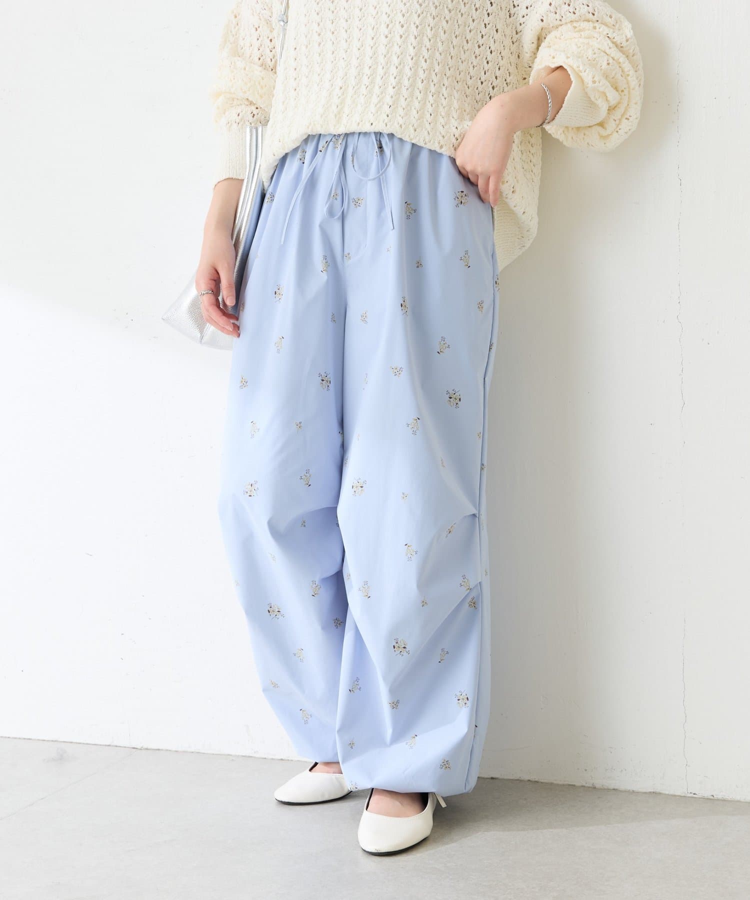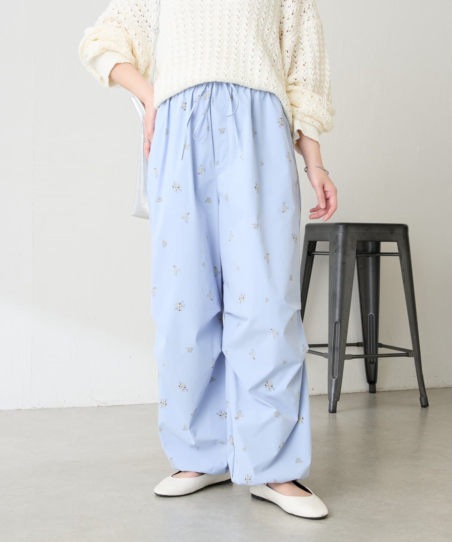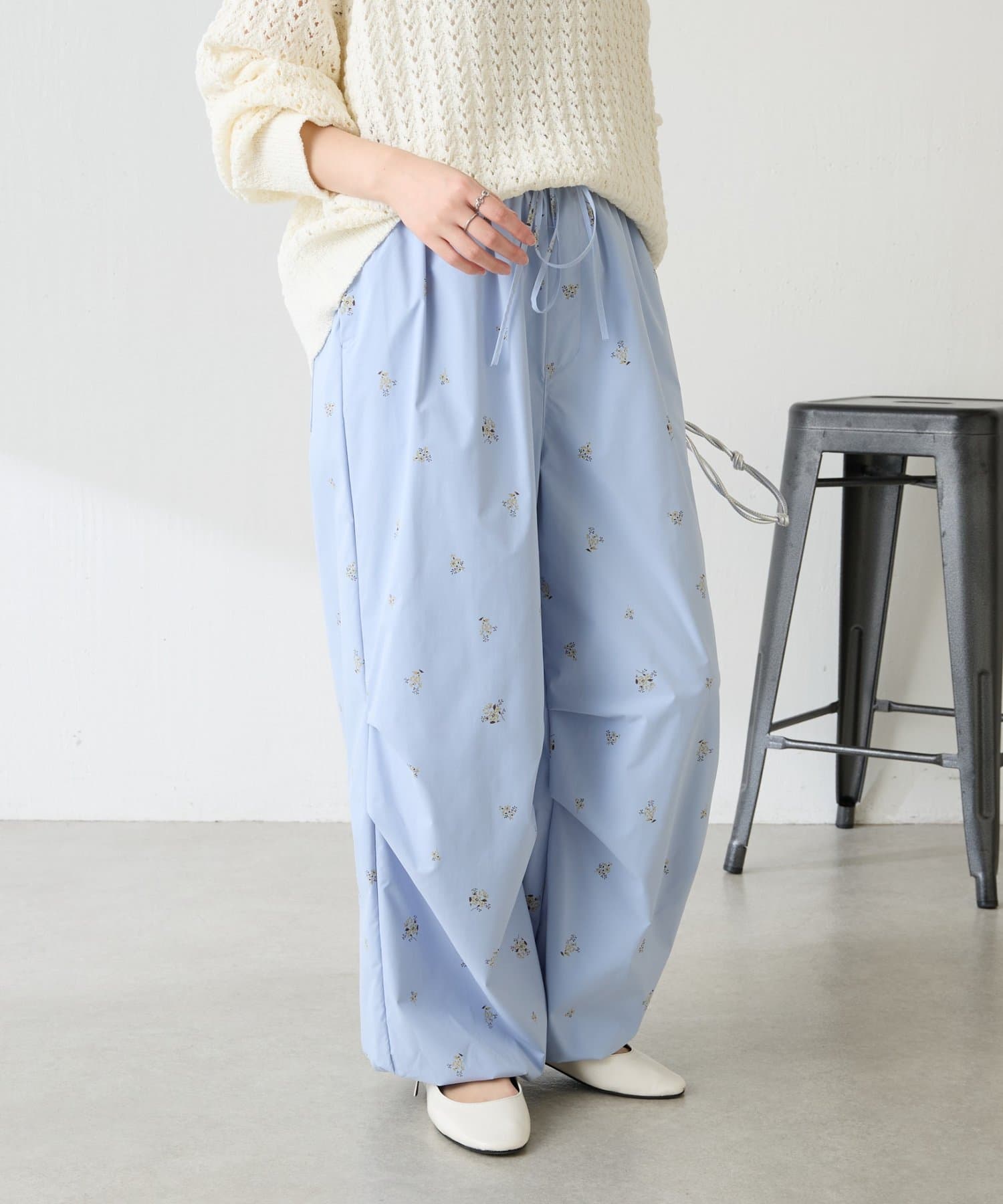・スポーティなパラシュートパンツですが、小花柄とややツヤのある素材で女性らしく着ていただけます。