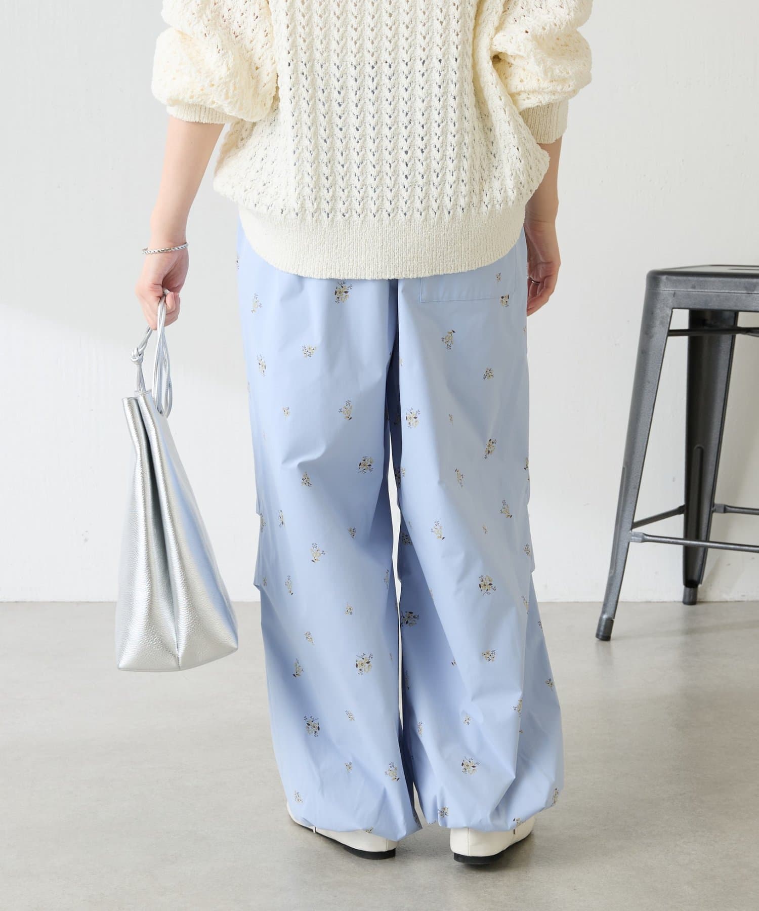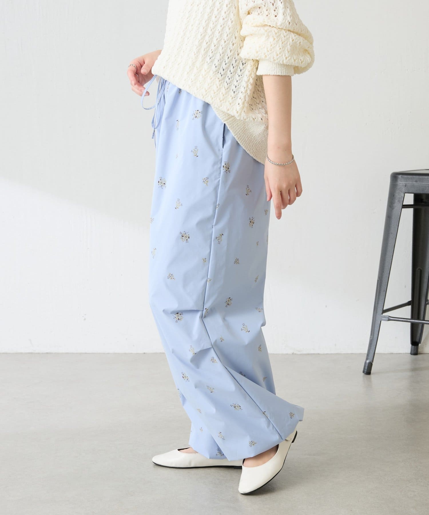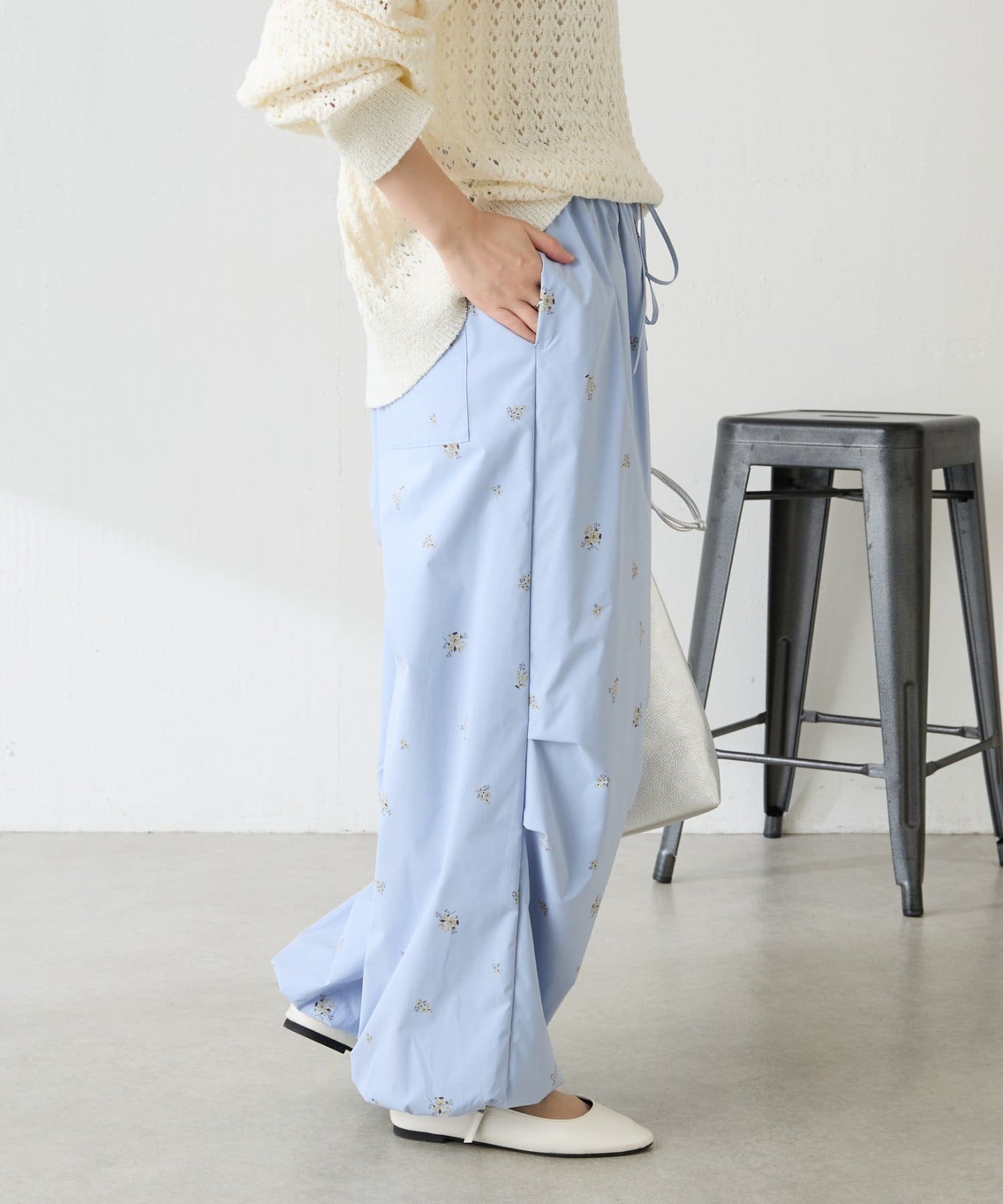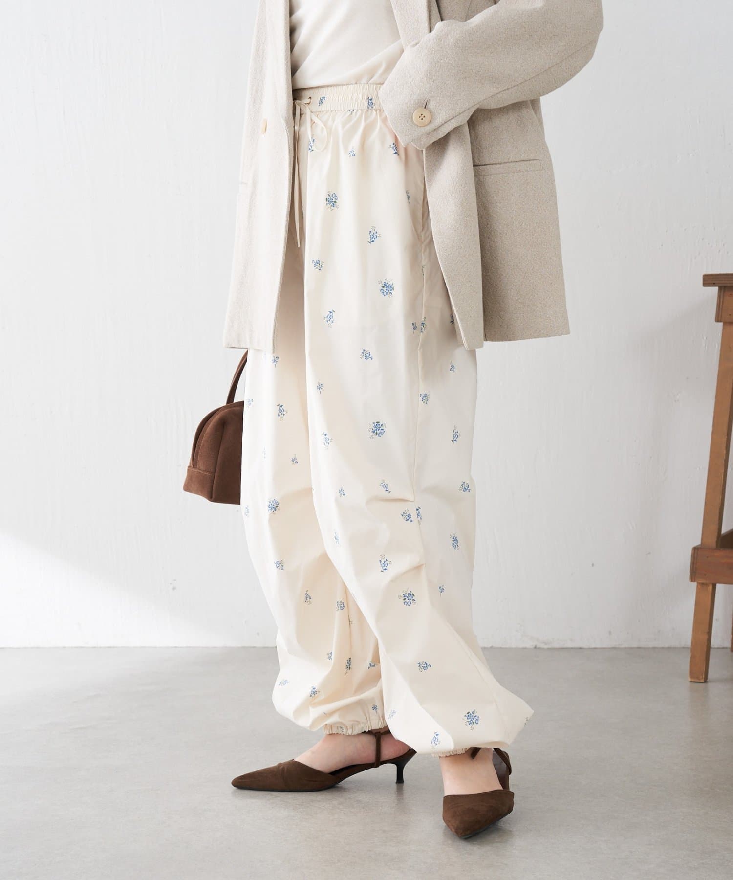 ・スポーティなパラシュートパンツですが、小花柄とややツヤのある素材で女性らしく着ていただけます。