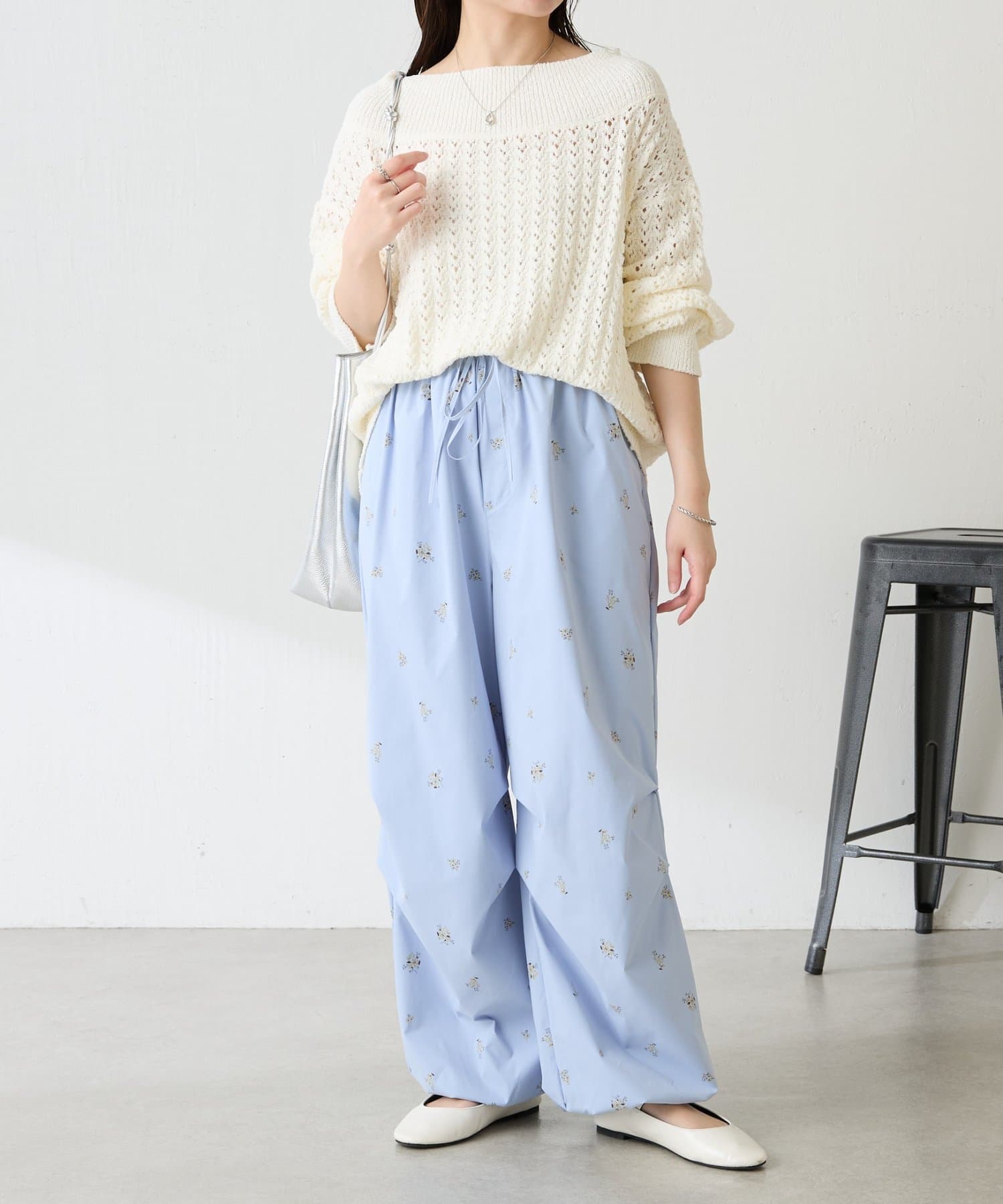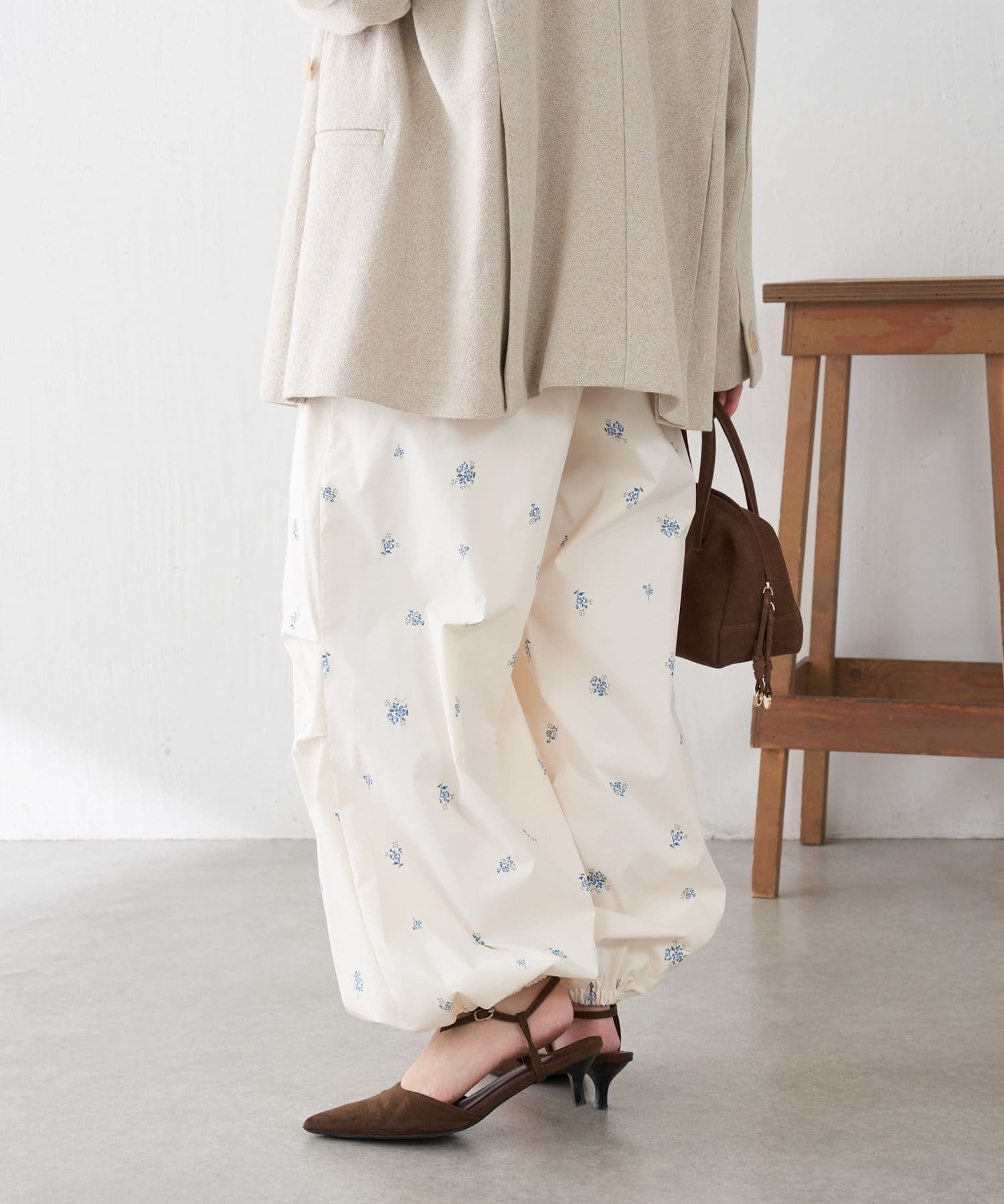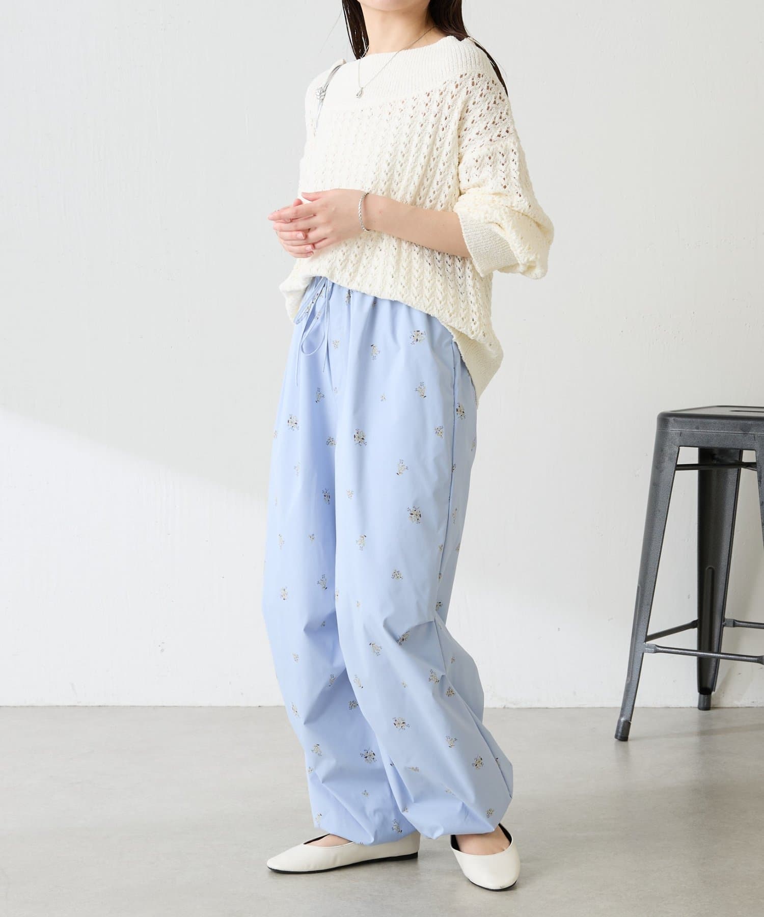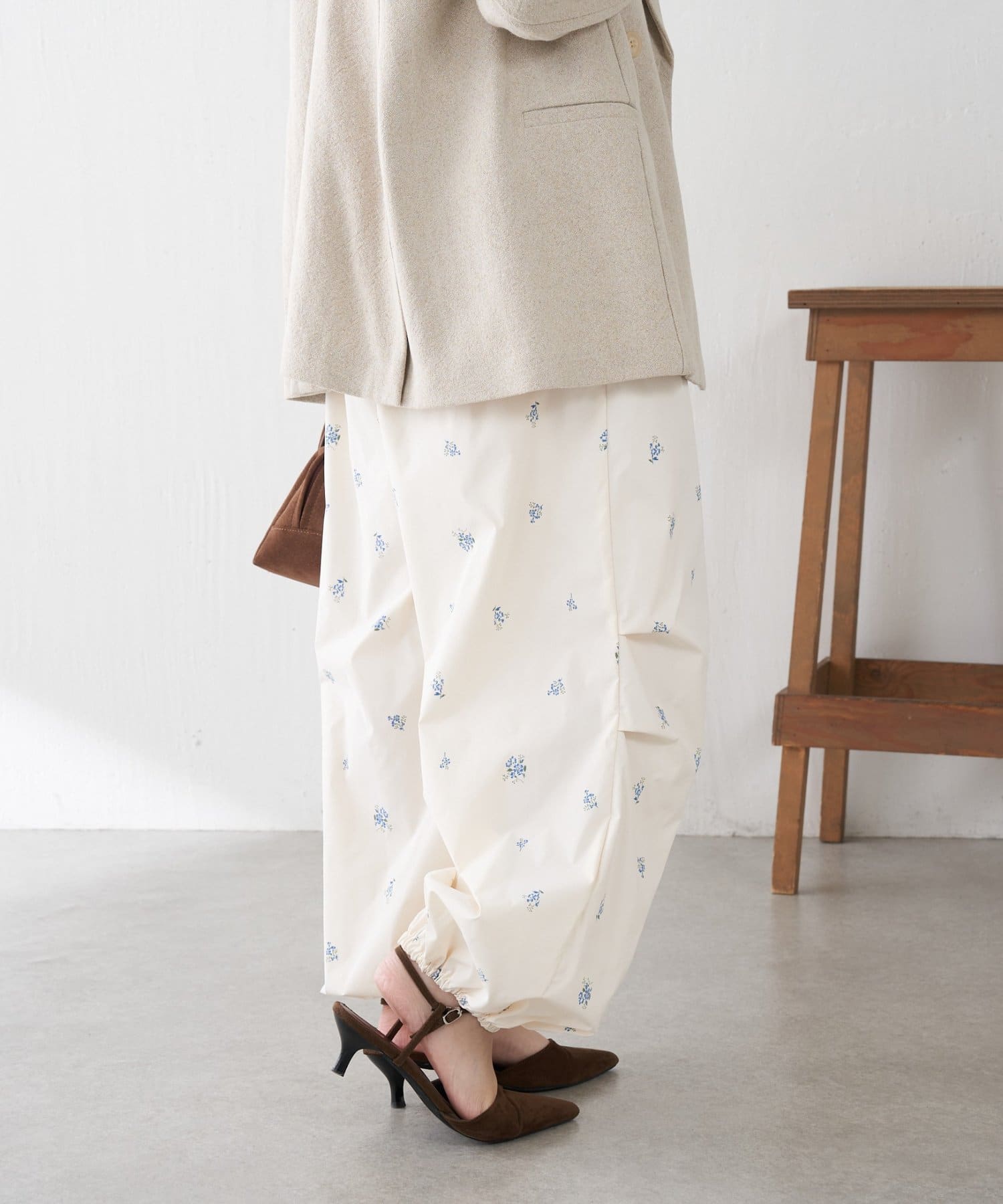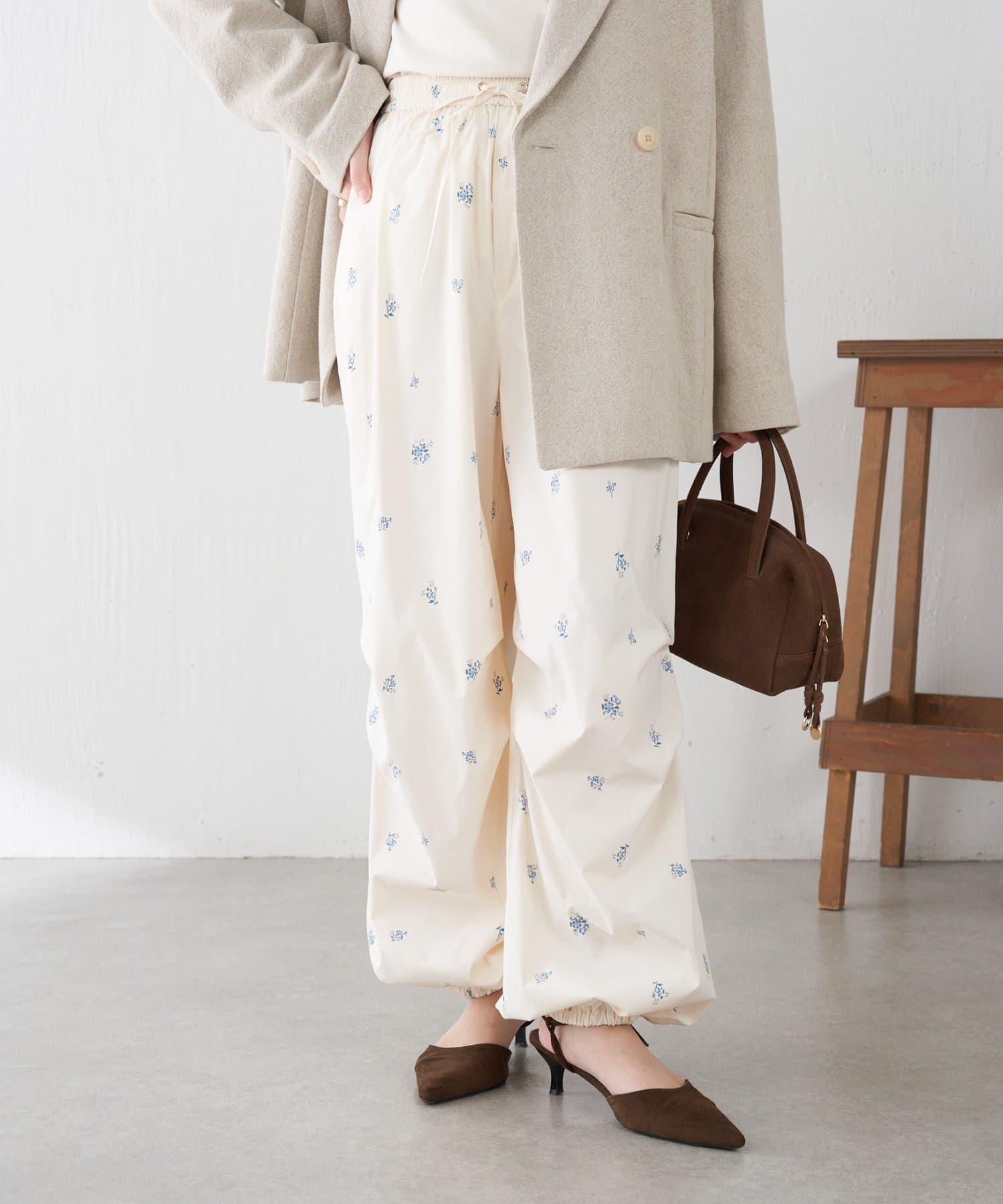 ・スポーティなパラシュートパンツですが、小花柄とややツヤのある素材で女性らしく着ていただけます。