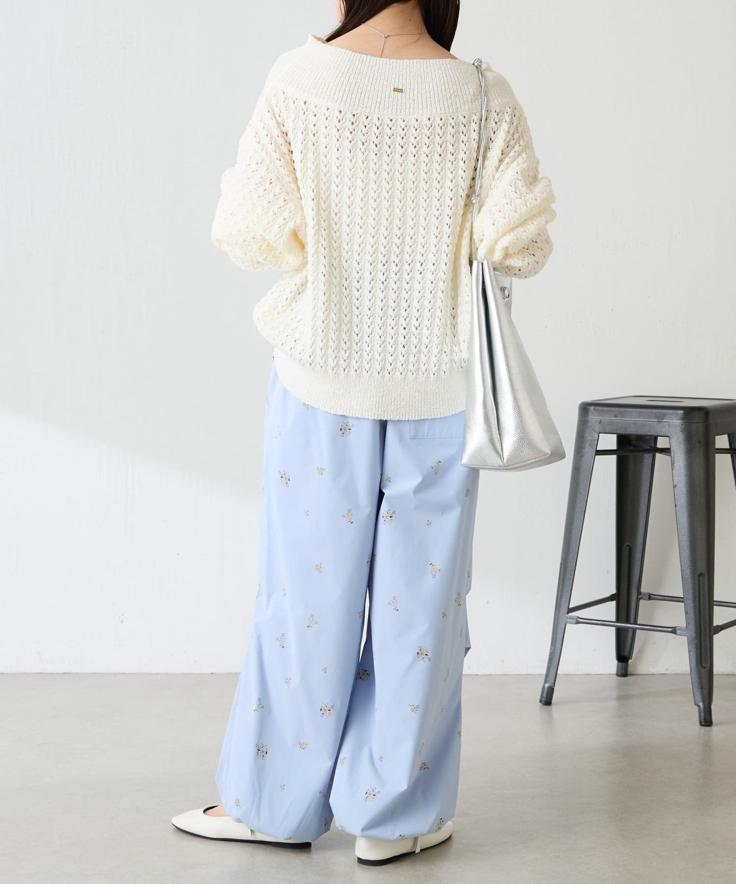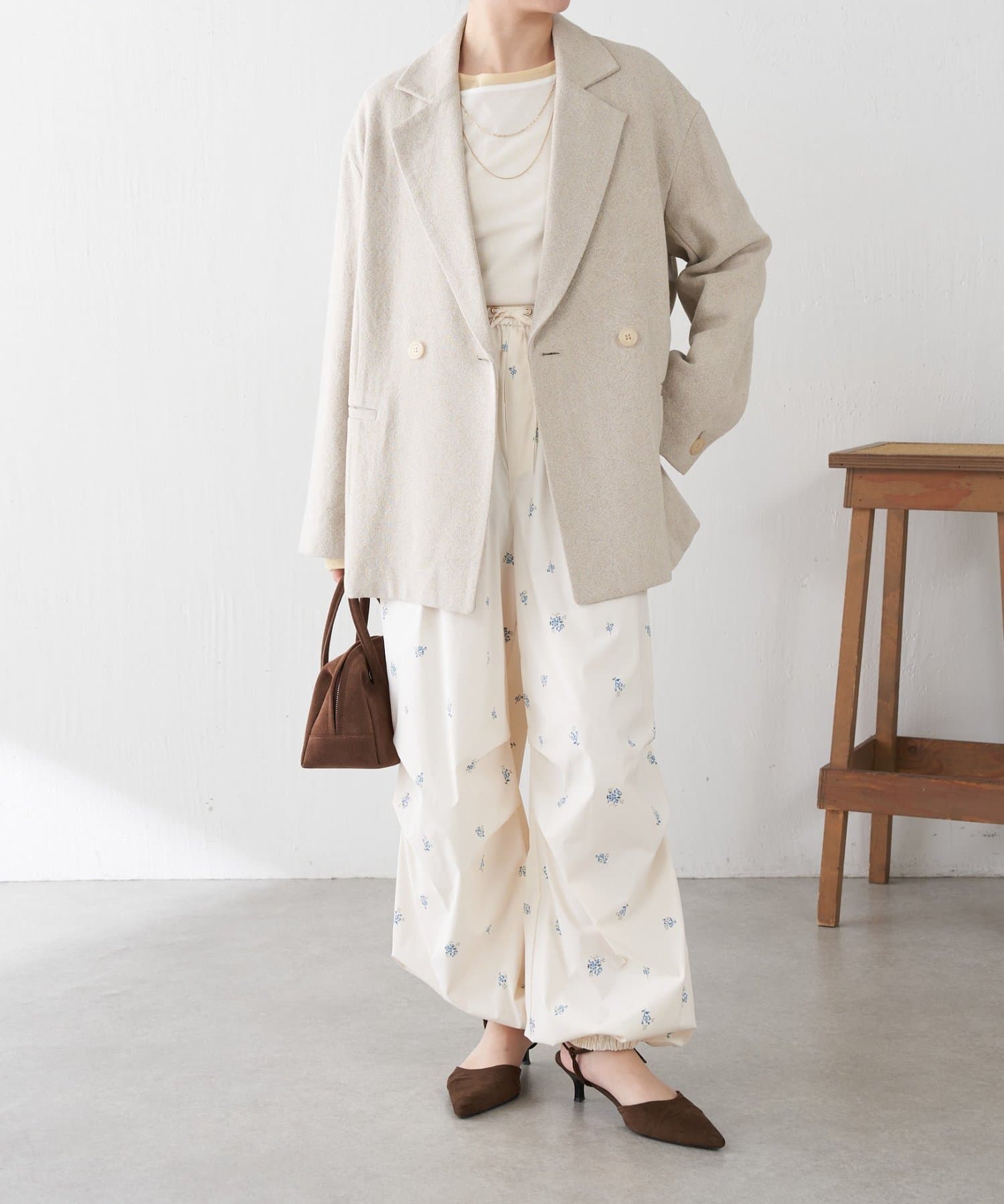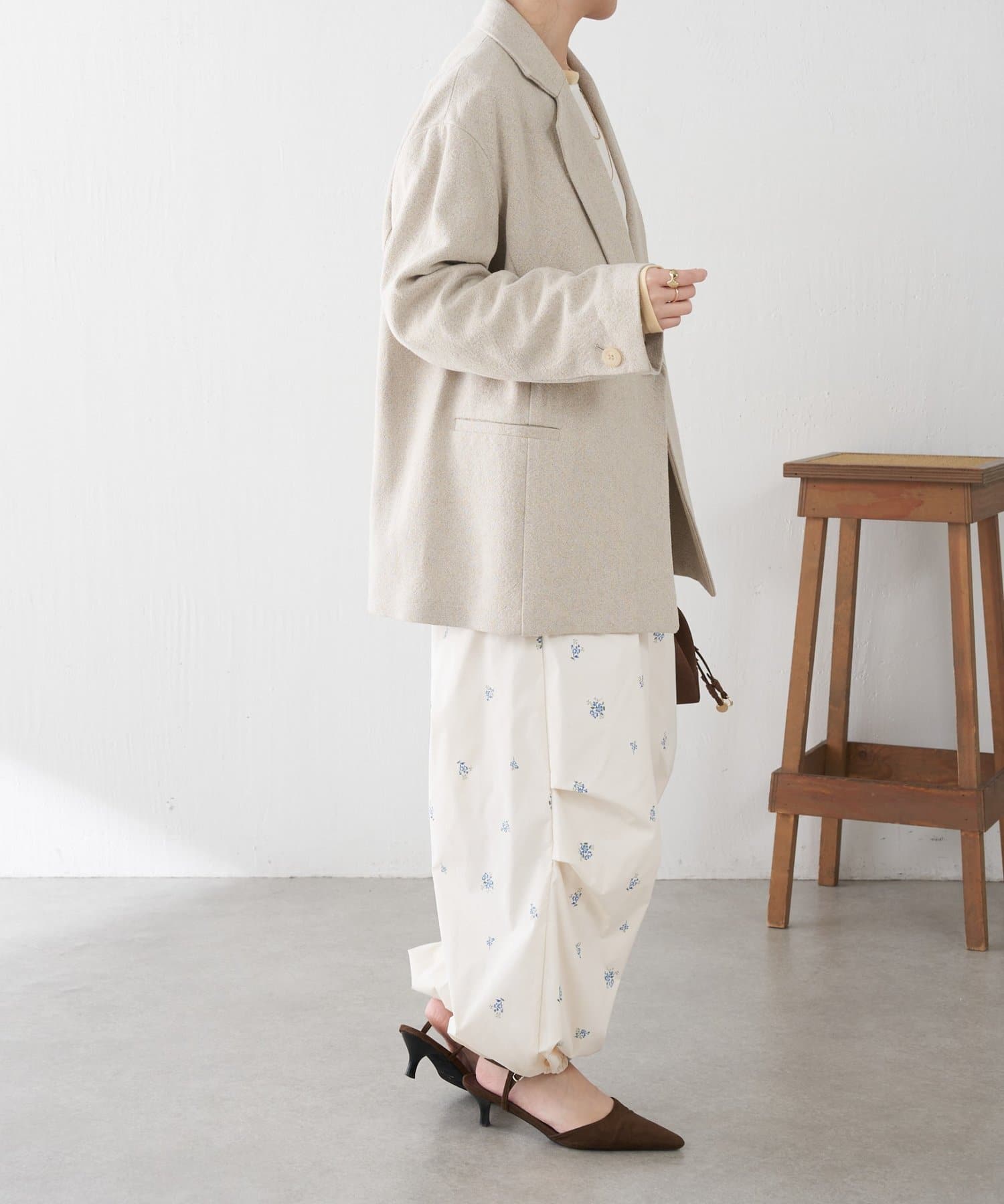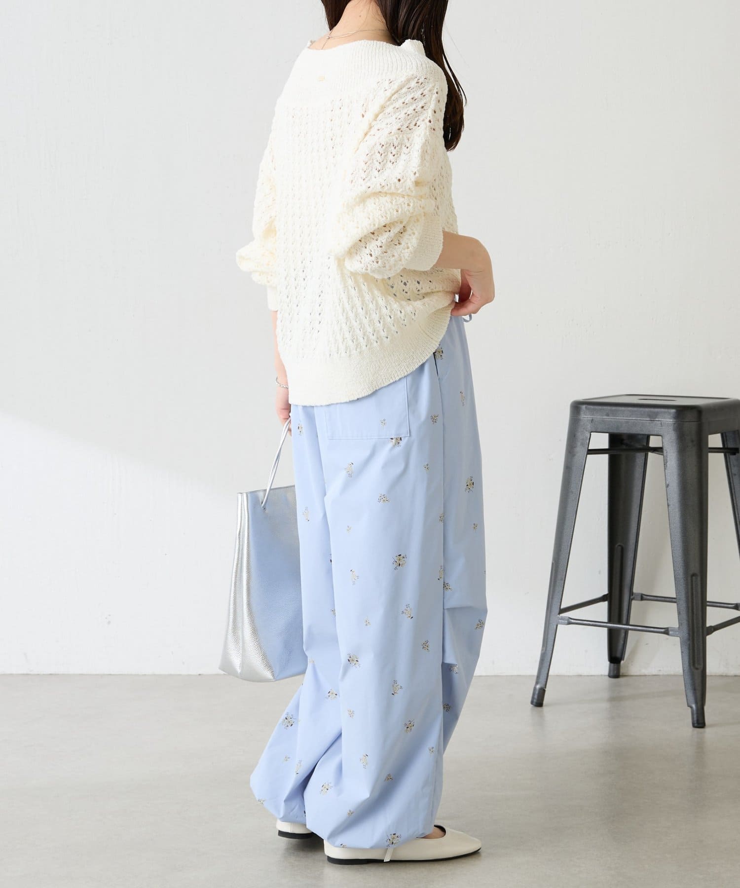・スポーティなパラシュートパンツですが、小花柄とややツヤのある素材で女性らしく着ていただけます。