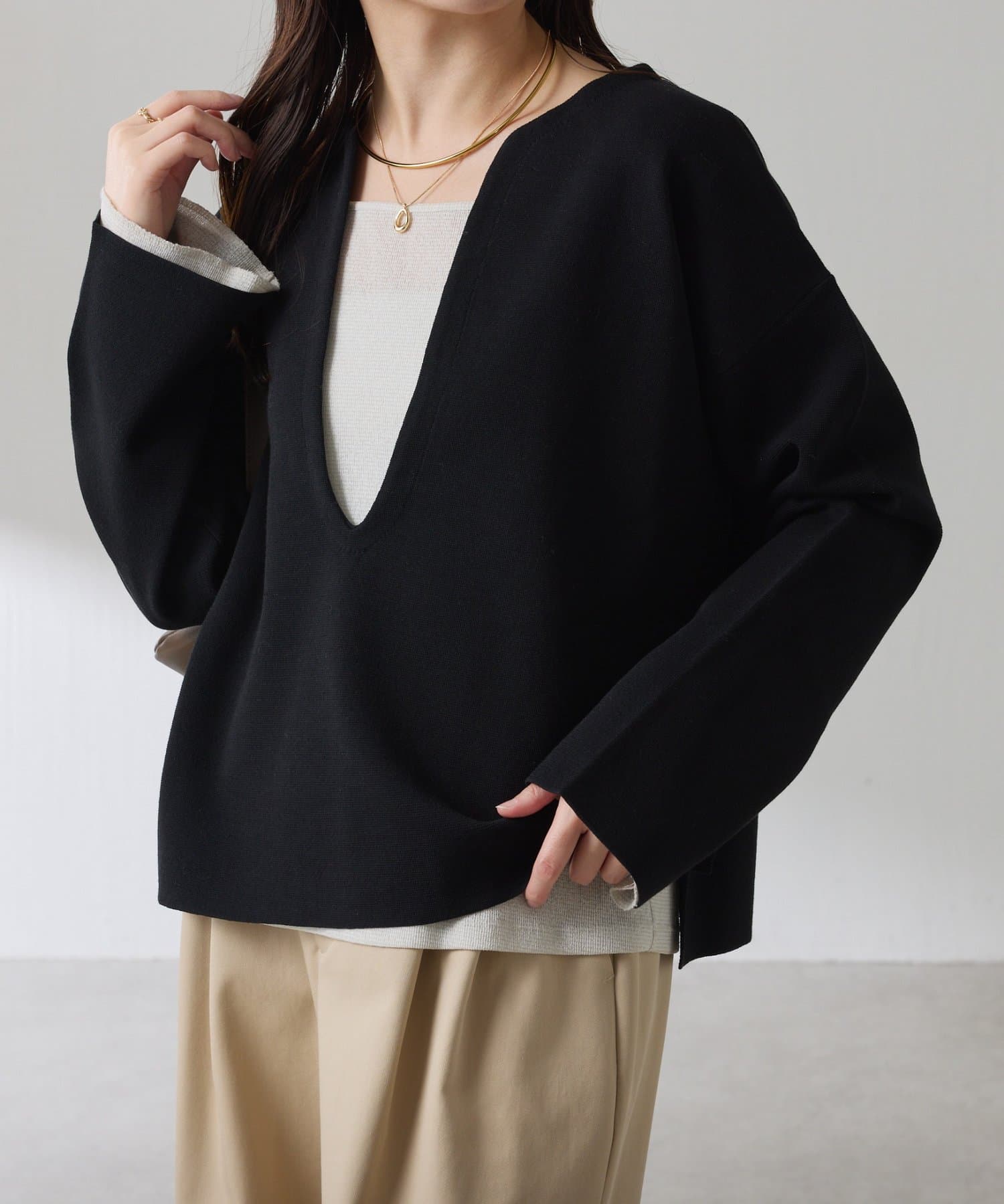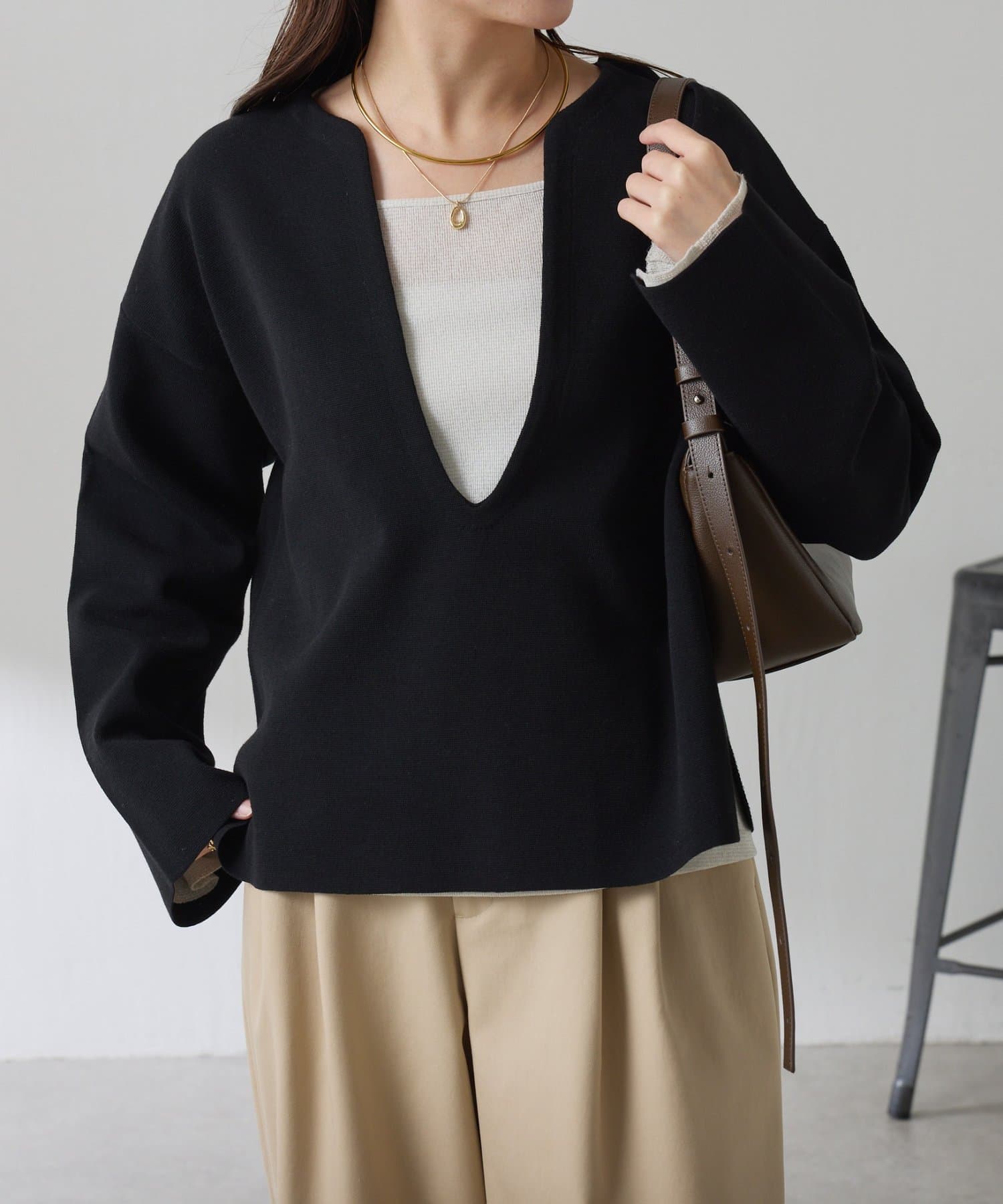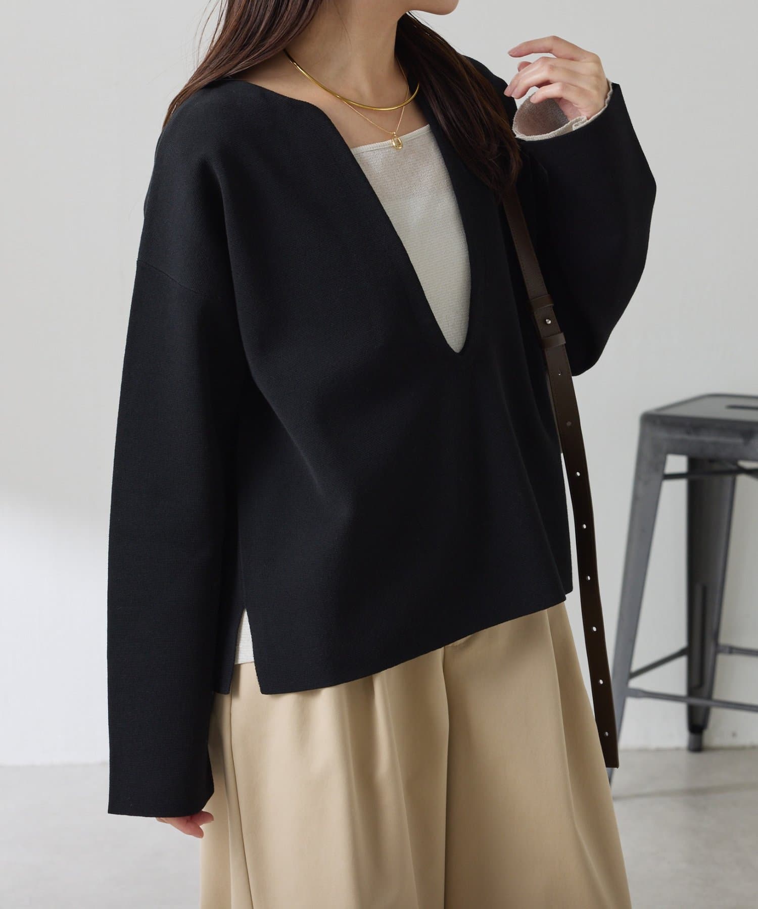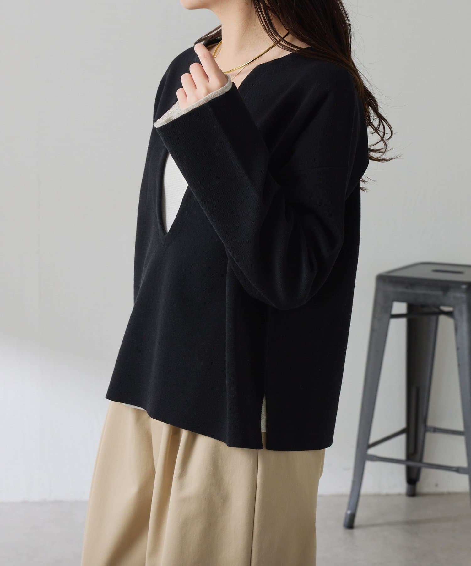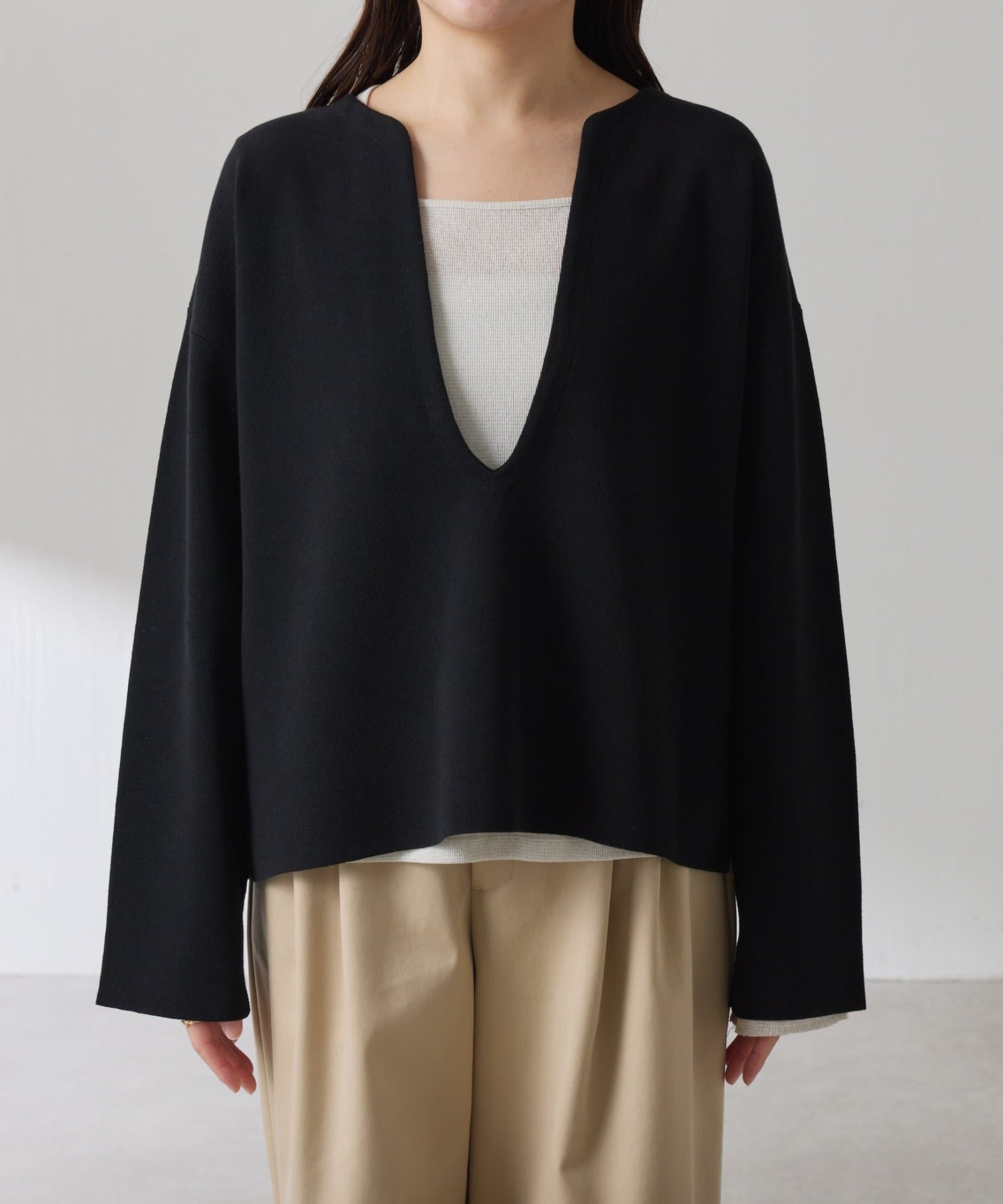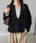 深めのVネックなのでスクエアネックでもボウタイ付きのブラウスでも合わせやすいです。