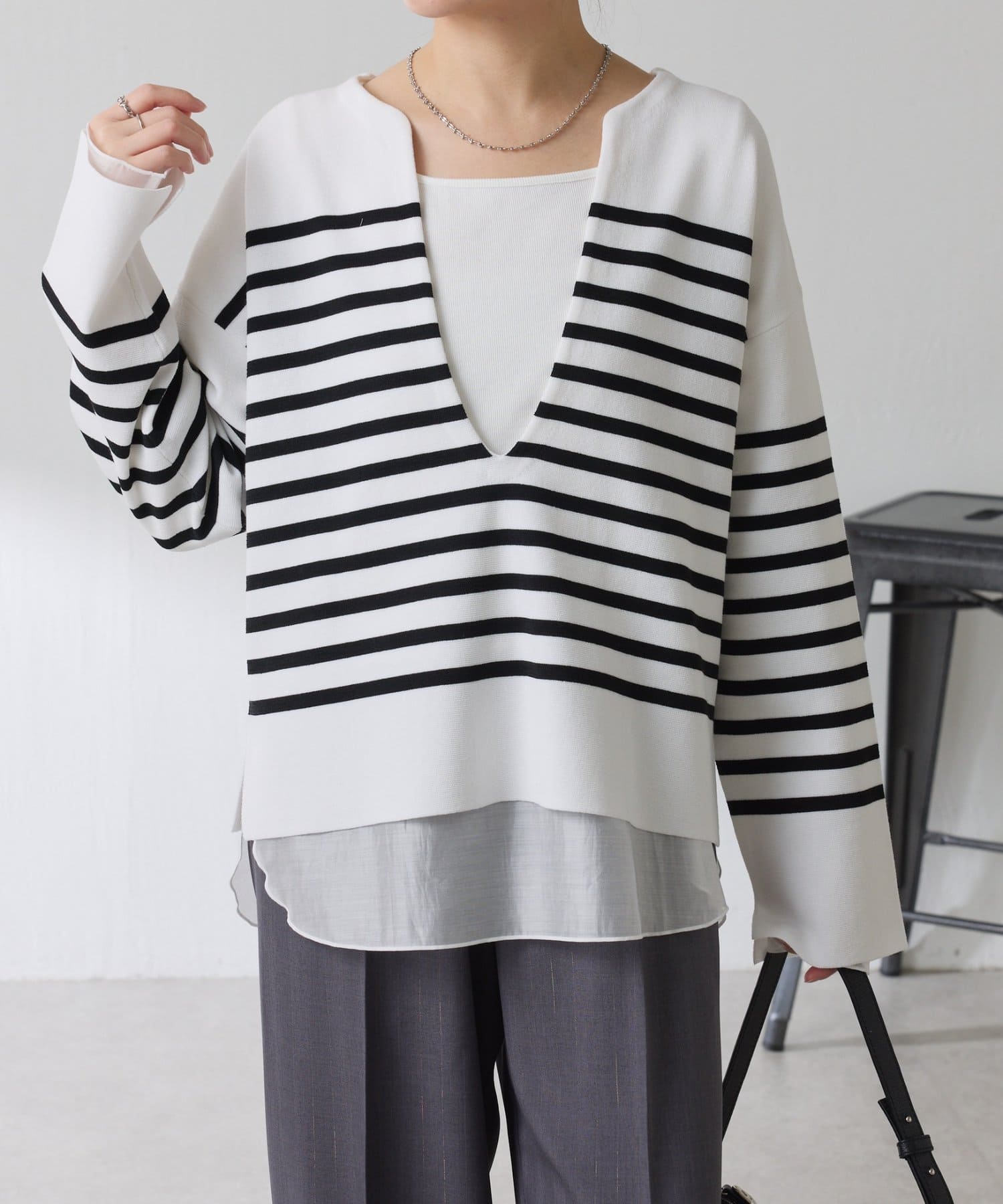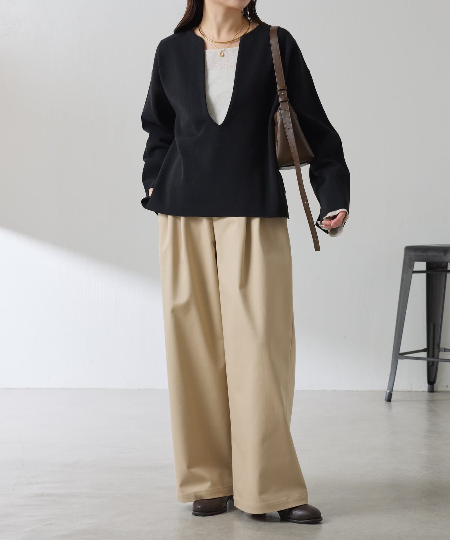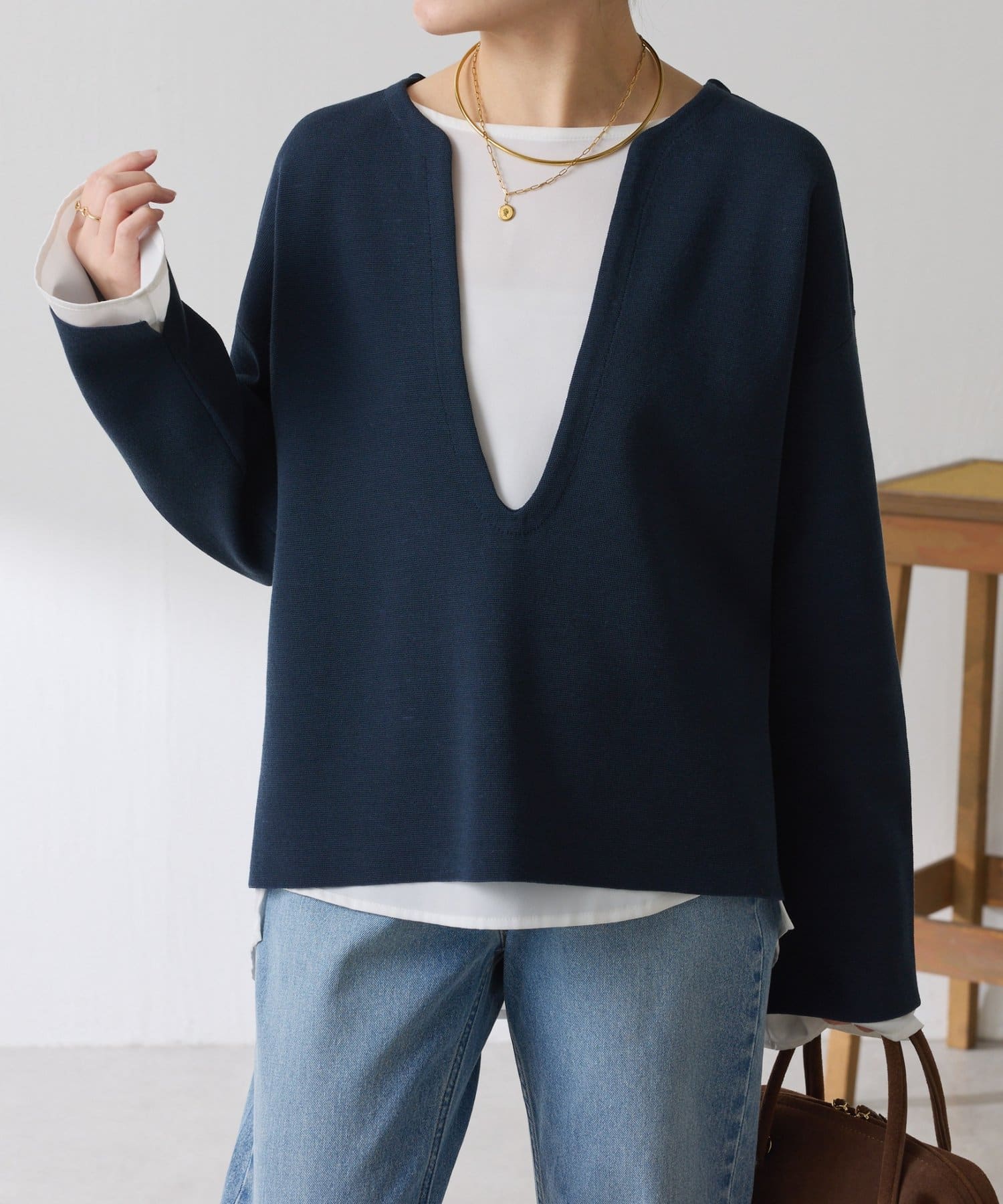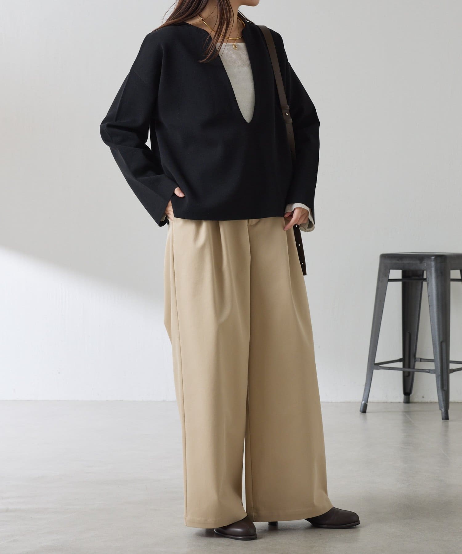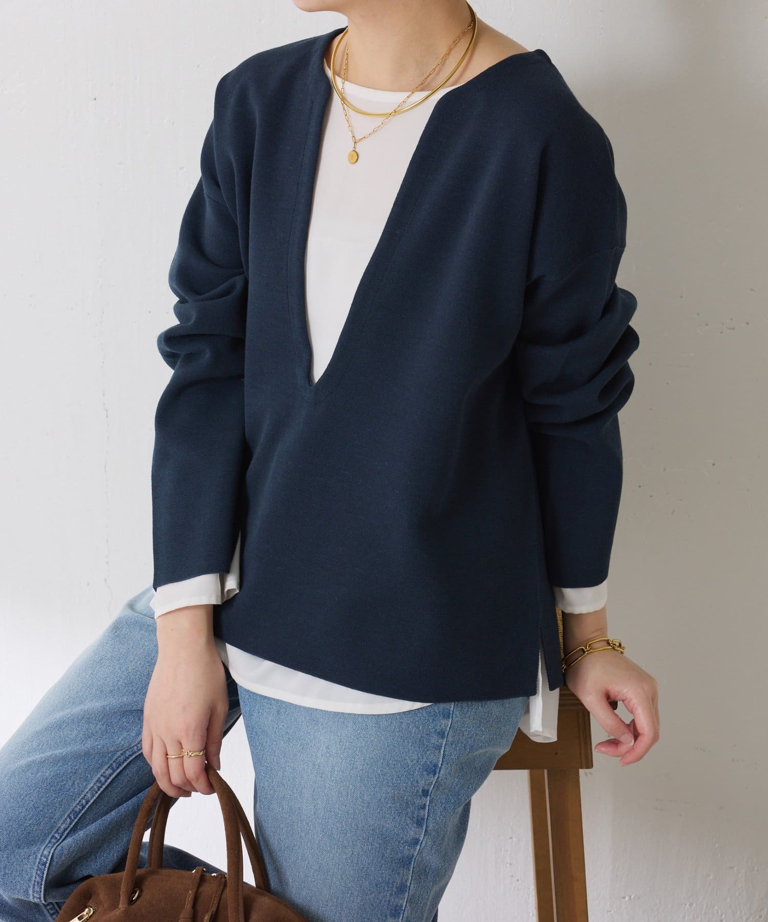 深めのVネックなのでスクエアネックでもボウタイ付きのブラウスでも合わせやすいです。