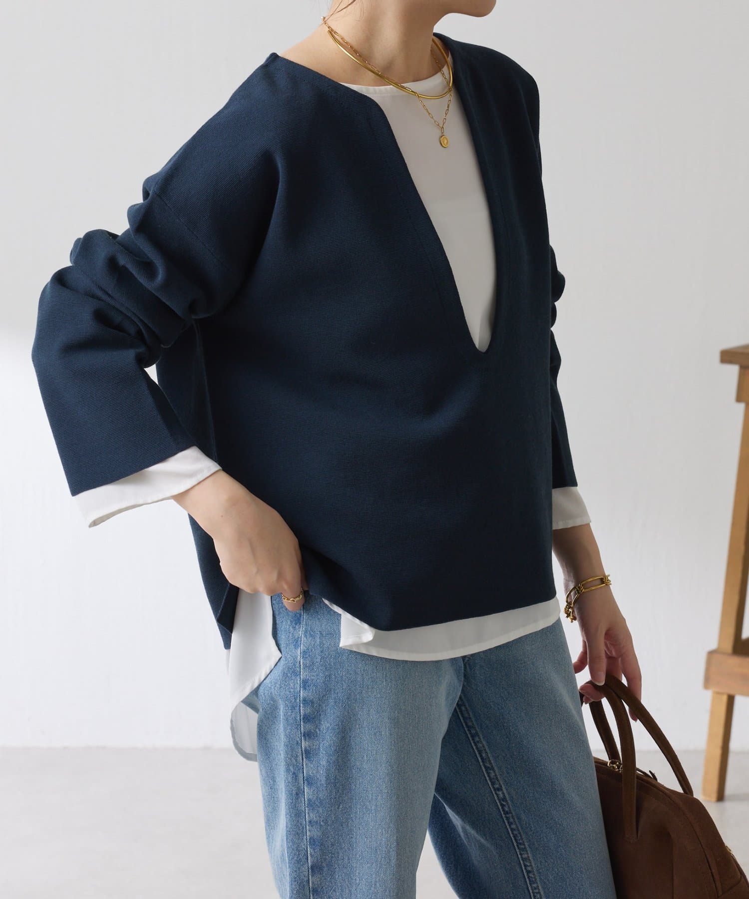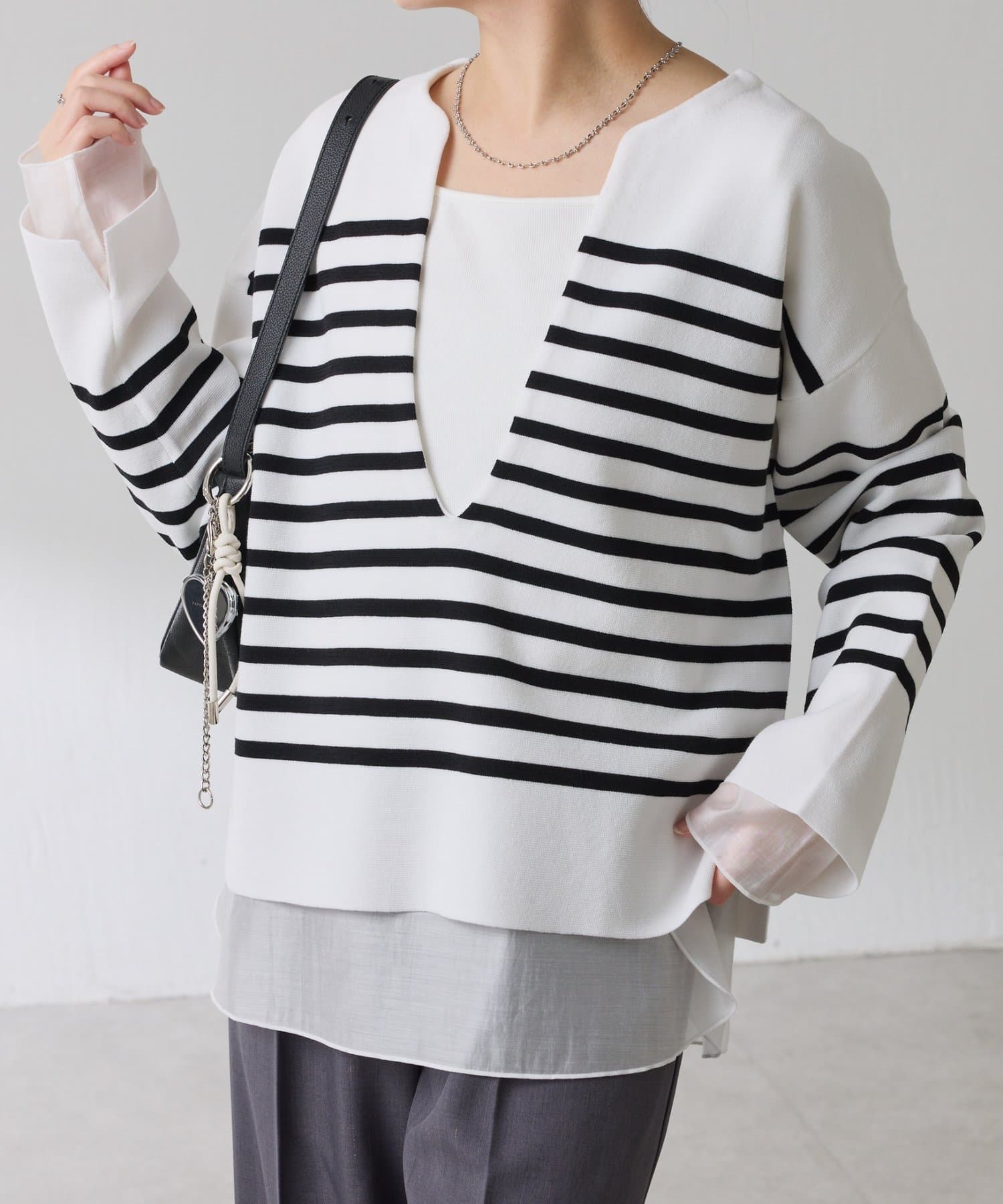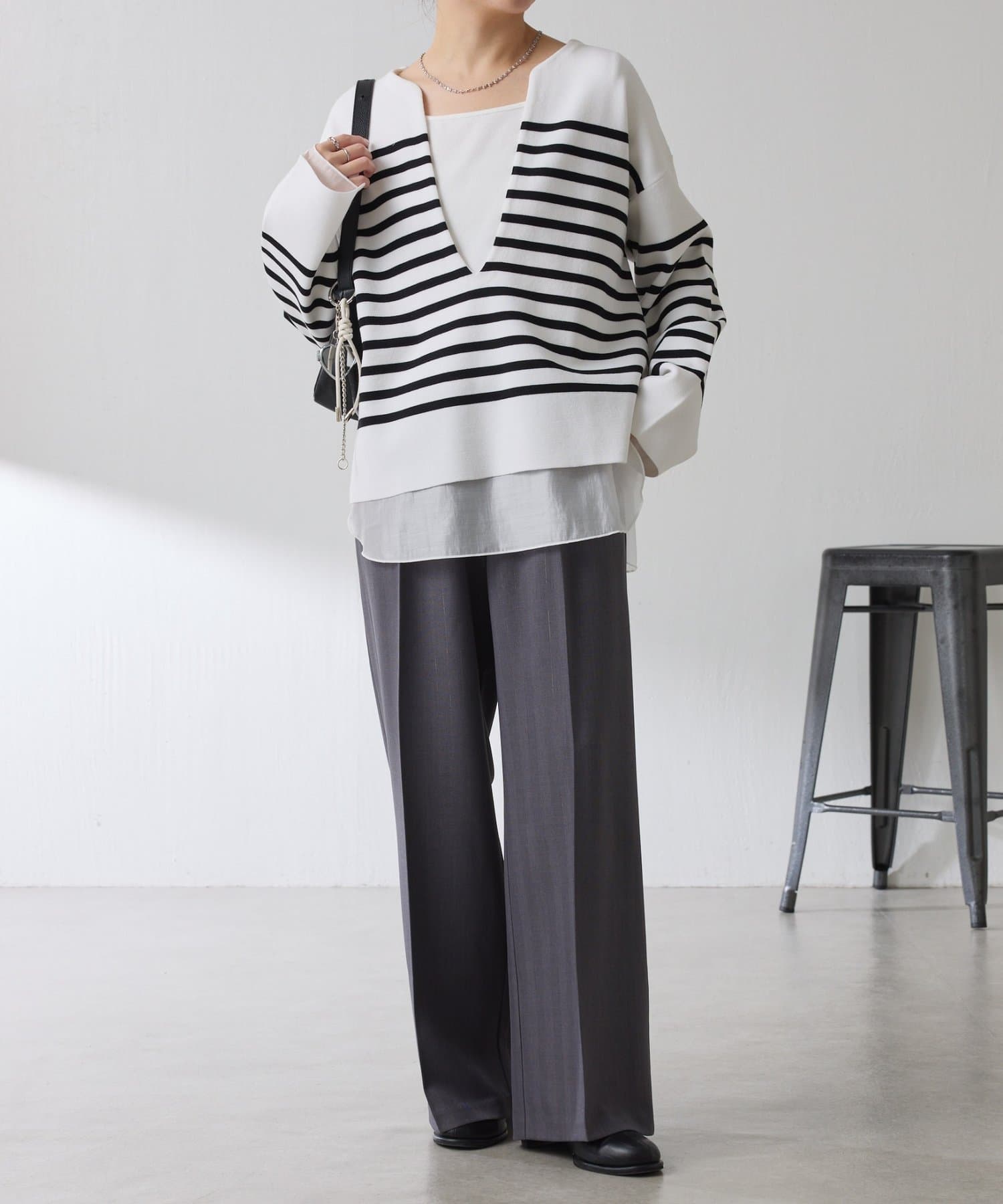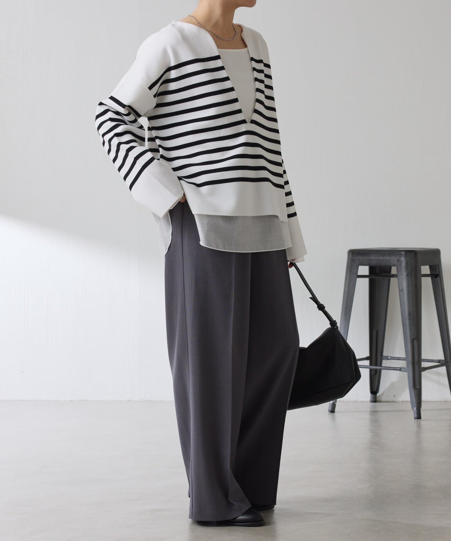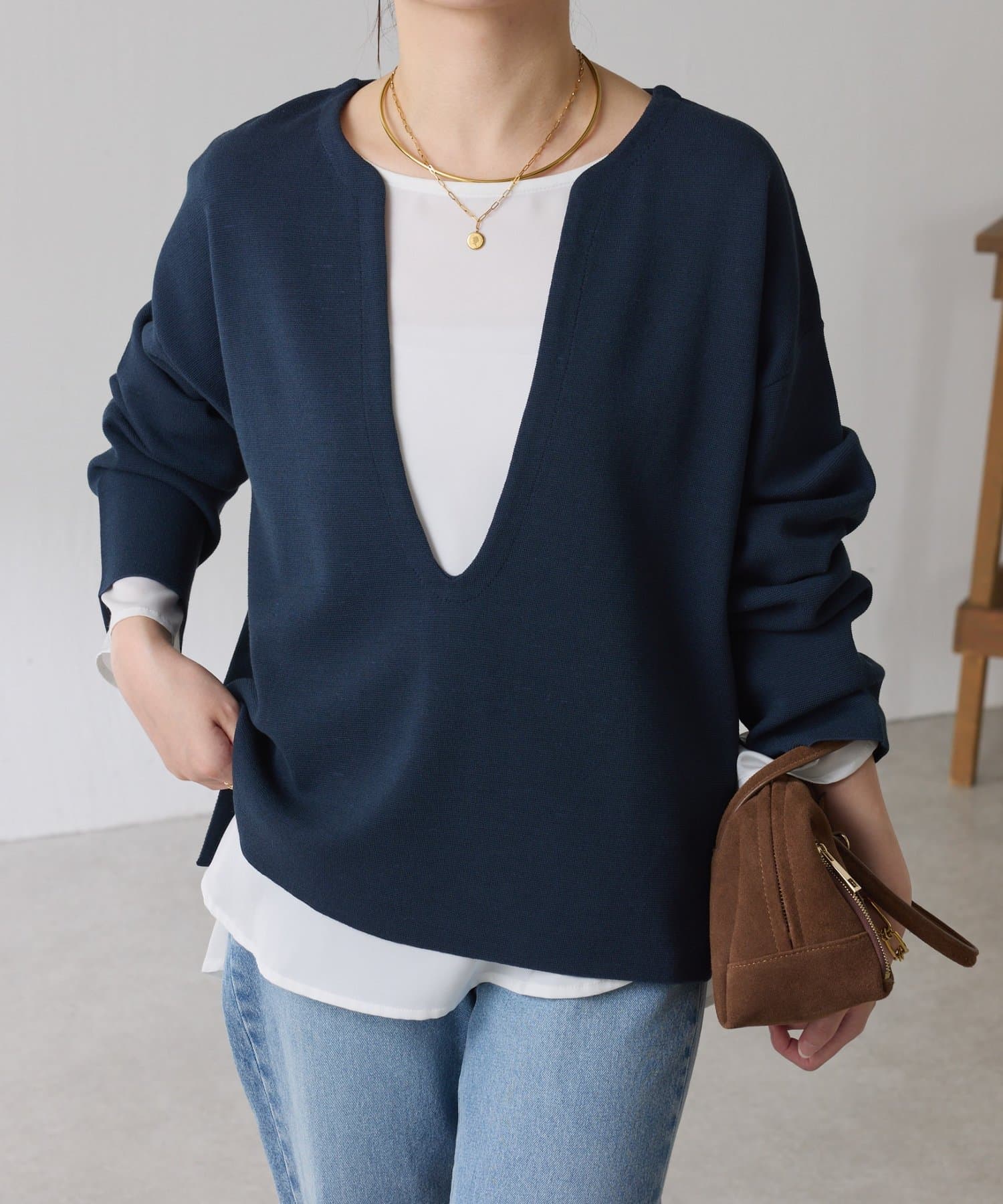 深めのVネックなのでスクエアネックでもボウタイ付きのブラウスでも合わせやすいです。