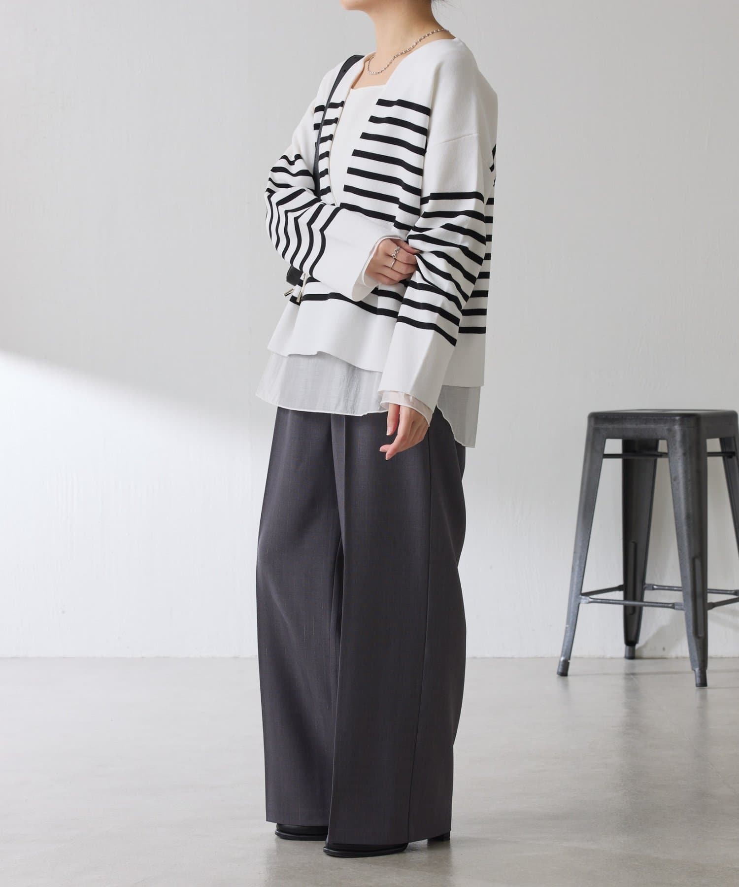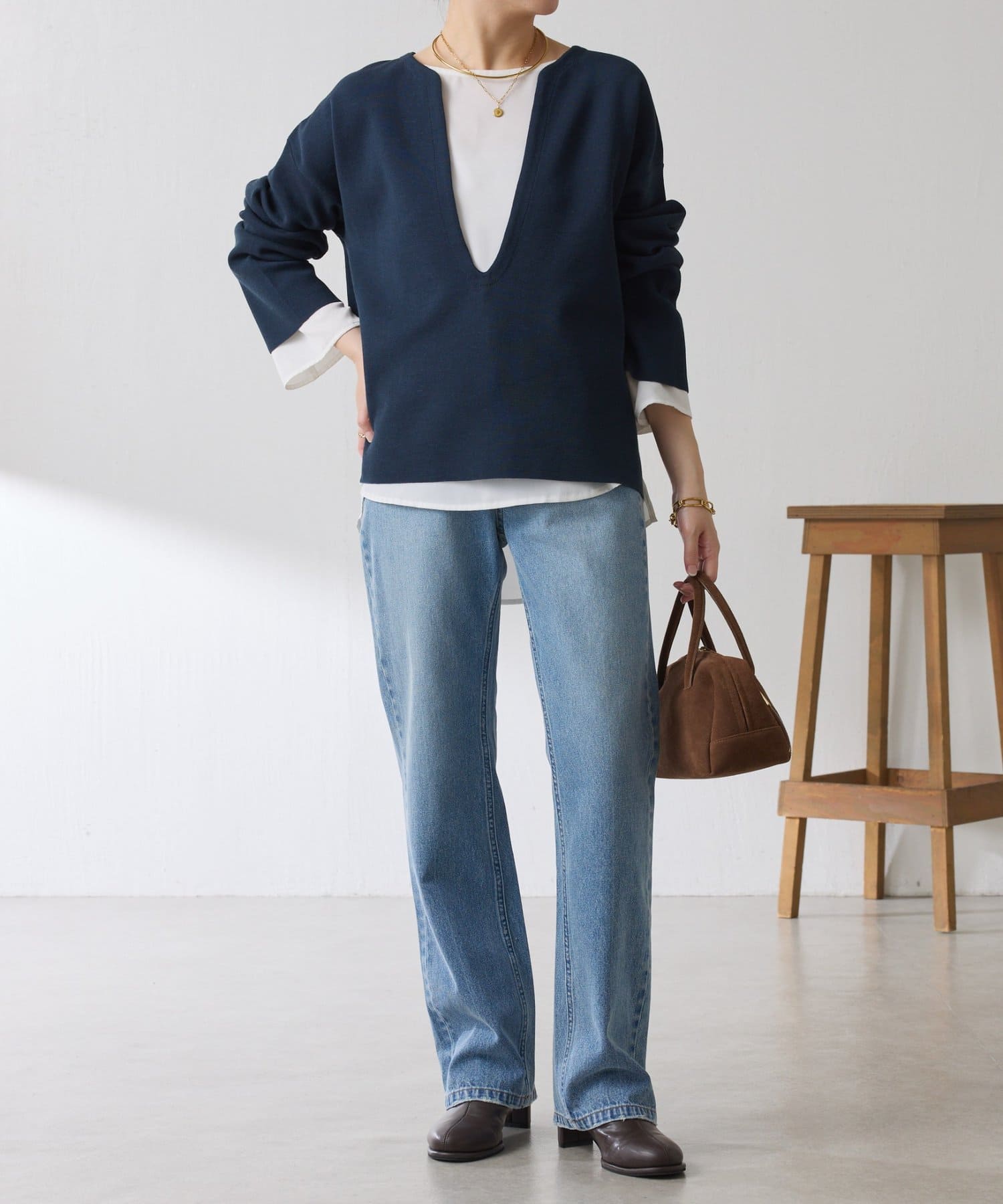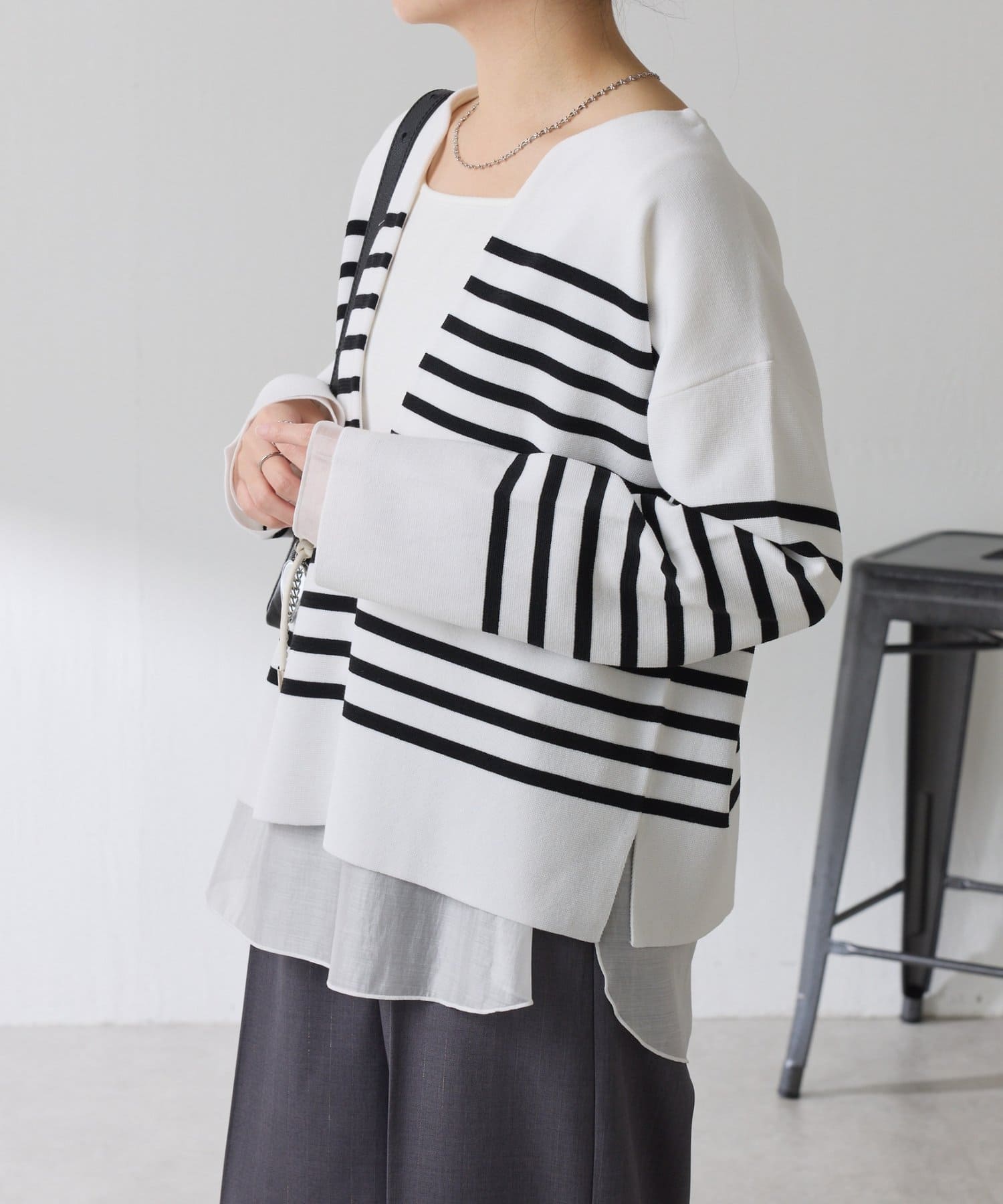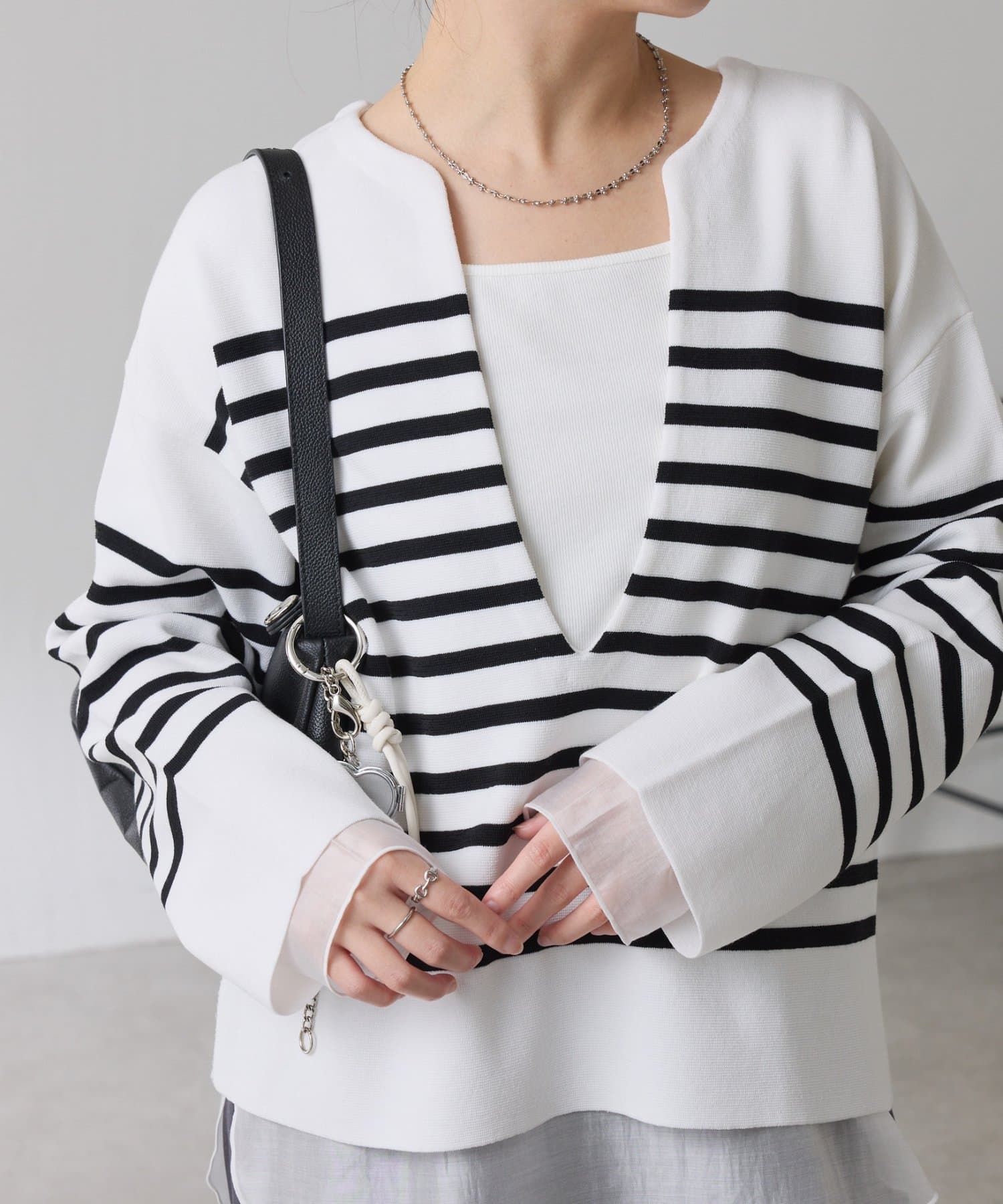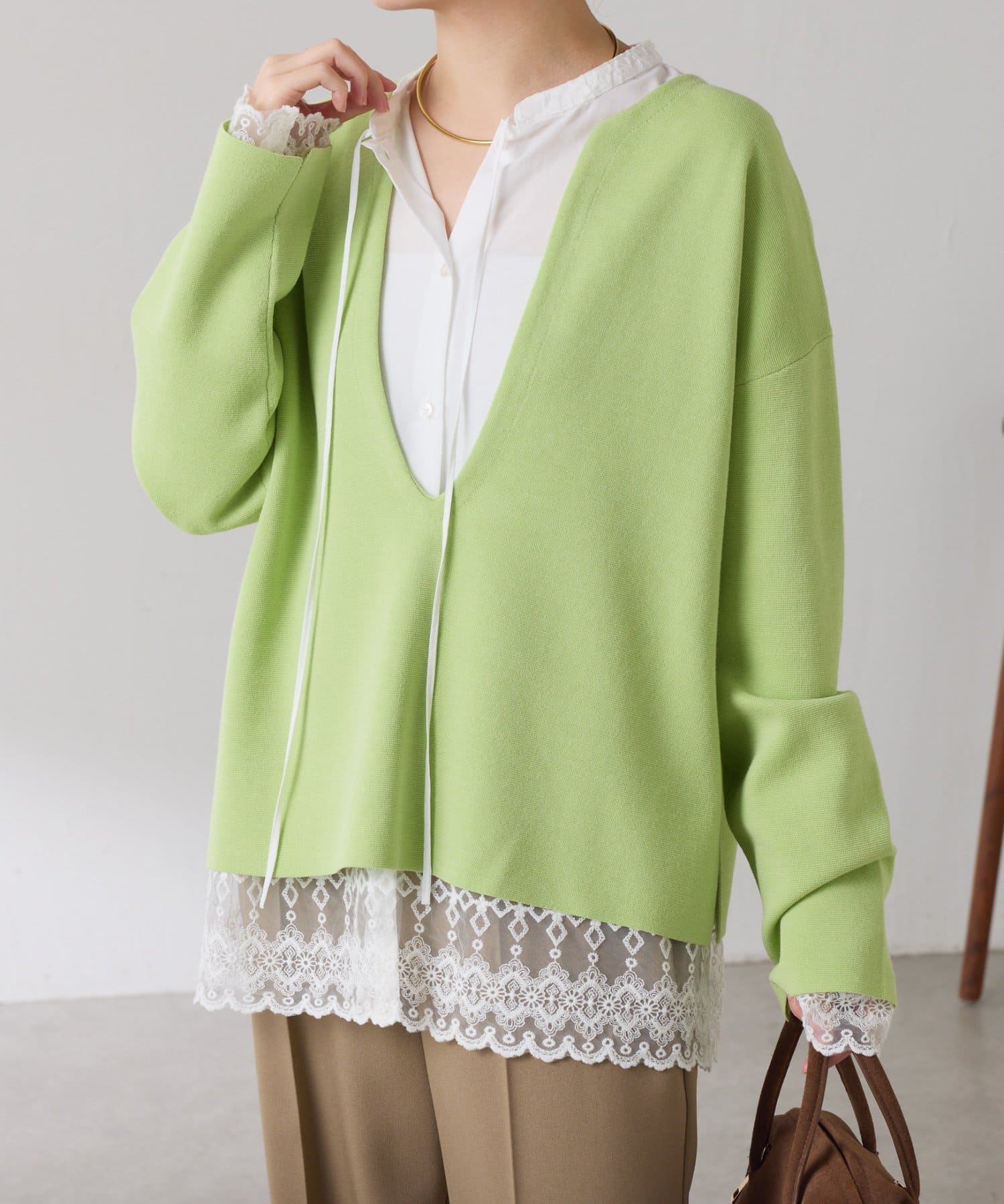 深めのVネックなのでスクエアネックでもボウタイ付きのブラウスでも合わせやすいです。