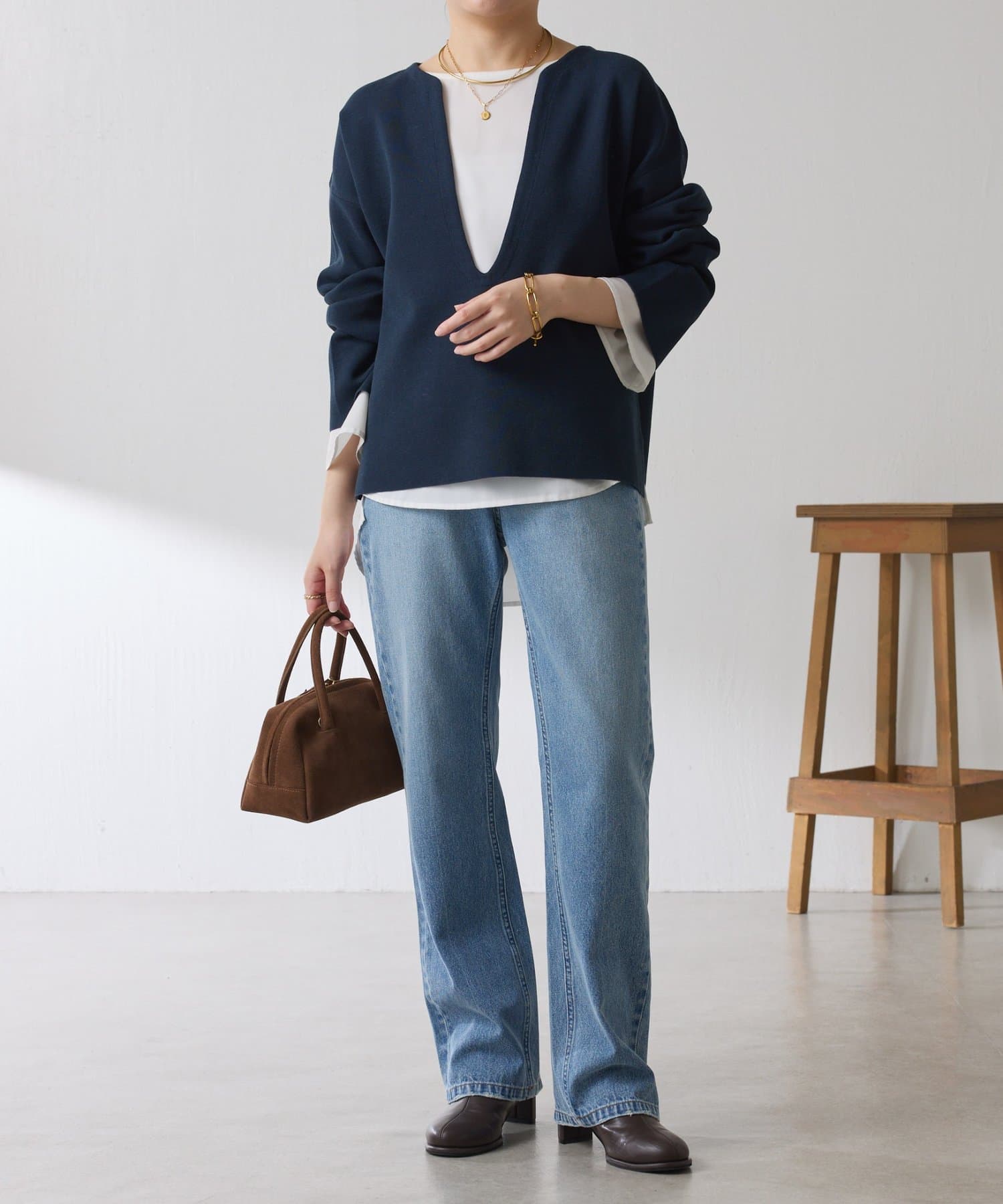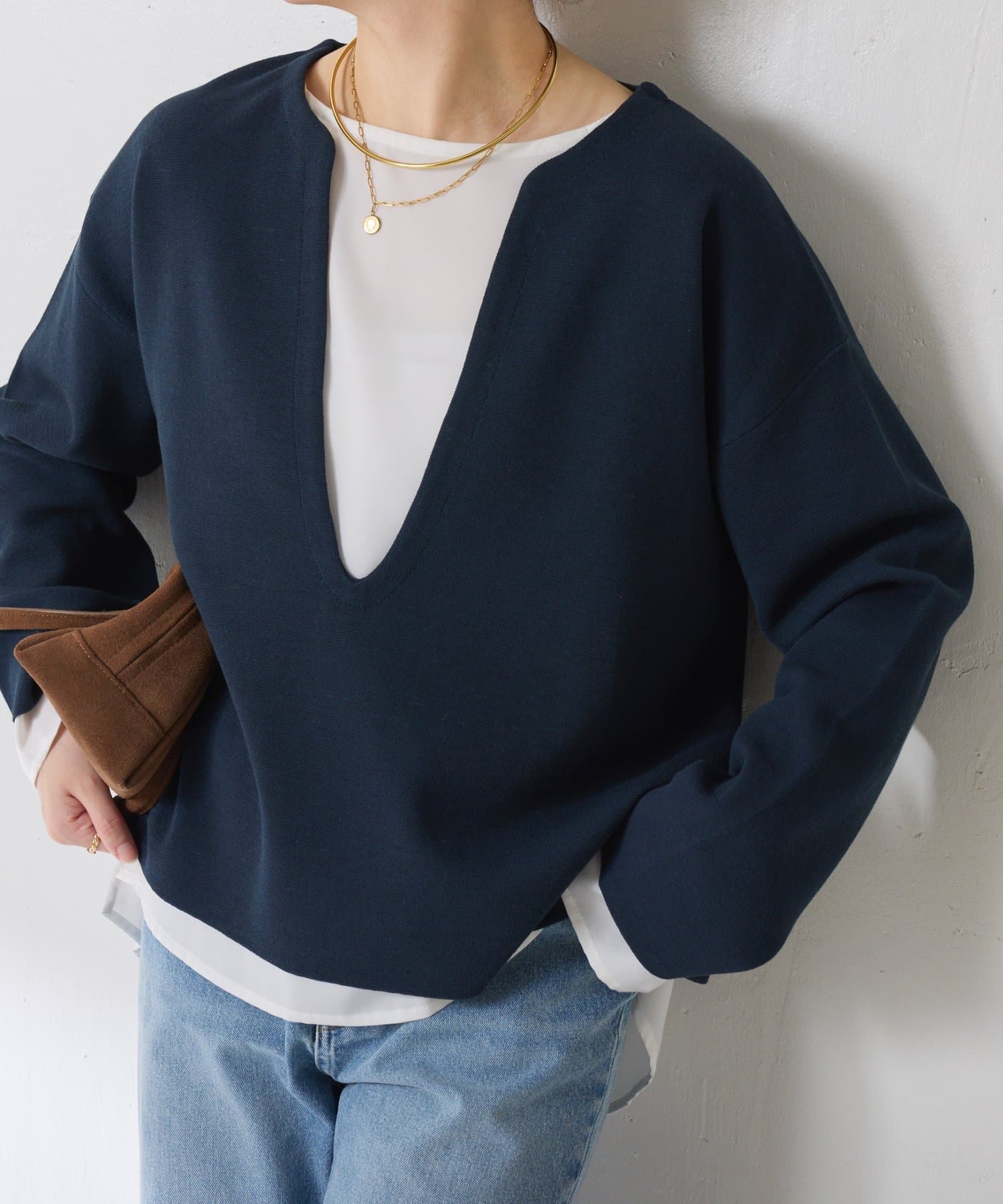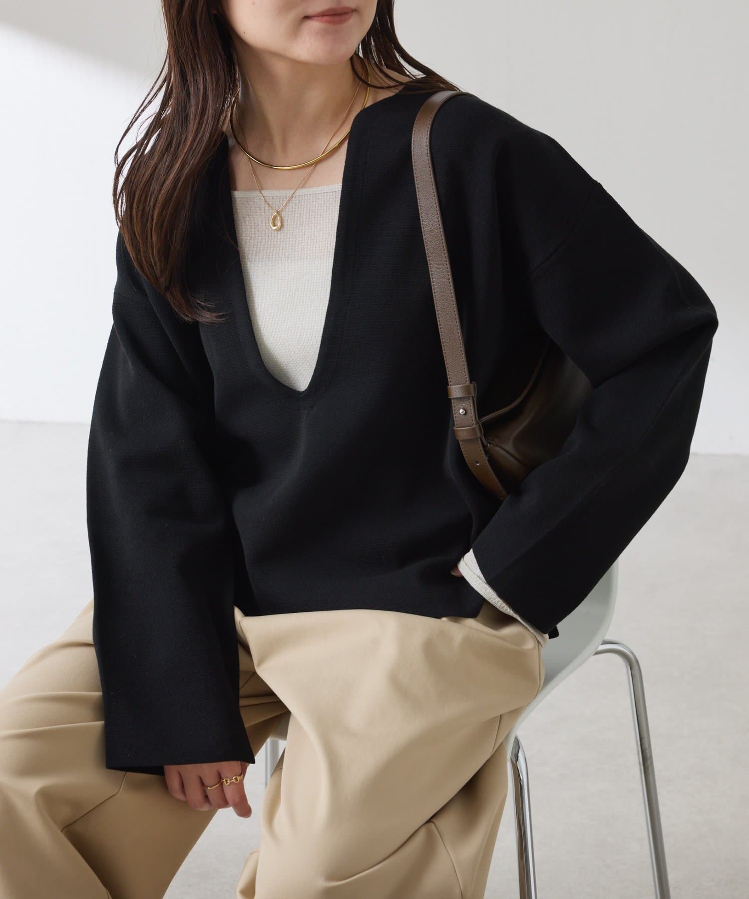・Vネックは顔周りがスッキリ見え、デコルテが覗くと女性らしさを演出できます◎