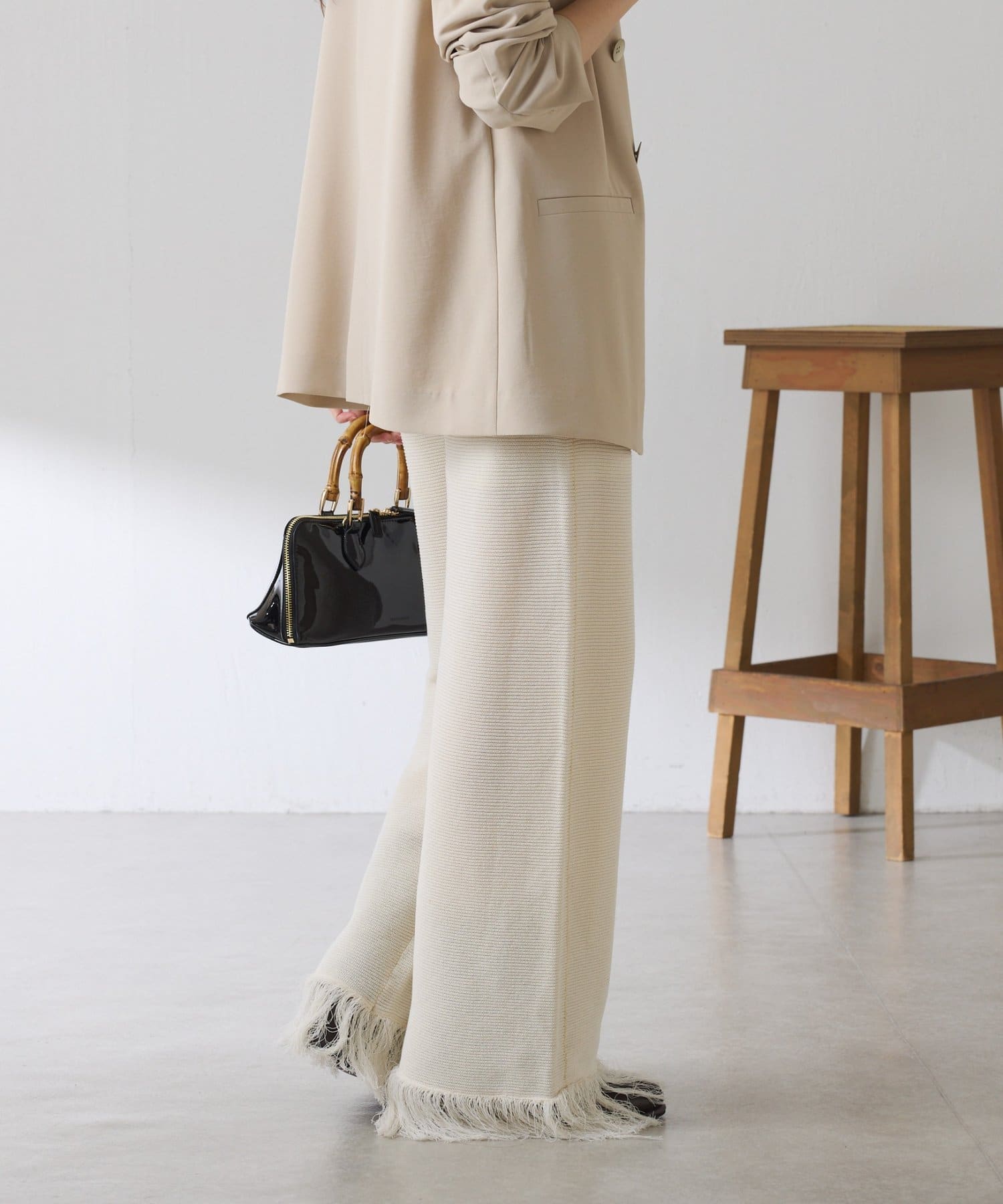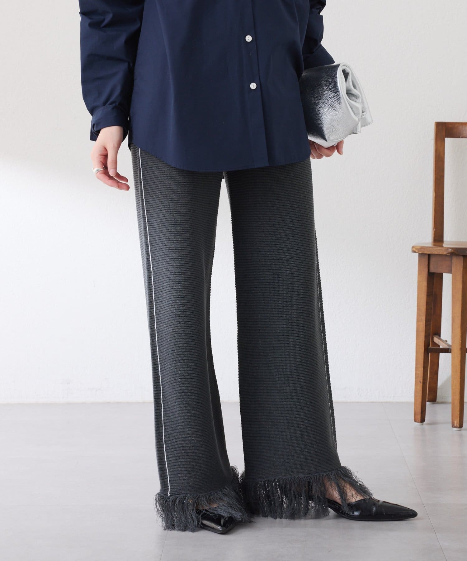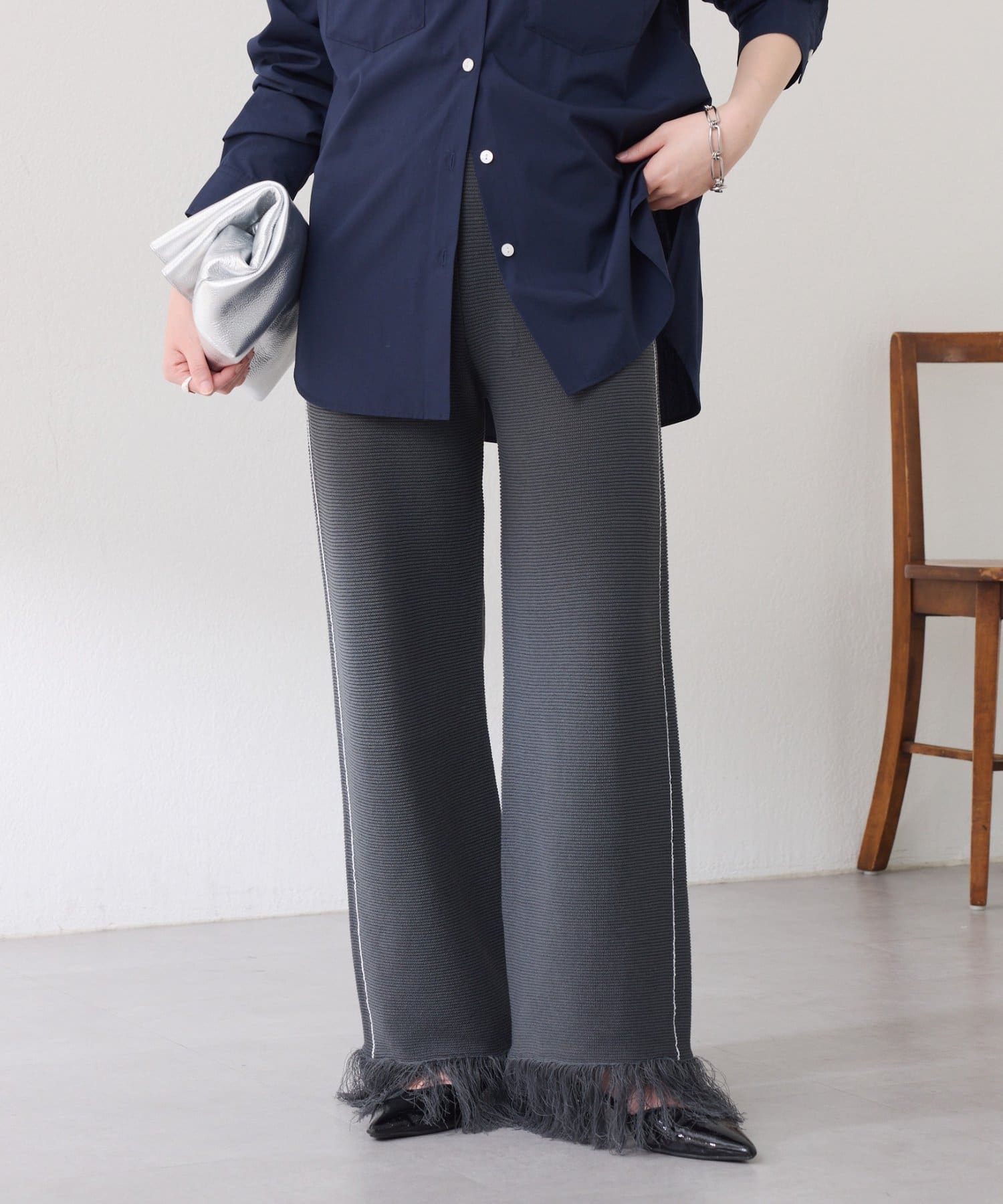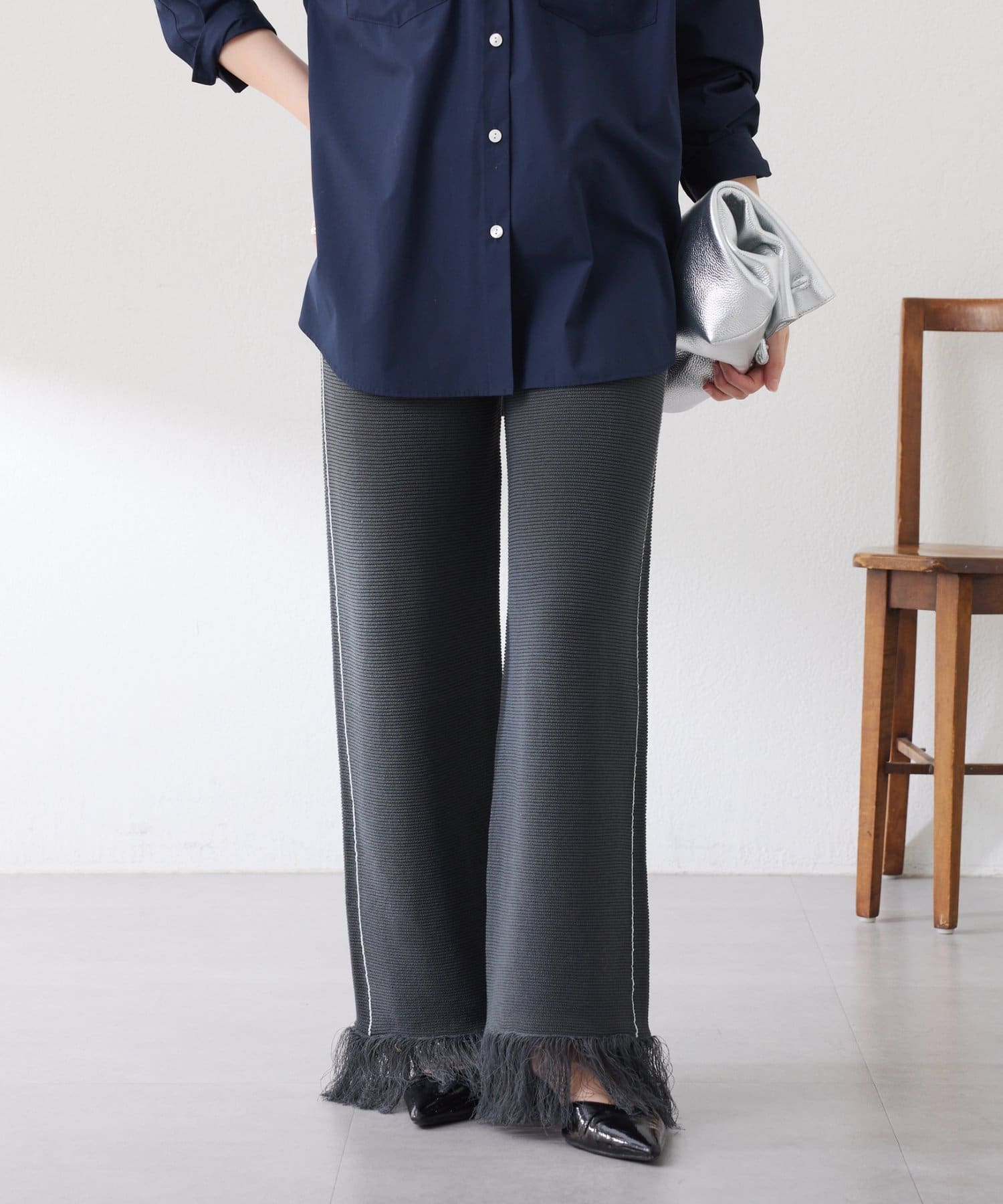 ・カジュアルに見えがちなニットパンツですが、裾のフリンジがワンポイントでおしゃれ見えします◎