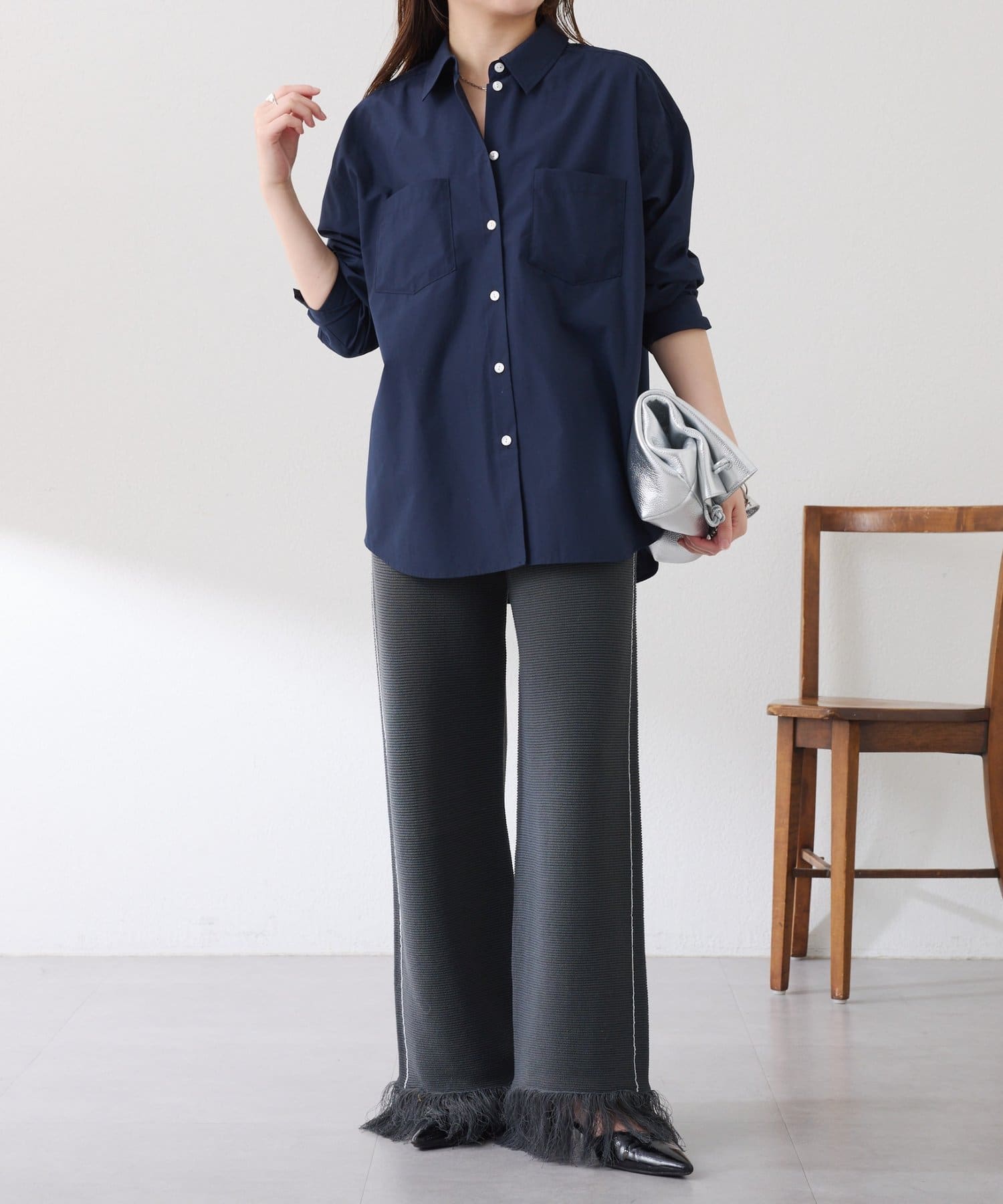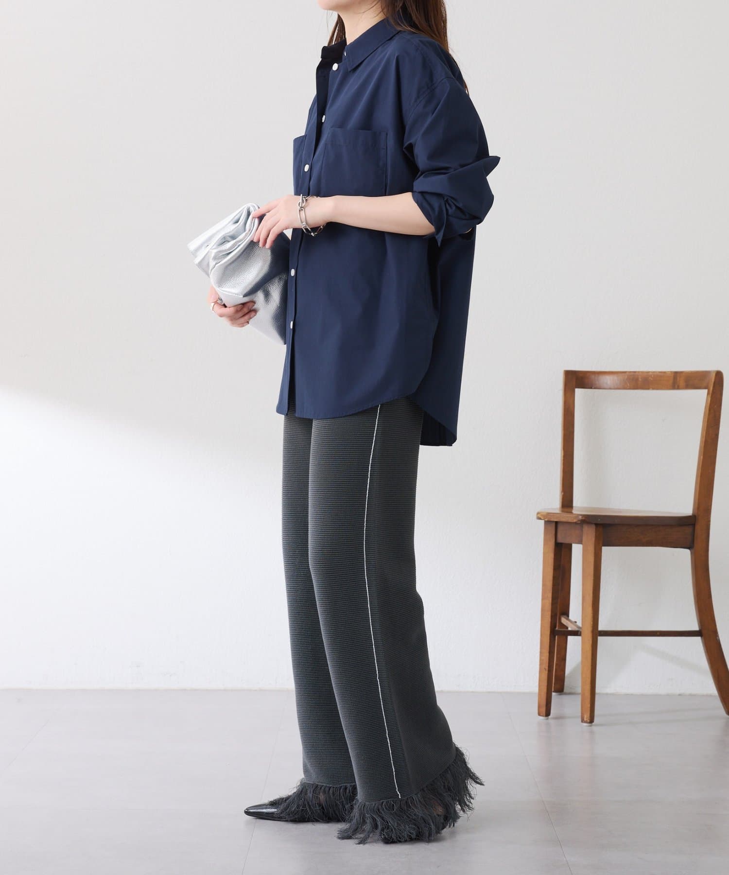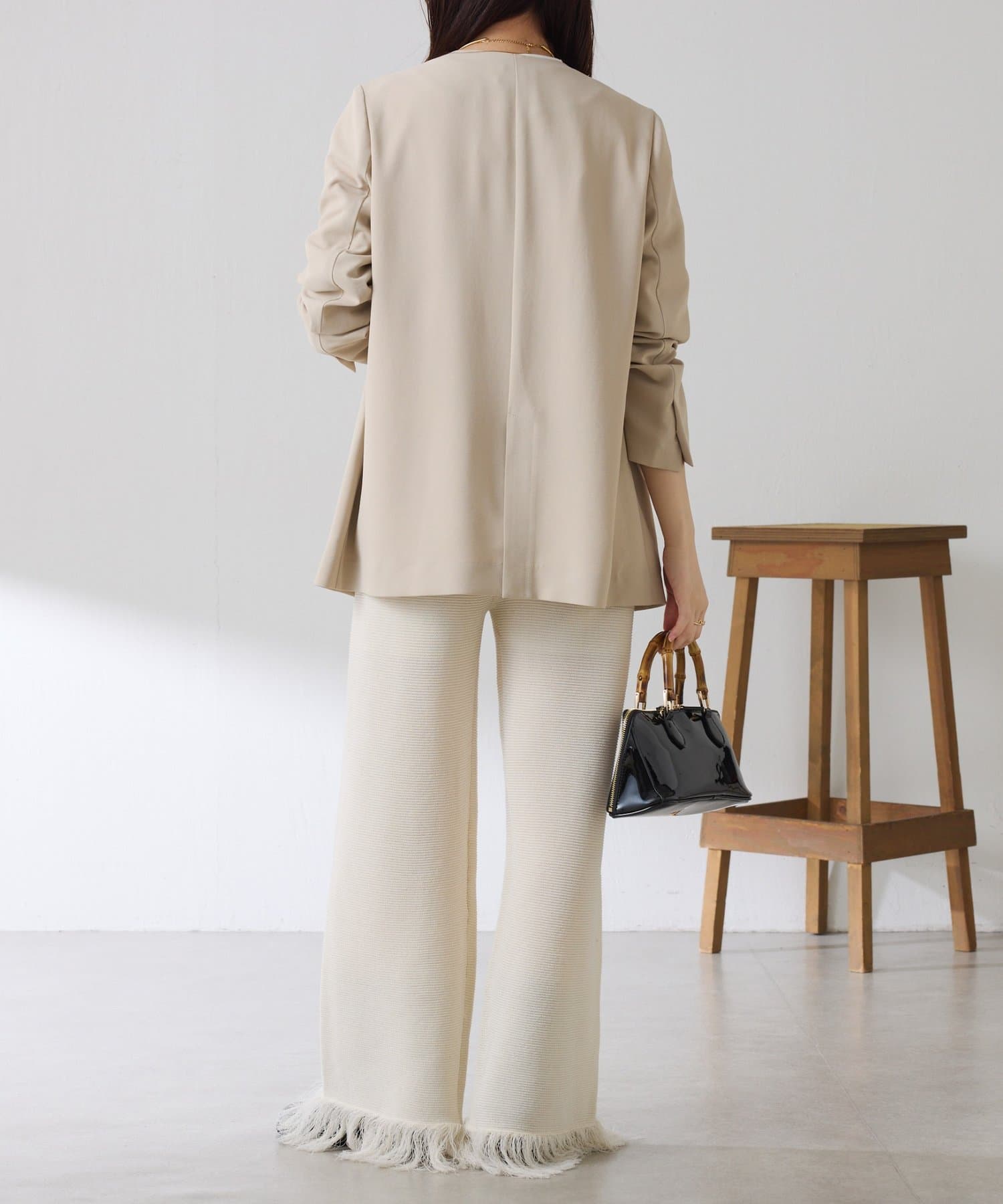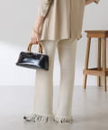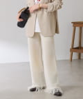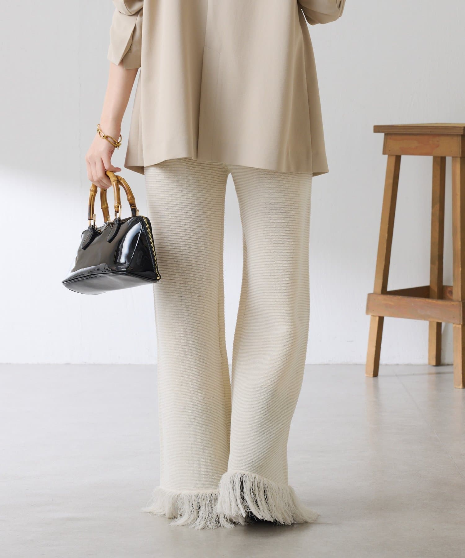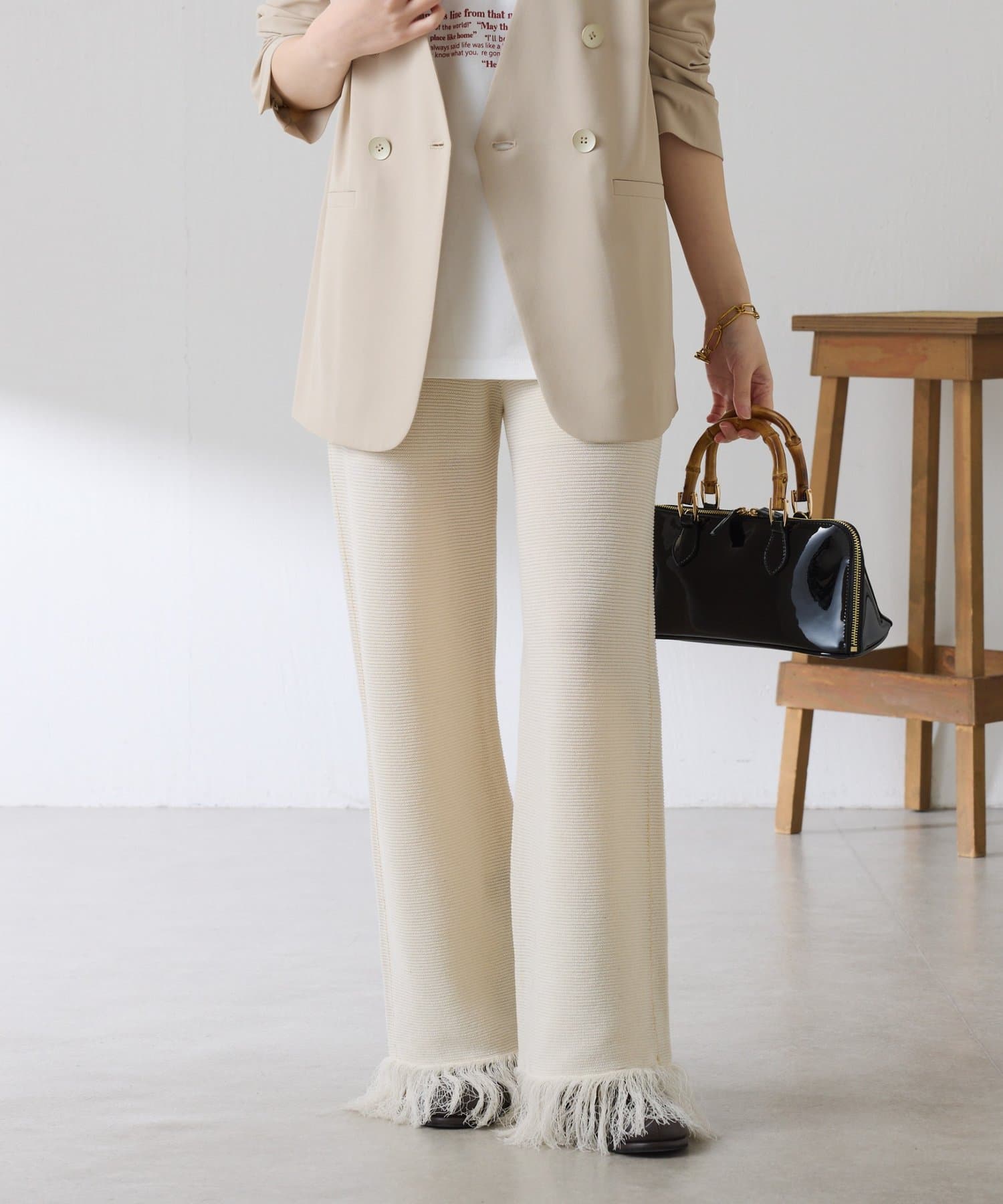 ・カジュアルに見えがちなニットパンツですが、裾のフリンジがワンポイントでおしゃれ見えします◎