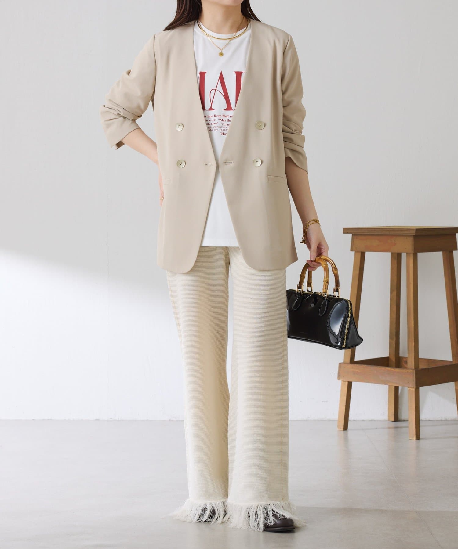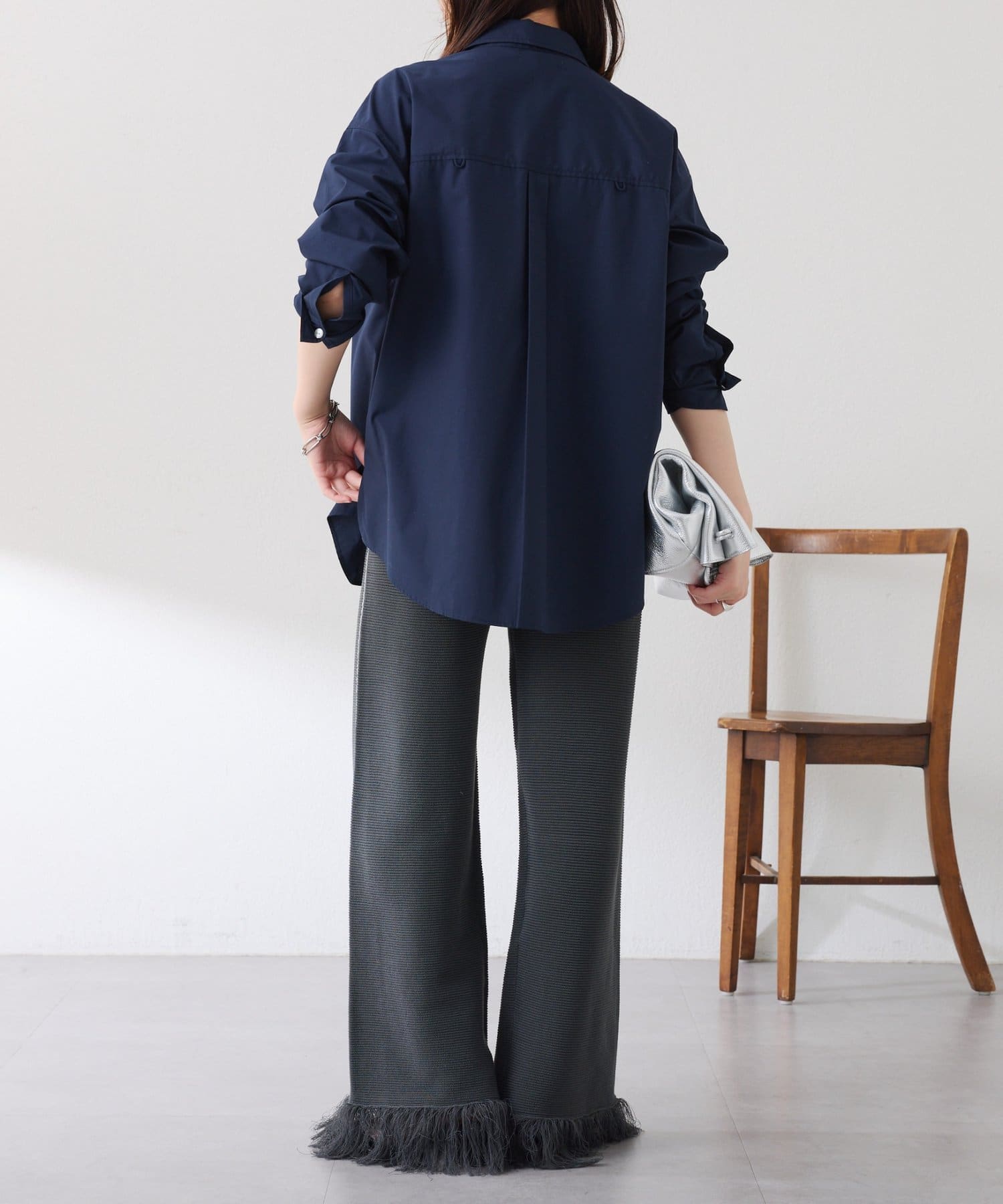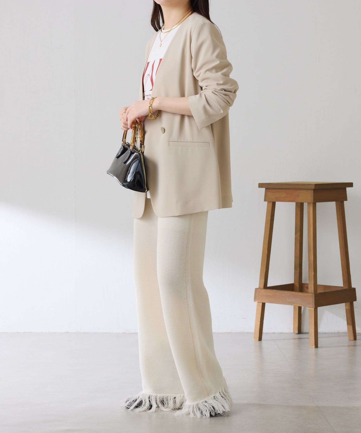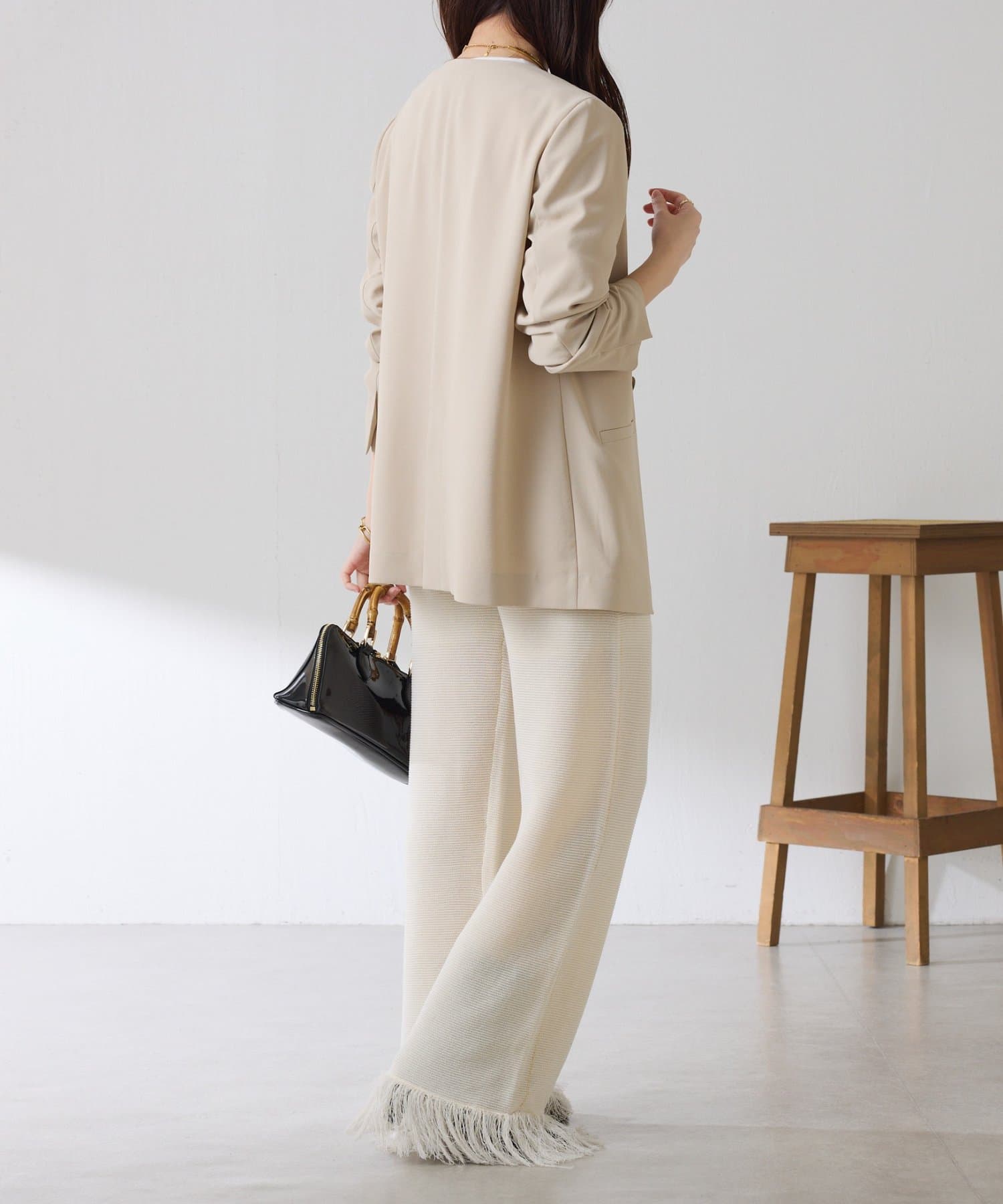 ・カジュアルに見えがちなニットパンツですが、裾のフリンジがワンポイントでおしゃれ見えします◎