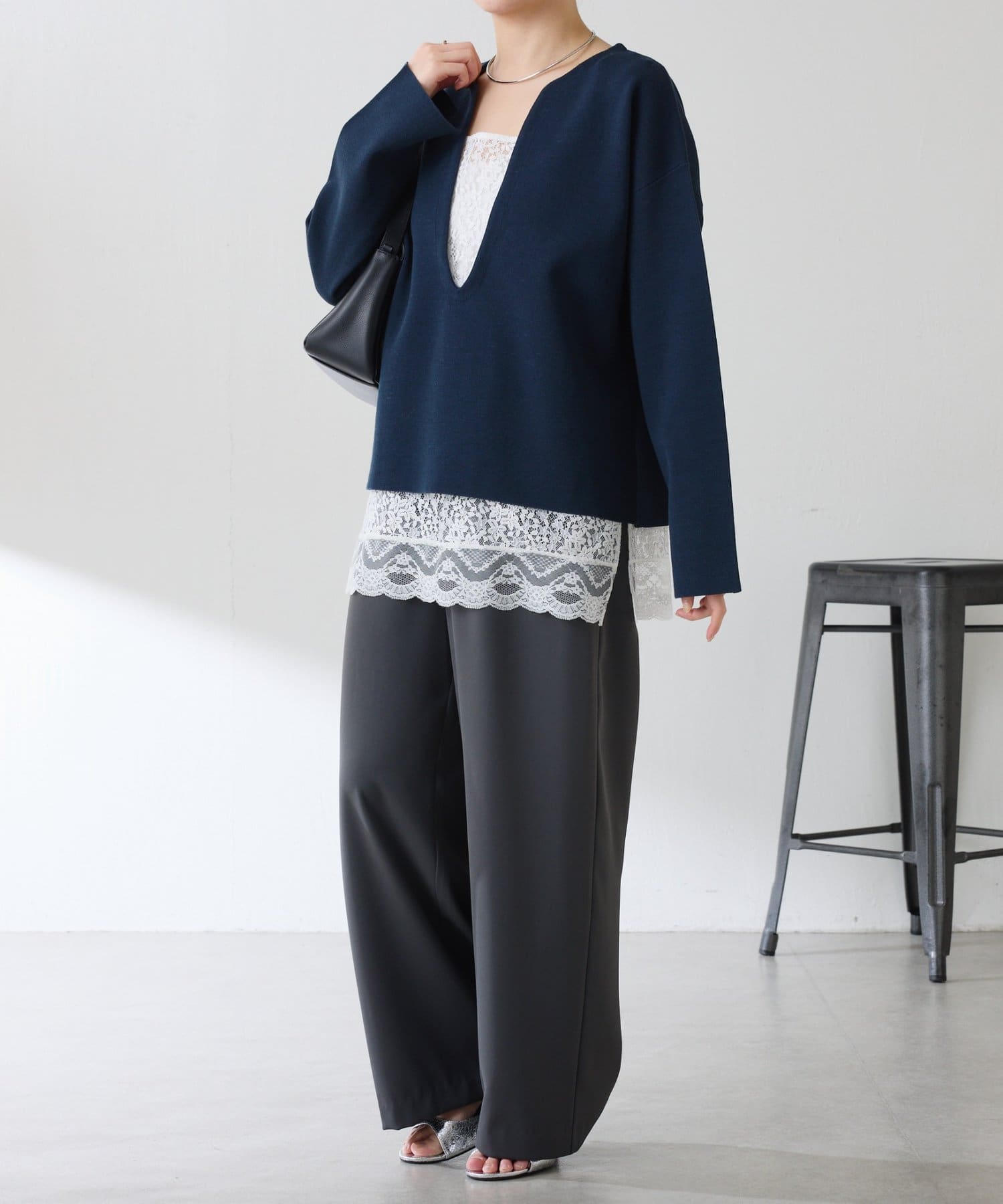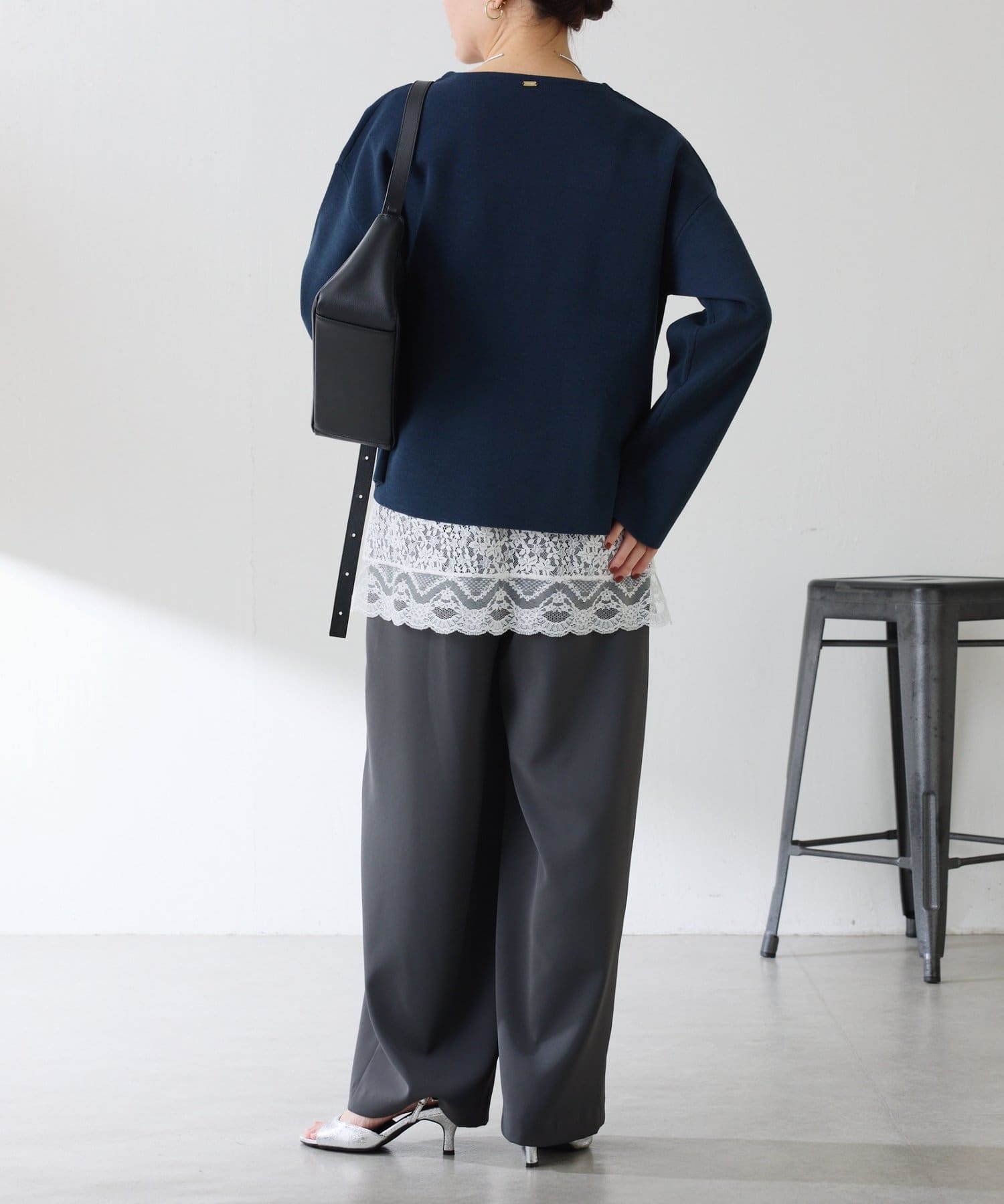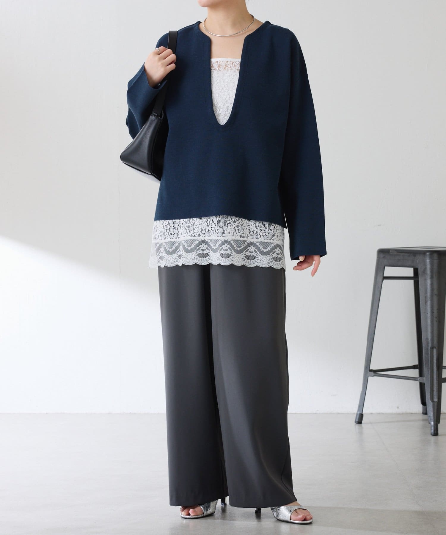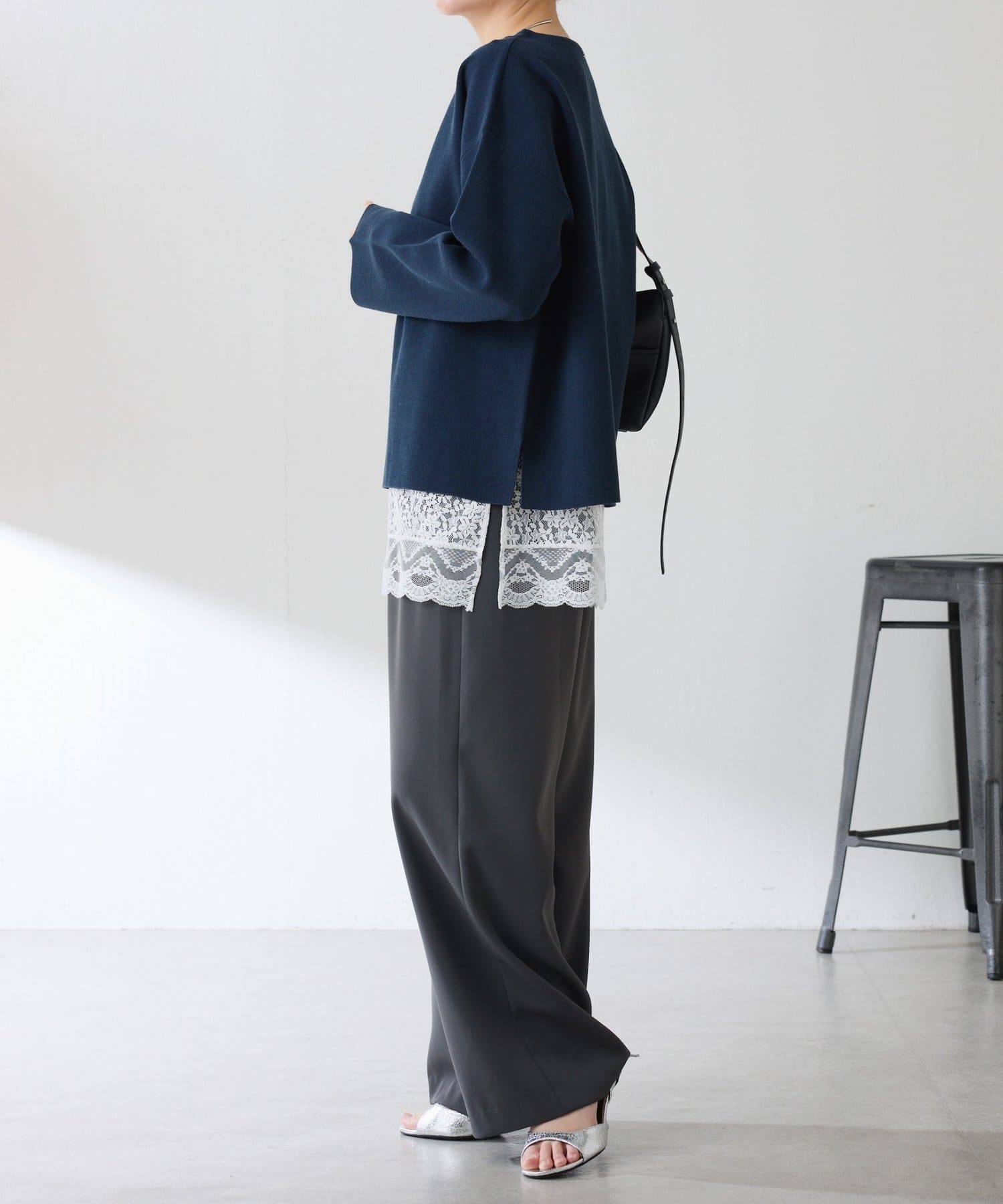 ニットやスウェット、Tシャツの裾からレースを覗かせるだけで一気に大人っぽいコーデに仕上がります。