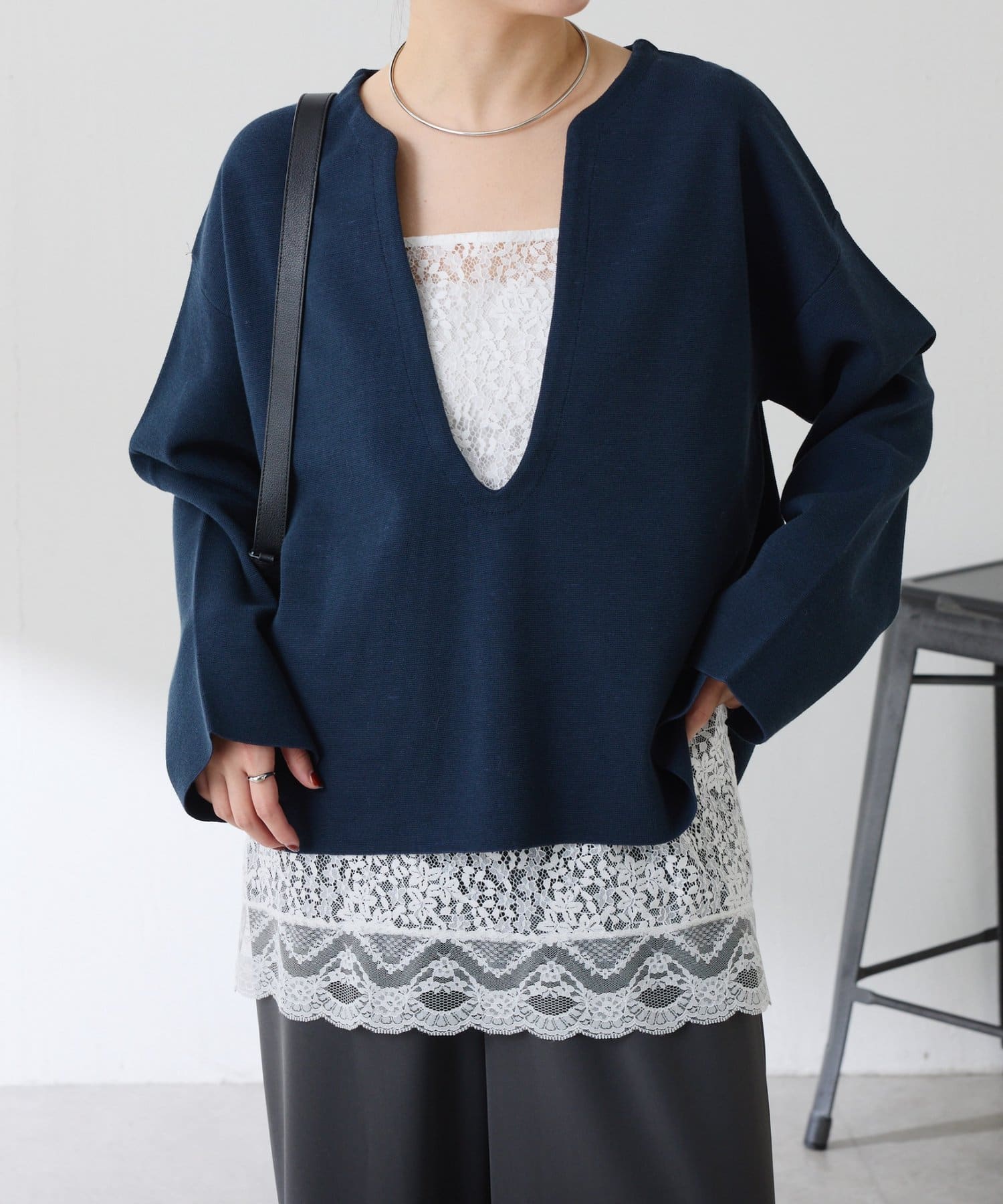 ・スクエアネックなので首周りに抜け感が生まれ、Vネックでもクルーネックでもどんなネックデザインとも合わせやすいです。