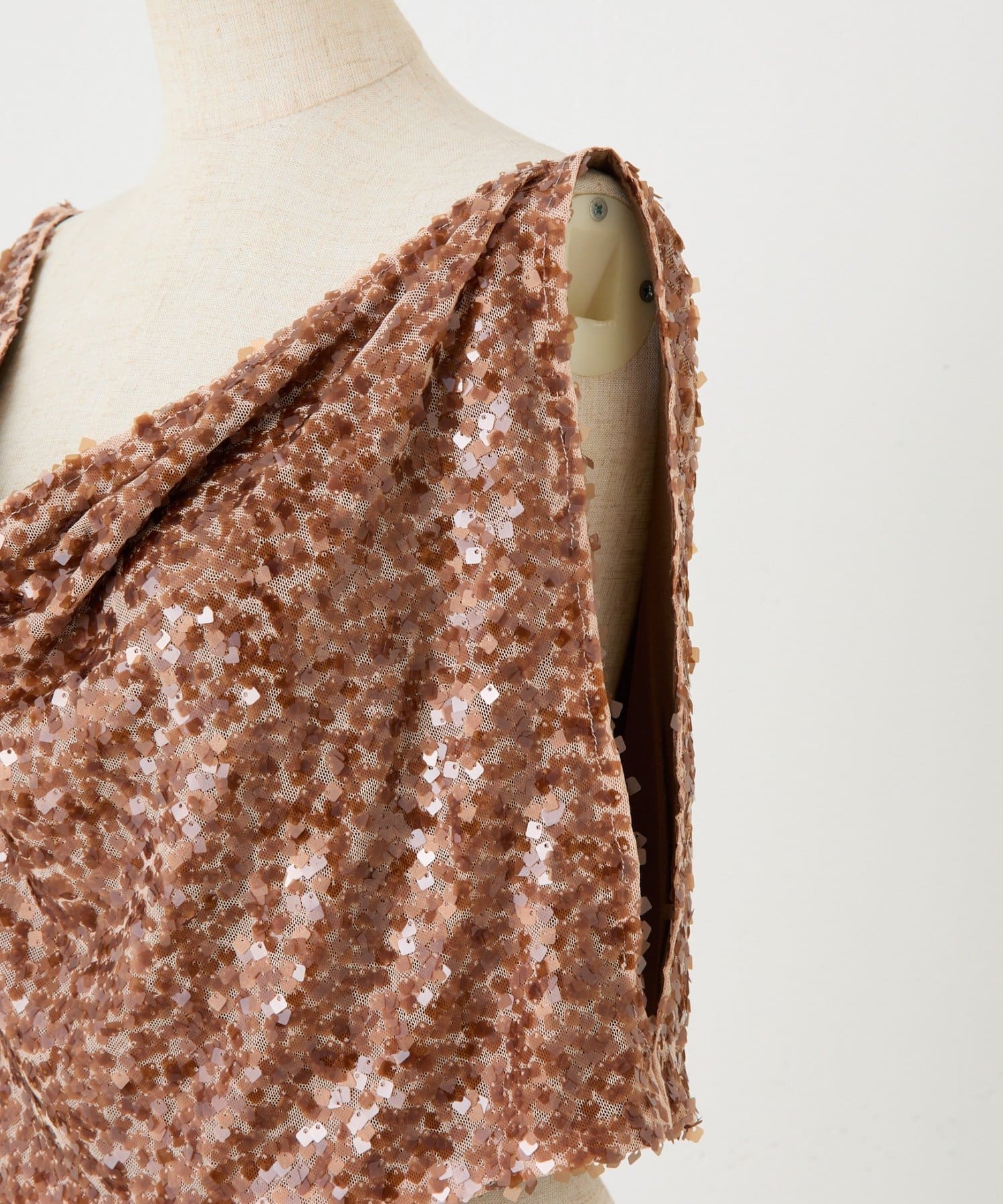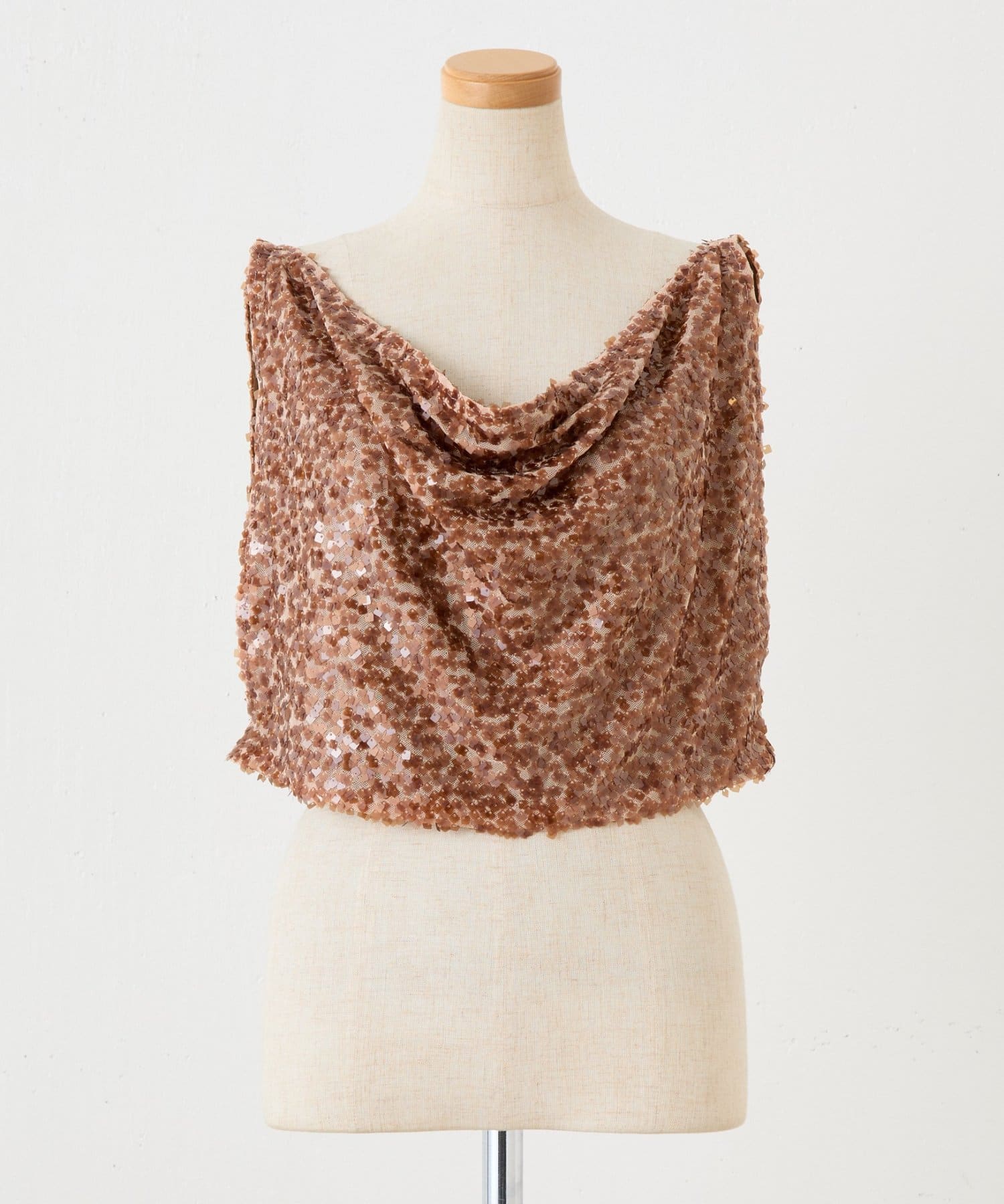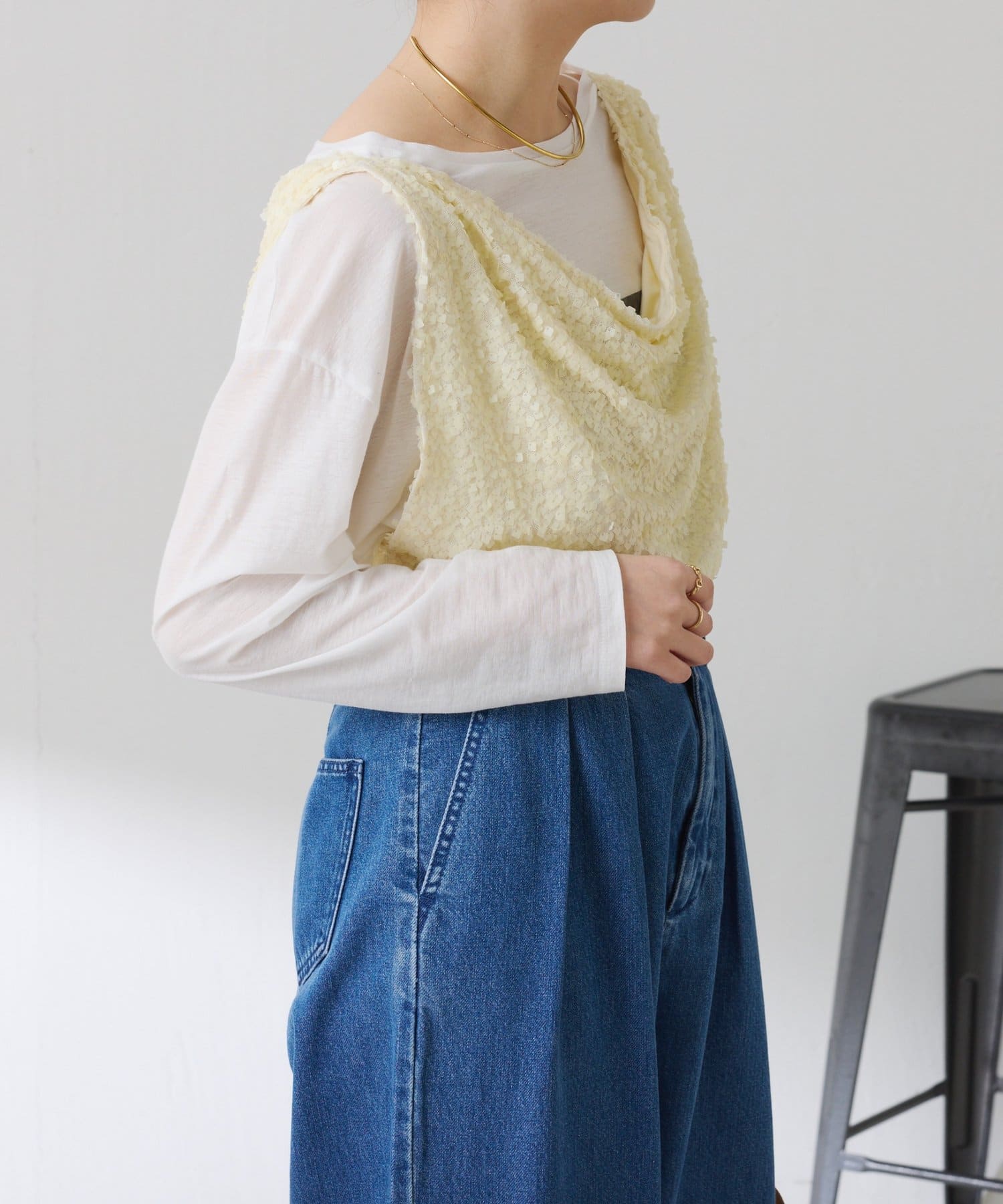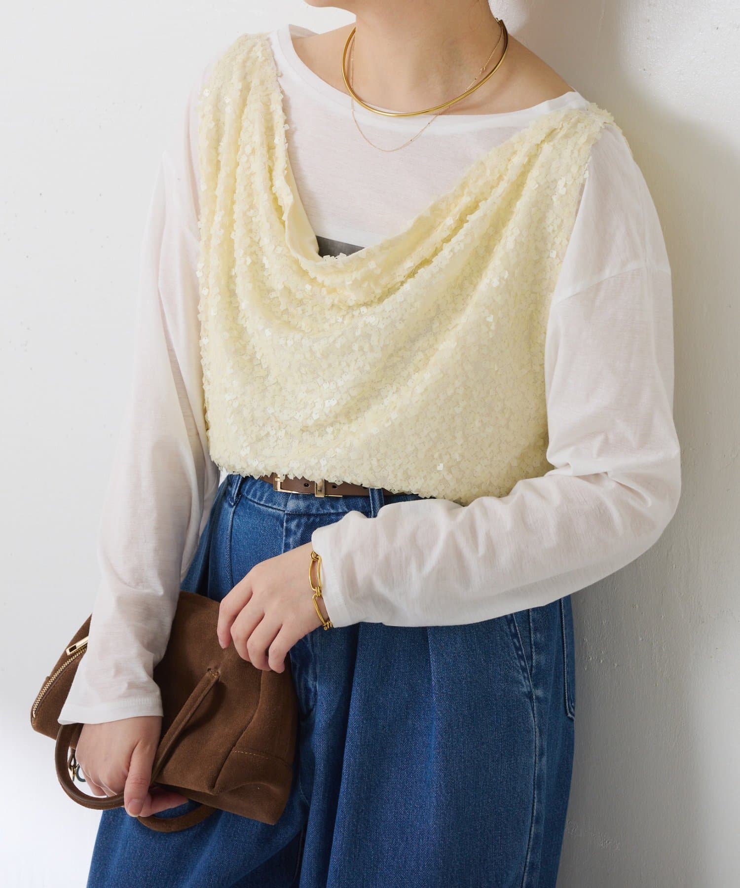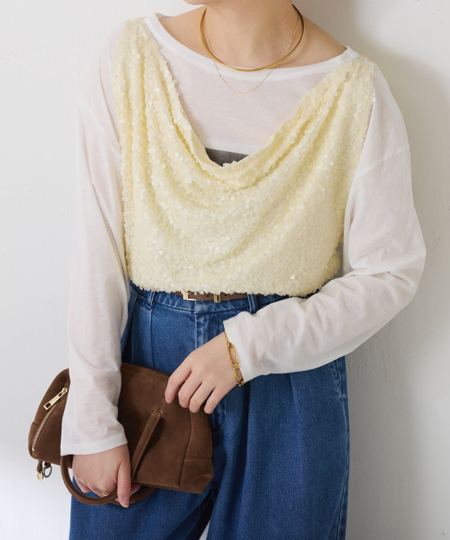 ・キラキラが目を引くスパンコールベスト。前後どちらで着てもドレープの動きが楽しめます。