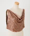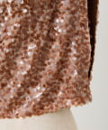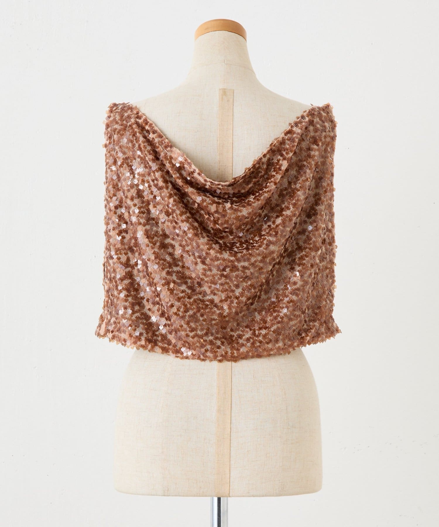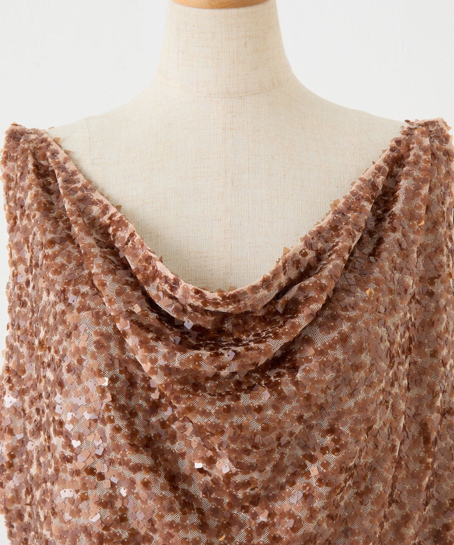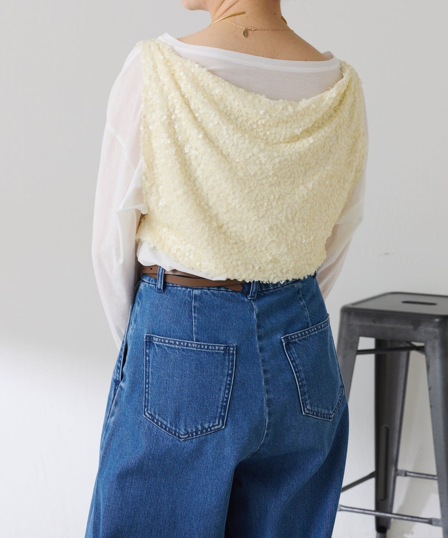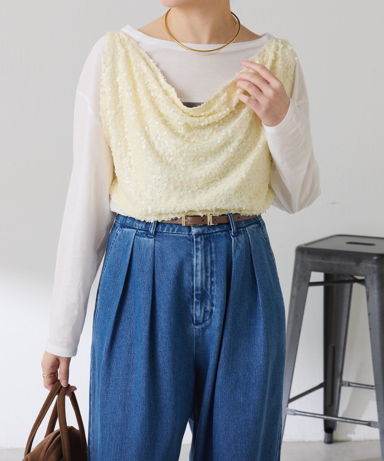 ・キラキラが目を引くスパンコールベスト。前後どちらで着てもドレープの動きが楽しめます。