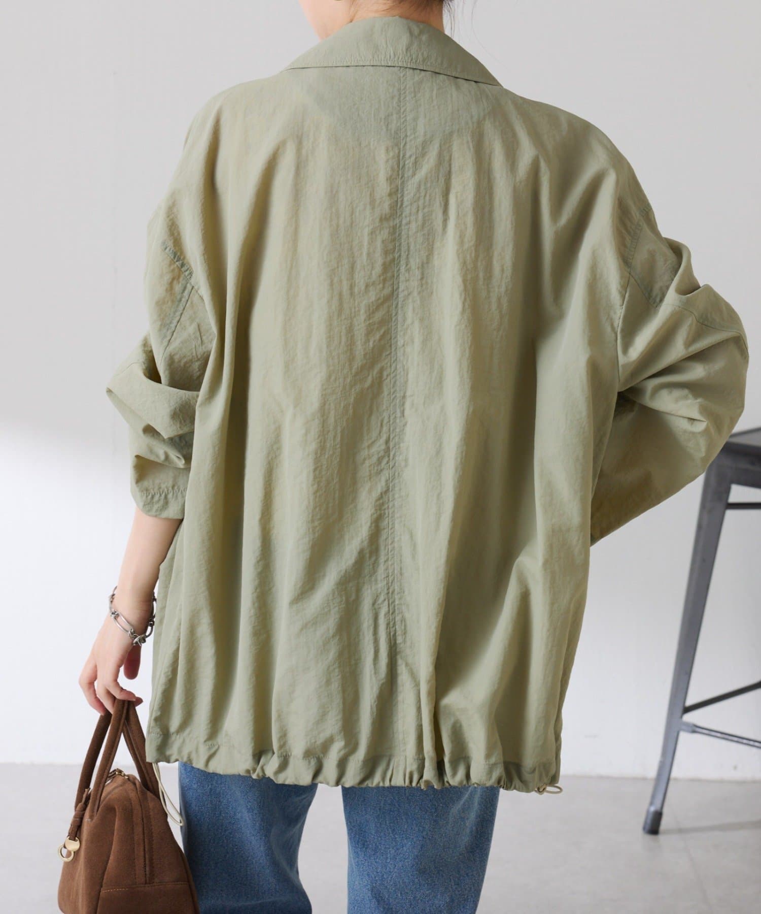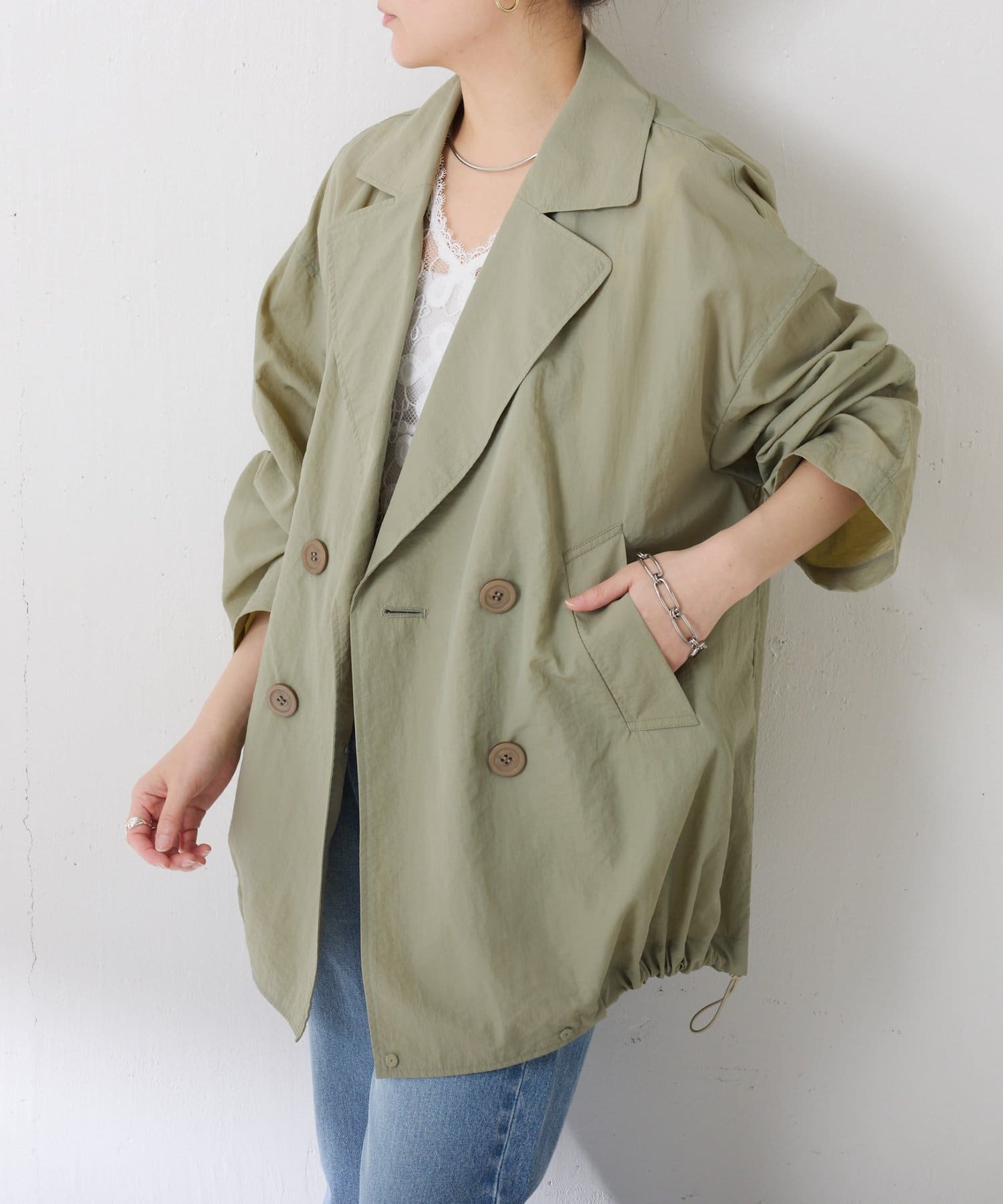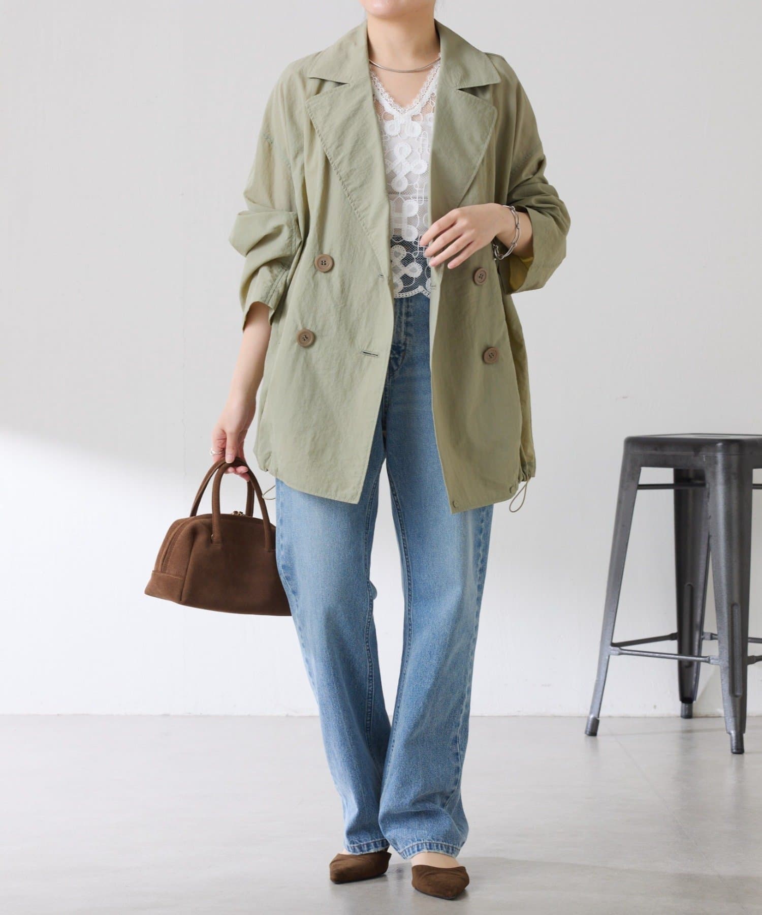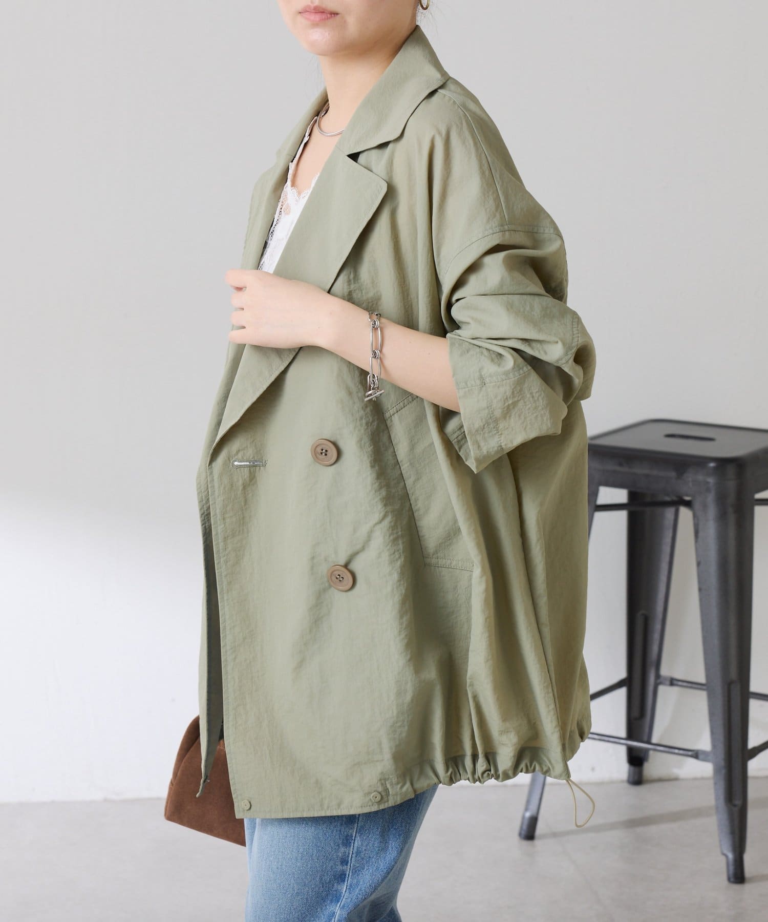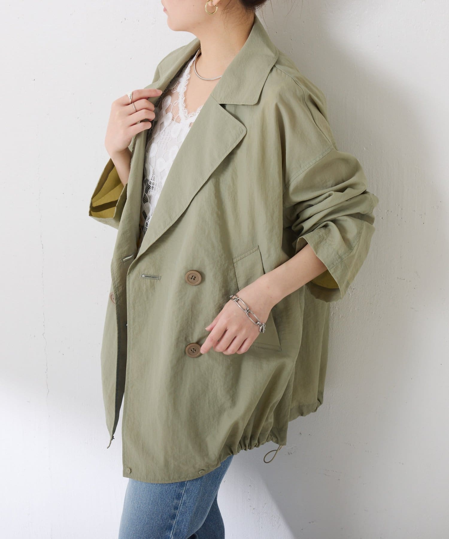・きちんと見えするトレンチデザインですが、裾のドロストコードを絞るとブルゾンっぽくも着ていただけます◎