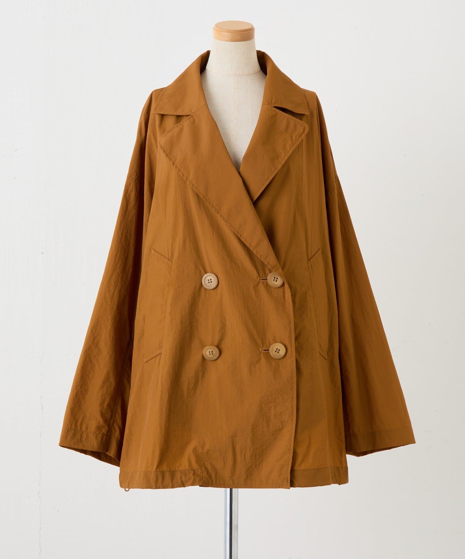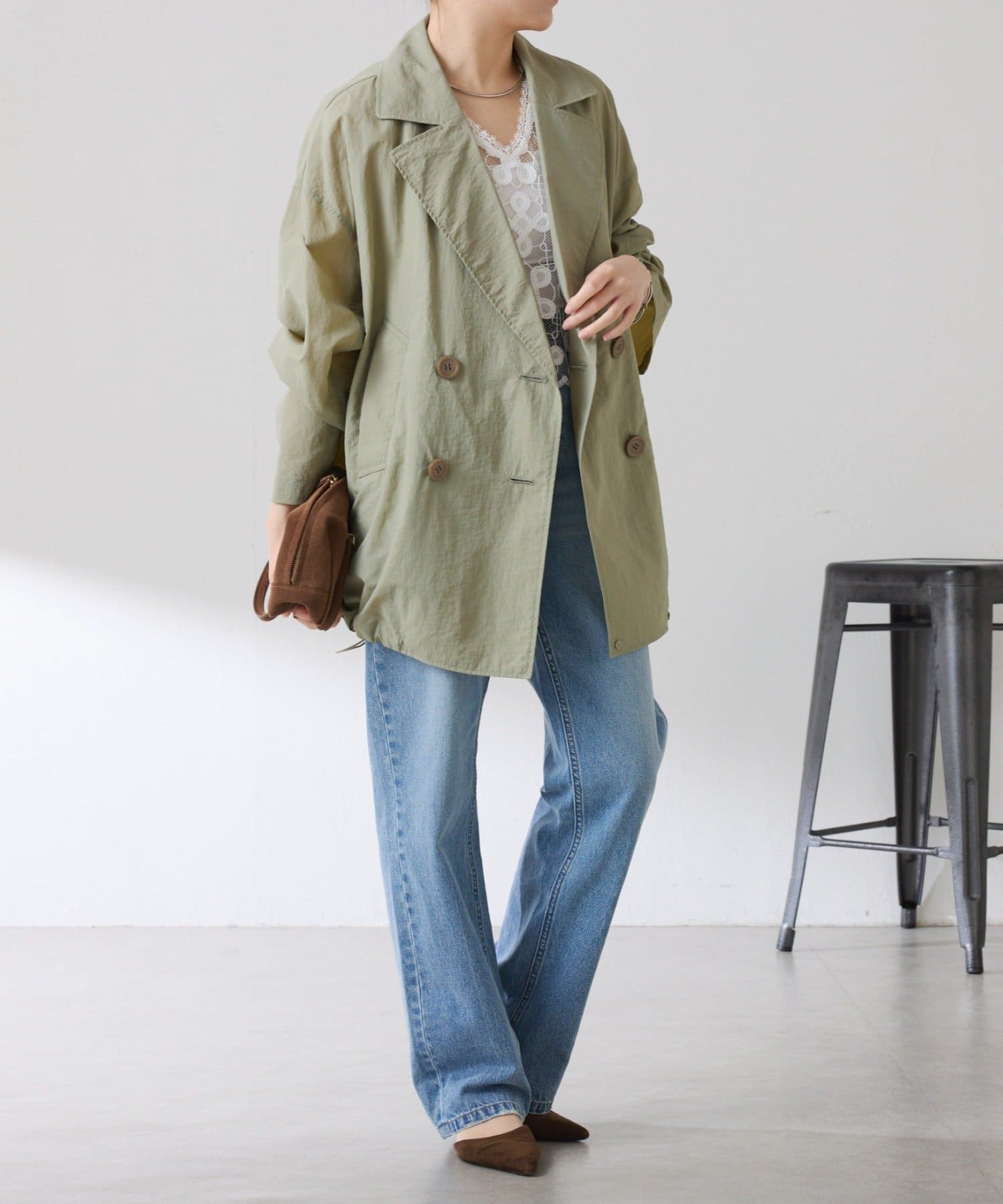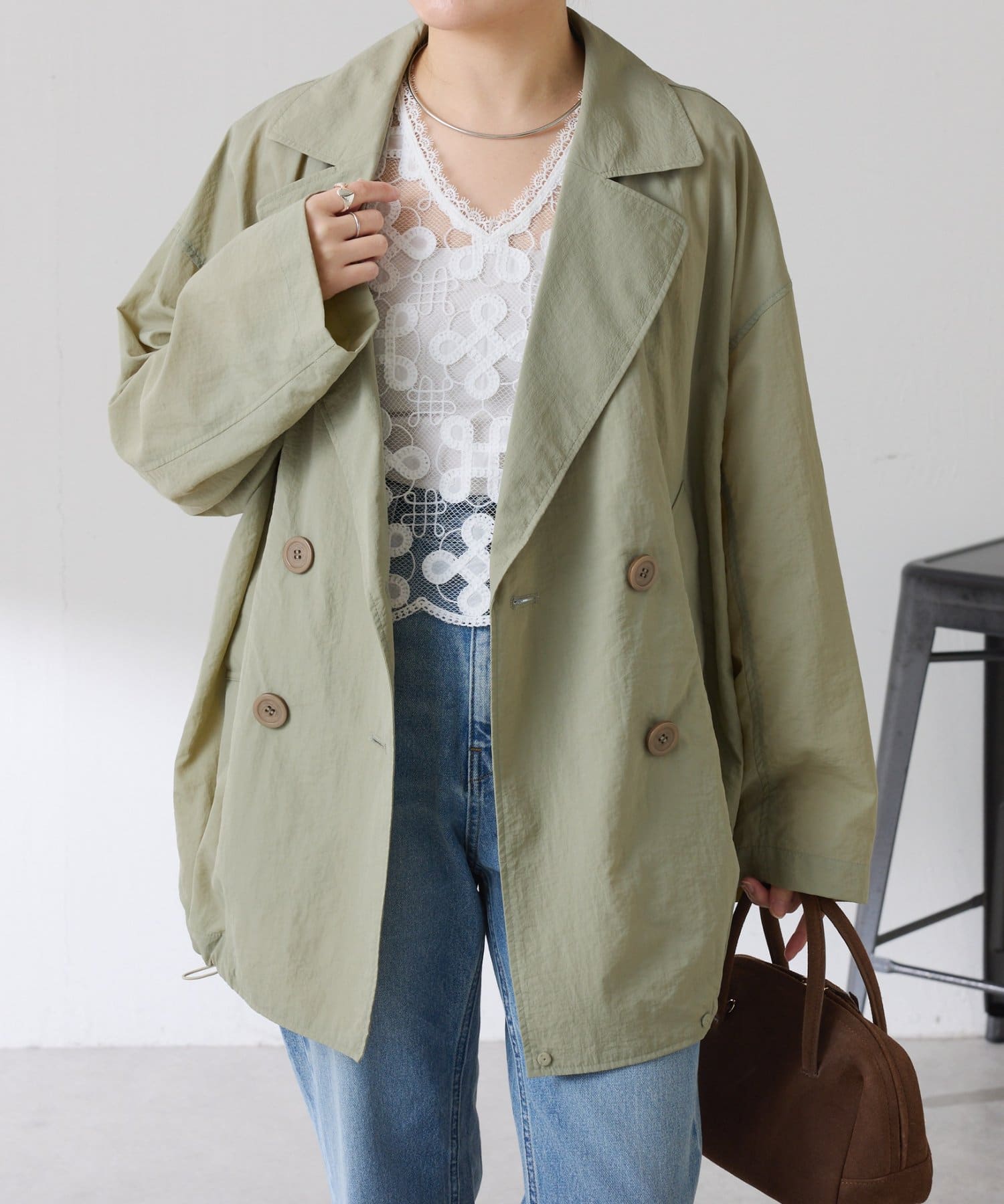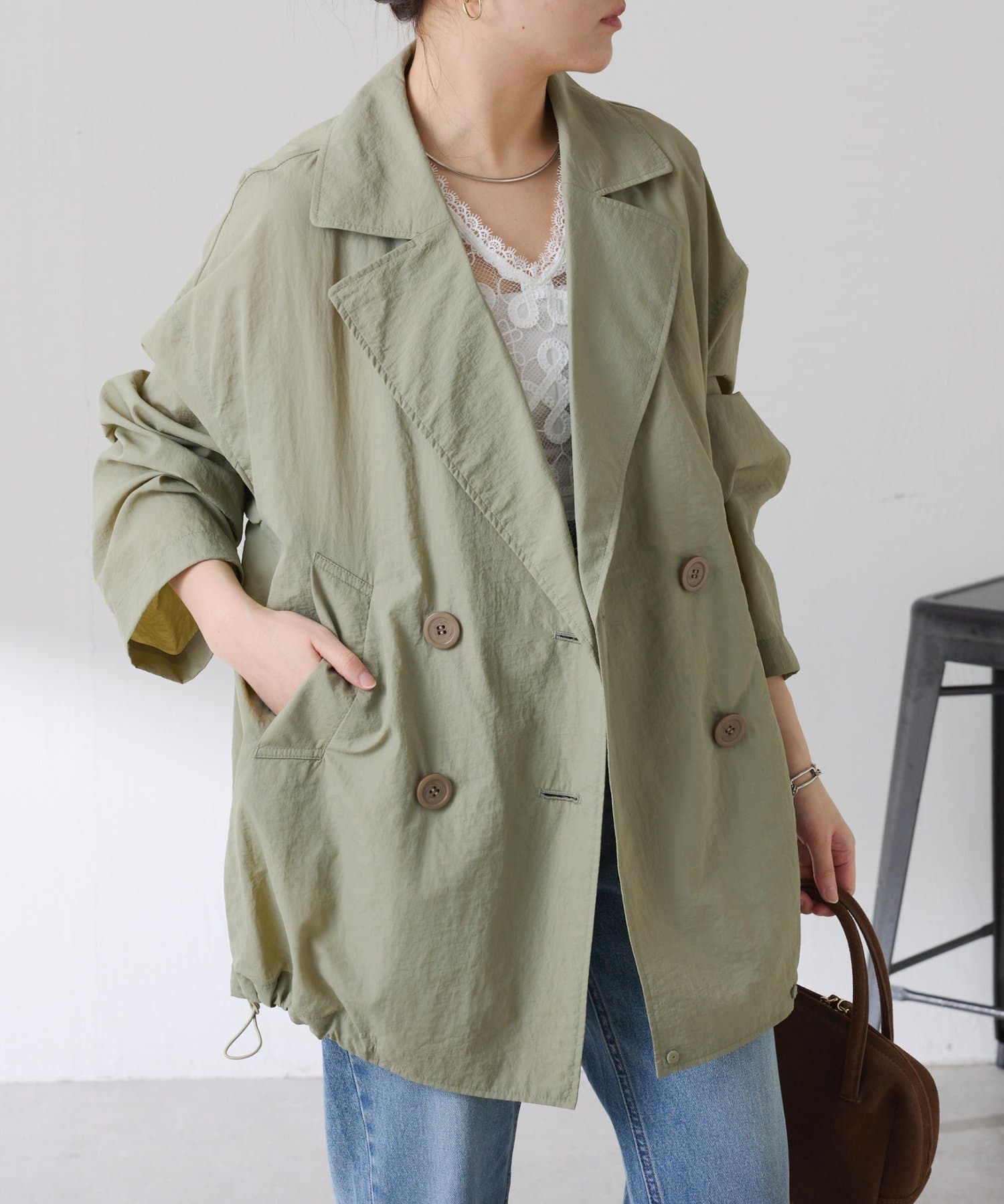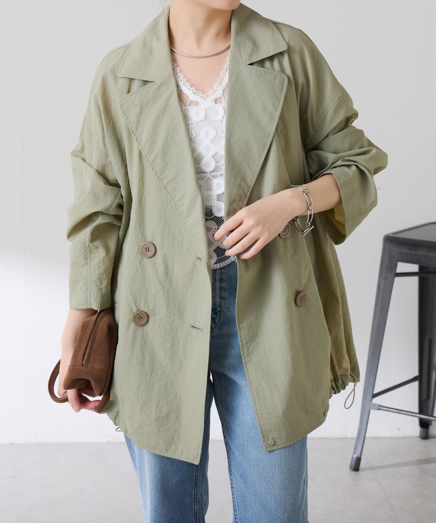 ・きちんと見えするトレンチデザインですが、裾のドロストコードを絞るとブルゾンっぽくも着ていただけます◎