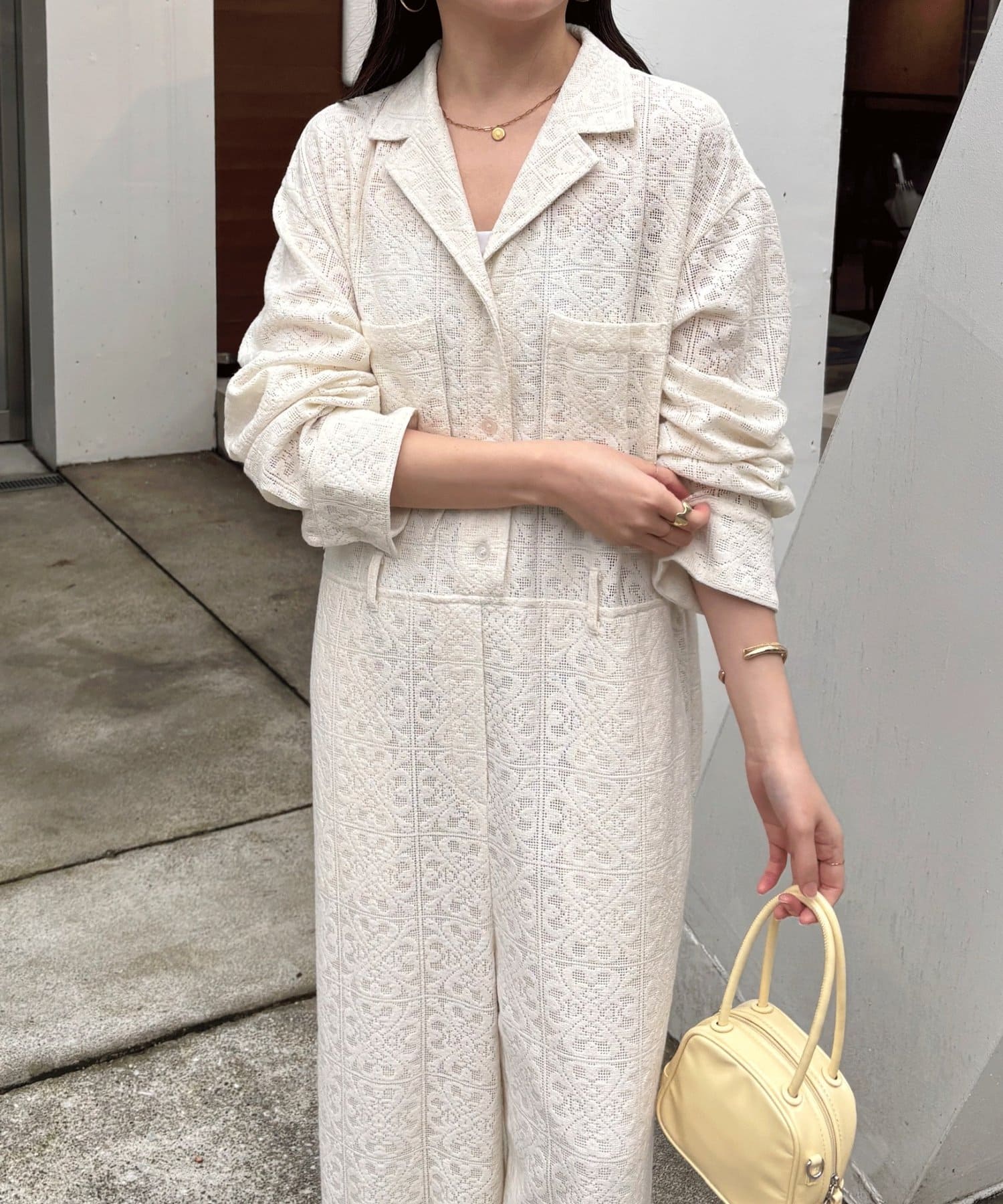 ・カジュアル見えするジャンプスーツですが、抜け感のあるレースで大人っぽく着こなせます◎