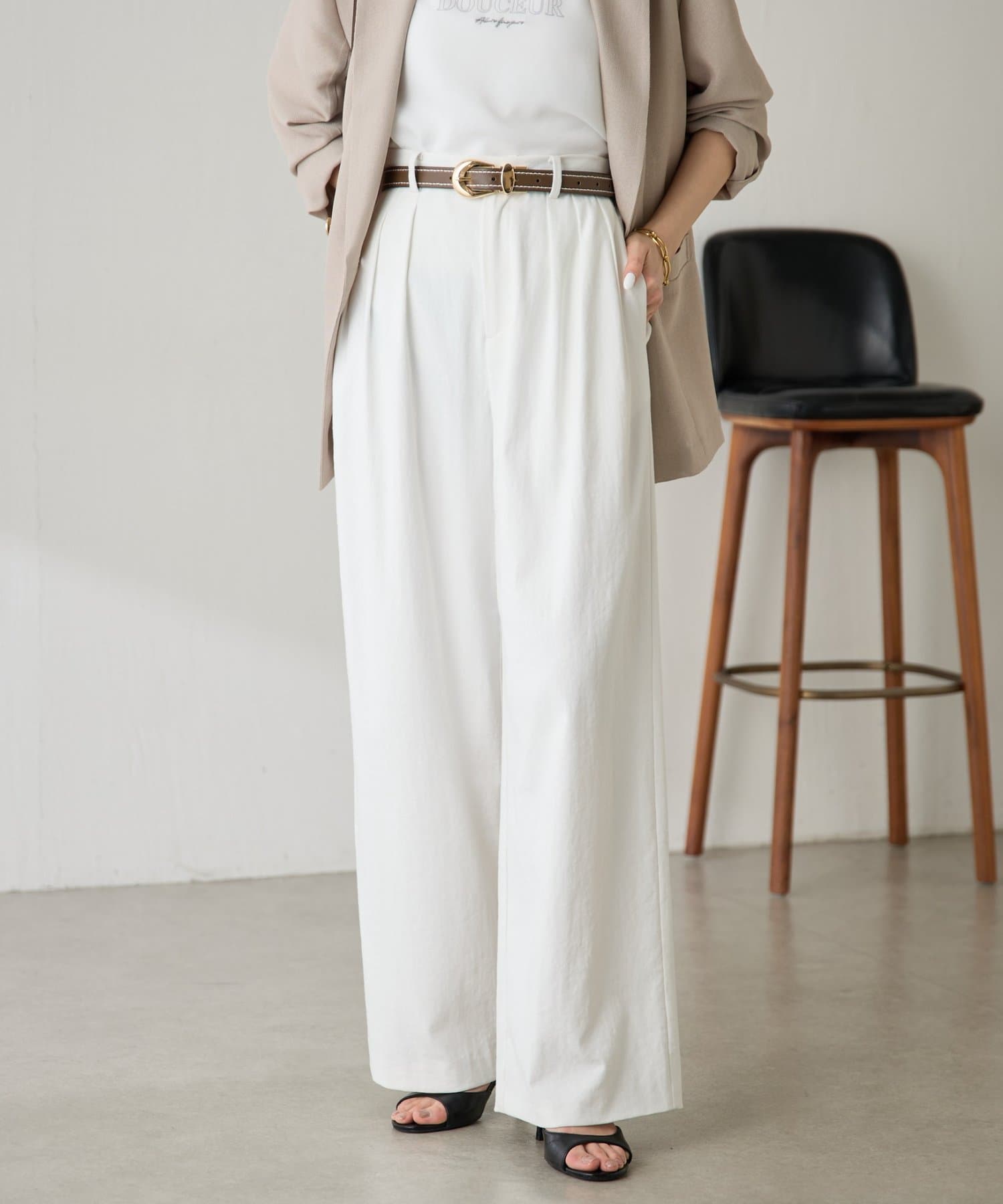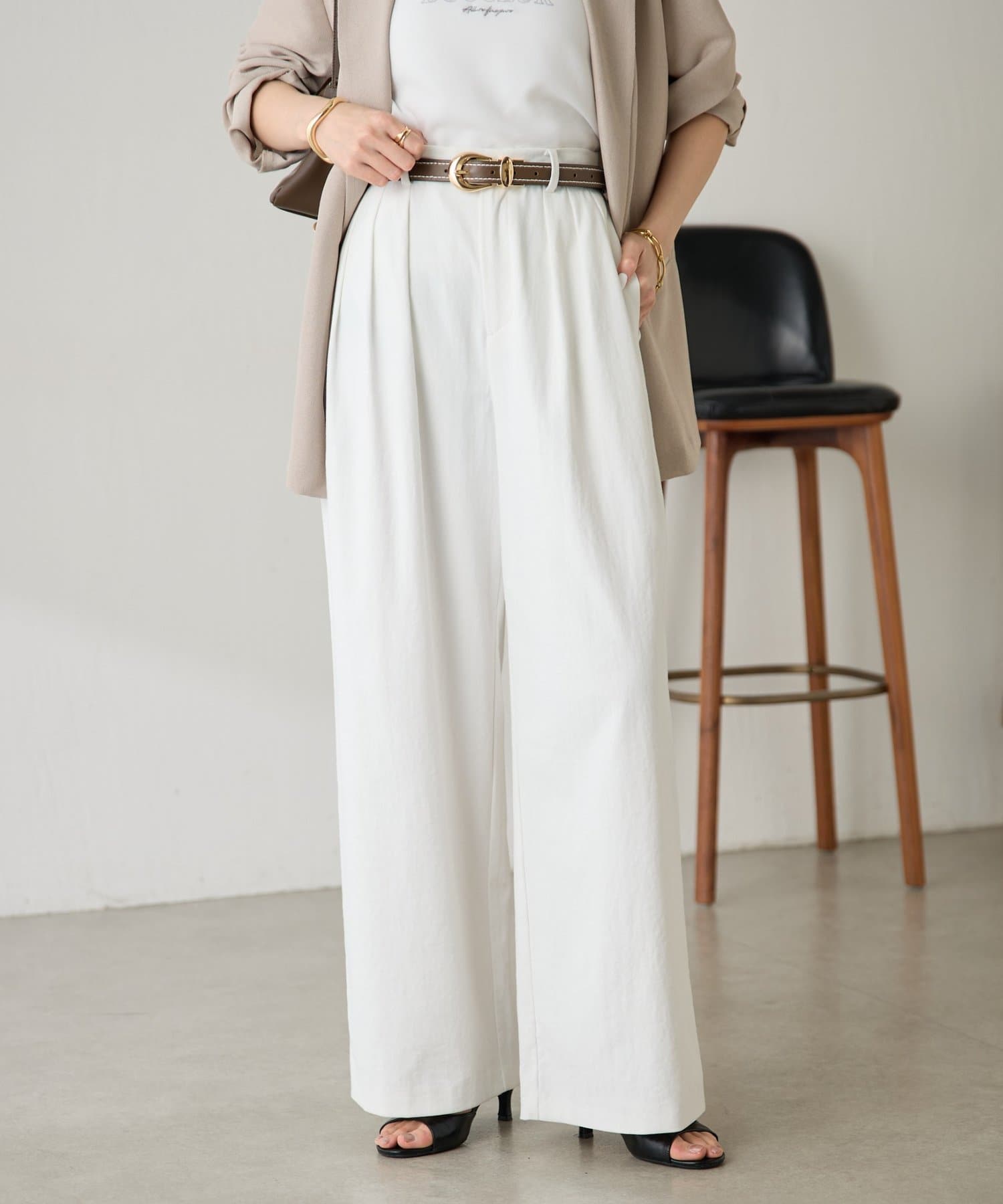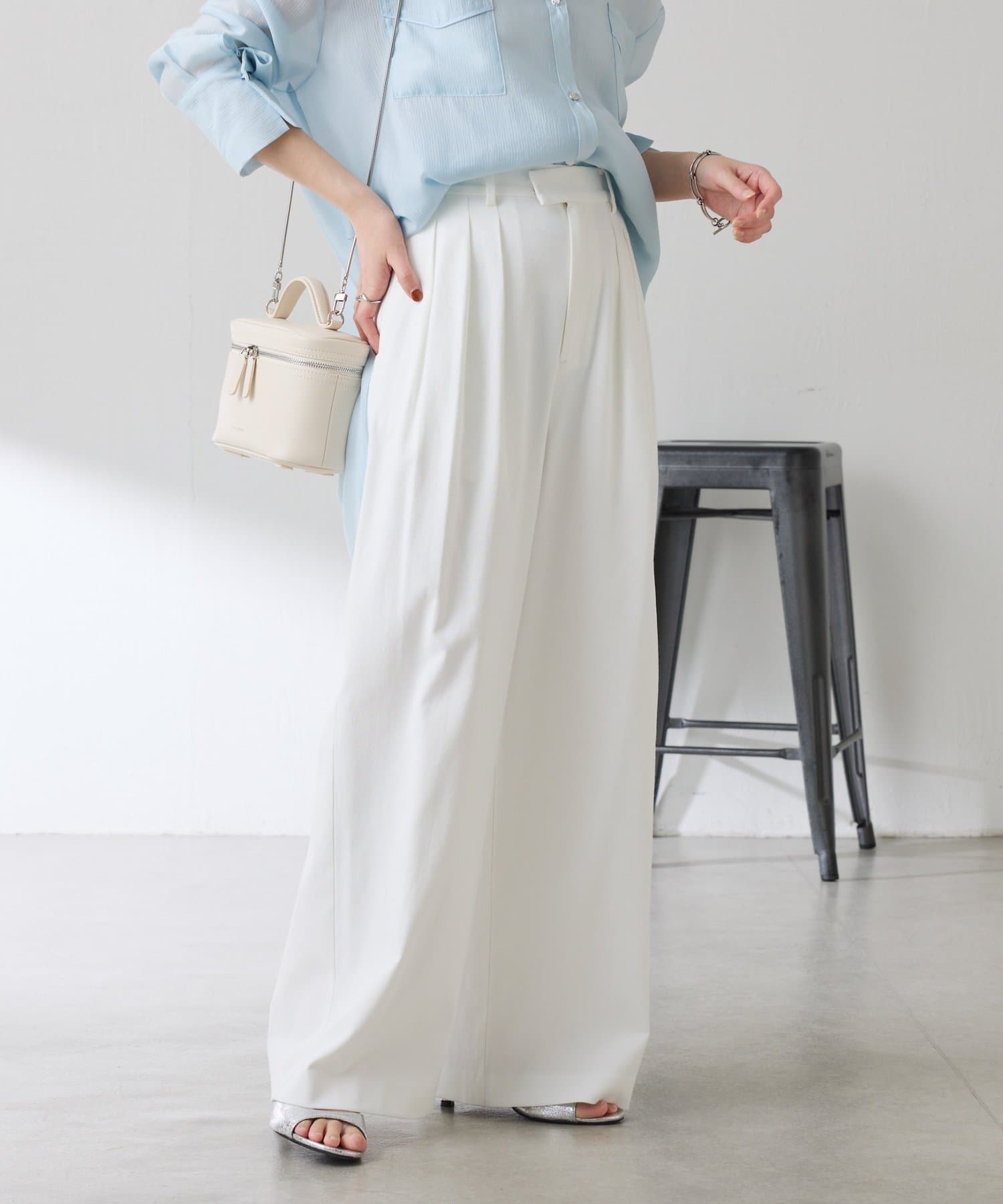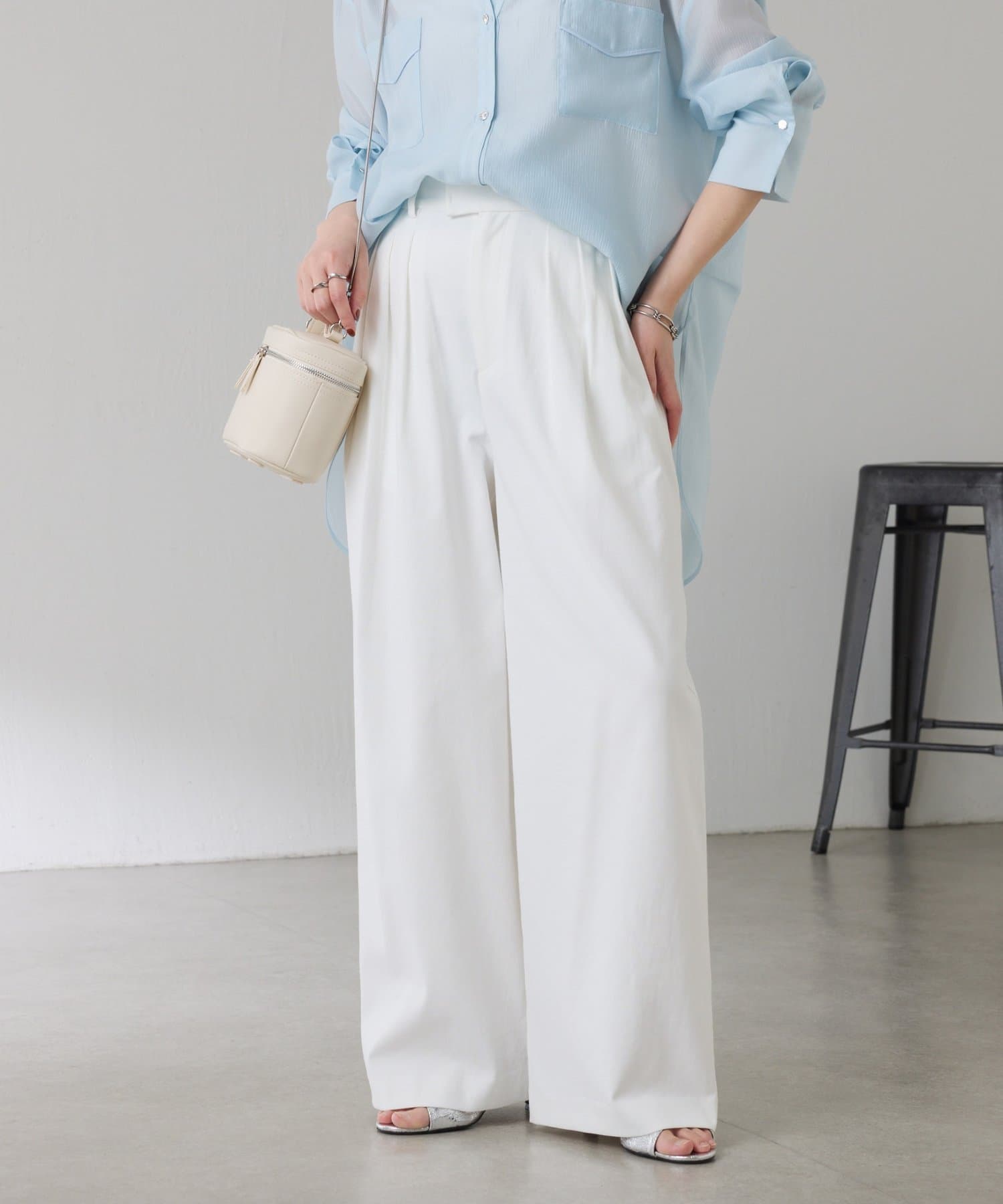 ・フロントに施した3タックがウエスト周りをすっきり見せてくれるワイドシルエットのパンツ。