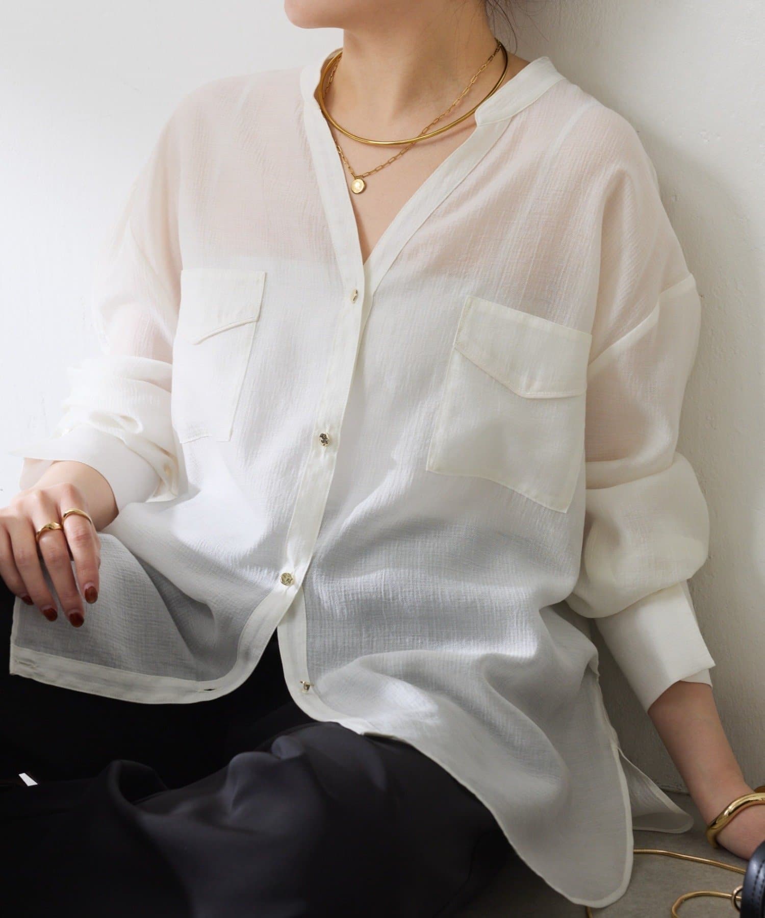 ・今年は凹凸した表情感のある生地を使用したスキッパーデザインのシアーシャツ。