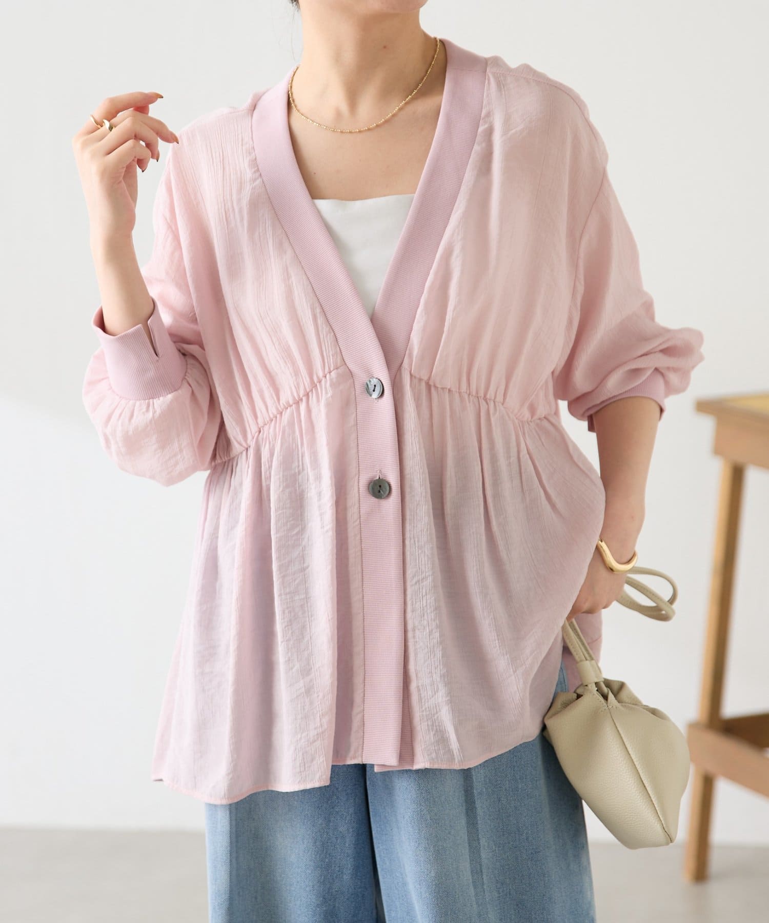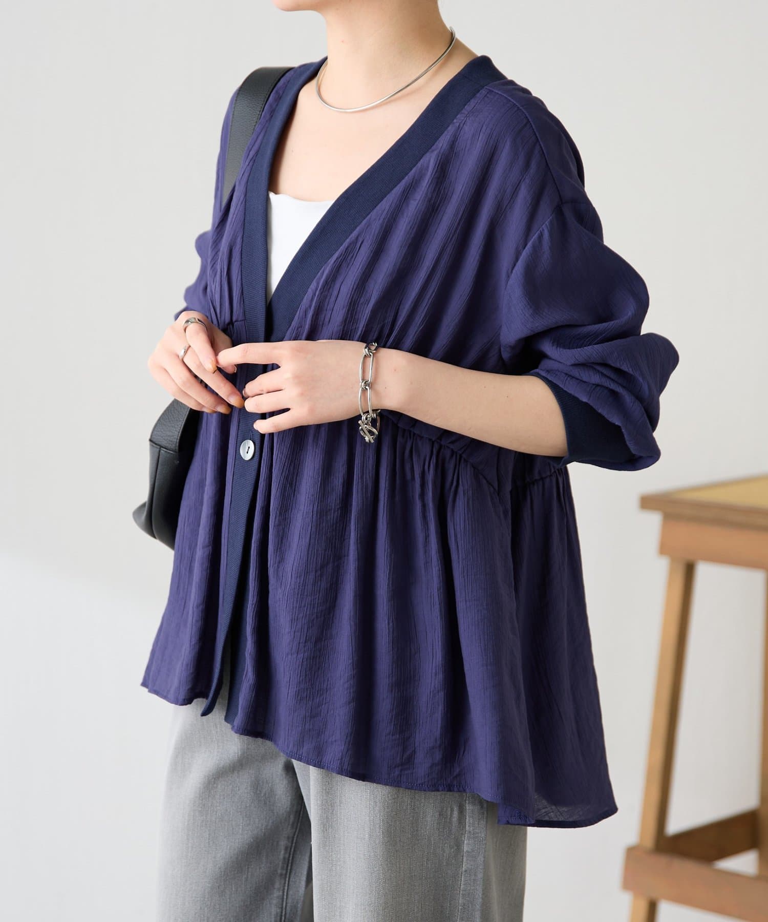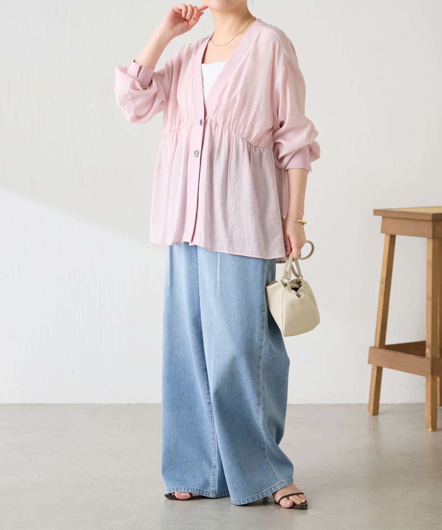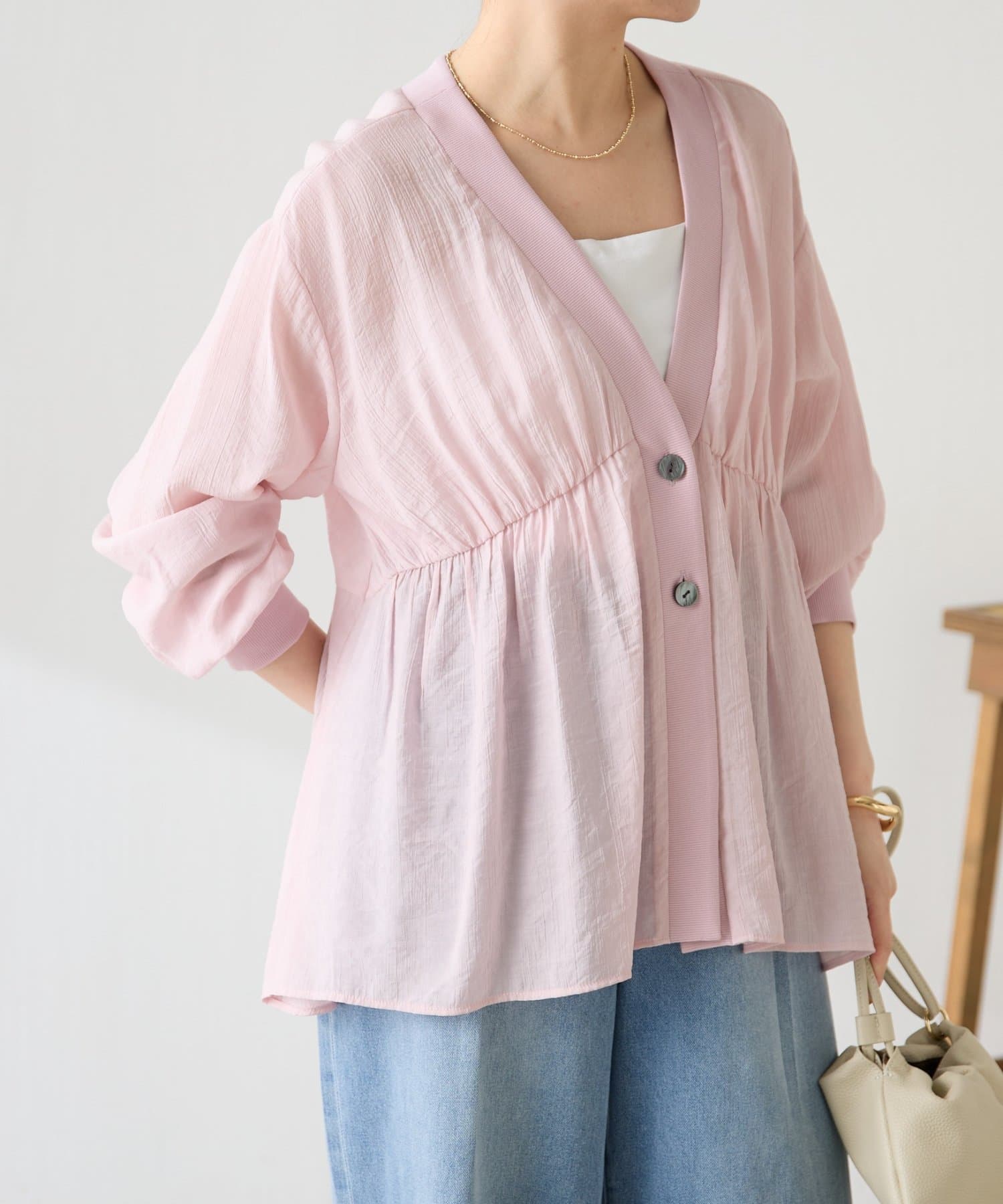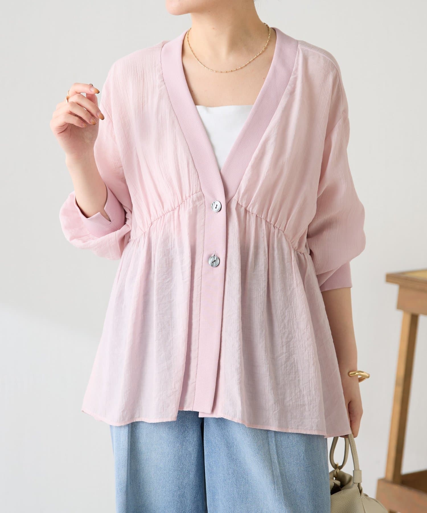 【軽量/体型カバー】ギャザー切替シアーシャツカーディガン
