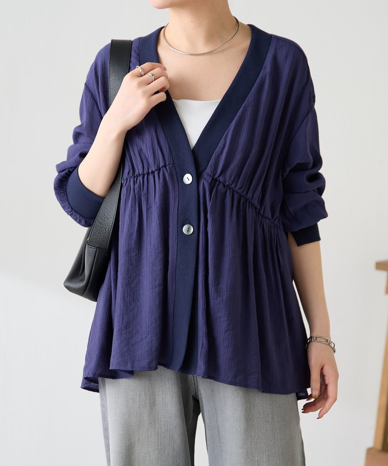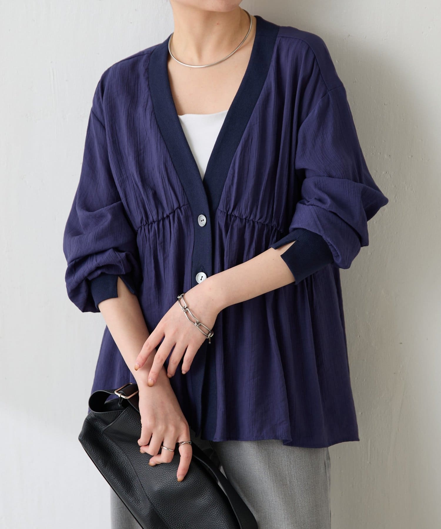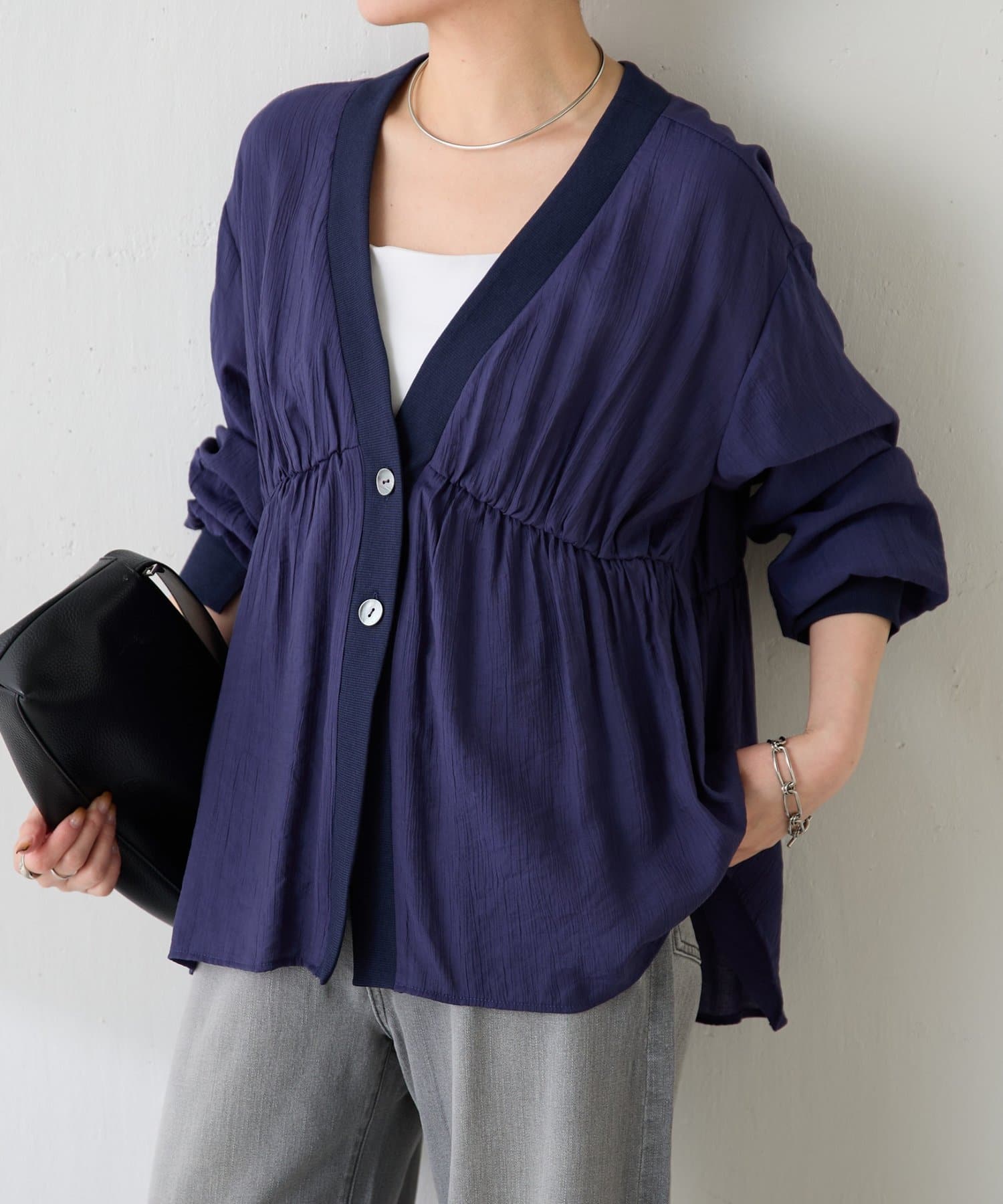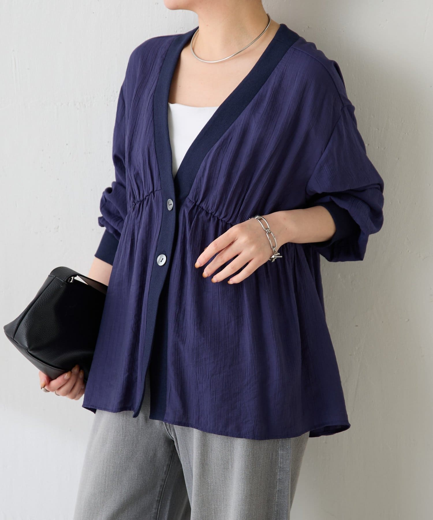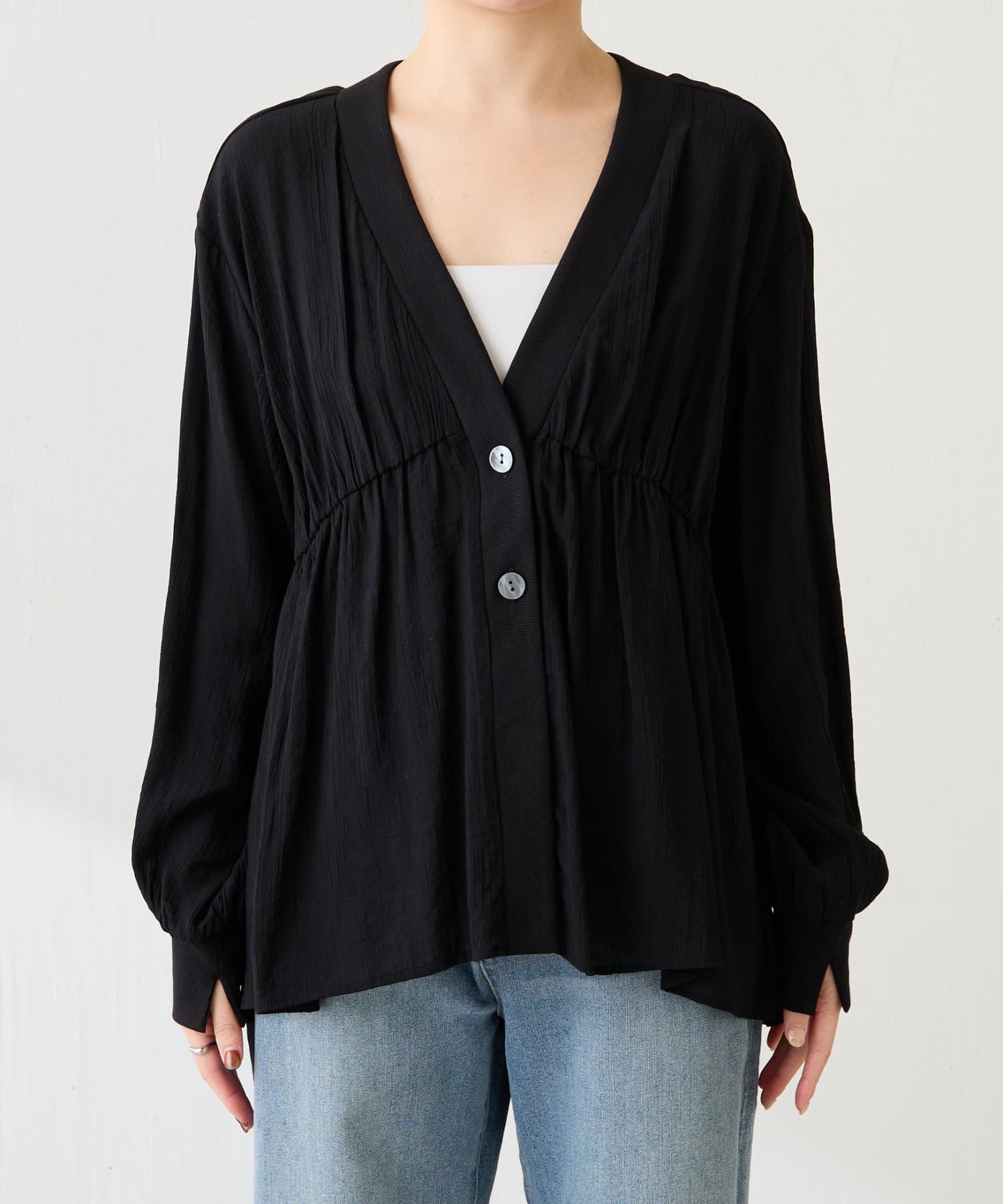 【軽量/体型カバー】ギャザー切替シアーシャツカーディガン