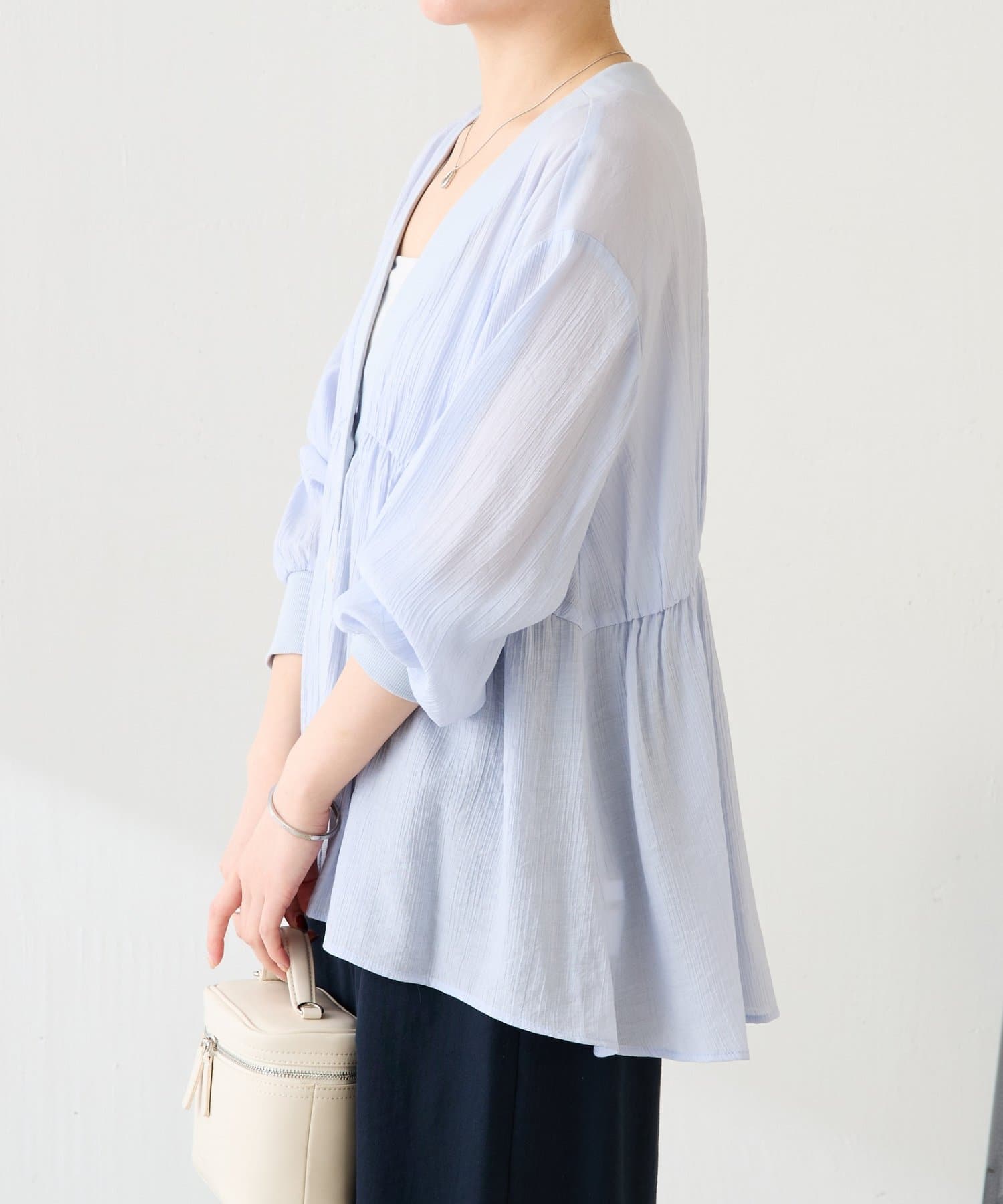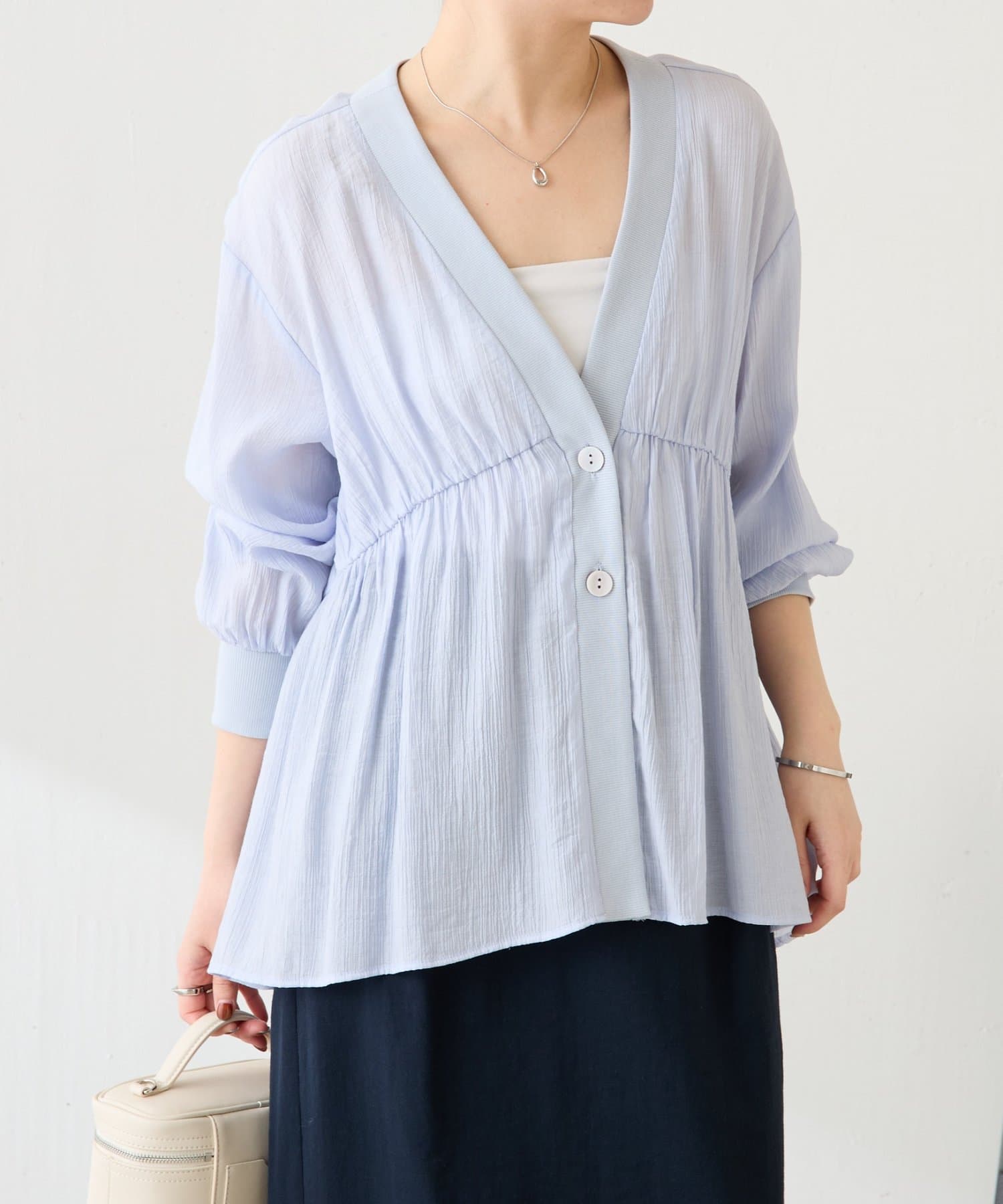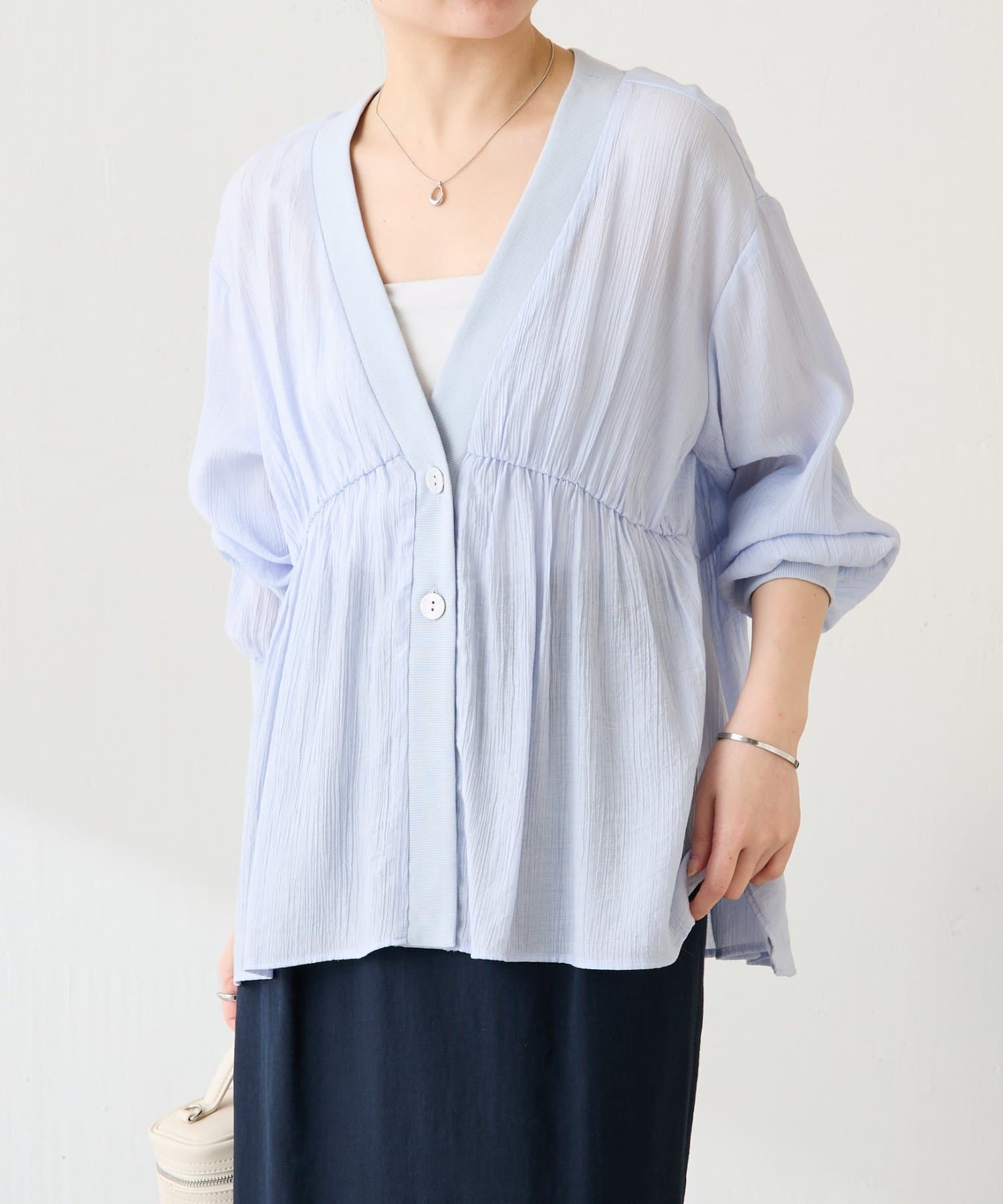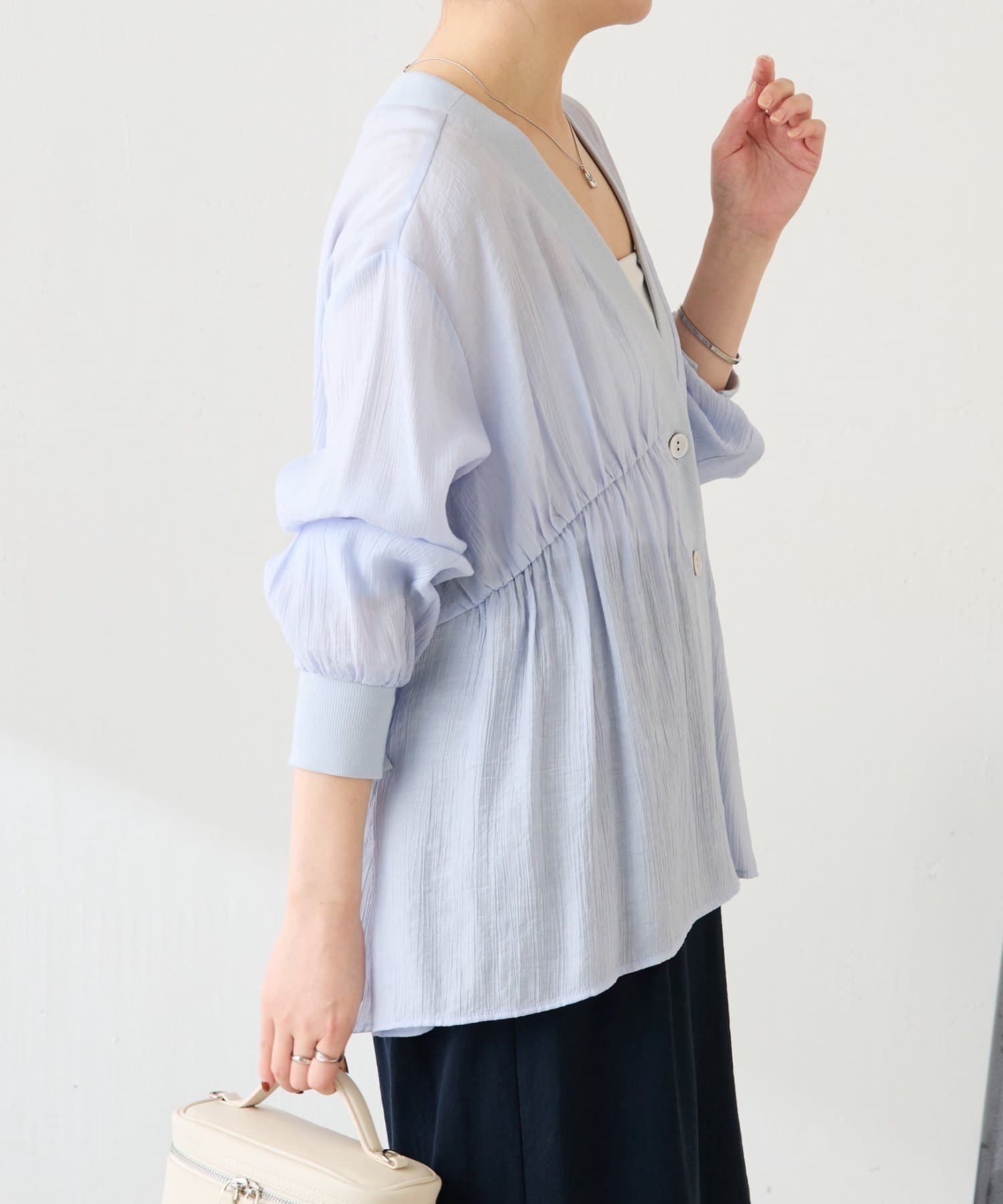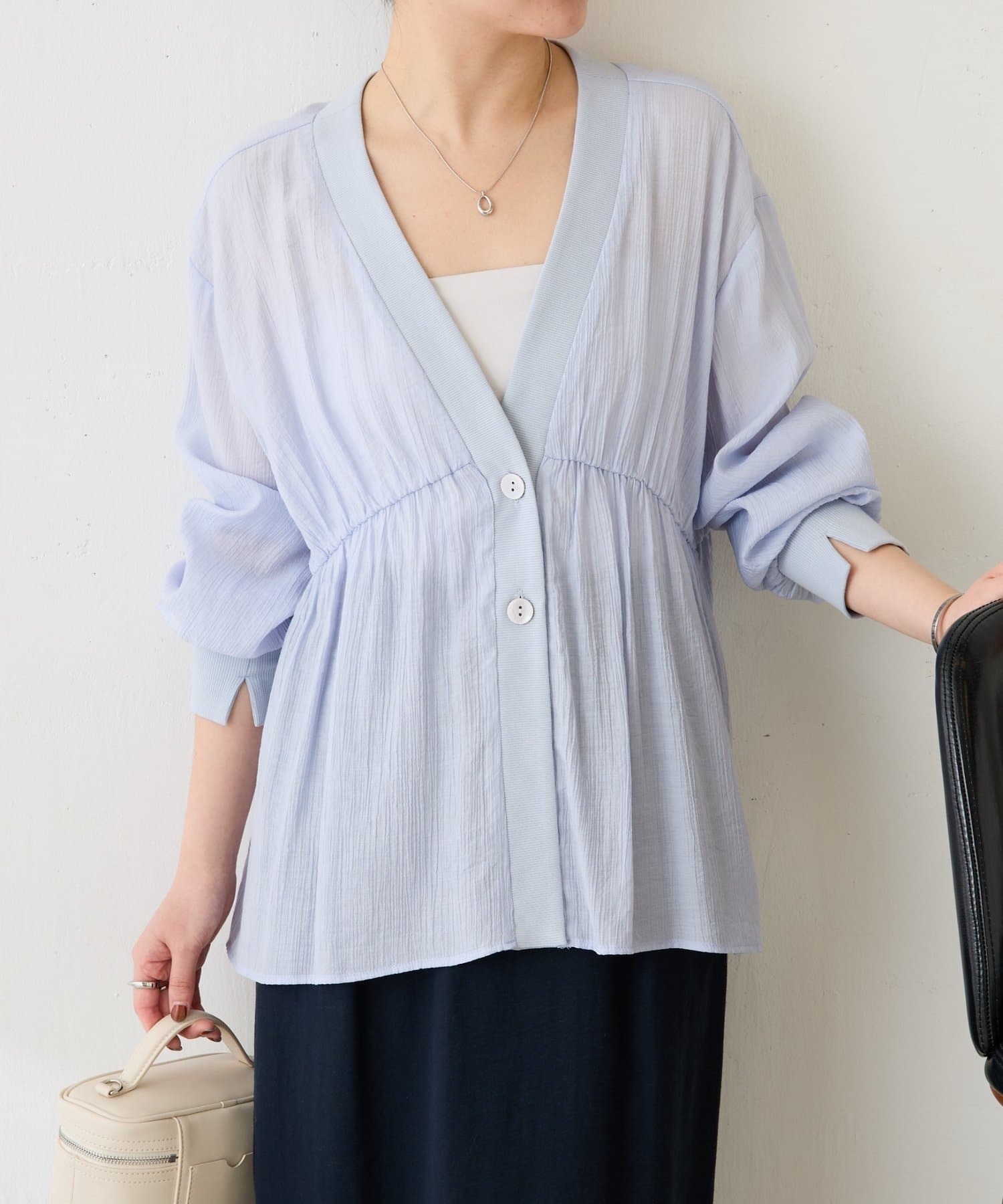 【軽量/体型カバー】ギャザー切替シアーシャツカーディガン