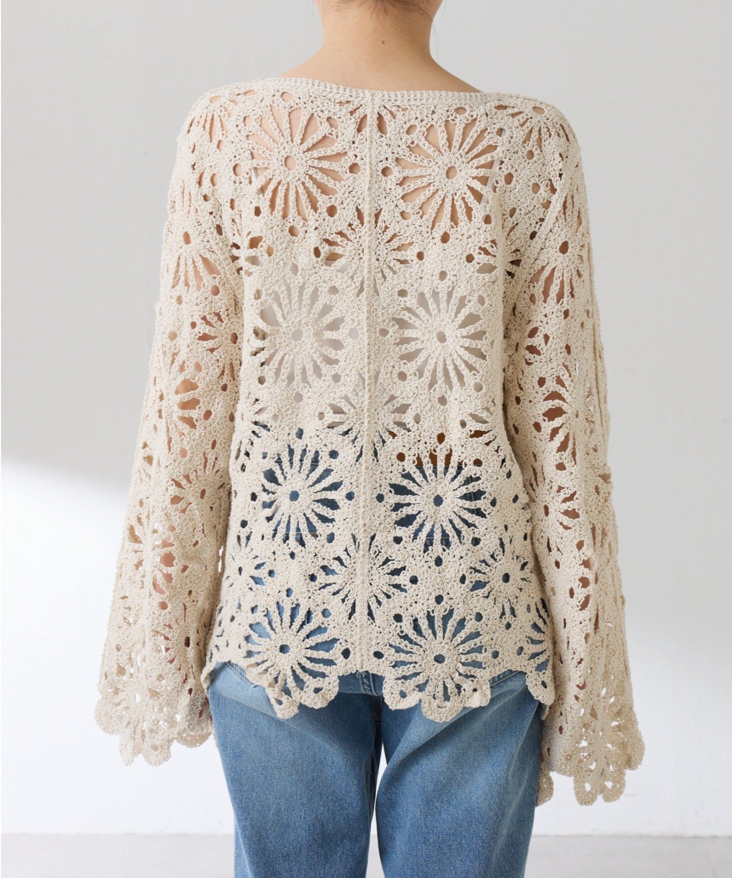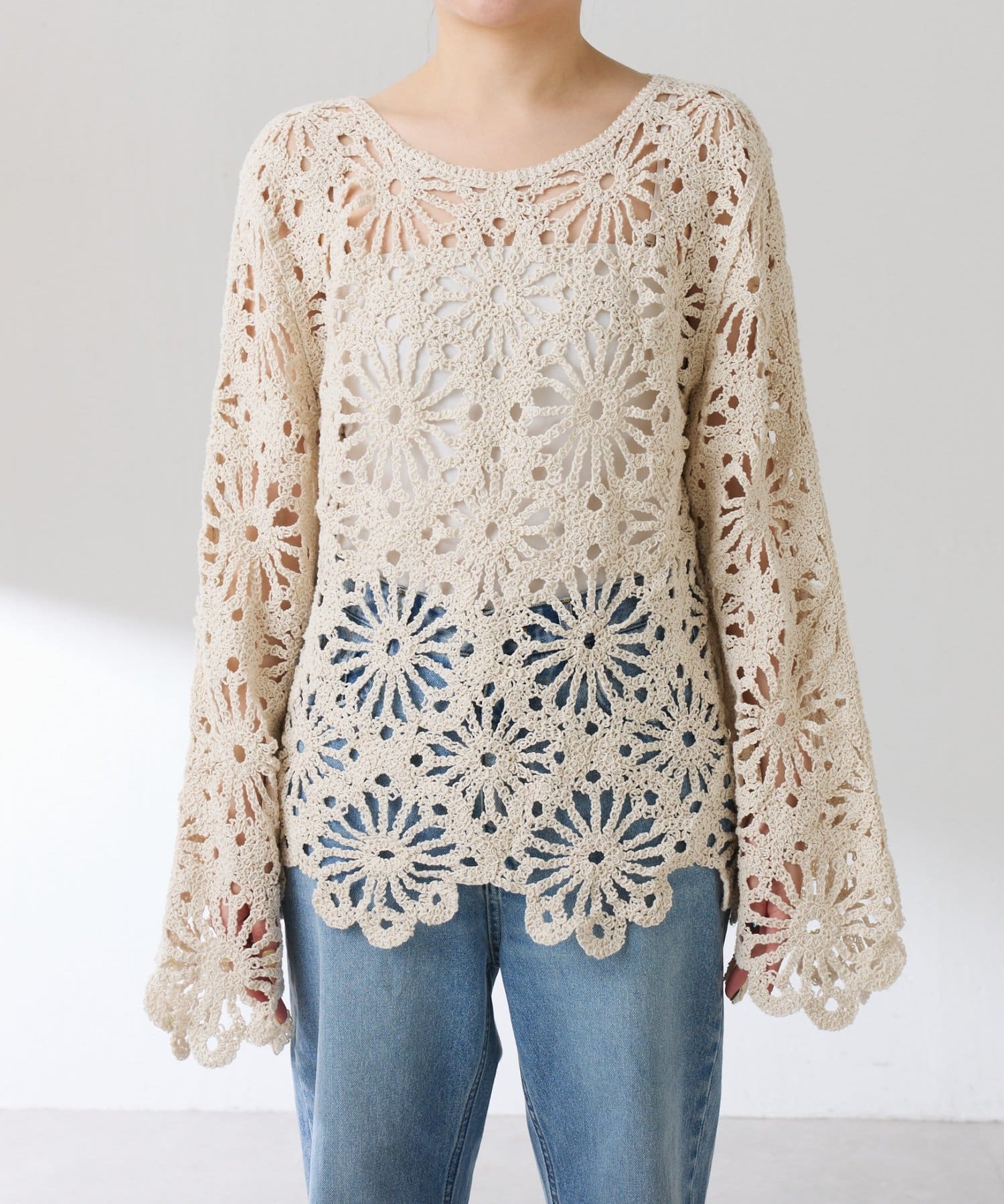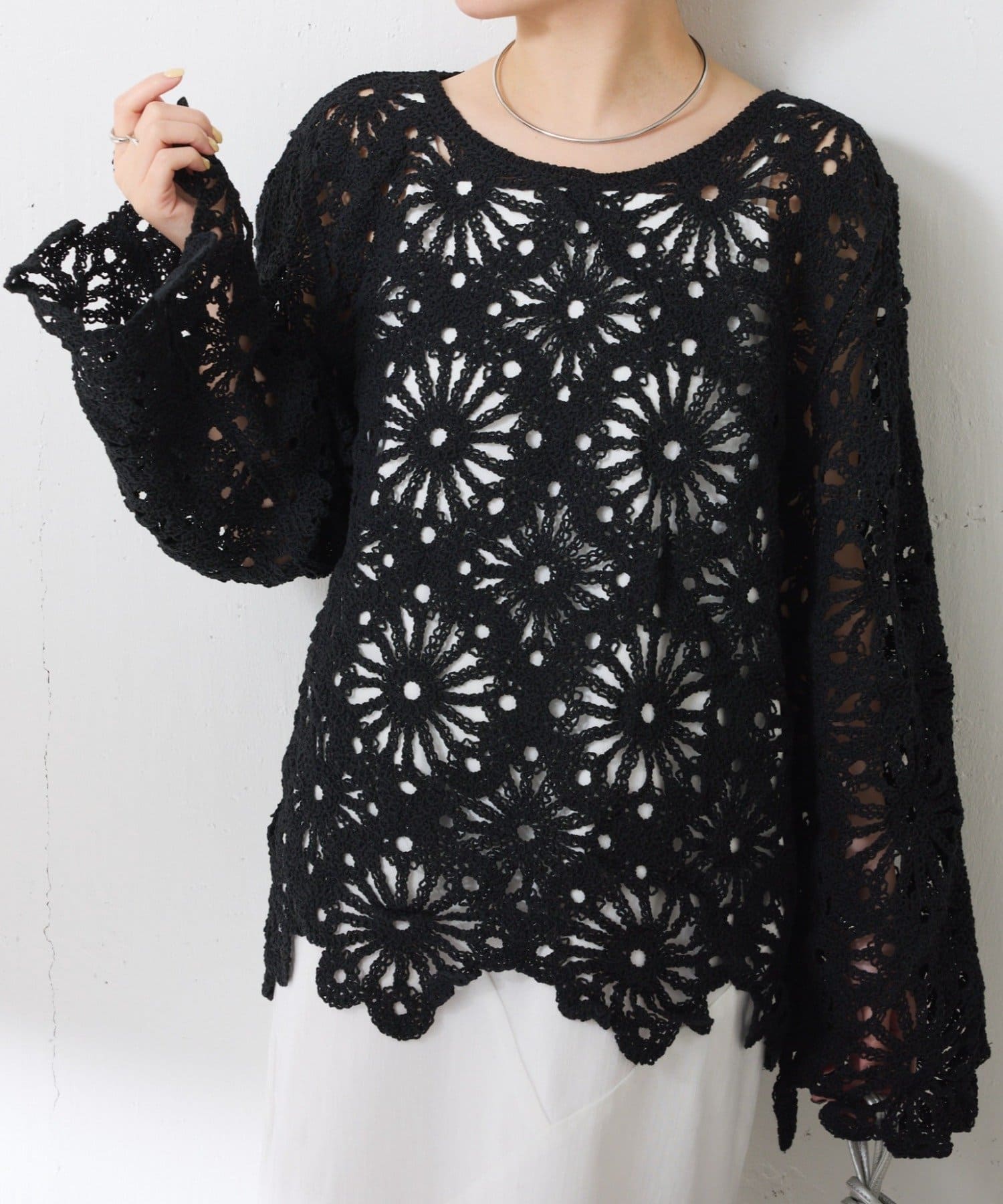 ・太陽のようなフラワー柄のような大柄を並べた着映えするクロシェニット。