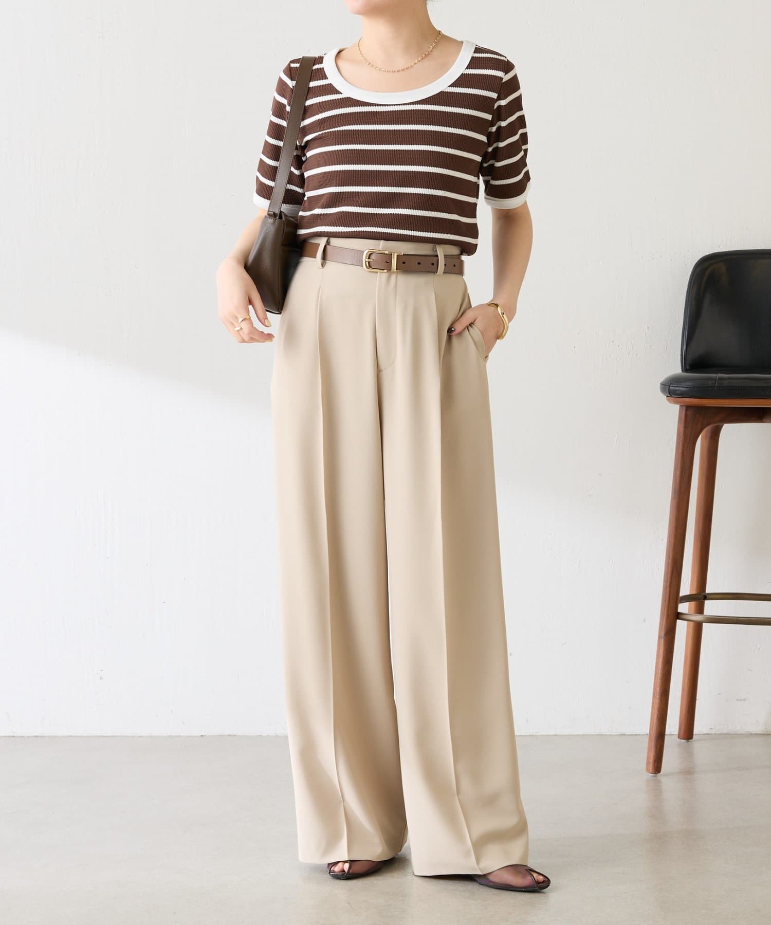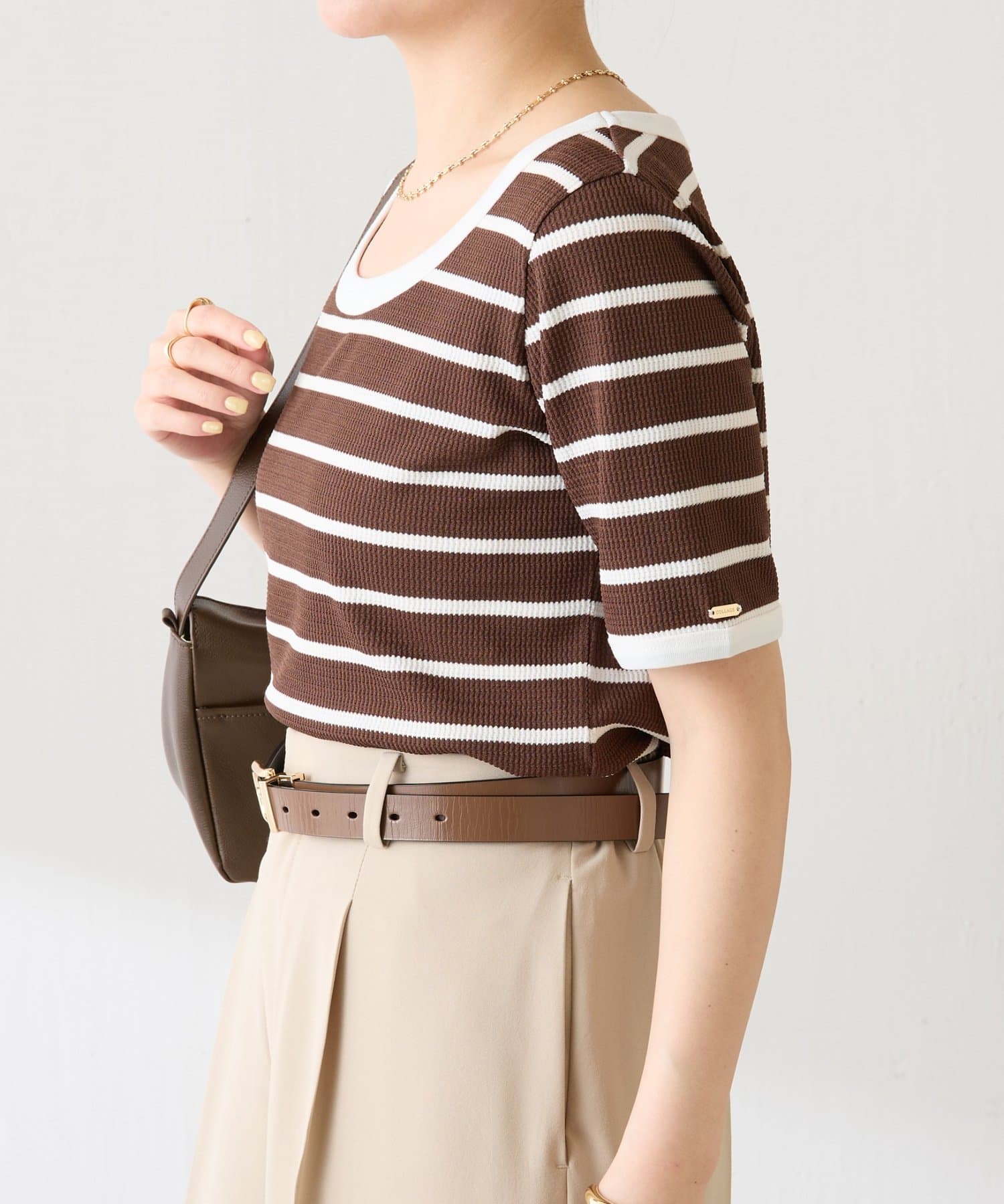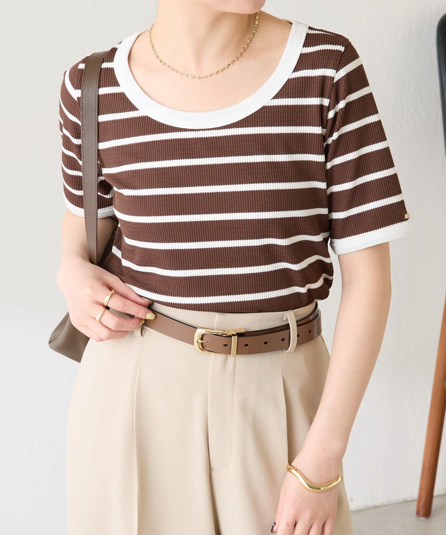 首元は広めの開きがあるので大きめのネックレスでポイントをつけるとバランスが良いです。