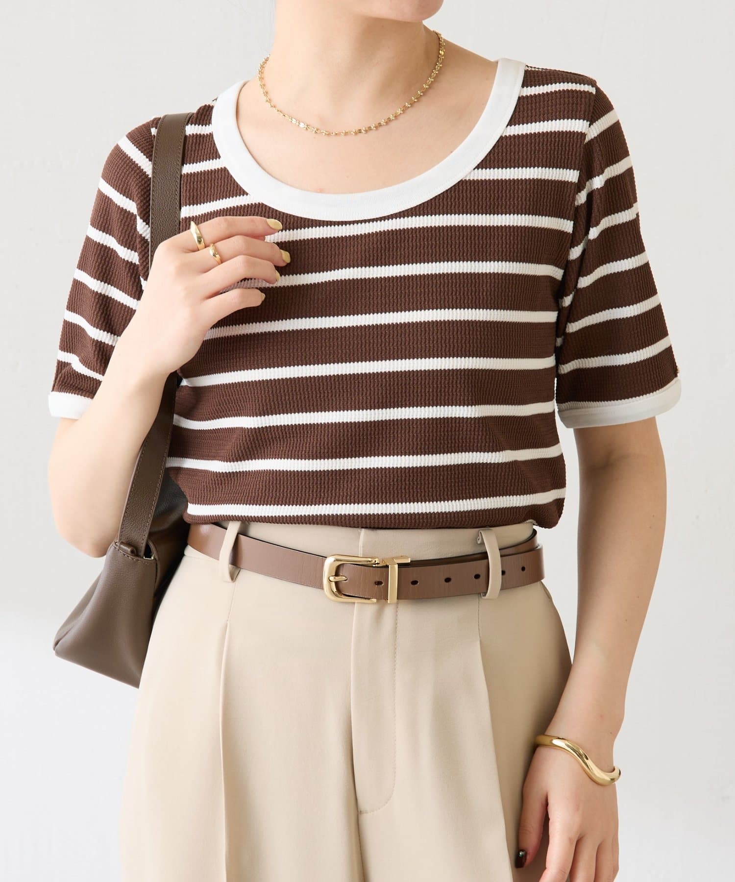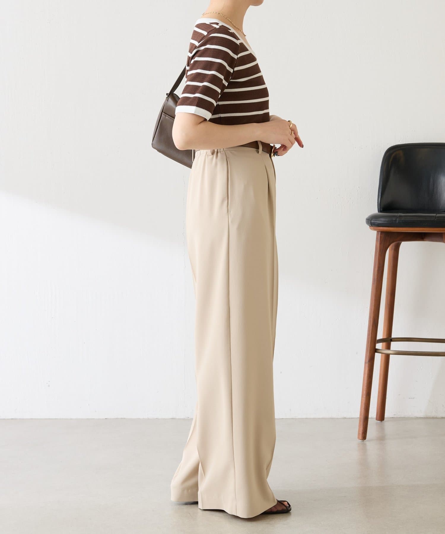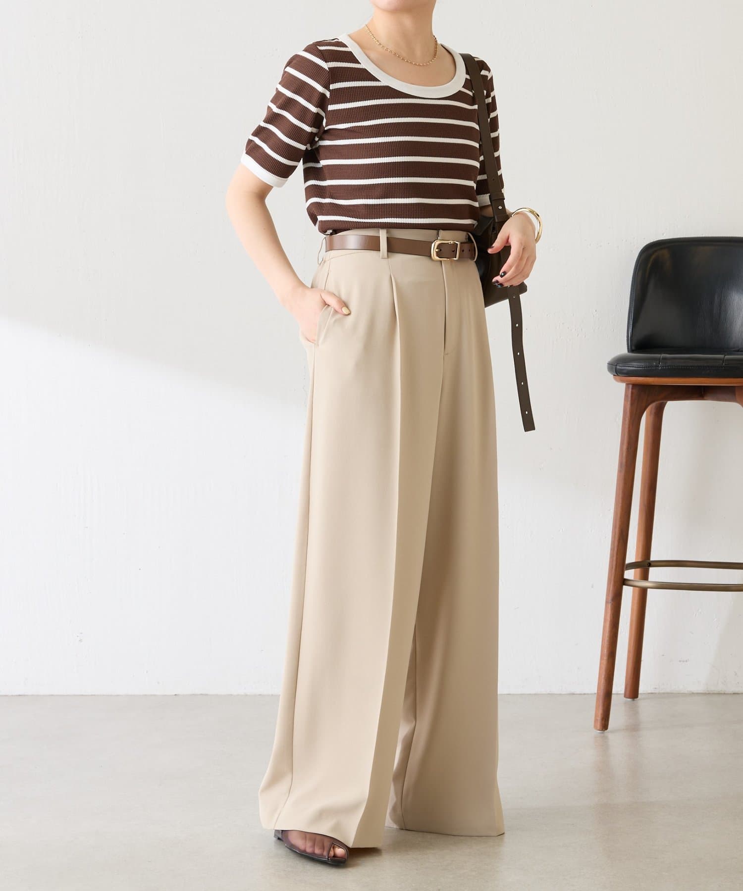 首元は広めの開きがあるので大きめのネックレスでポイントをつけるとバランスが良いです。