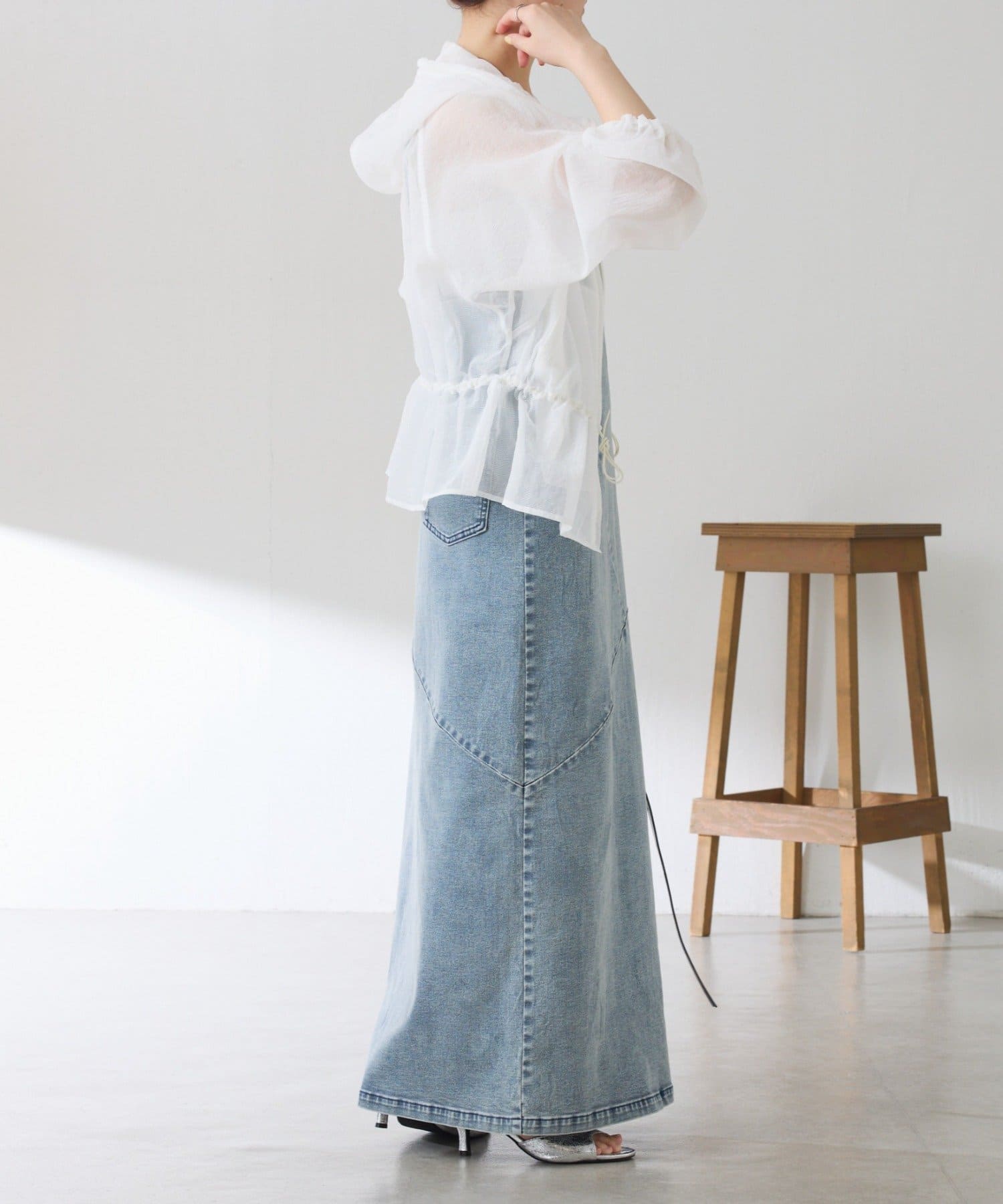 ・ウエストマーク位置をやや低めにしトレンド感のあるデザインにしました。ドロストをぎゅっと絞ってペプラムデザインを楽します◎