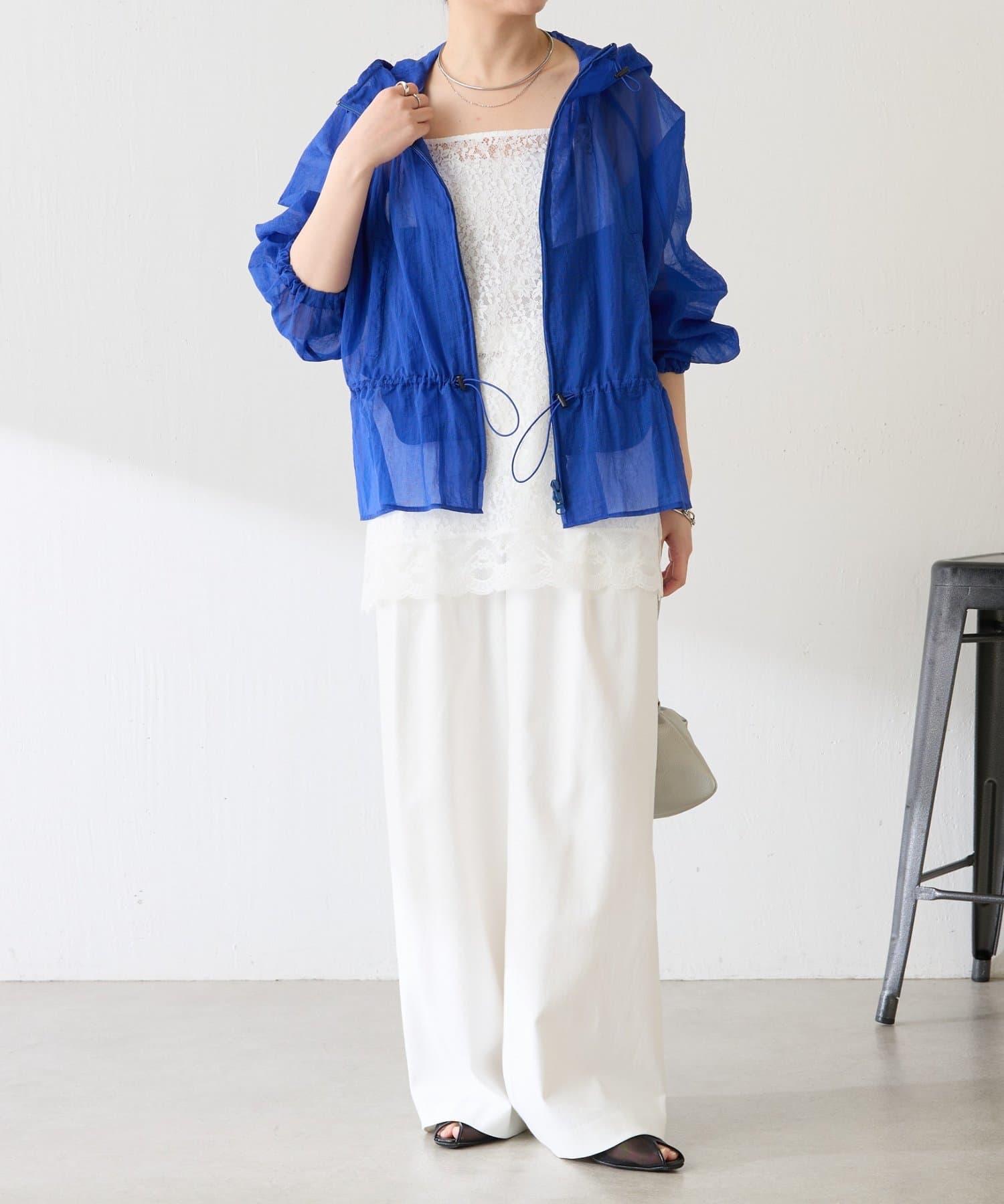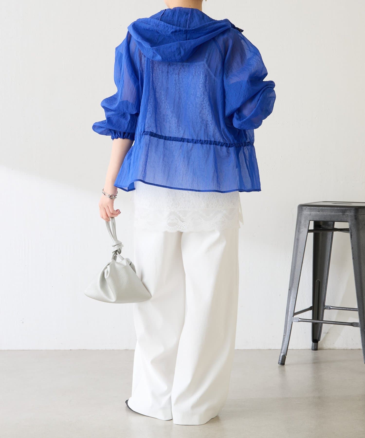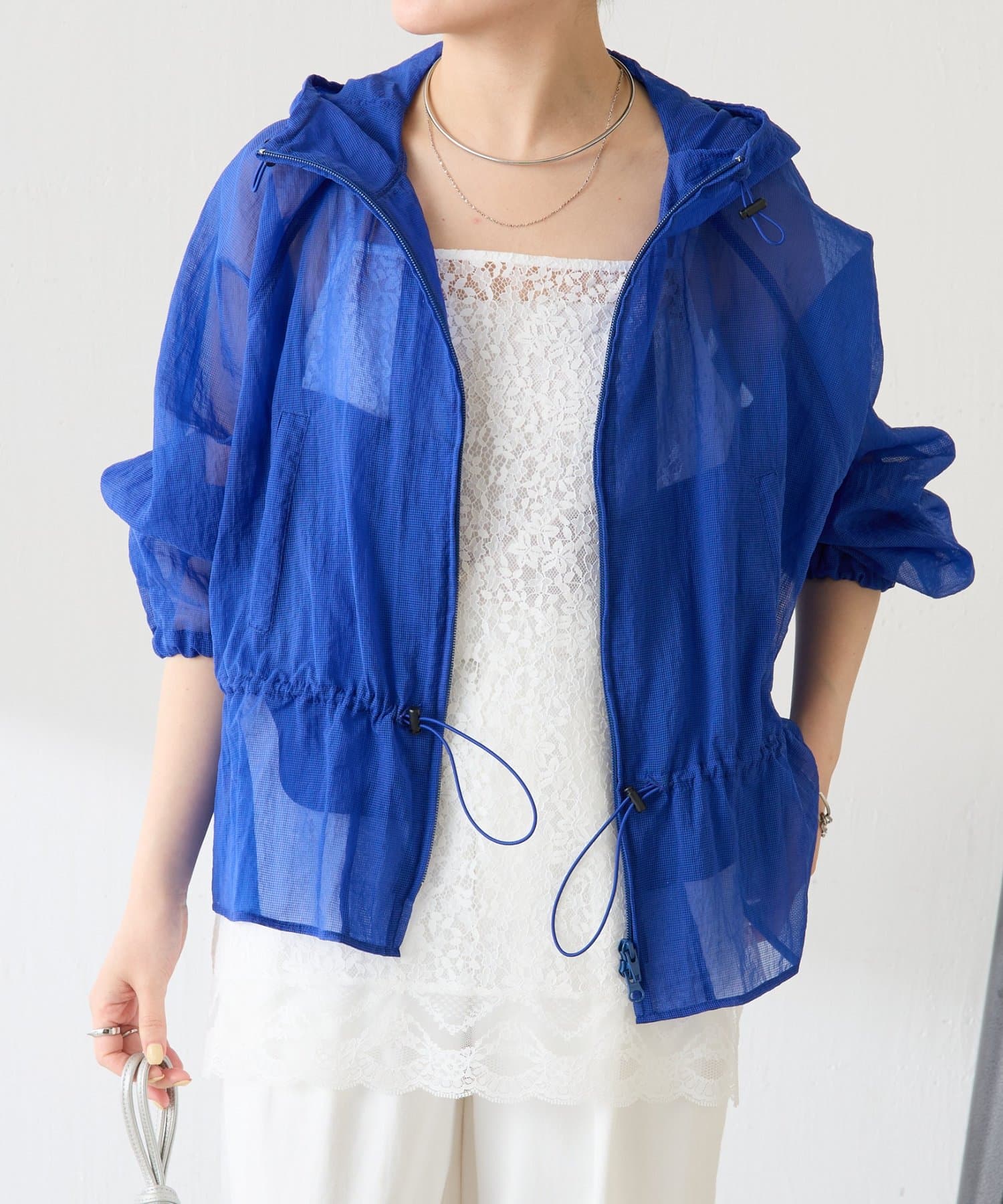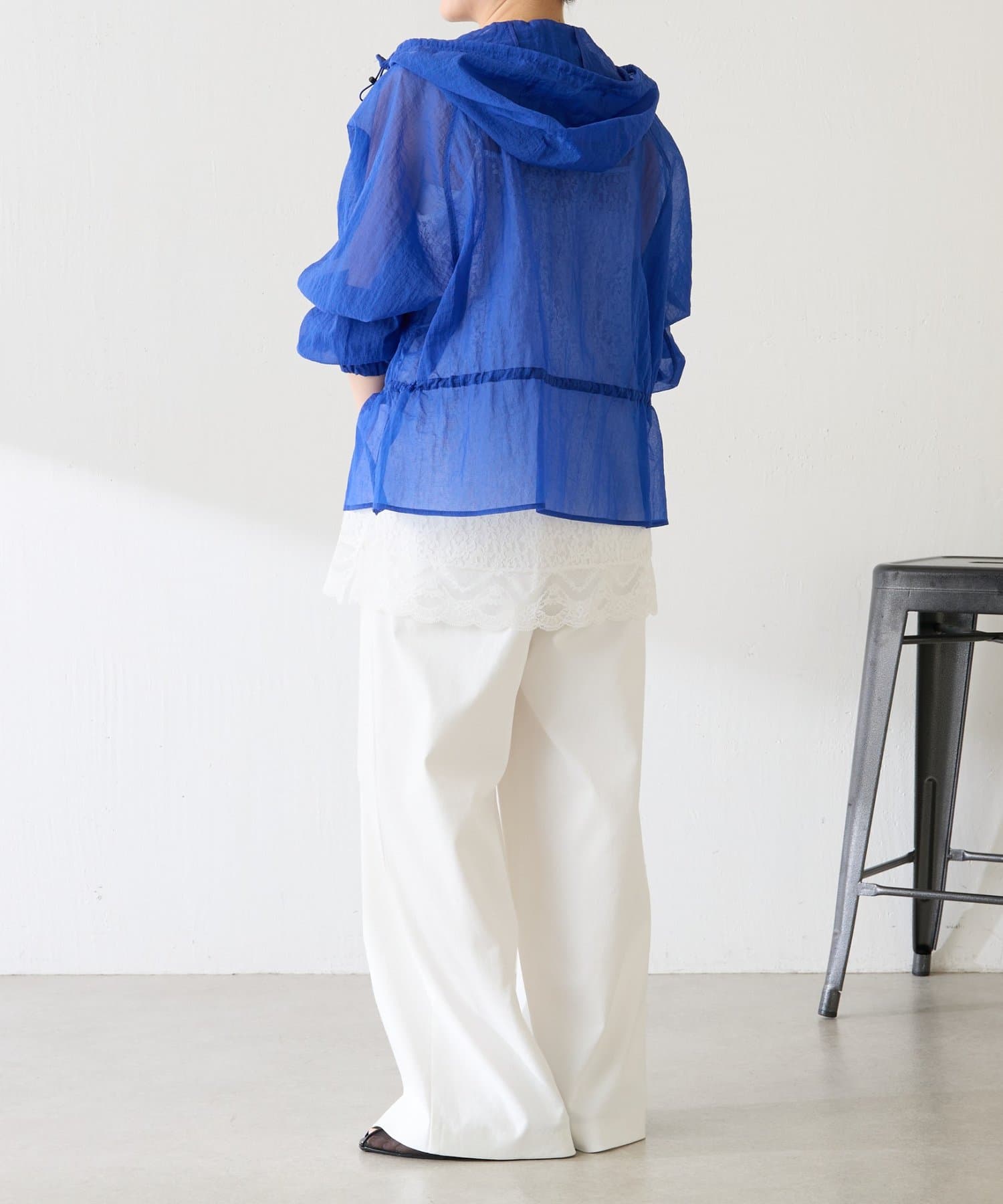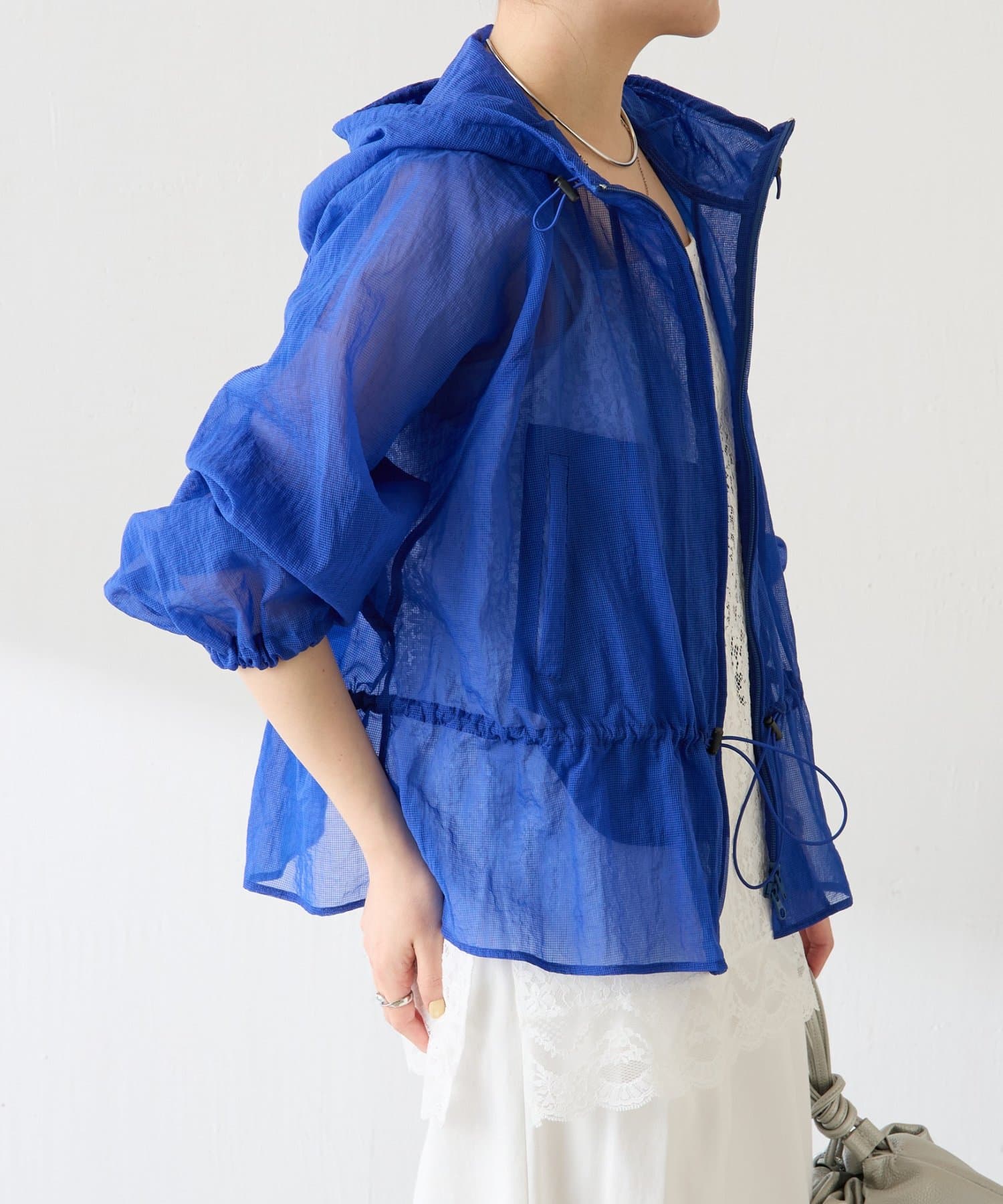ブルー:鮮やかなカラーですが、シアー素材なので取り入れやすいです。シンプルなワンピースやデニムに合わせるだけで大人スポーティコーデが完成。