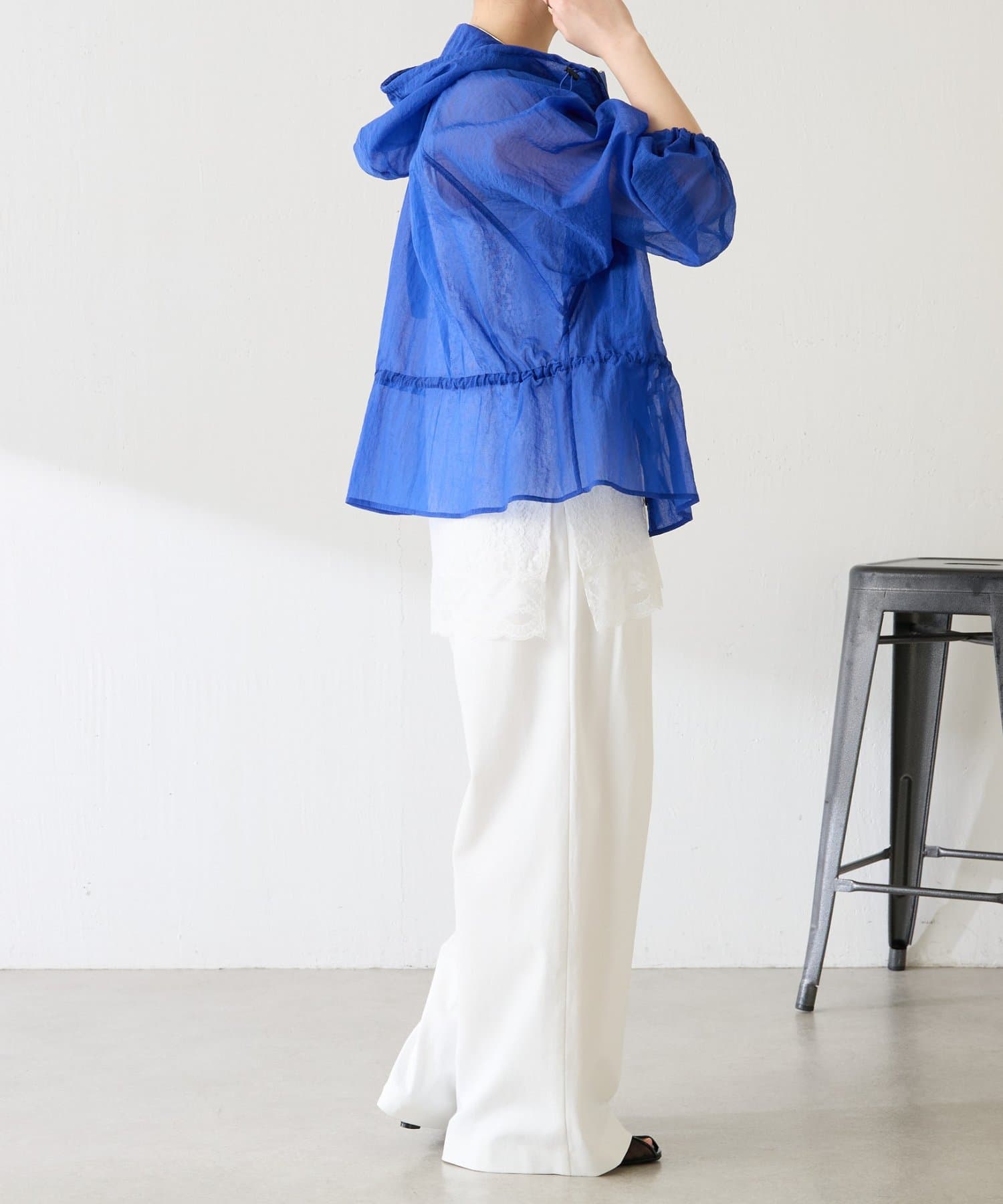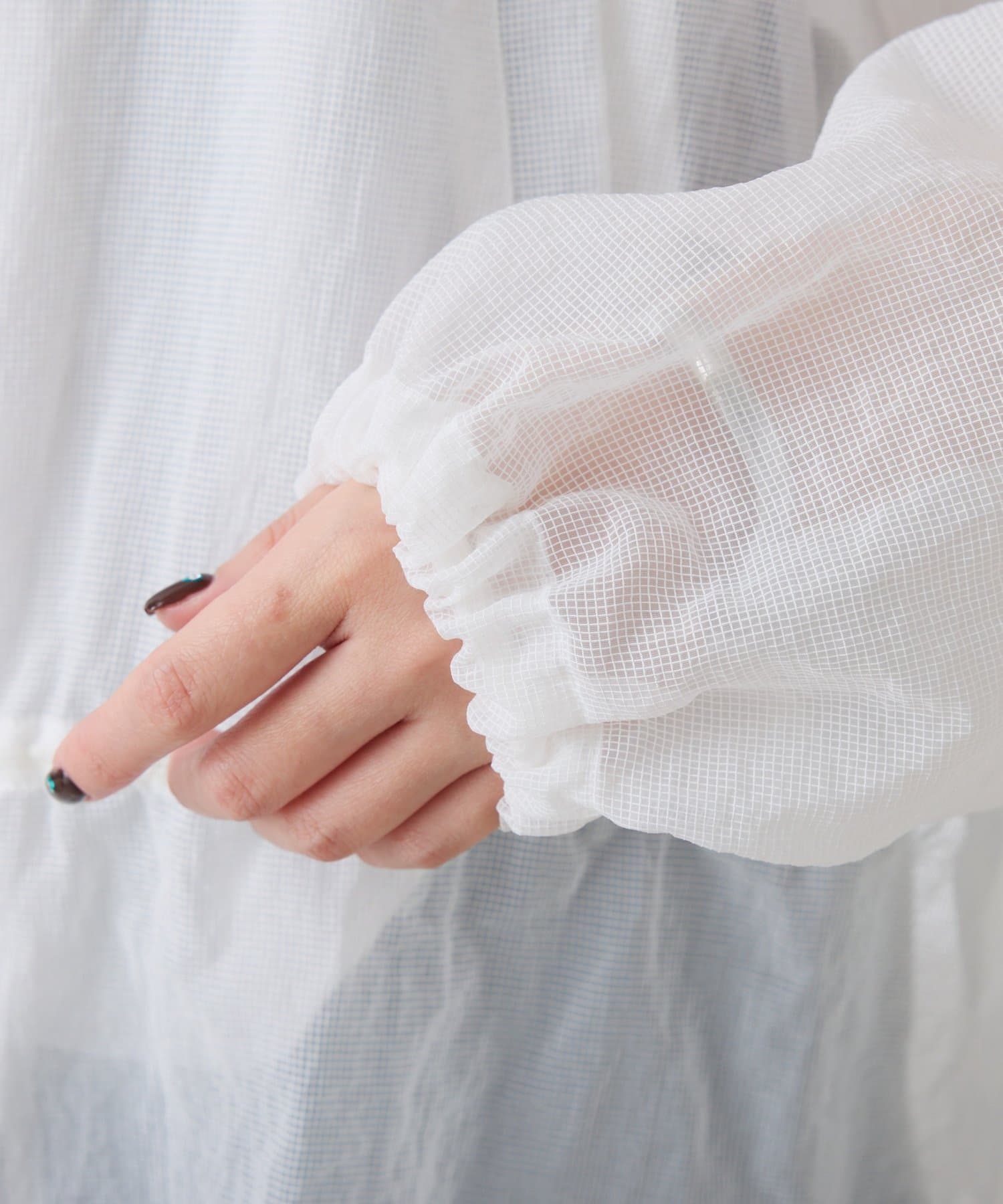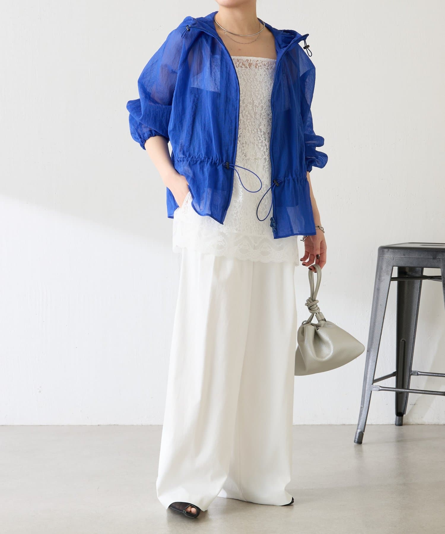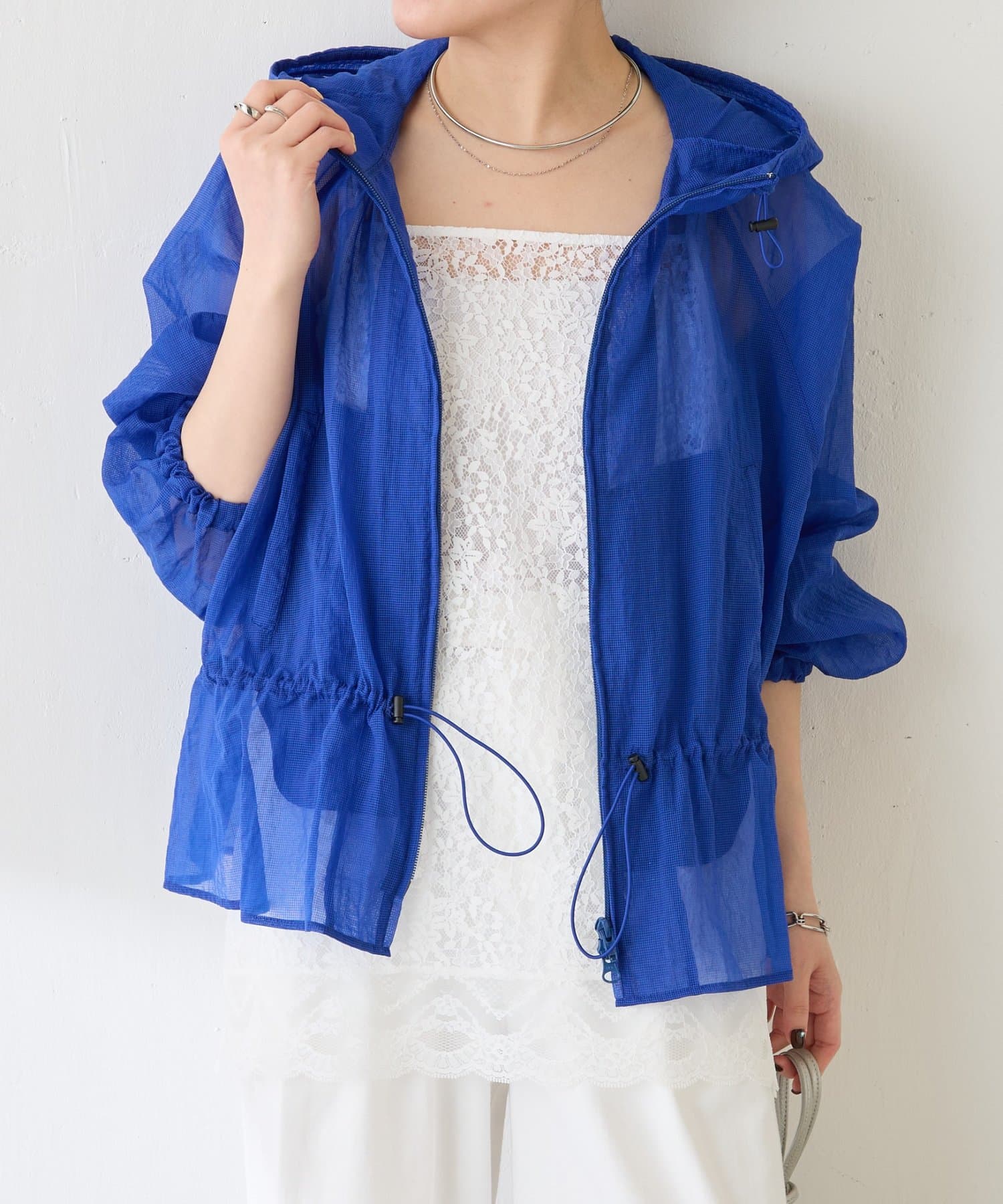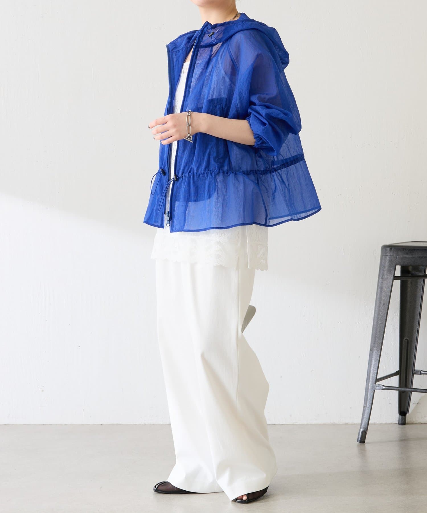 ブルー:鮮やかなカラーですが、シアー素材なので取り入れやすいです。シンプルなワンピースやデニムに合わせるだけで大人スポーティコーデが完成。