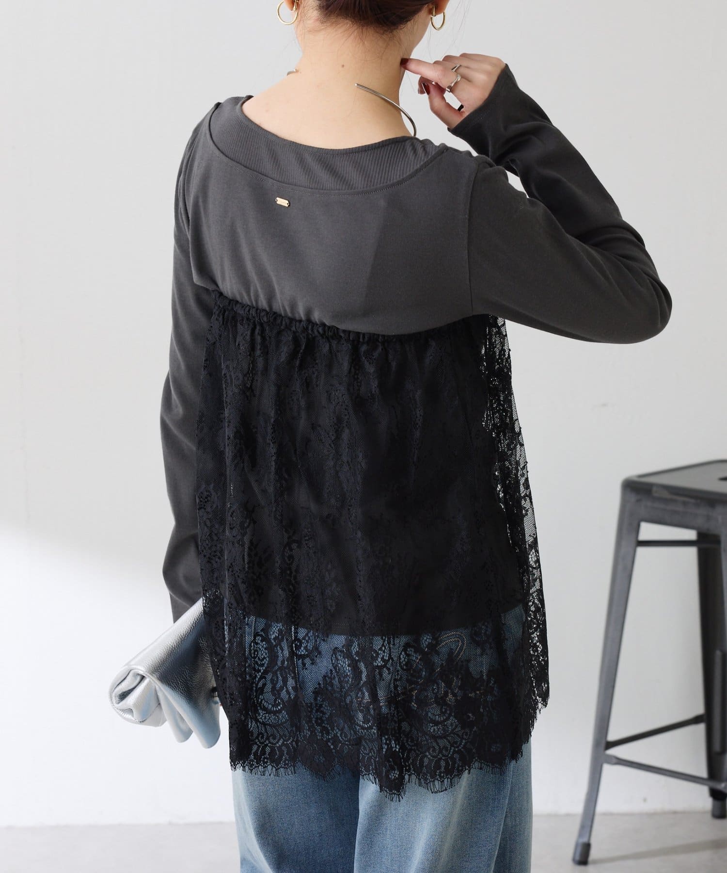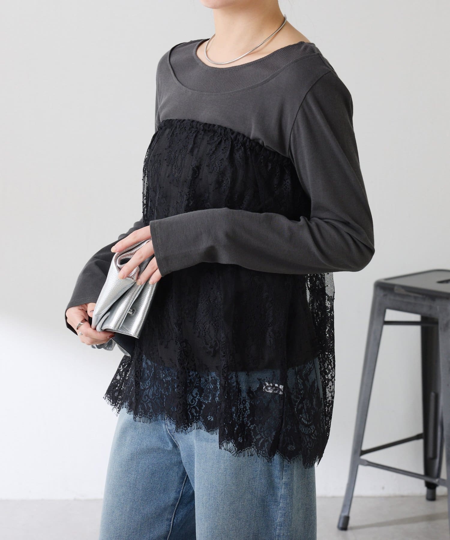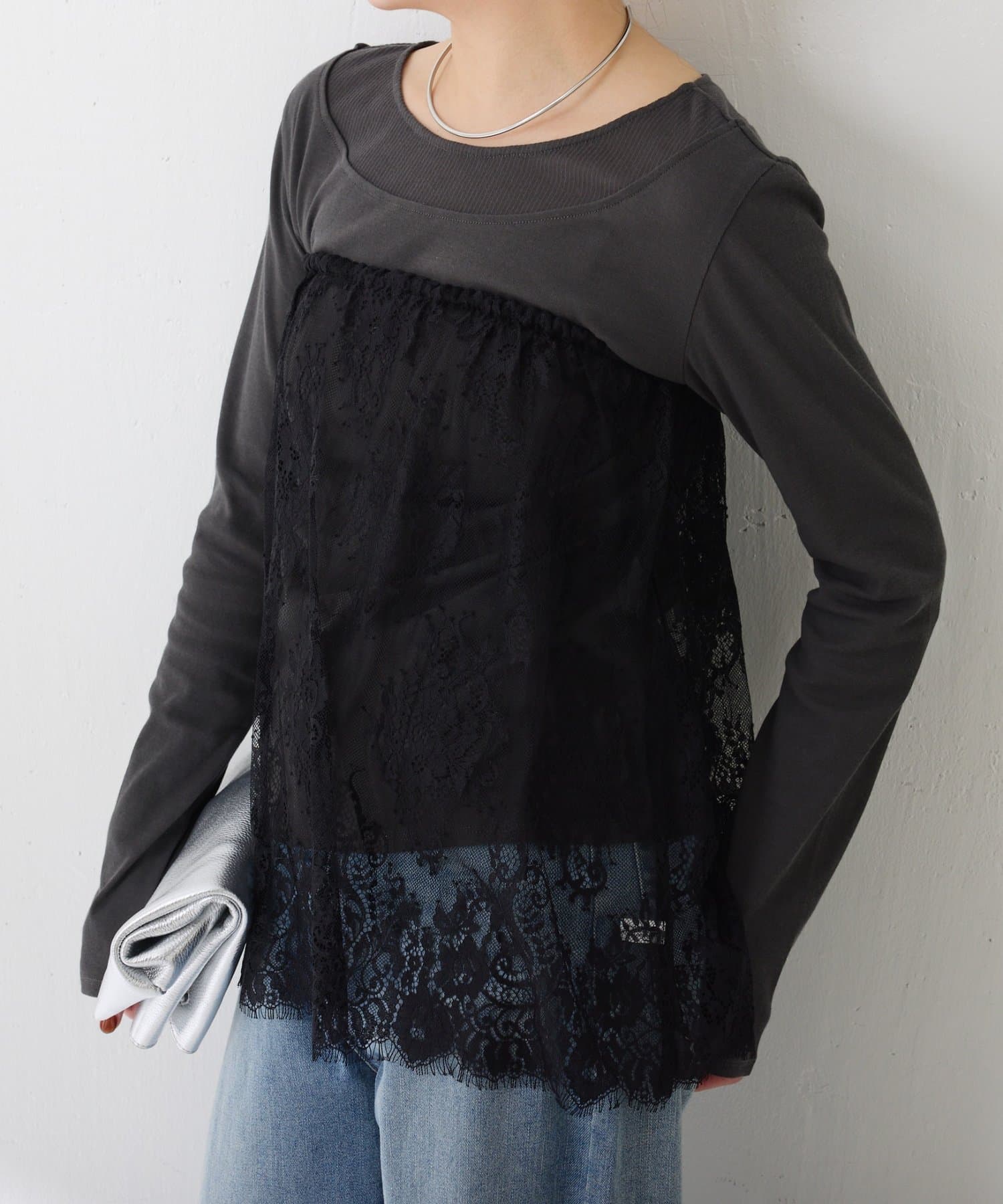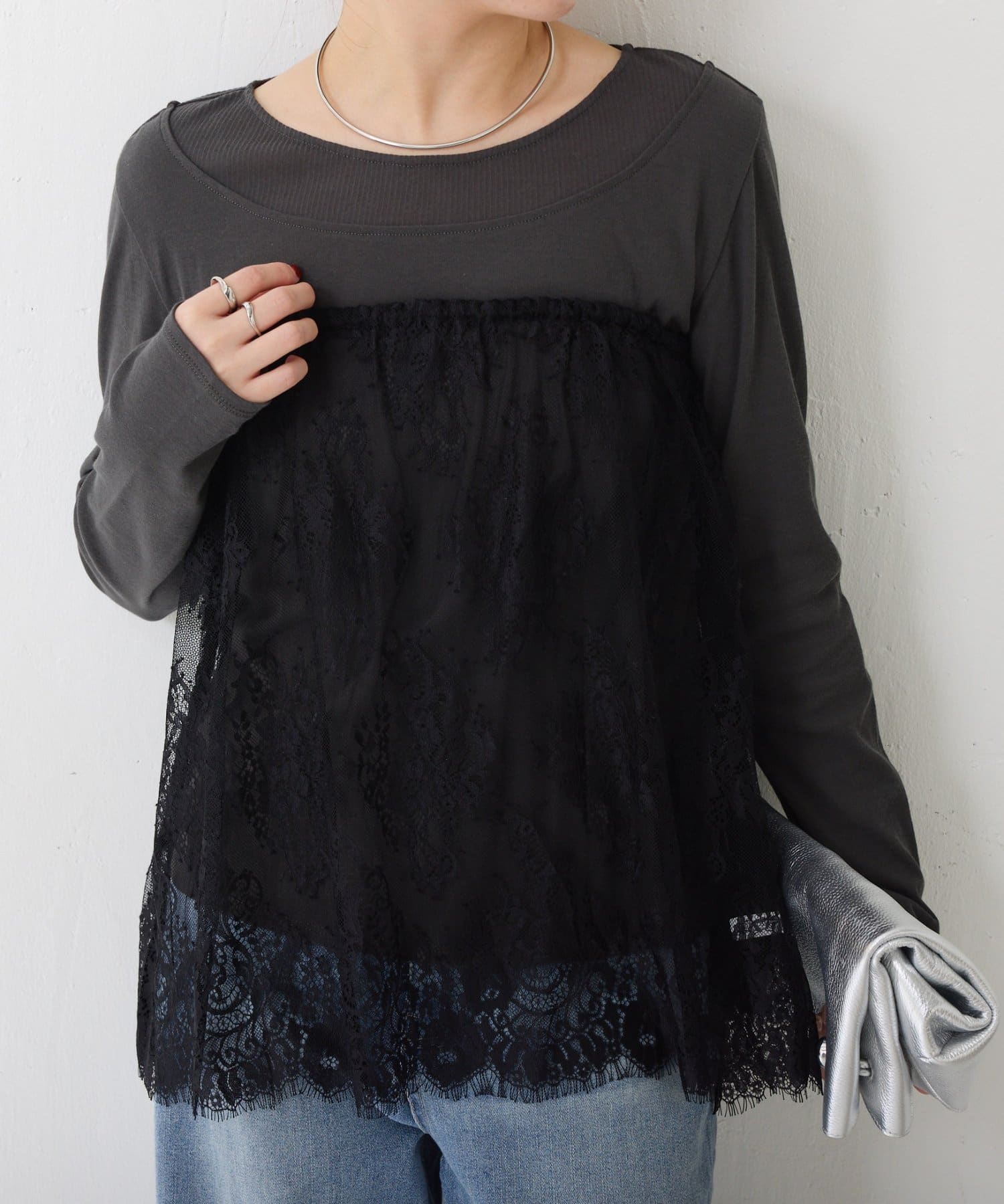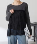 ・カジュアルなトップスでも、レイヤードすることで女性らしい雰囲気に仕上がります。