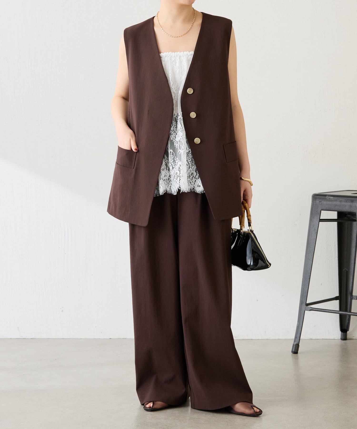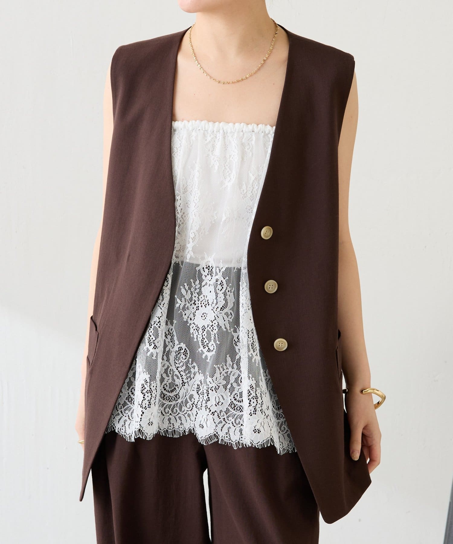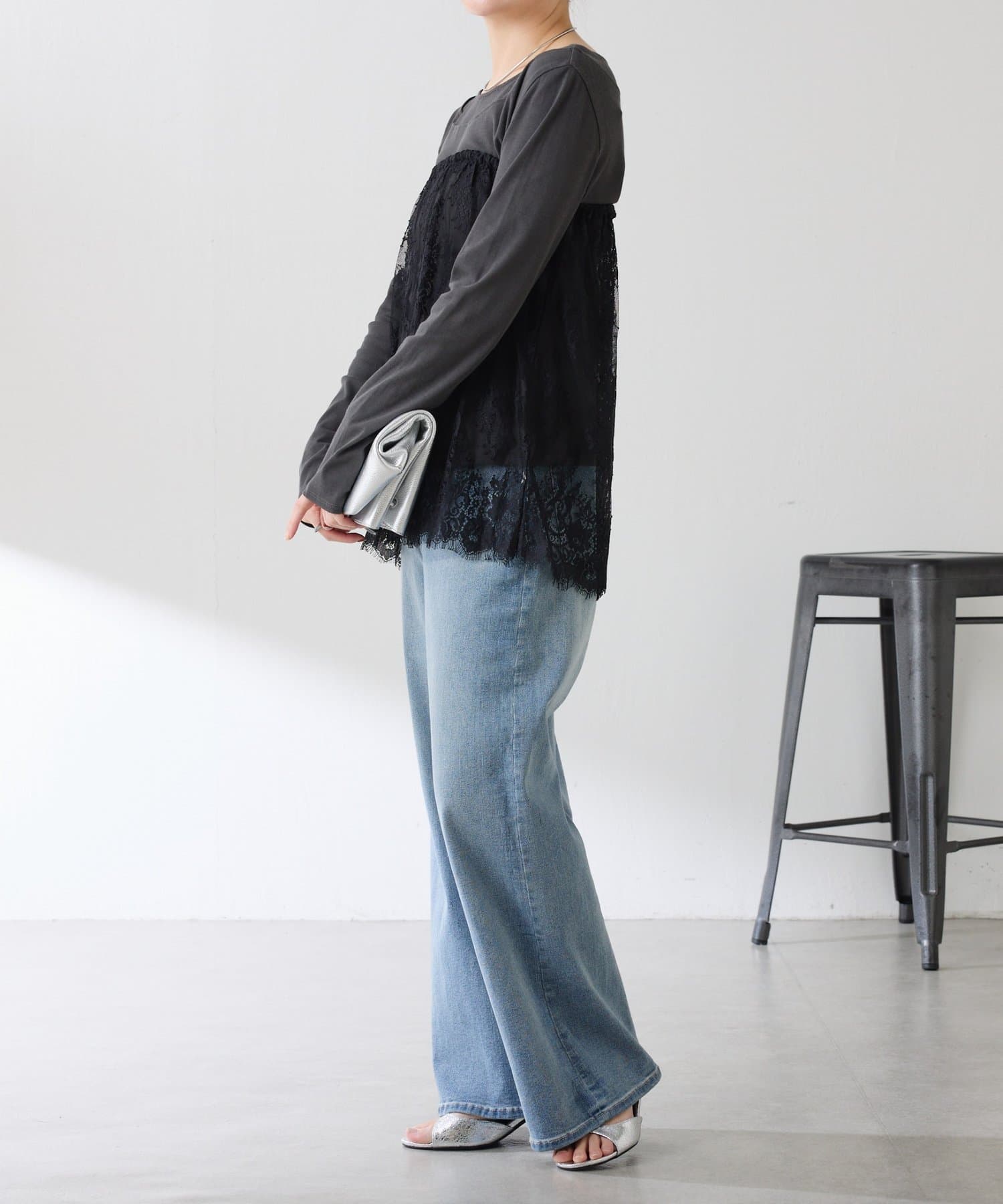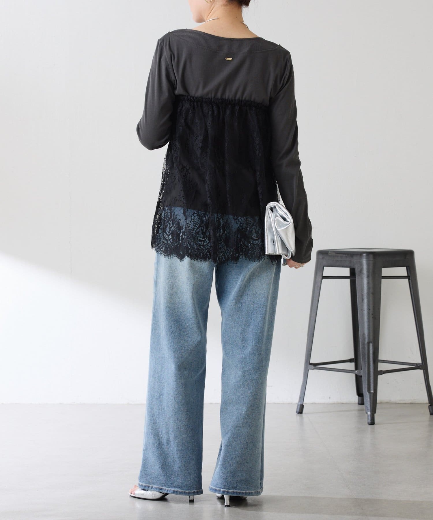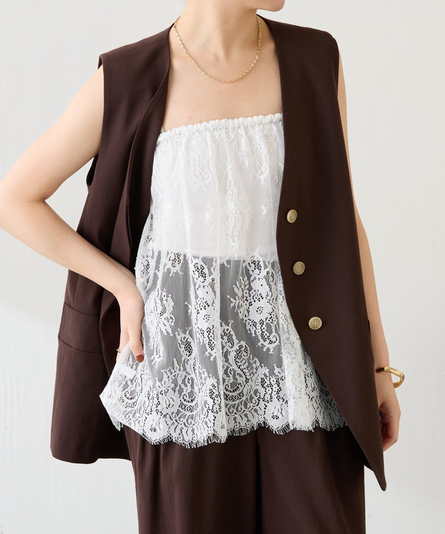 ・カジュアルなトップスでも、レイヤードすることで女性らしい雰囲気に仕上がります。