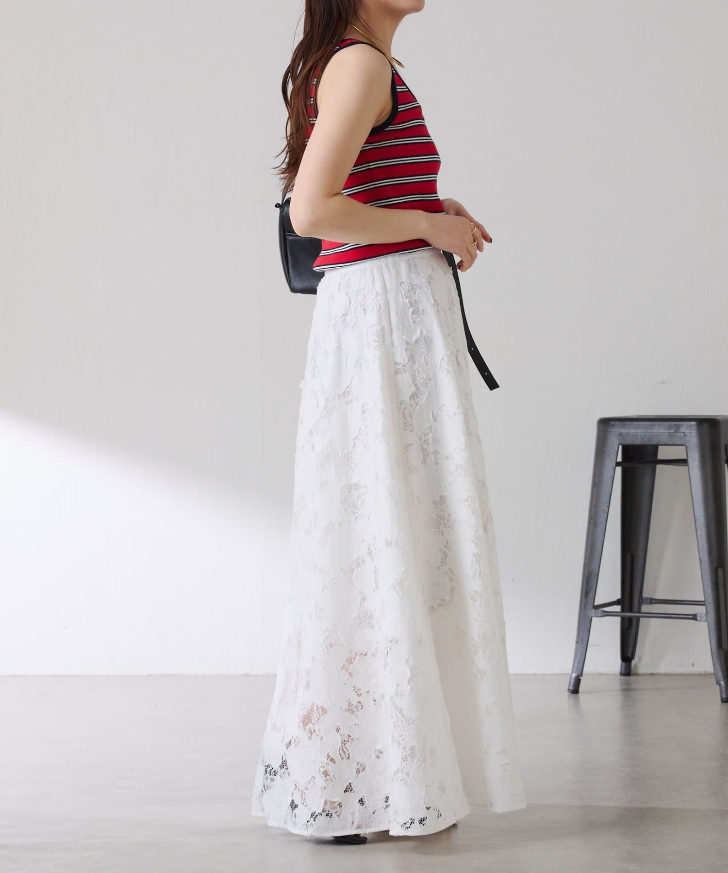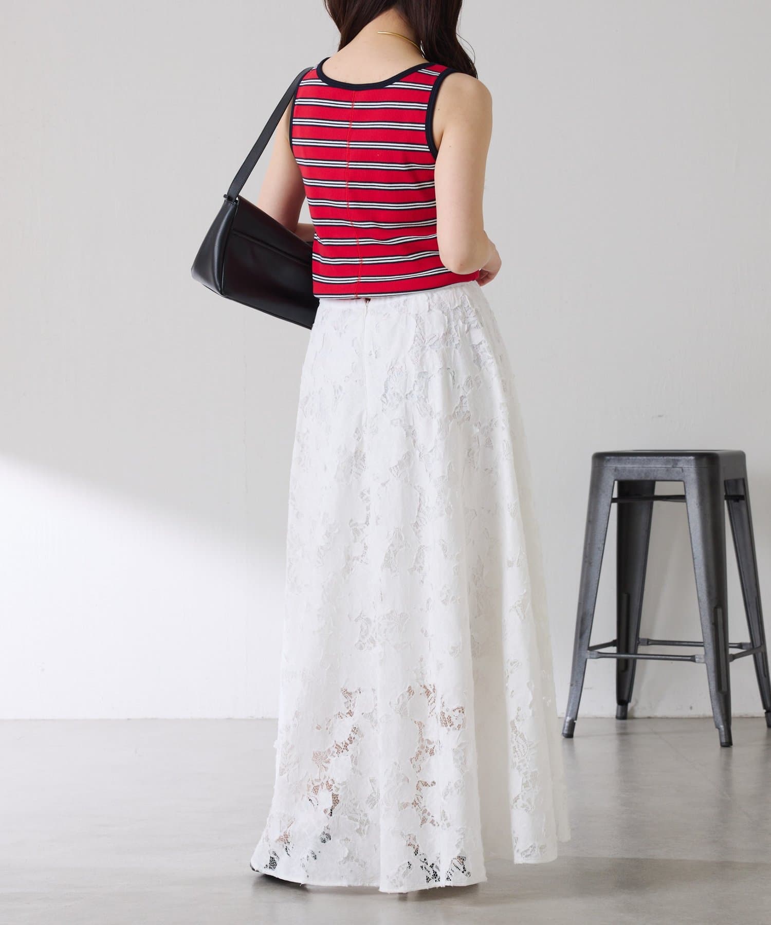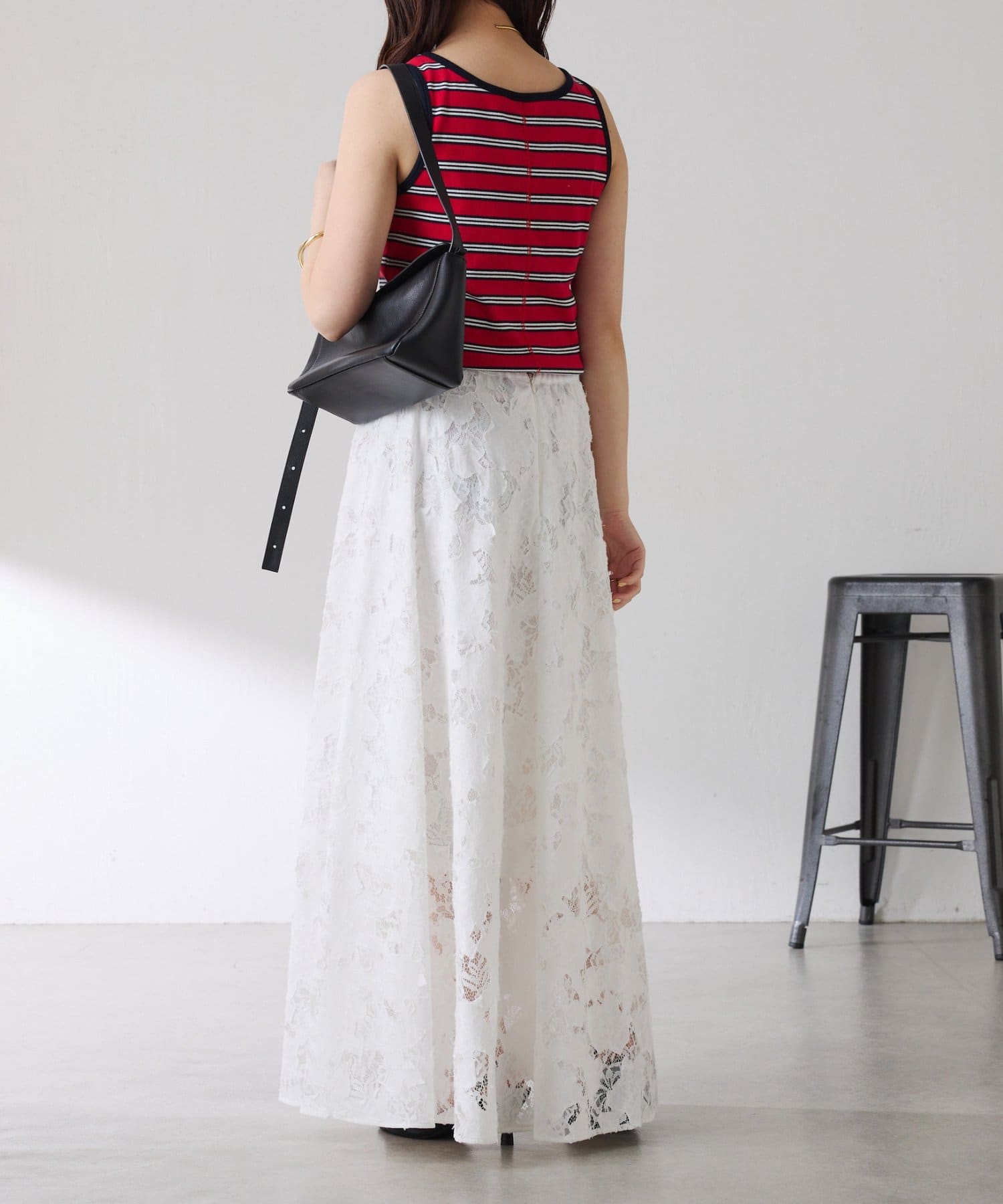 ・レースですが、裁ちきり感やキルトのステッチワークが程よくカジュアルさとエッジな印象で甘めが苦手な方にもおすすめです。