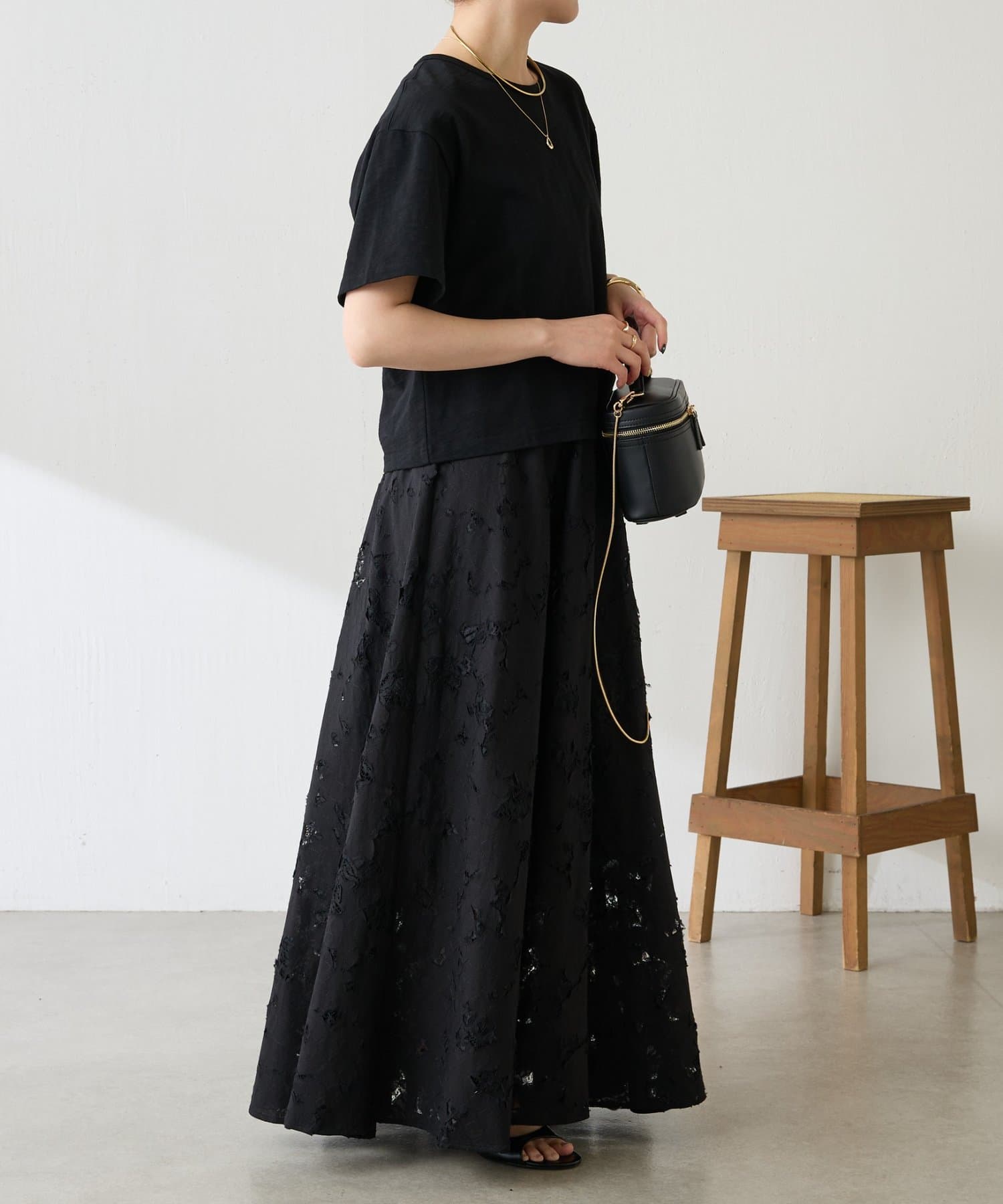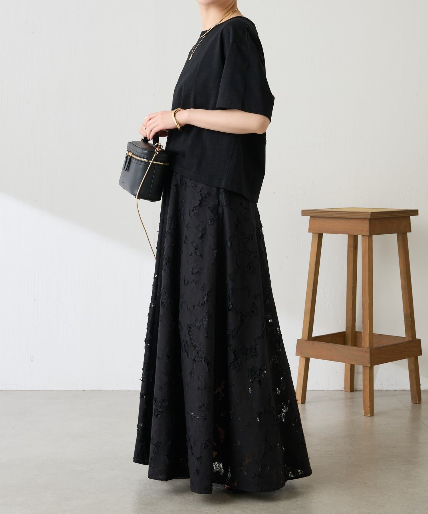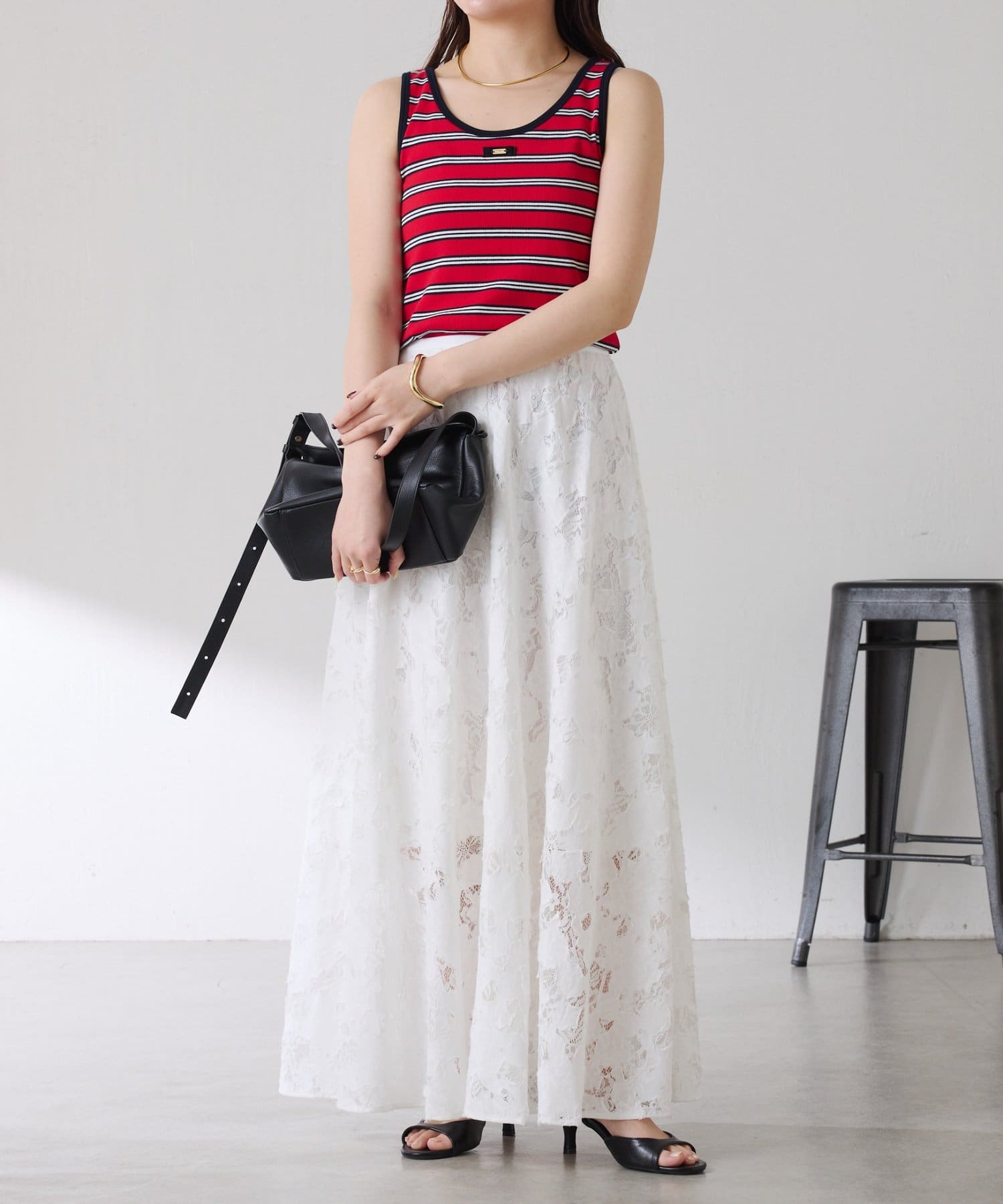 ・レースですが、裁ちきり感やキルトのステッチワークが程よくカジュアルさとエッジな印象で甘めが苦手な方にもおすすめです。