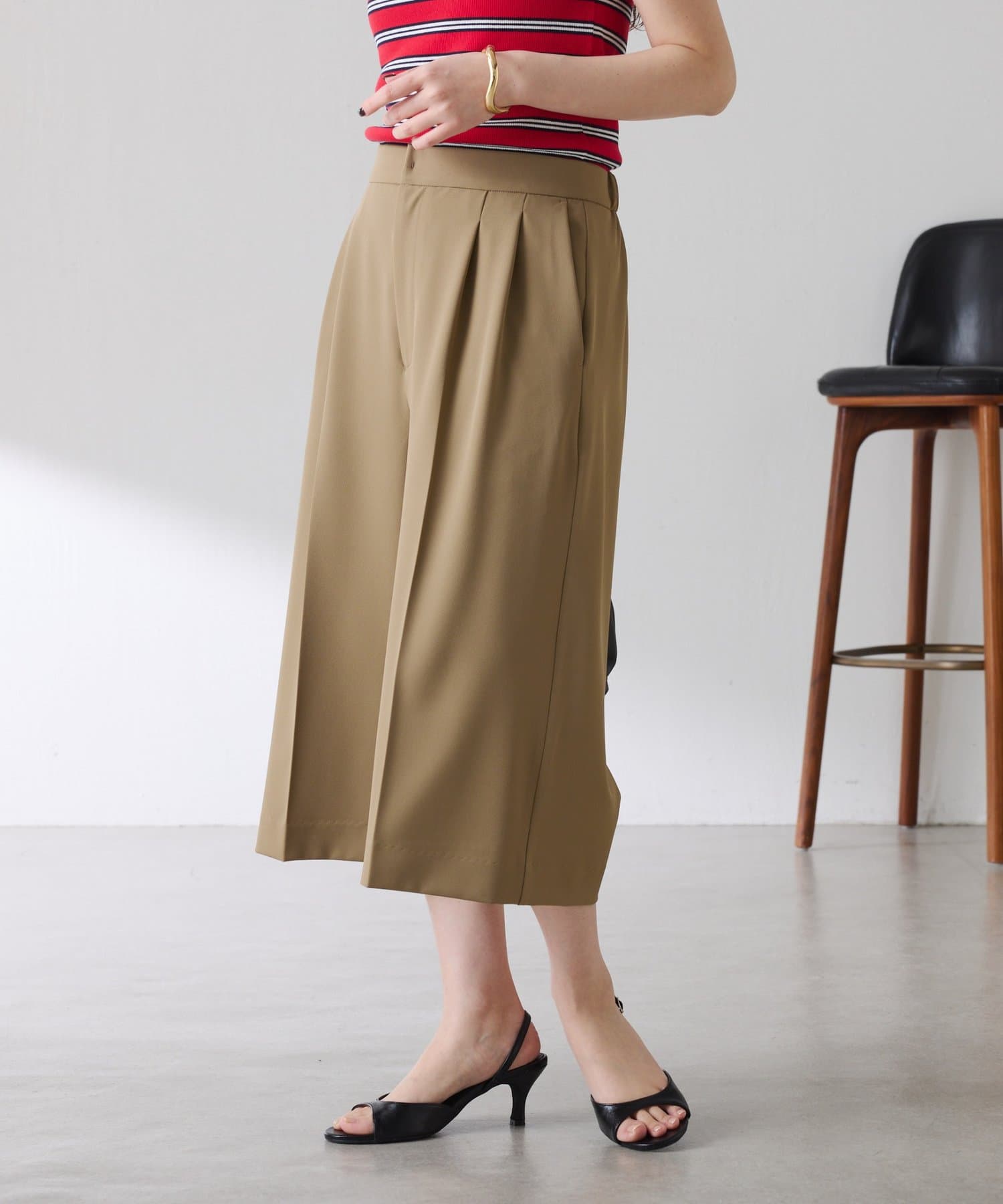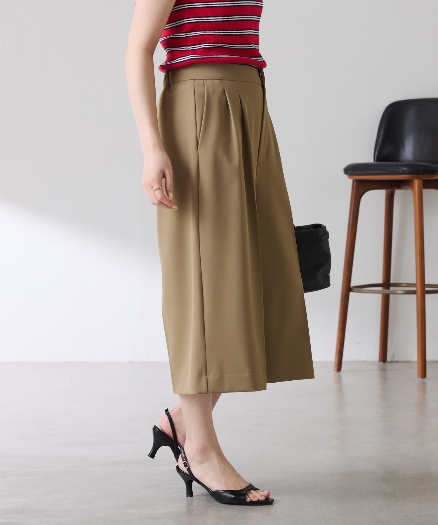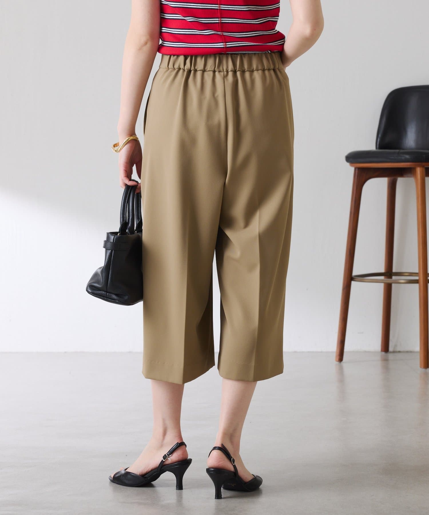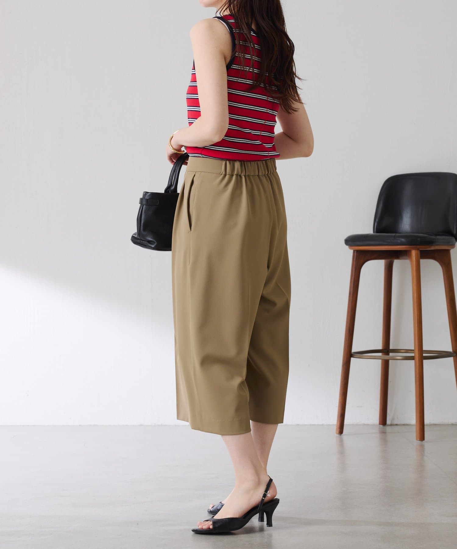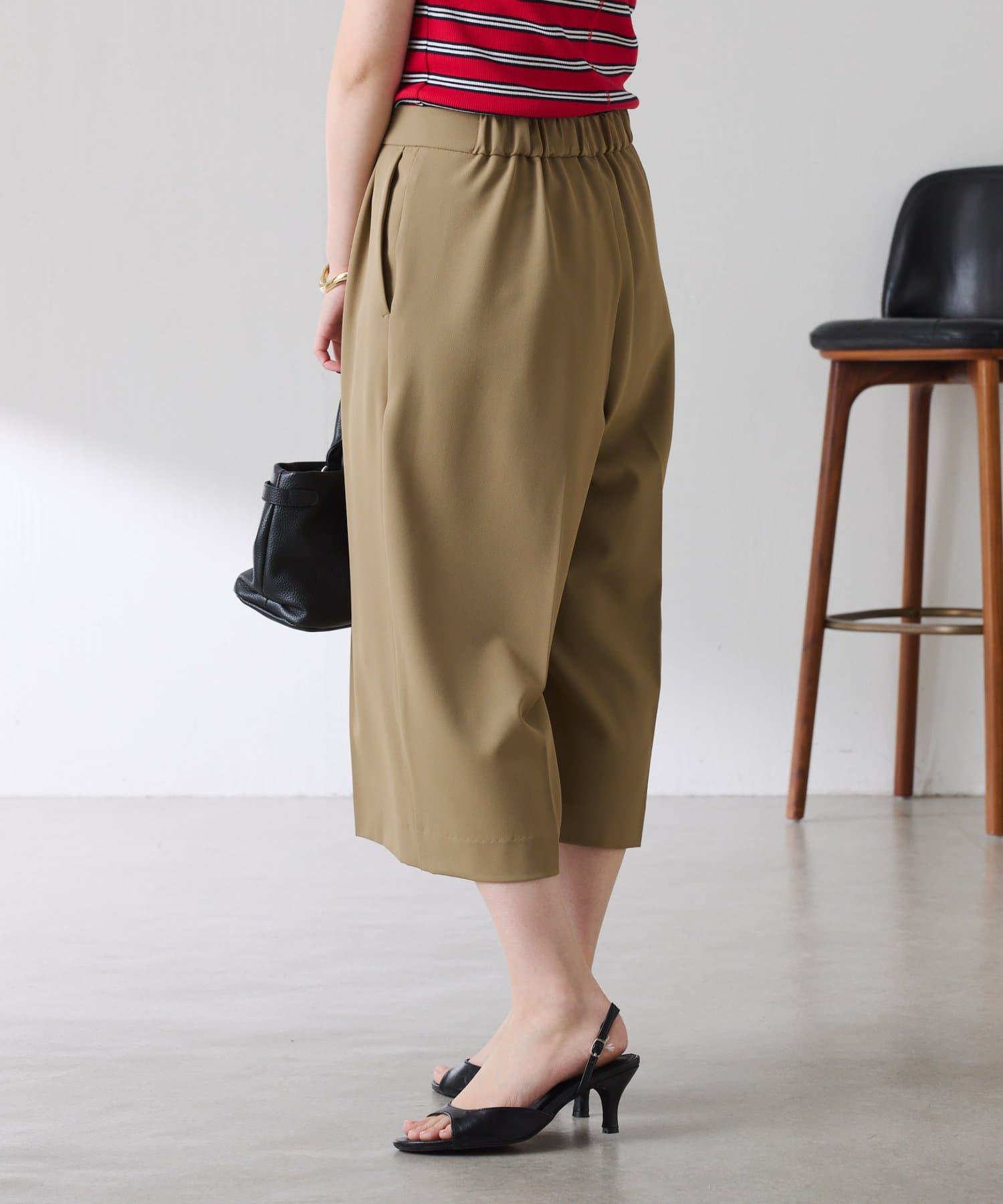 ・タックデザインや落ち感のある生地が腰回りをすっきりと見せ、ハーフ丈でも上品な印象になります。