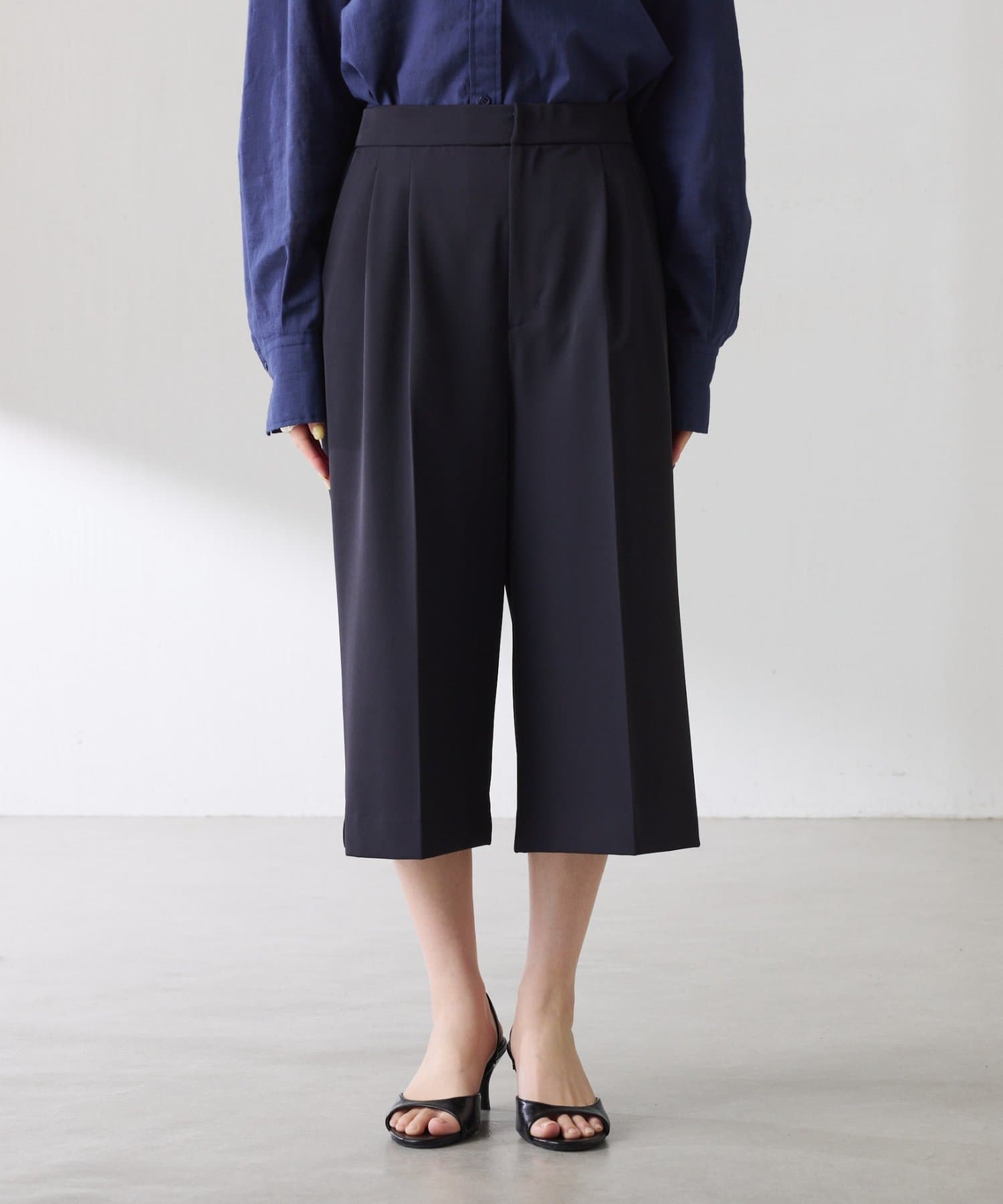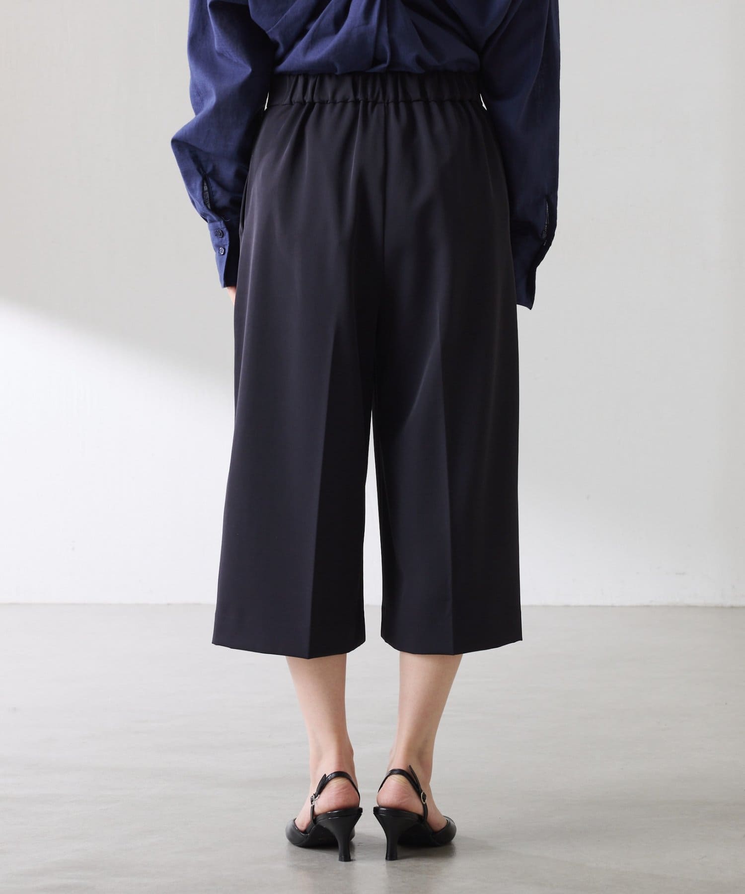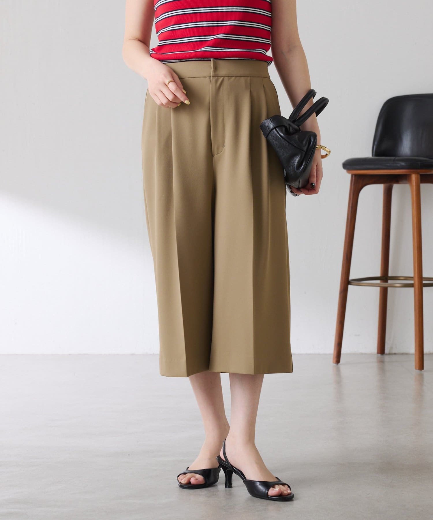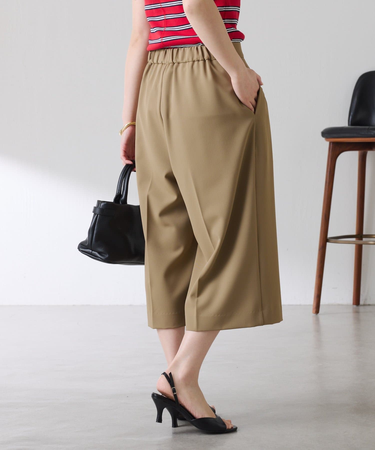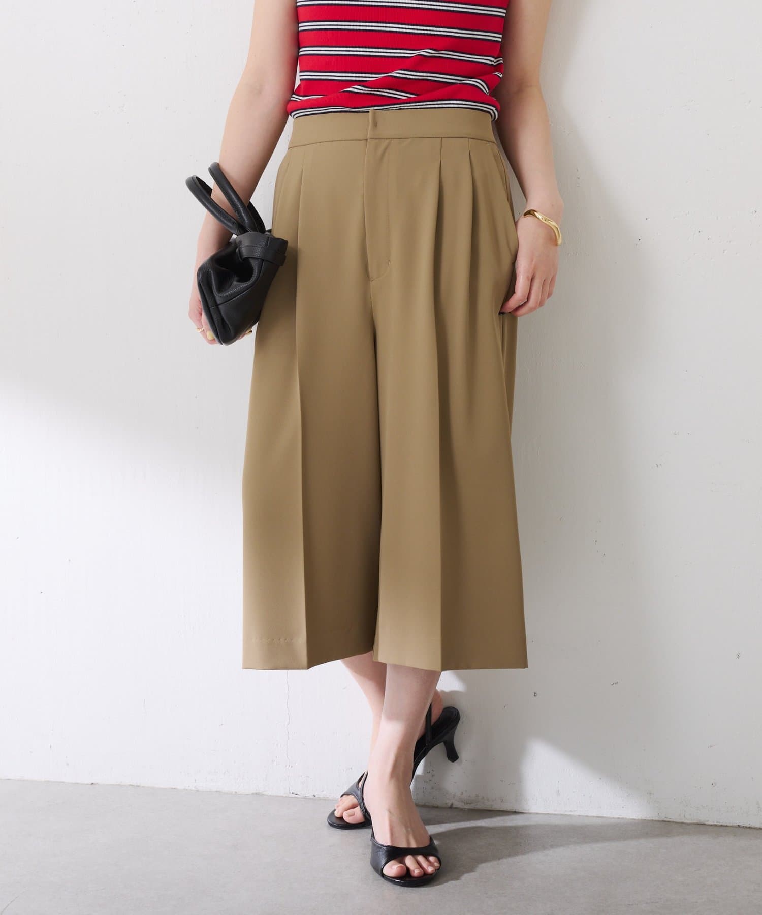 ・タックデザインや落ち感のある生地が腰回りをすっきりと見せ、ハーフ丈でも上品な印象になります。