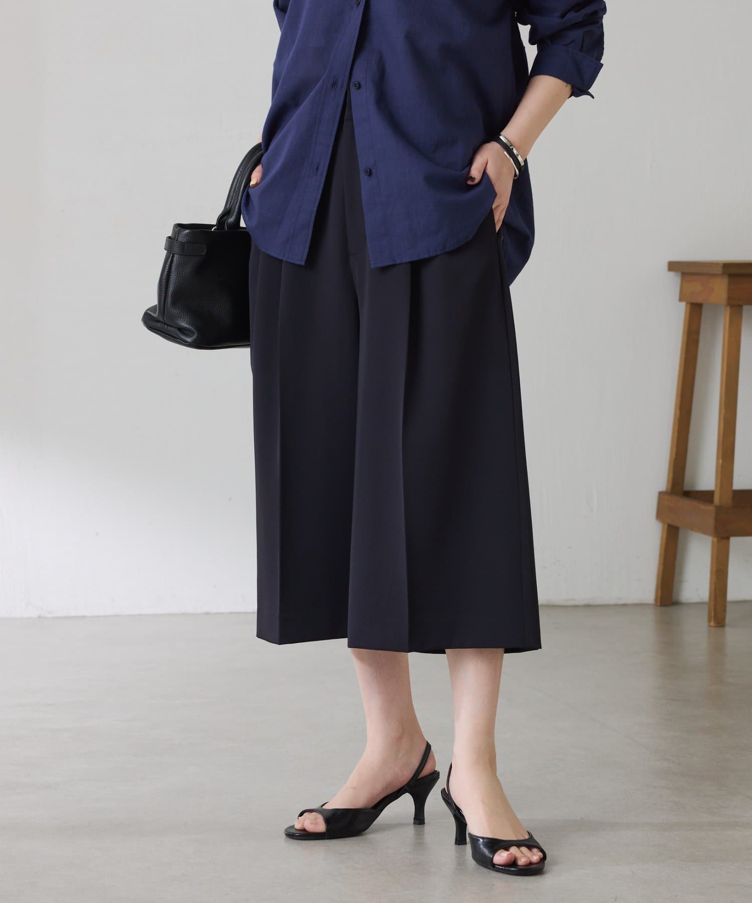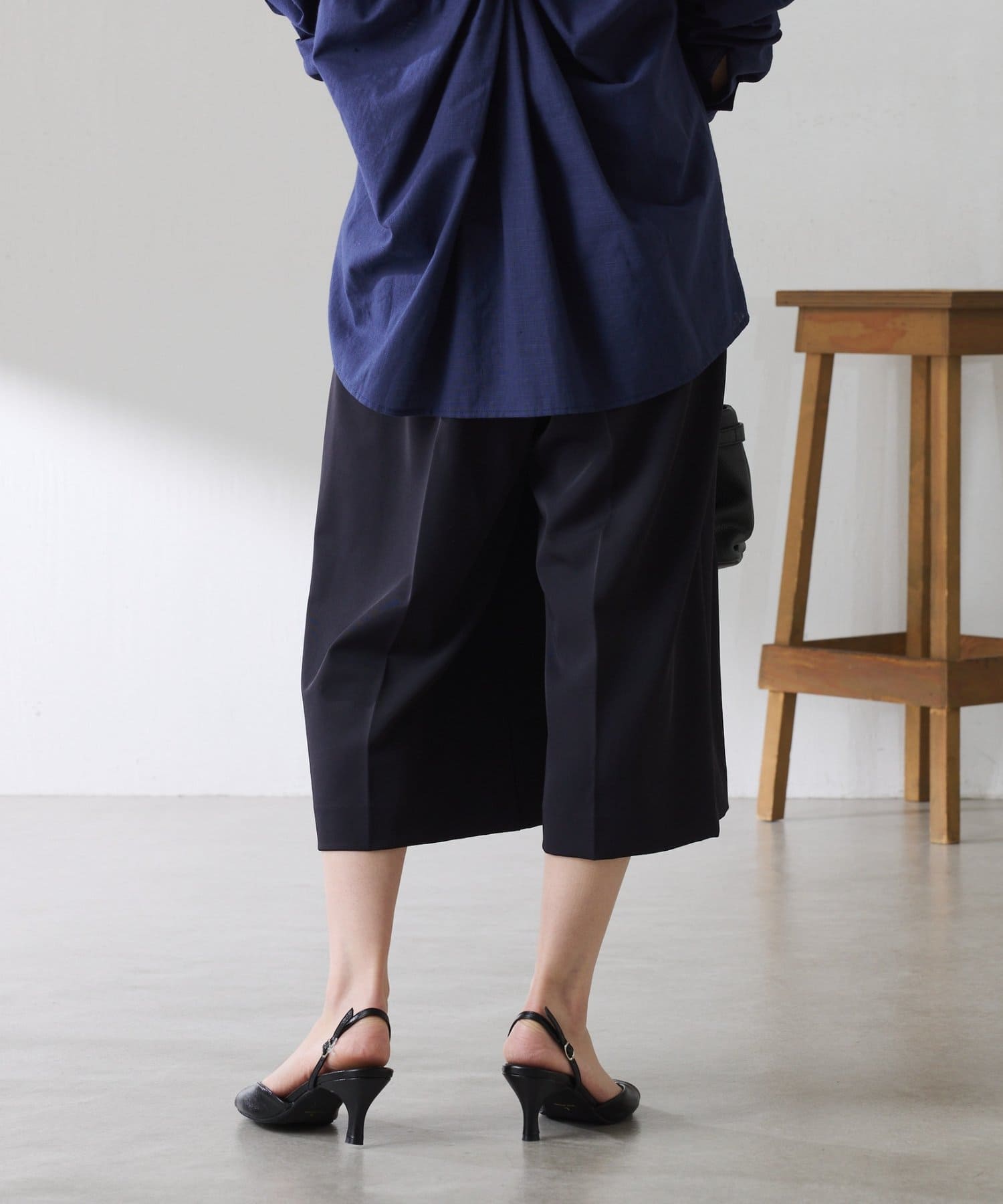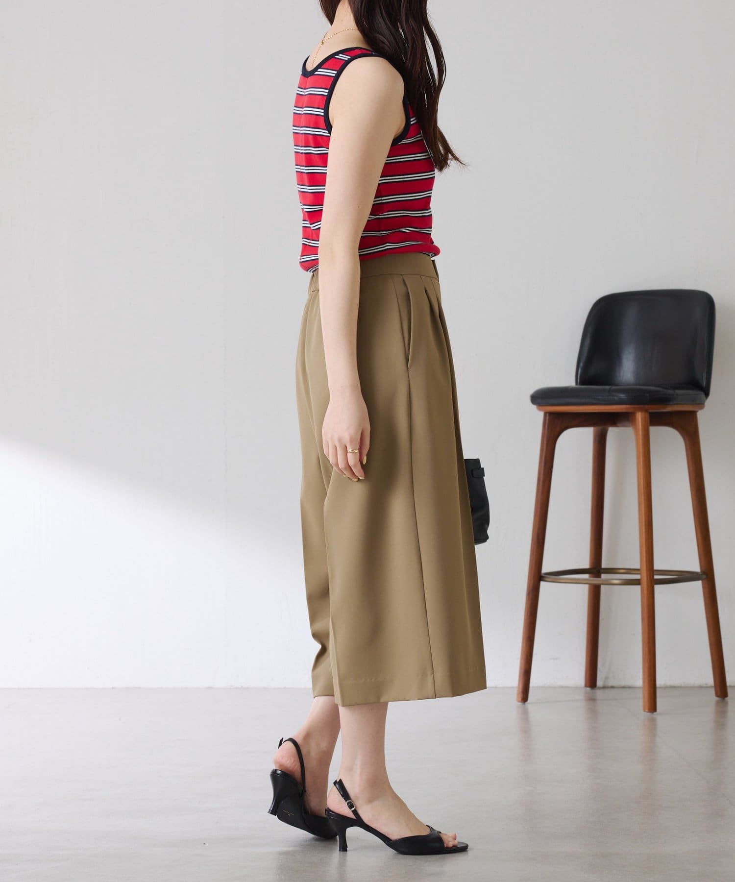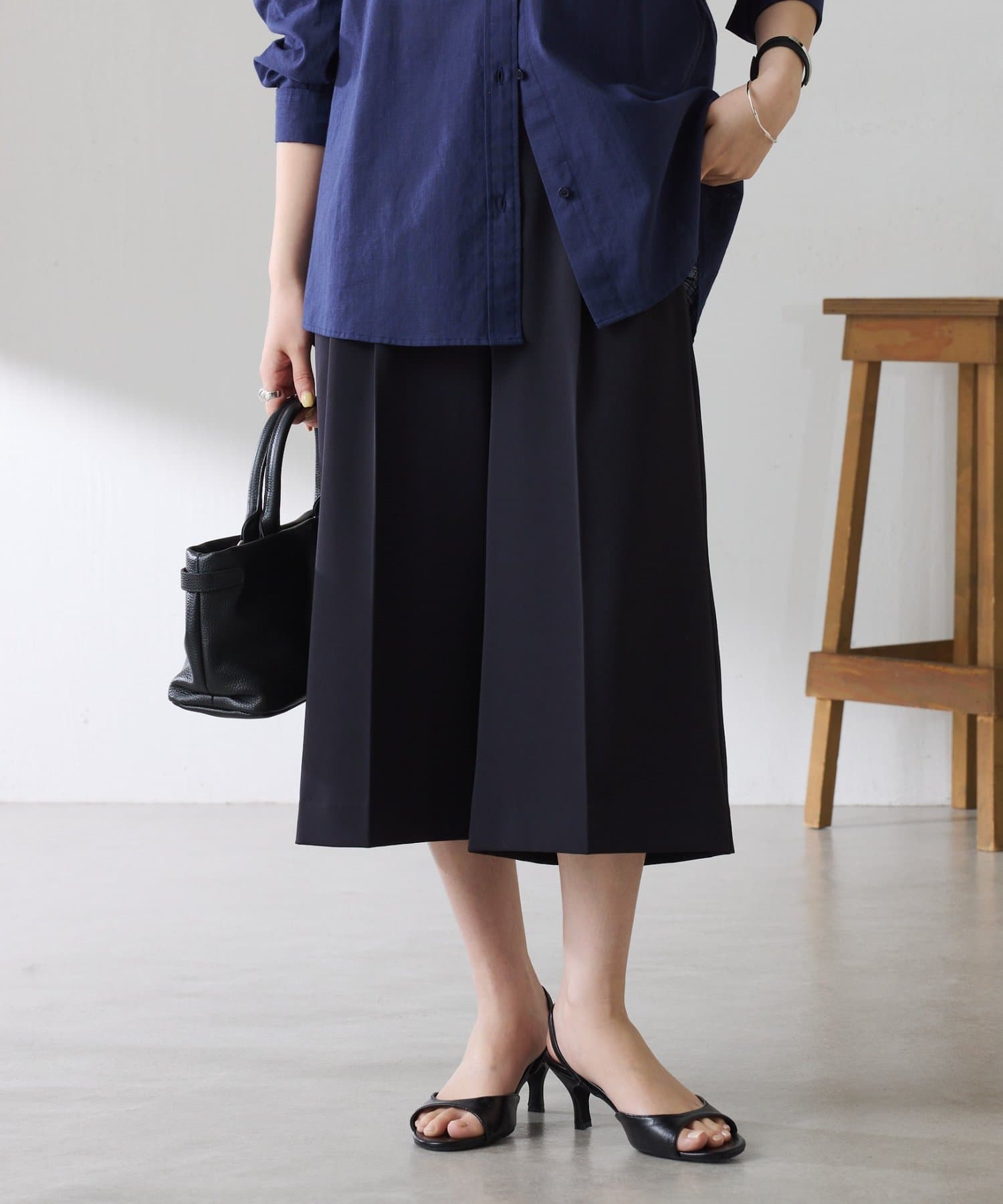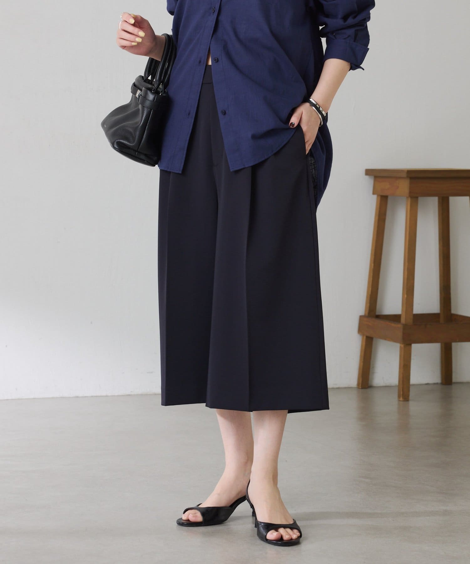 ・タックデザインや落ち感のある生地が腰回りをすっきりと見せ、ハーフ丈でも上品な印象になります。