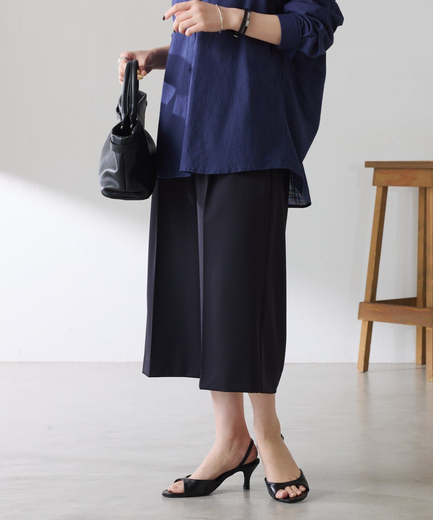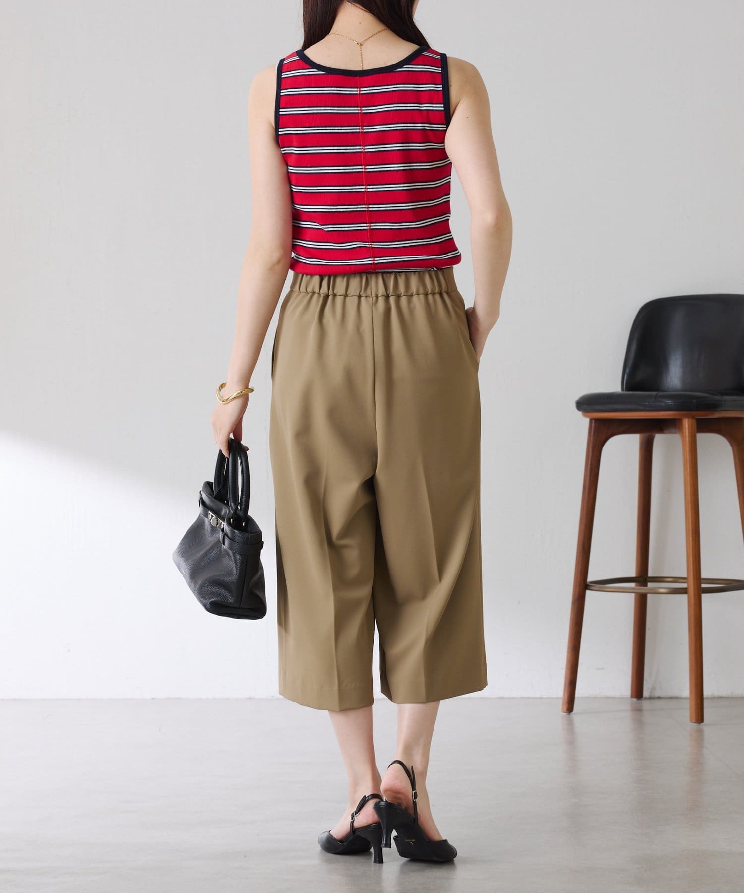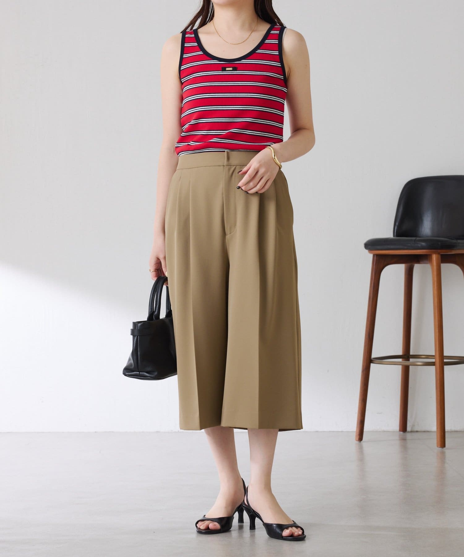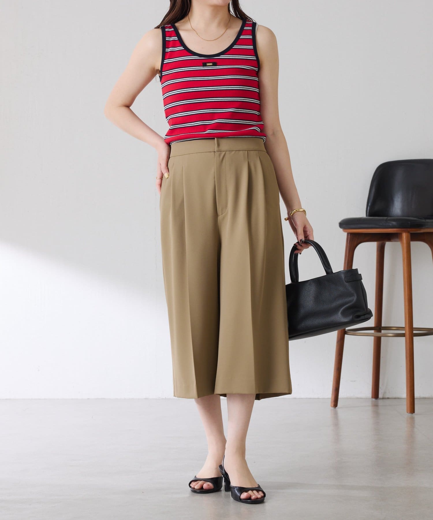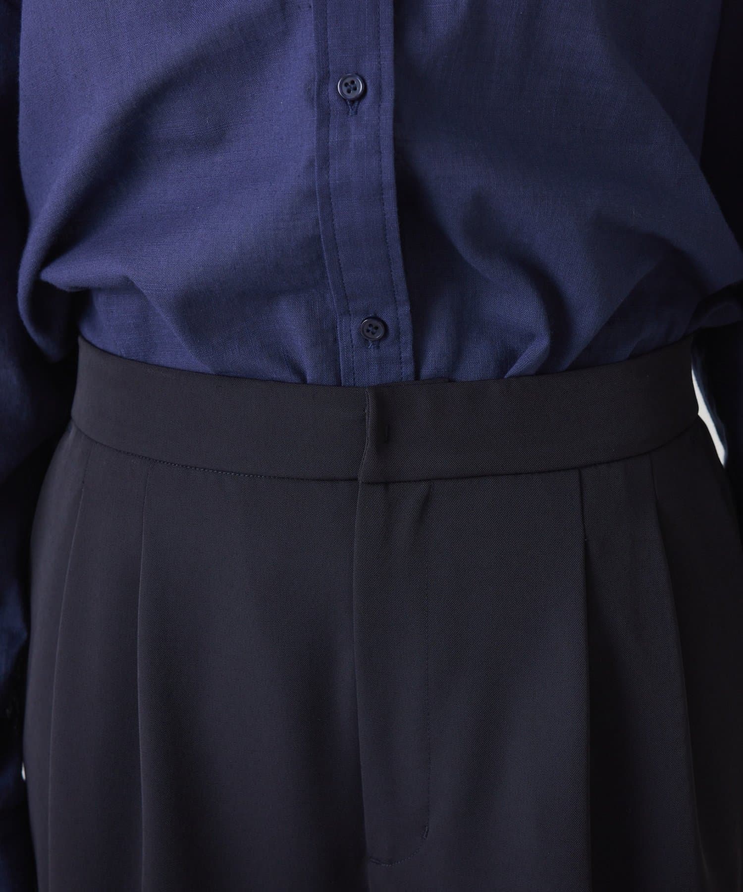 ・タックデザインや落ち感のある生地が腰回りをすっきりと見せ、ハーフ丈でも上品な印象になります。