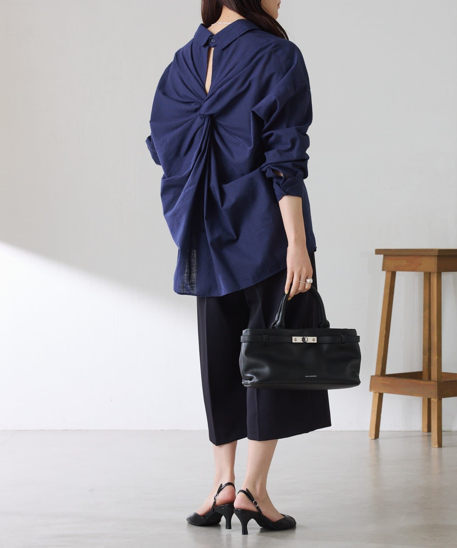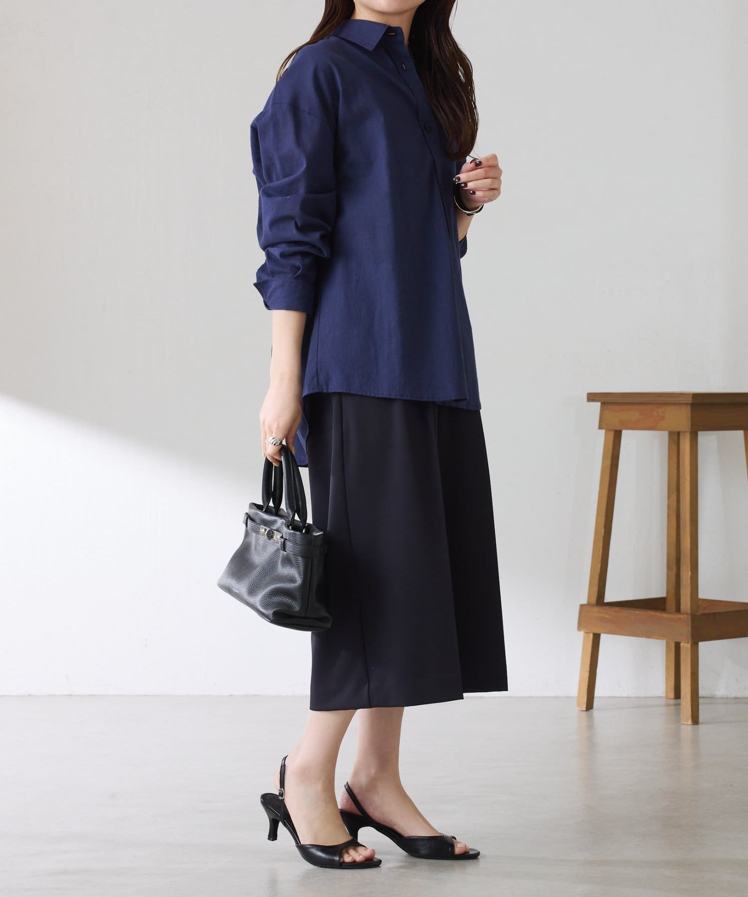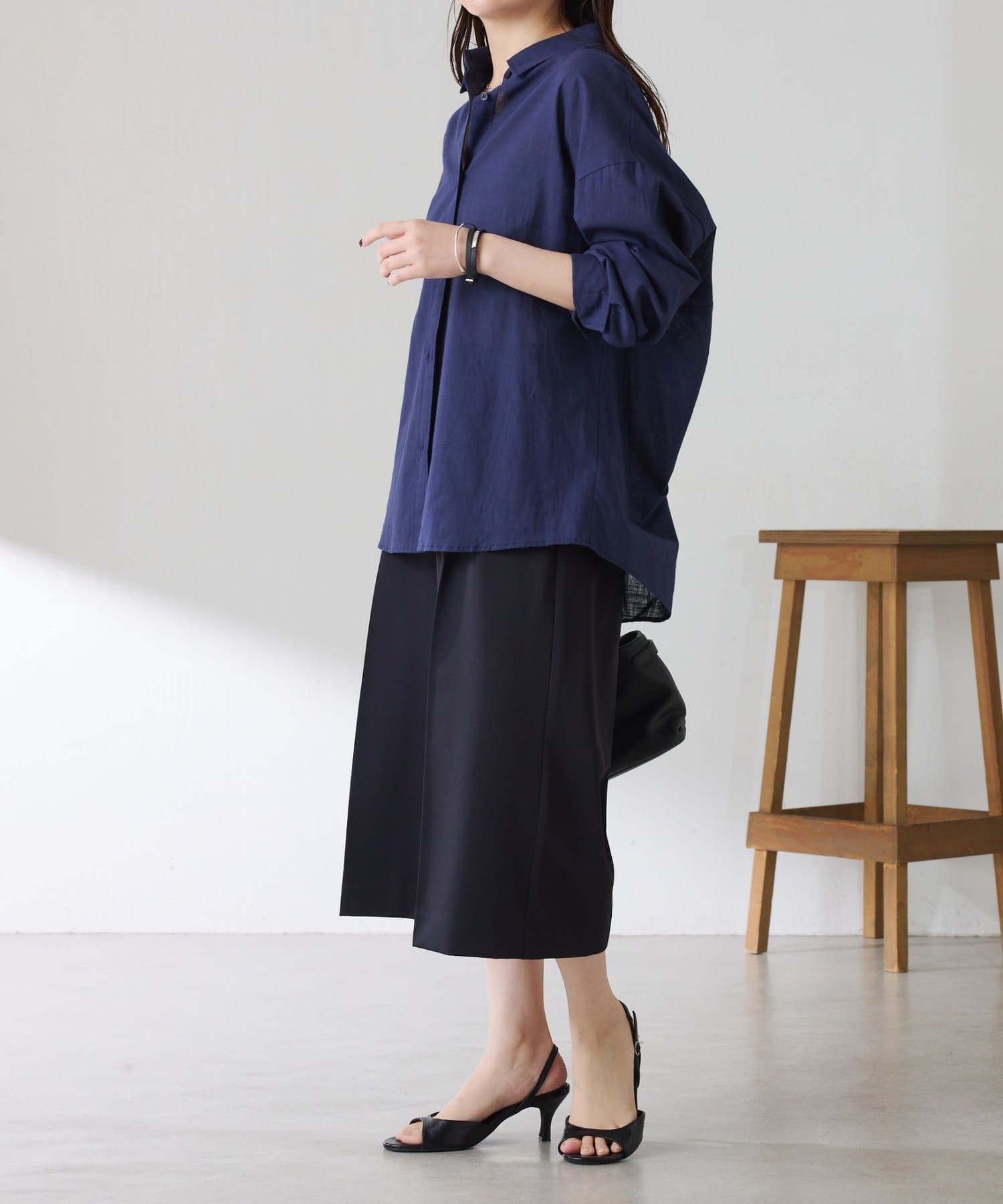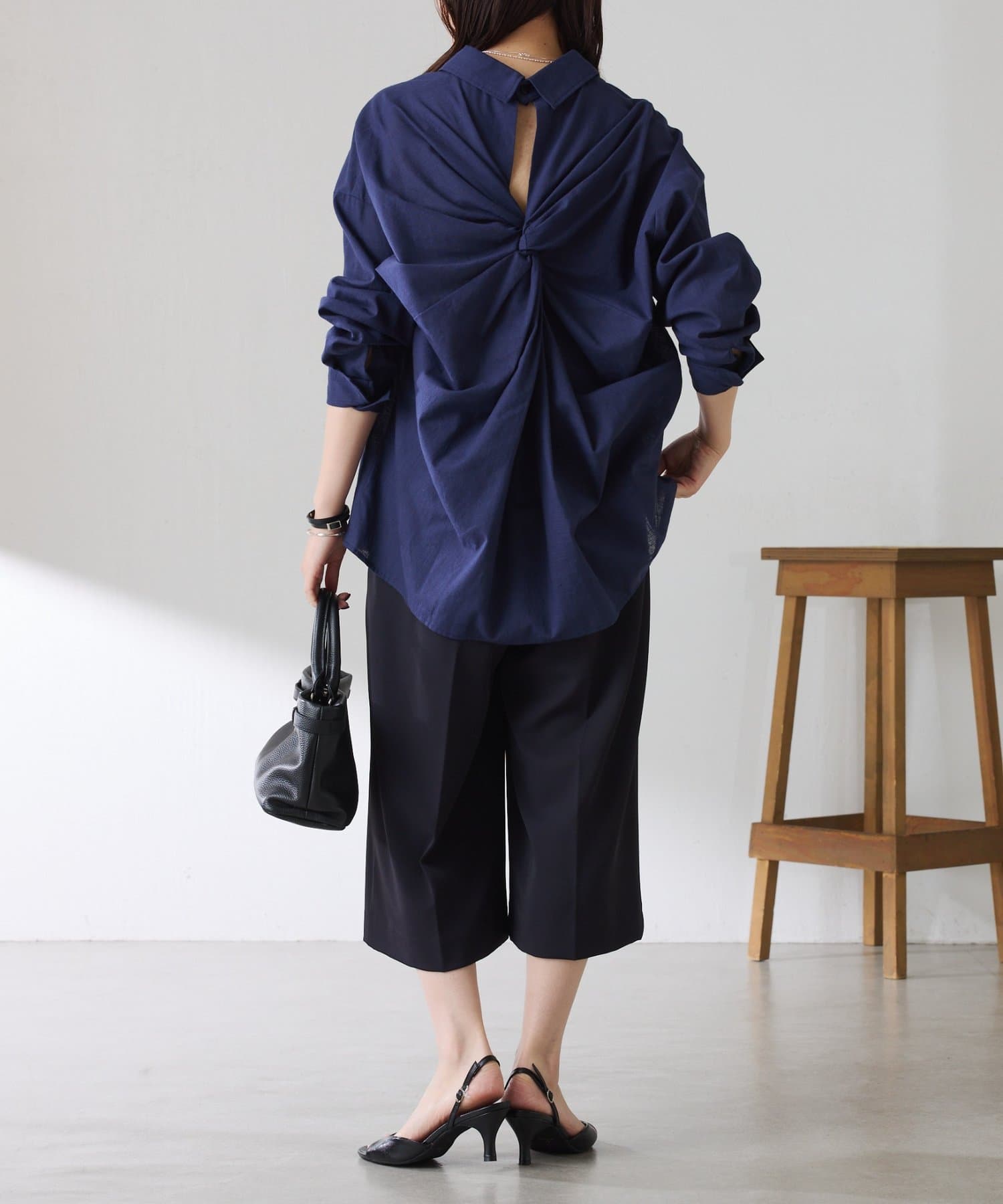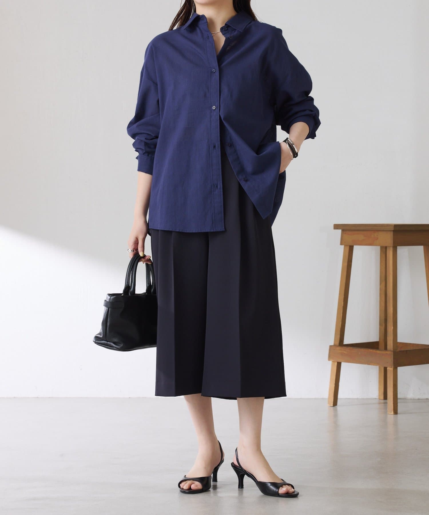 ・タックデザインや落ち感のある生地が腰回りをすっきりと見せ、ハーフ丈でも上品な印象になります。