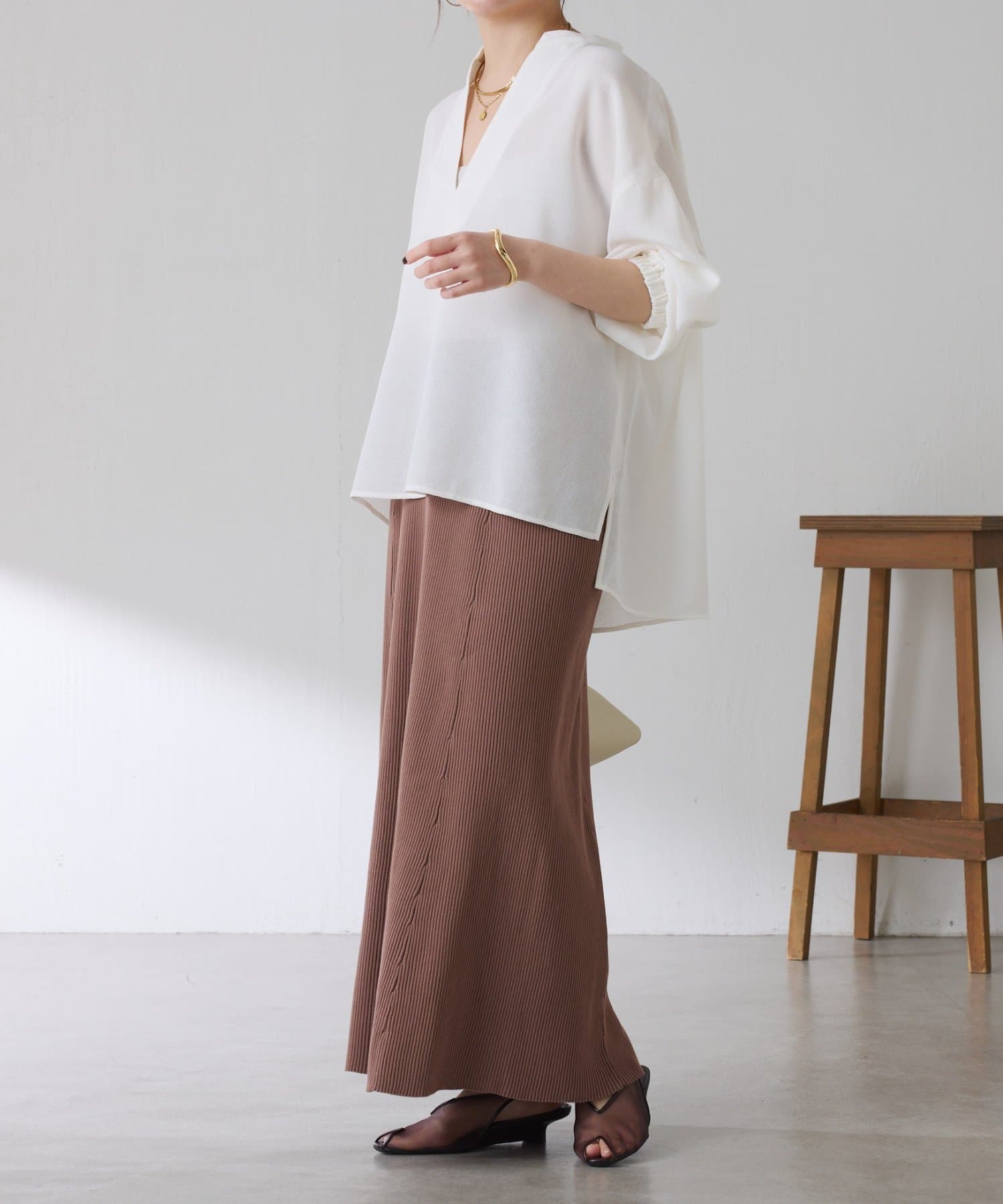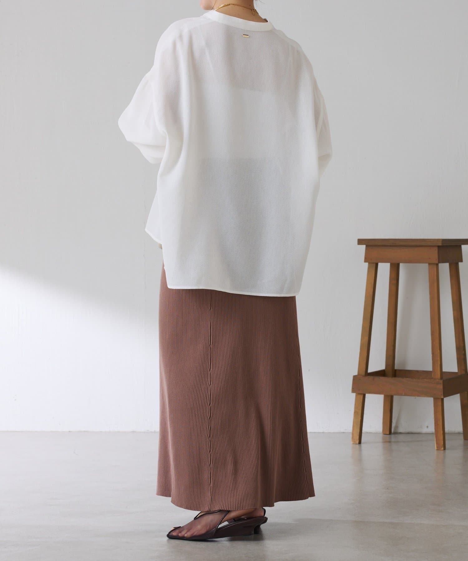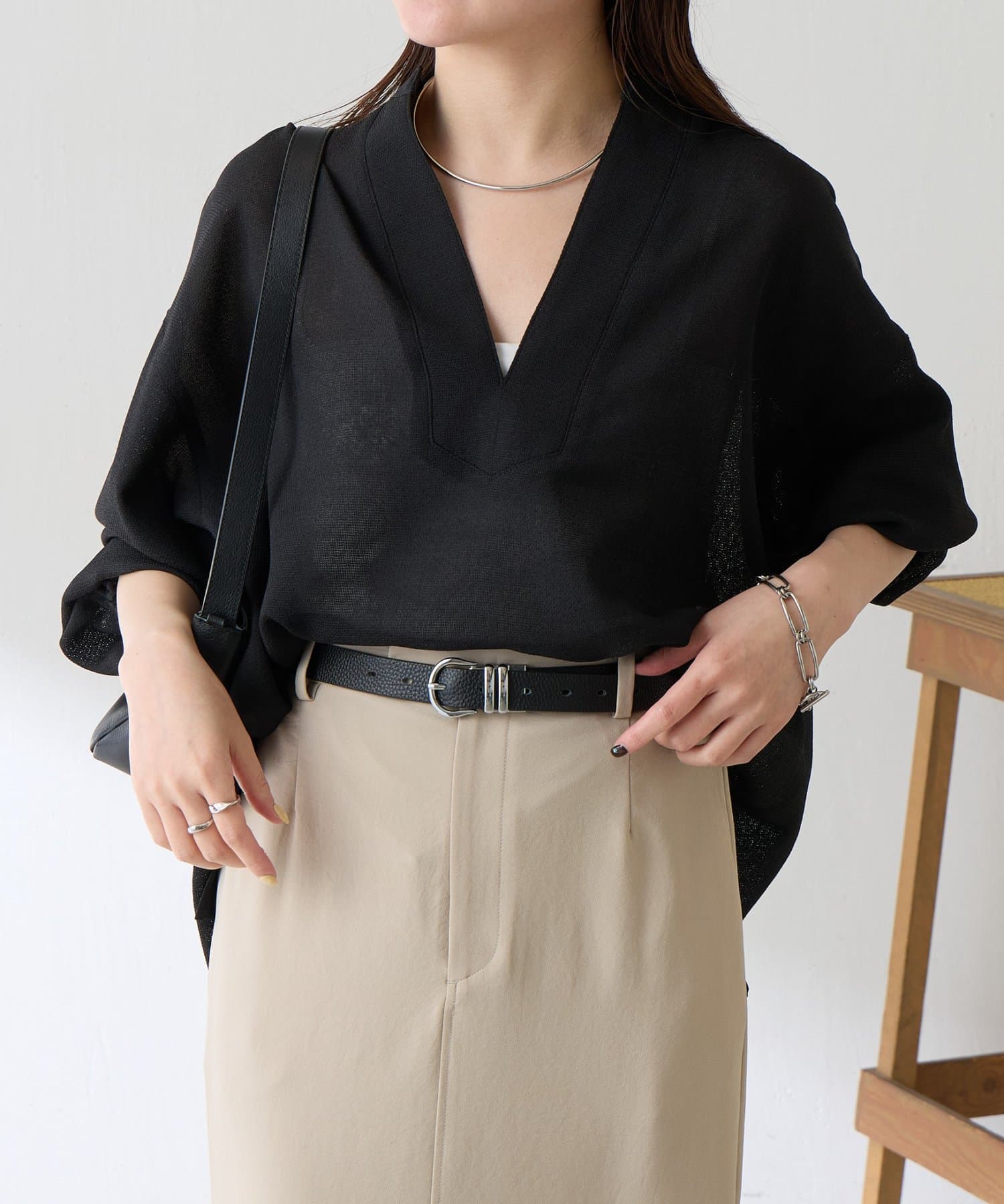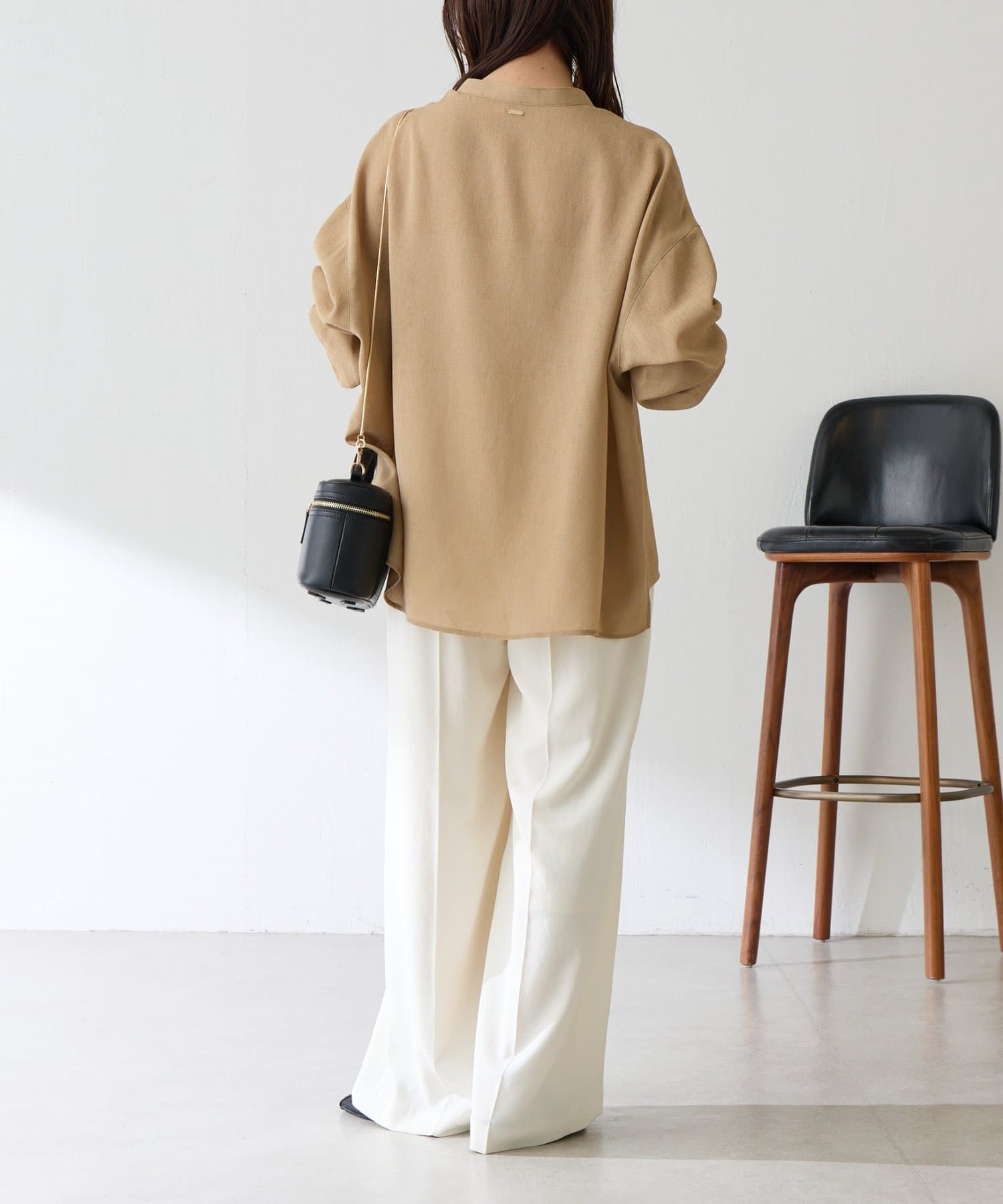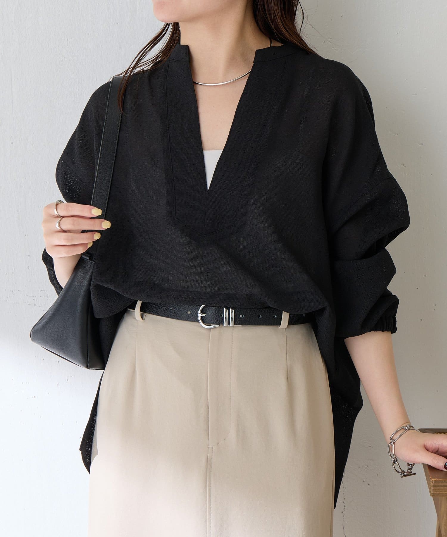 ・襟元はスキッパーデザインにすることで顔周りもすっきりとした印象になります。