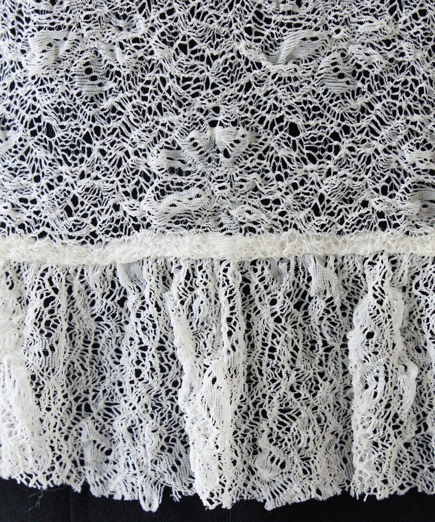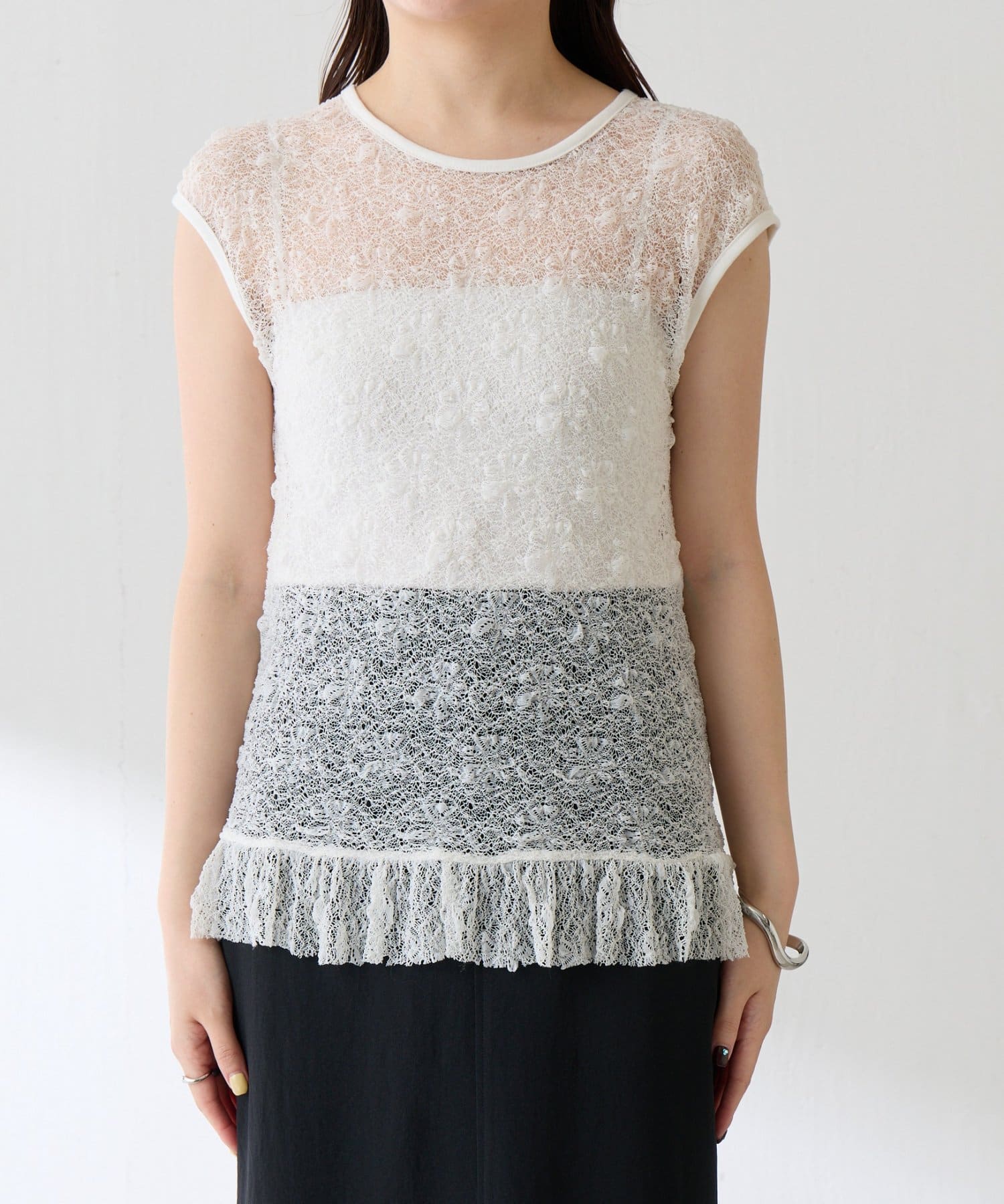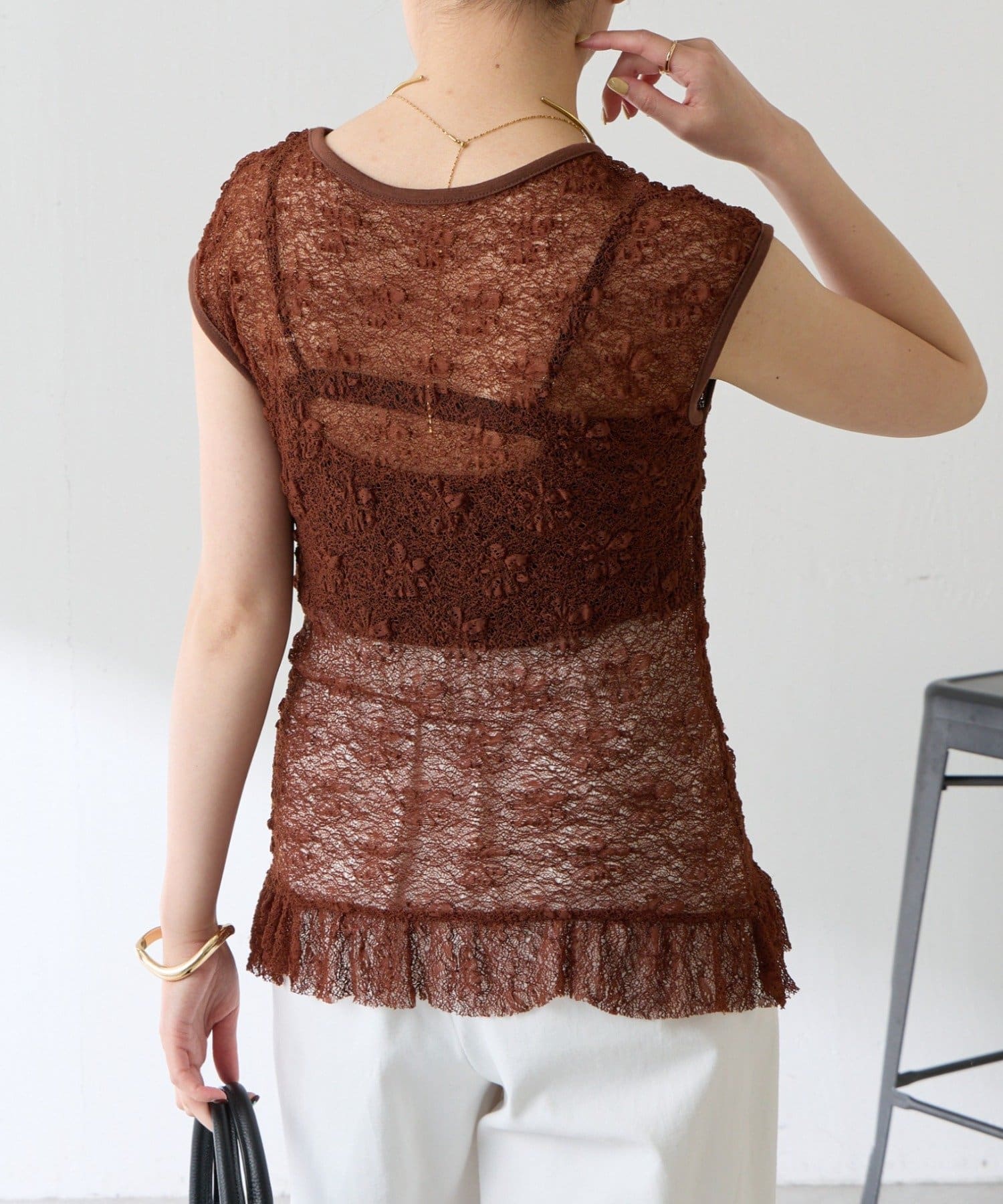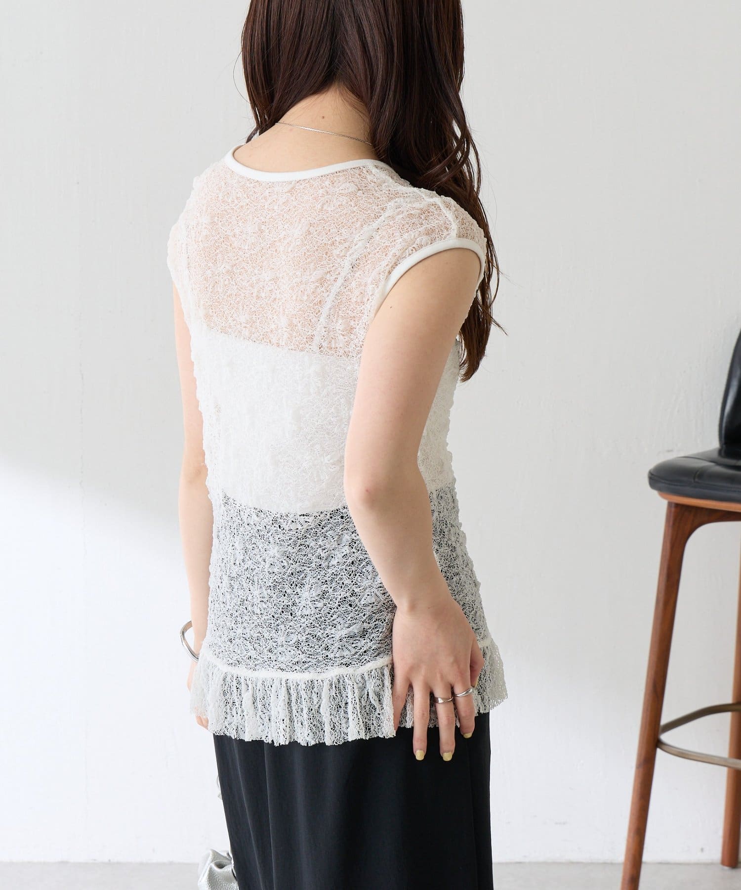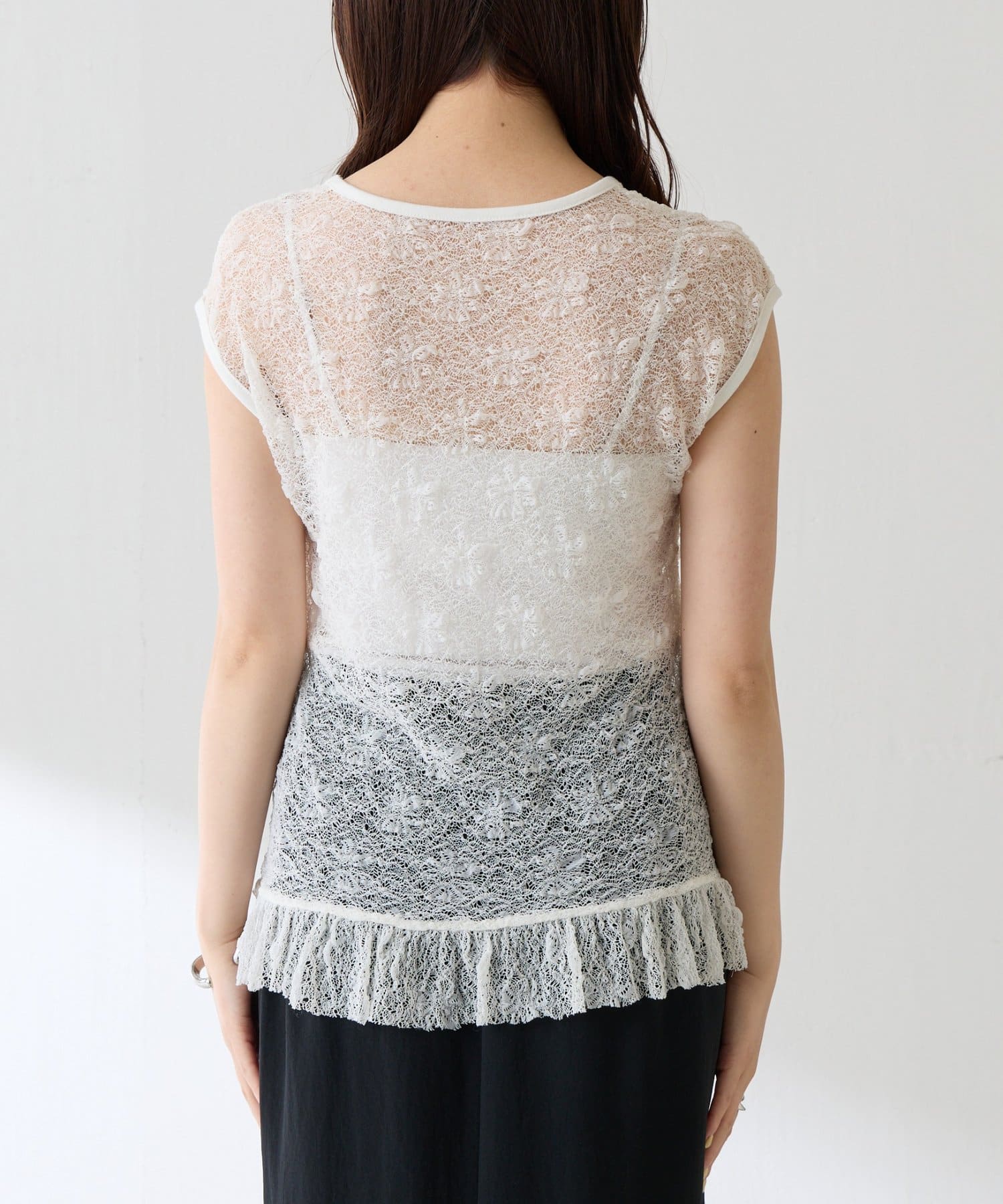 ・柔らかいストレッチレースを使用しているので楽な着心地で着ていただけるレースアイテムです。