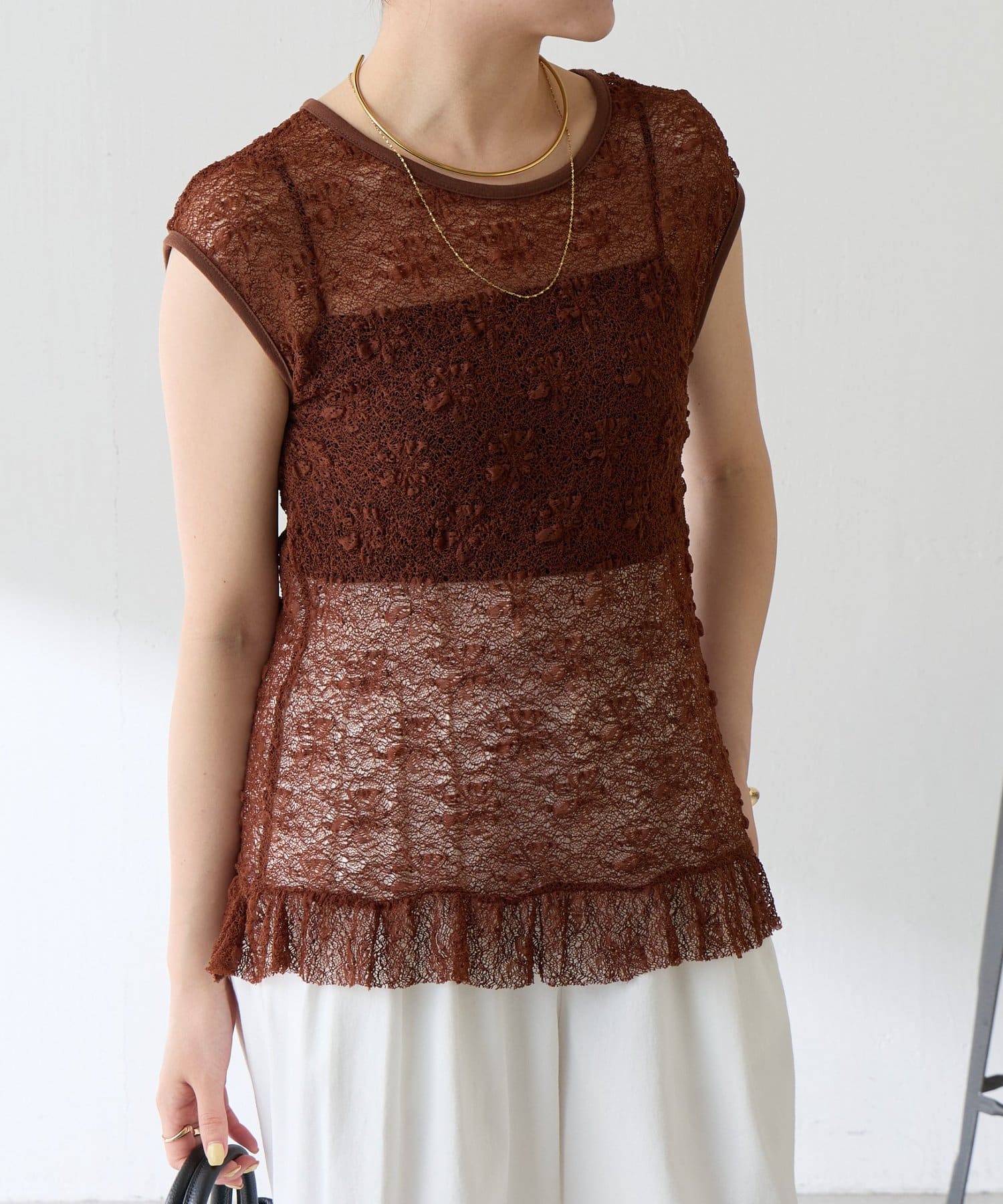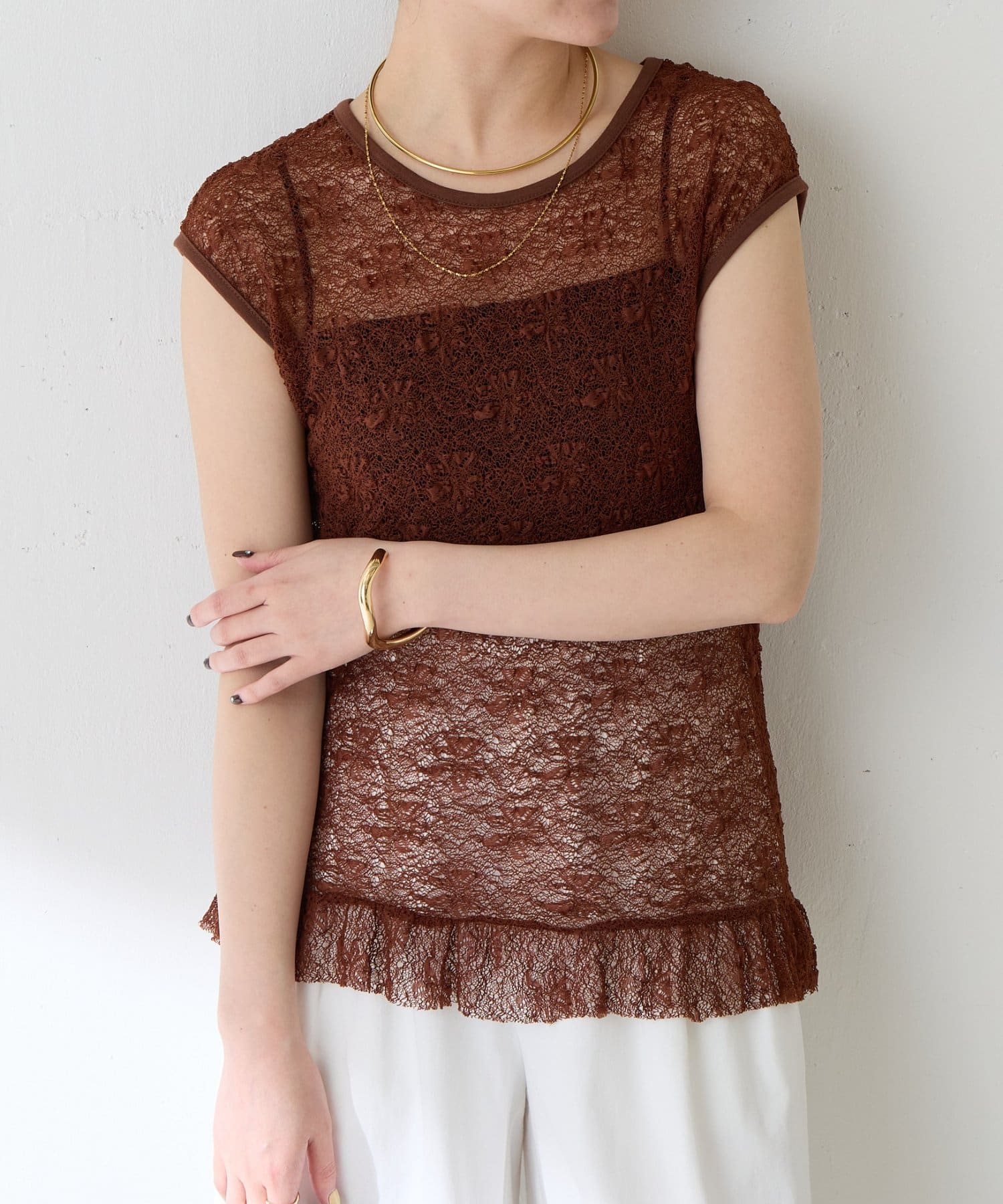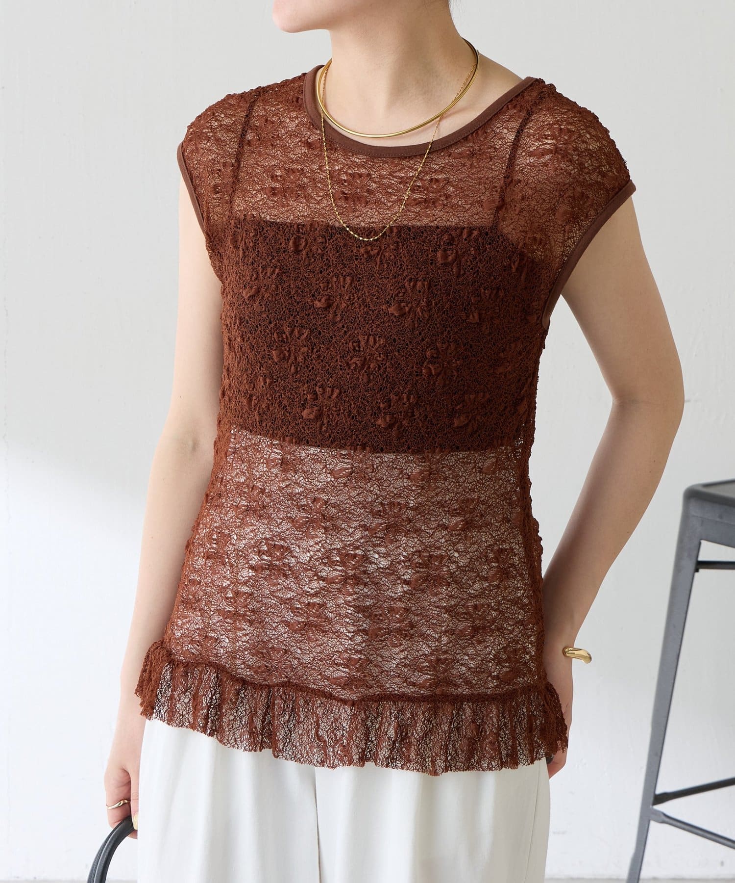 暑い時期はブラ付きのインナーの上から着ても、涼しくなったらTシャツカーディガンの中に着て裾からレースを覗かせるのもおすすめです。