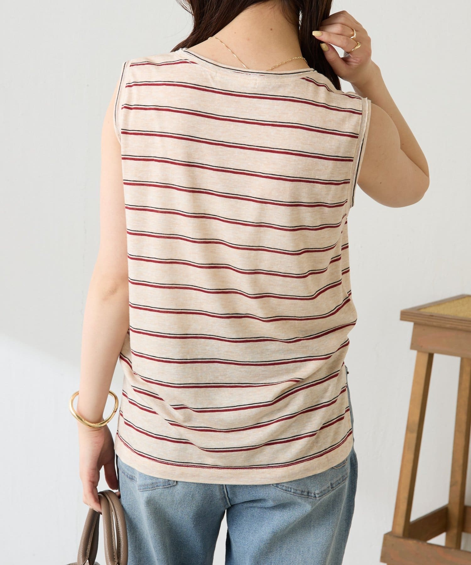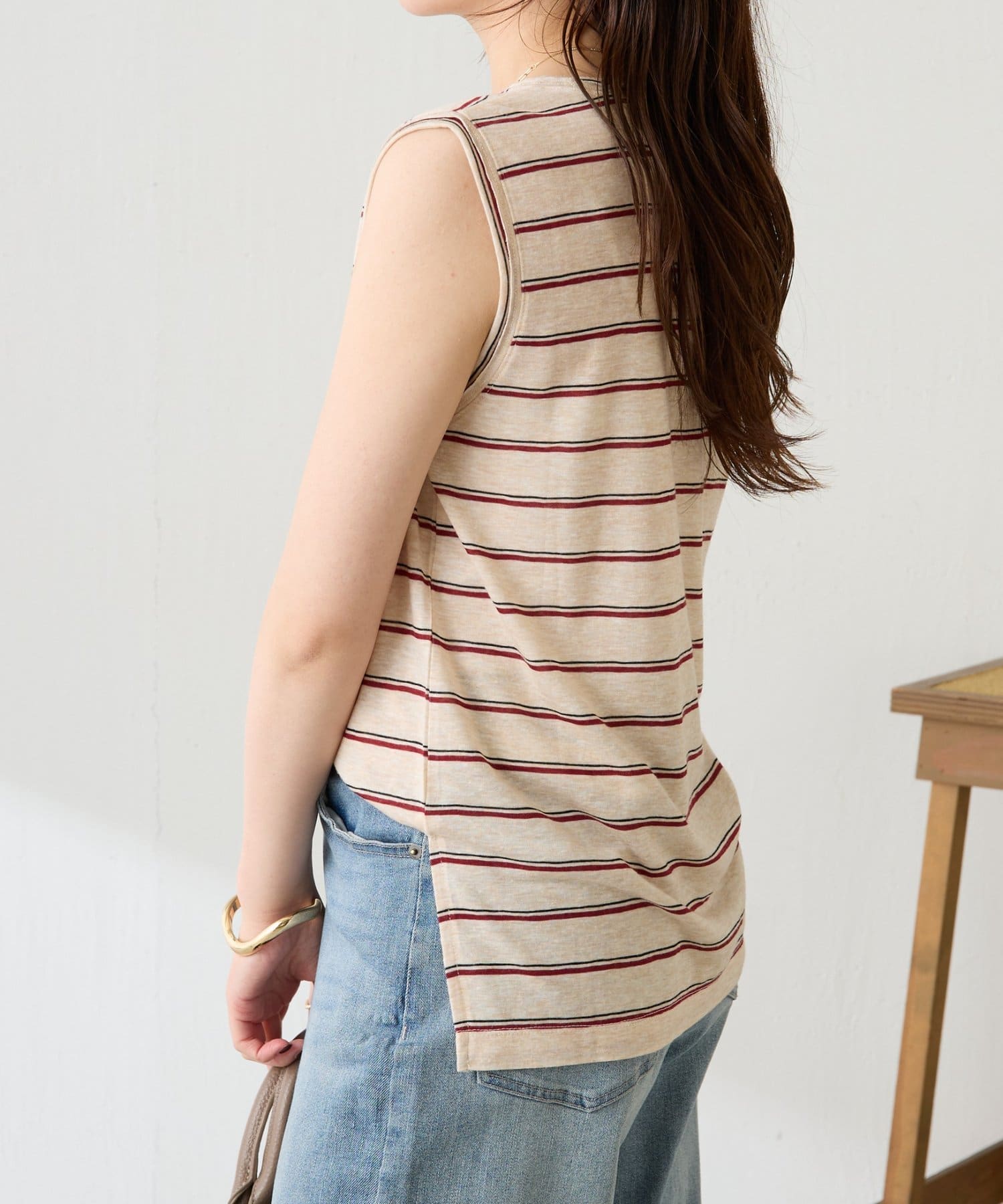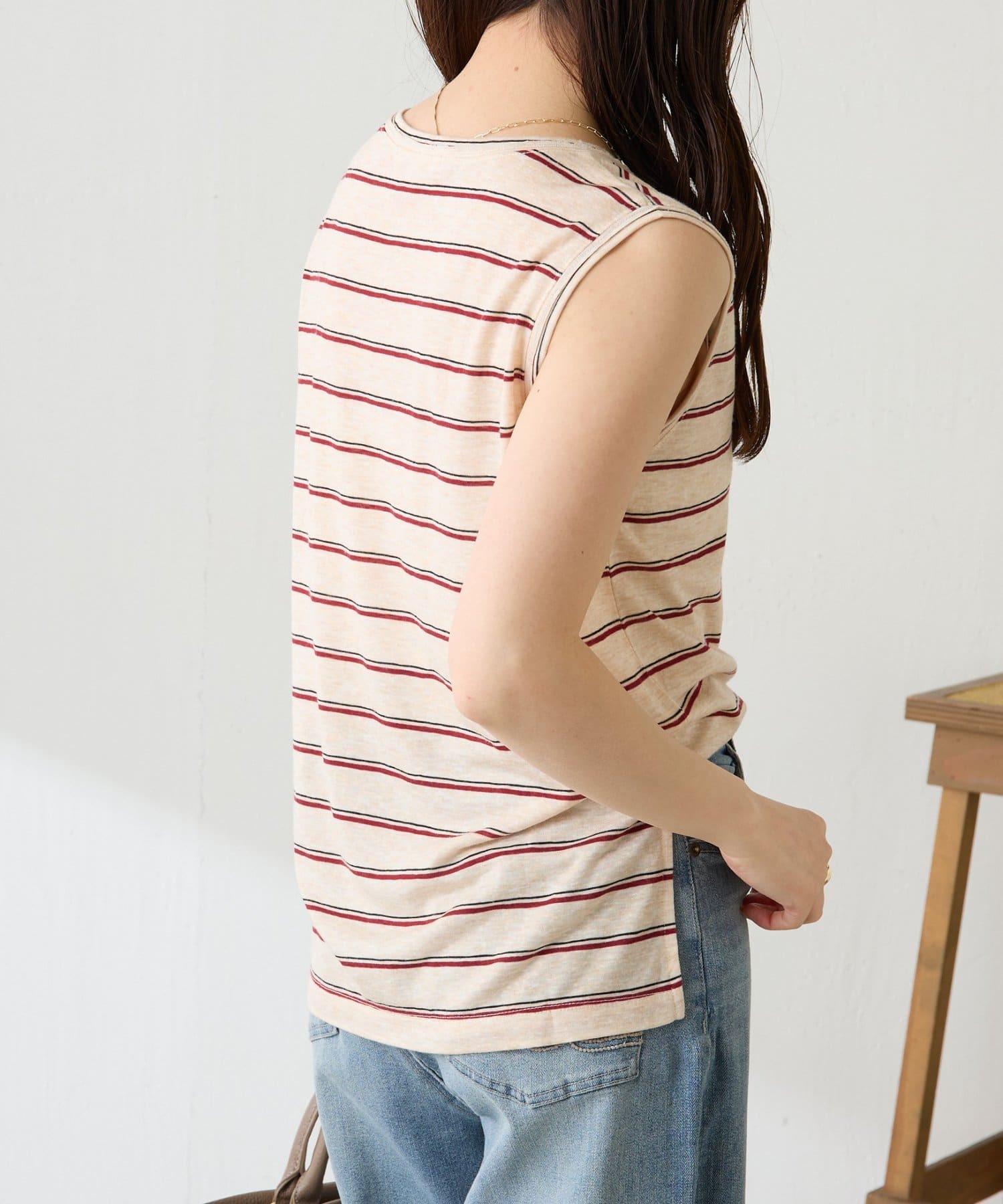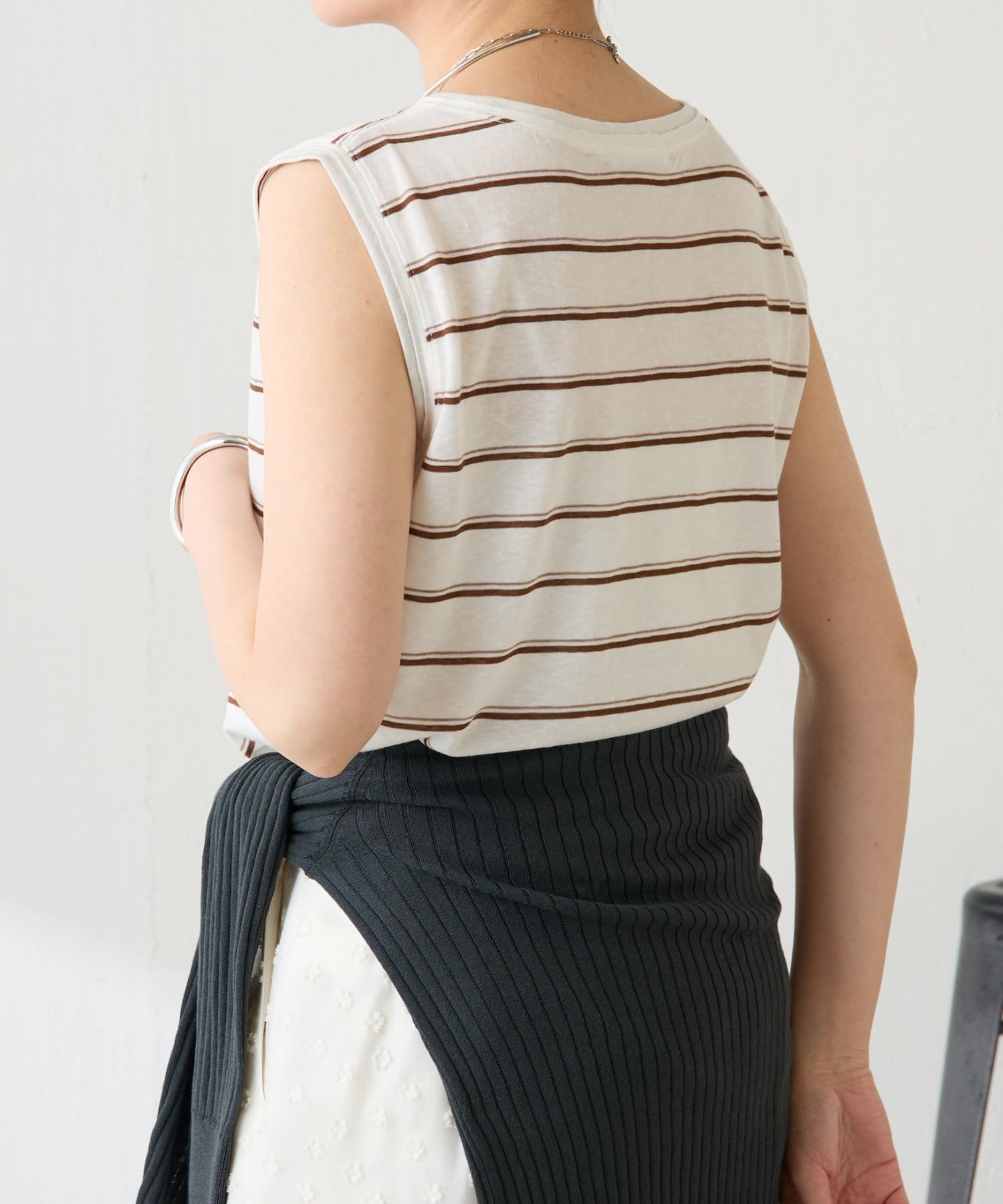 ・羽織りと一緒に着た時でも涼しさも叶うノースリーブアイテム。