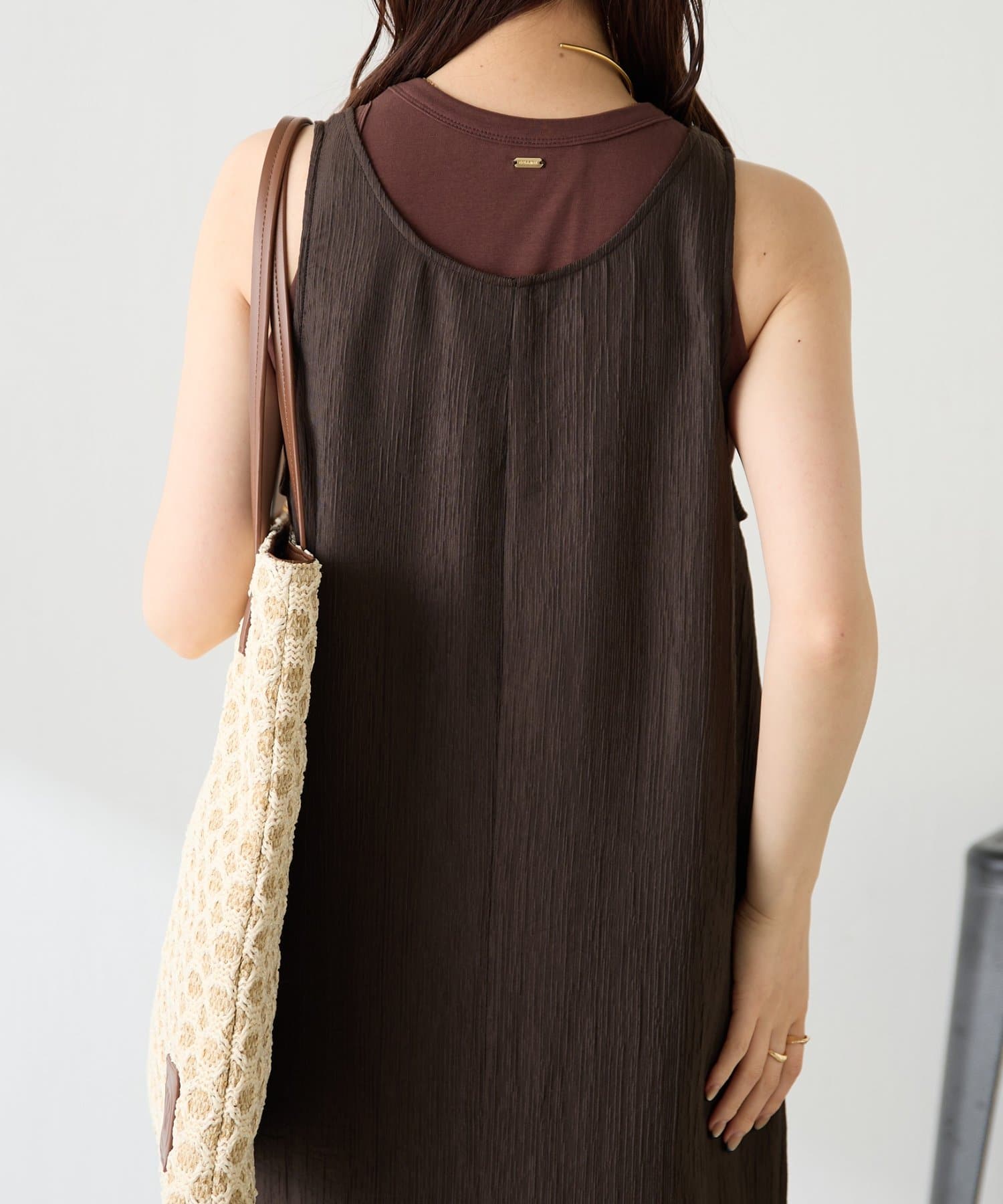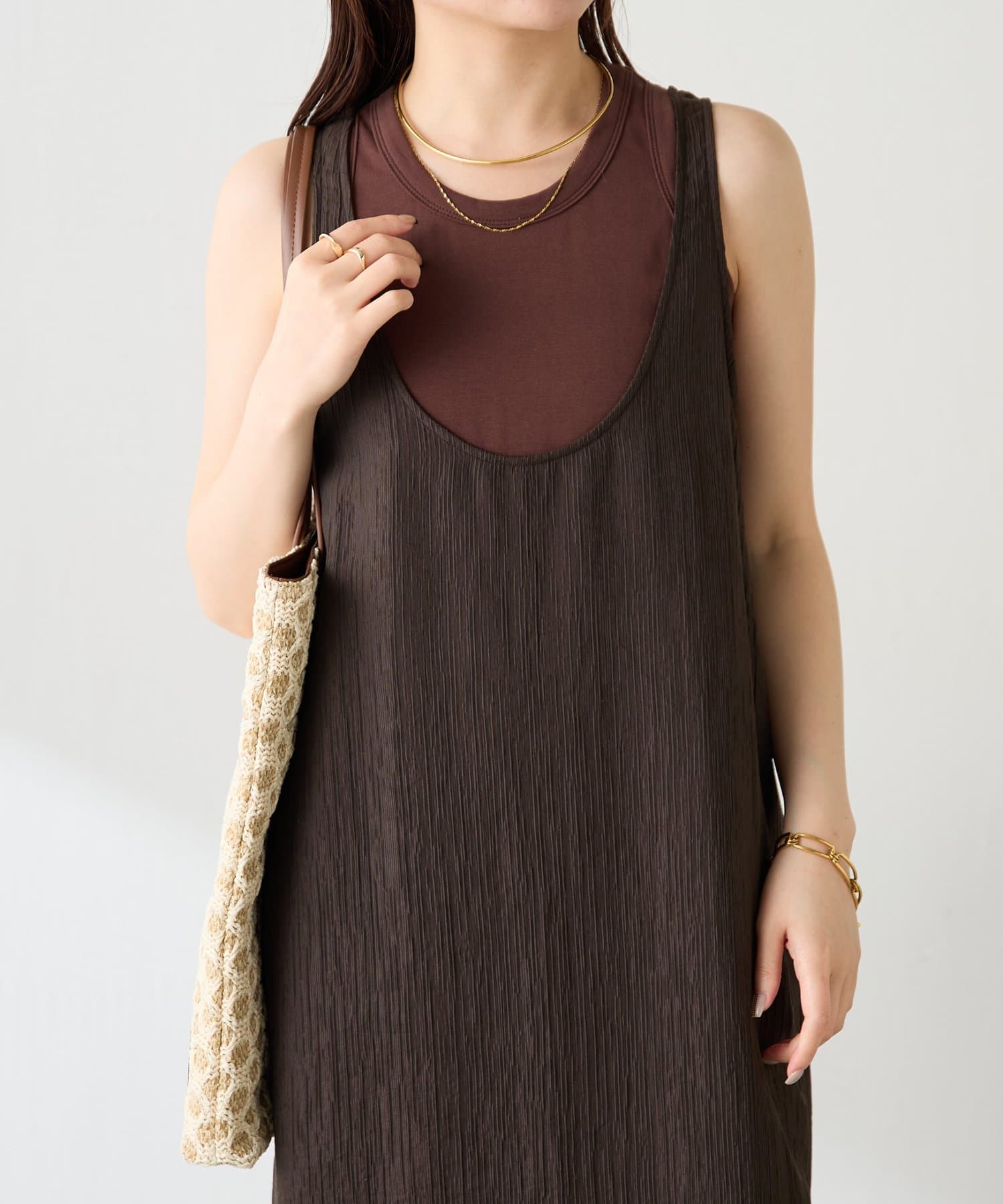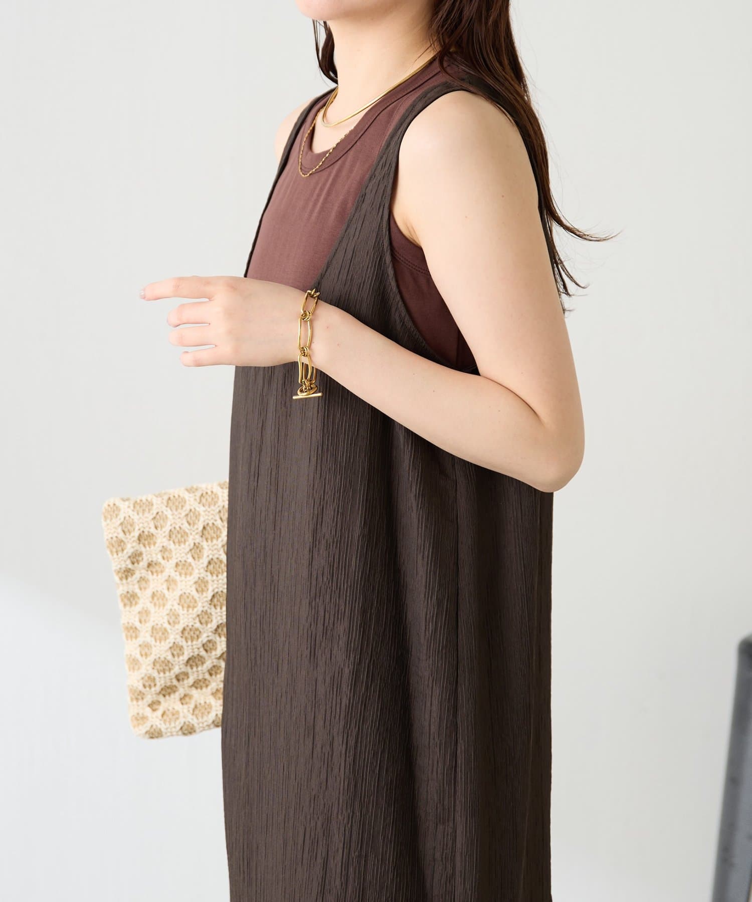 ・重ねたときにタンクトップのゴールドプレートが見えるようにこだわりました。