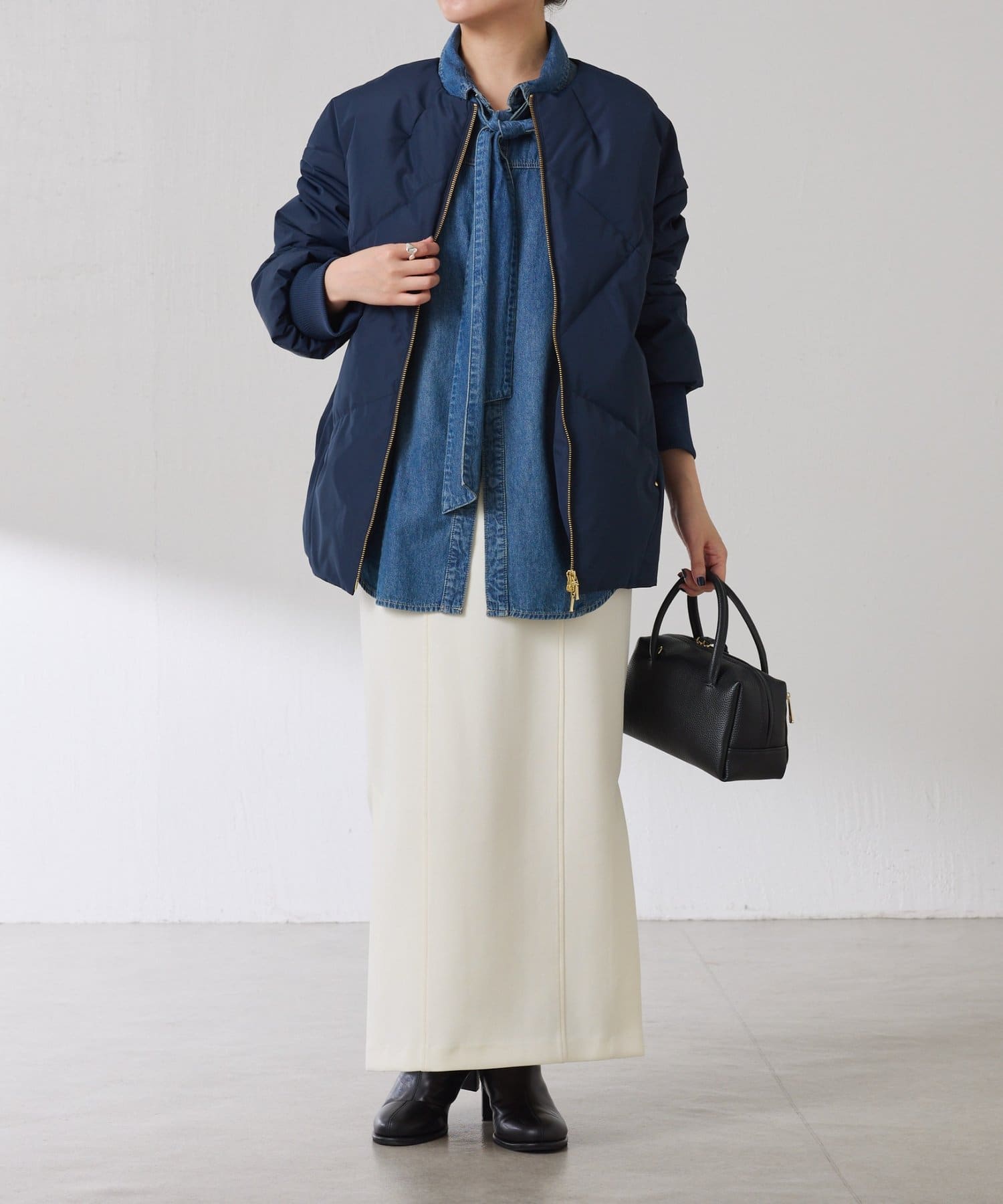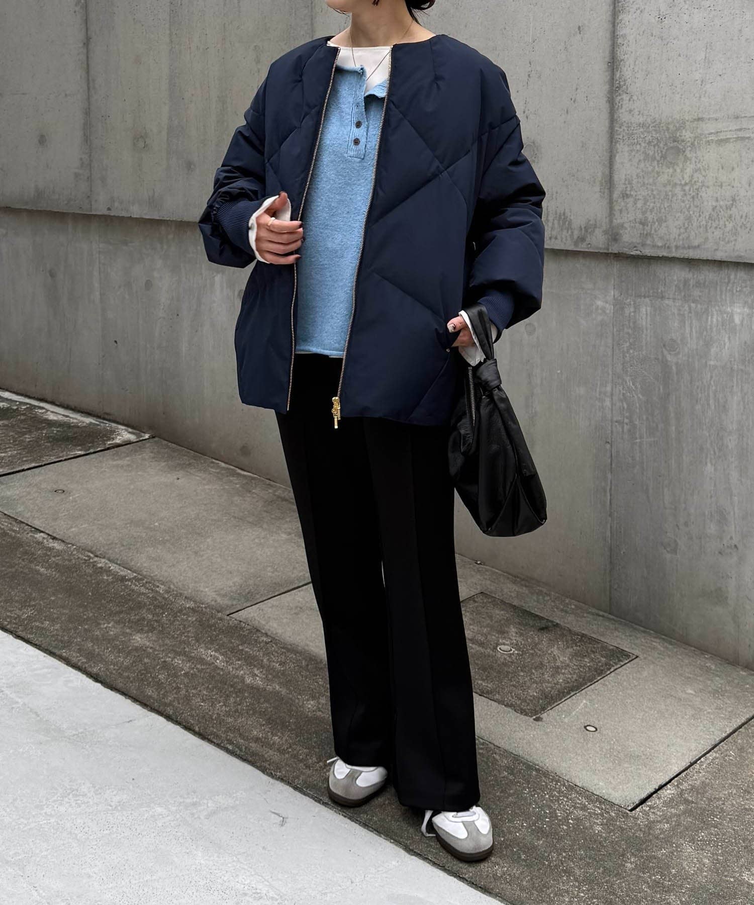 ノーカラーですのでハイネックやフーディ、マフラーで気温調節がしやすいです。