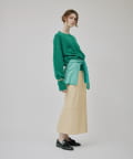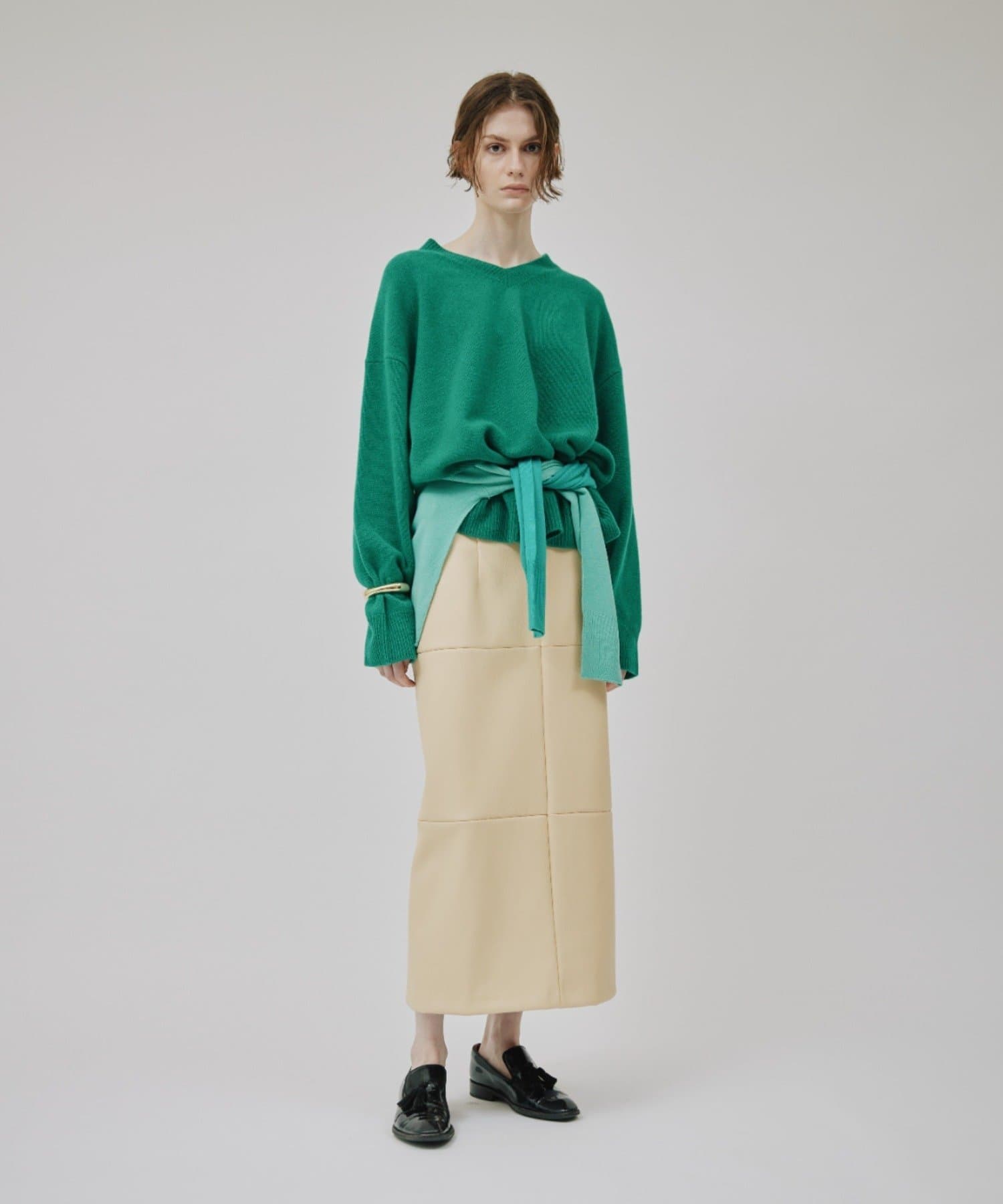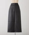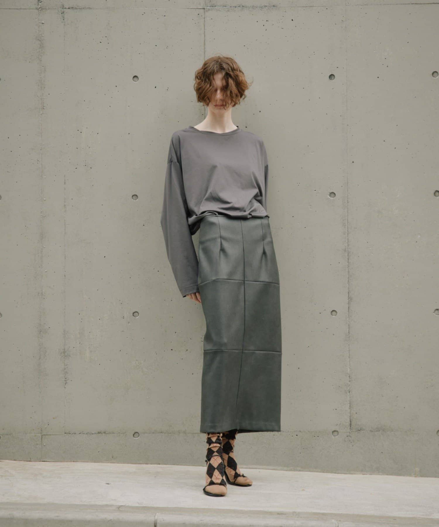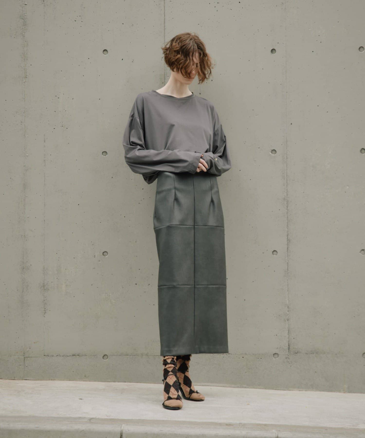 ・肉厚な表情あるエコレザーで作られたミディ丈のスカート。