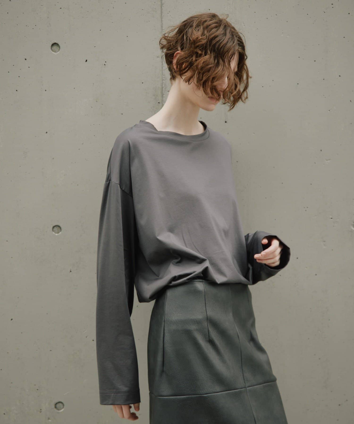 ・身頃だけでなく、袖にも太さと長さを出し、ルーズな印象で着られるサイズ感にしています。