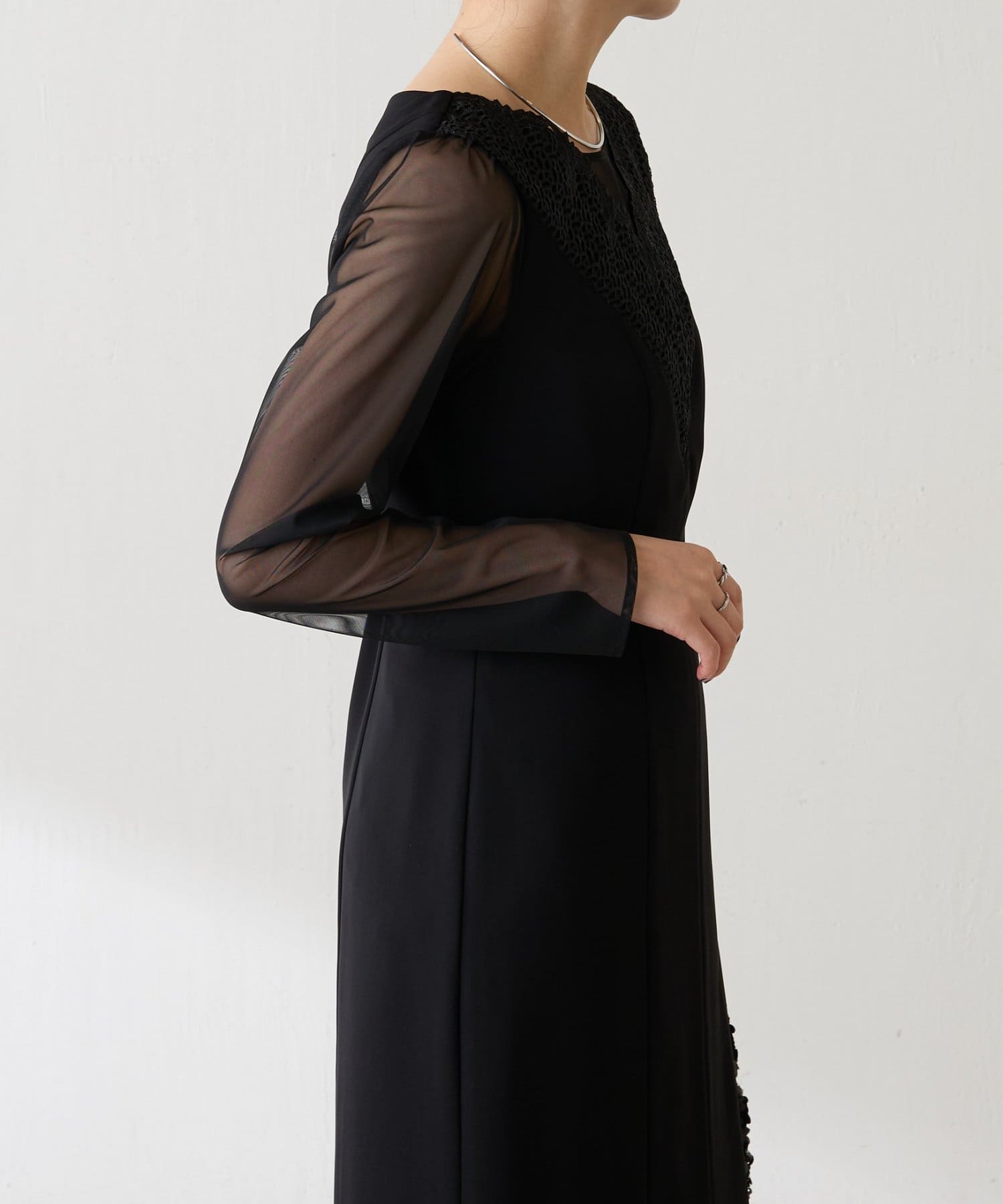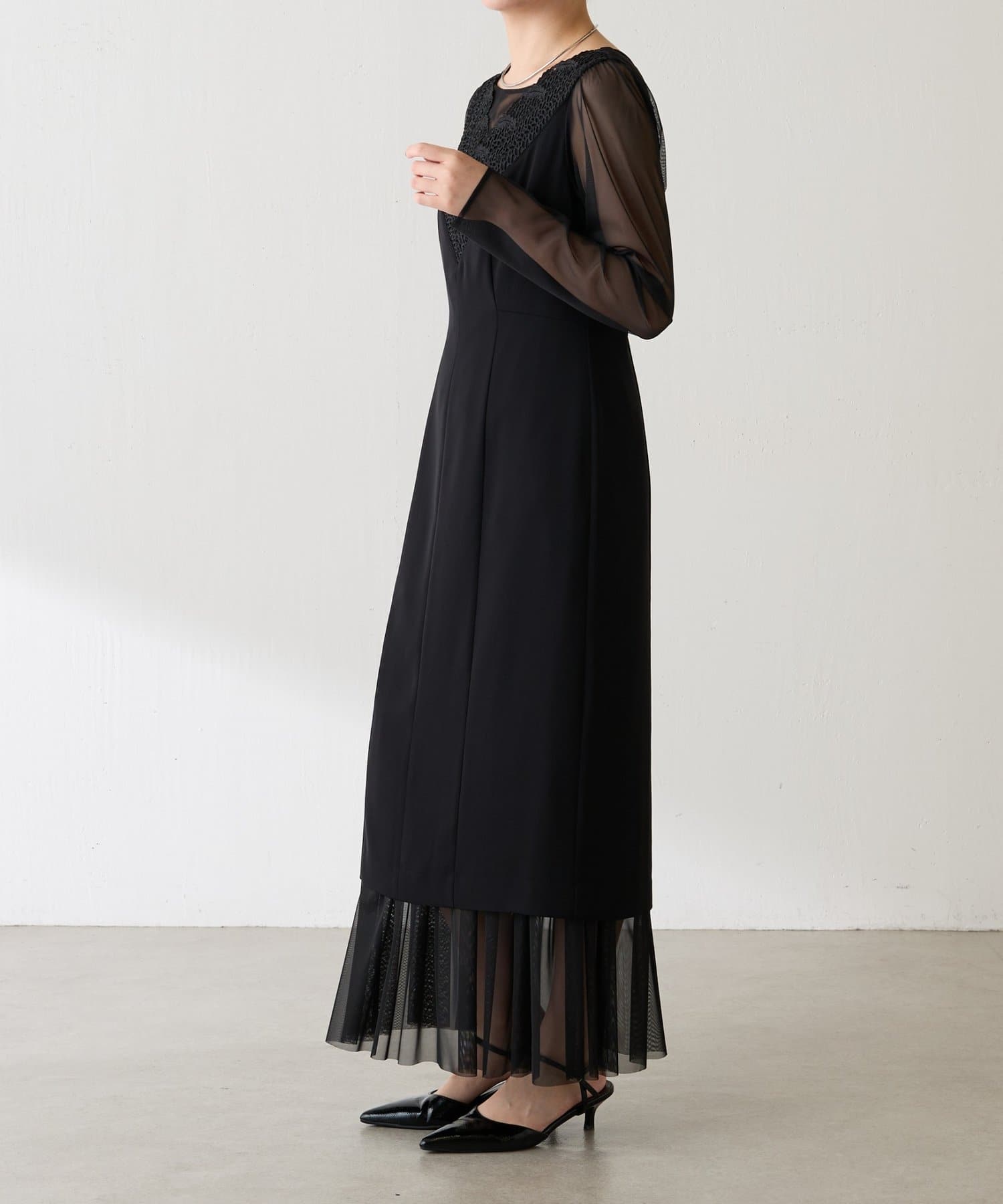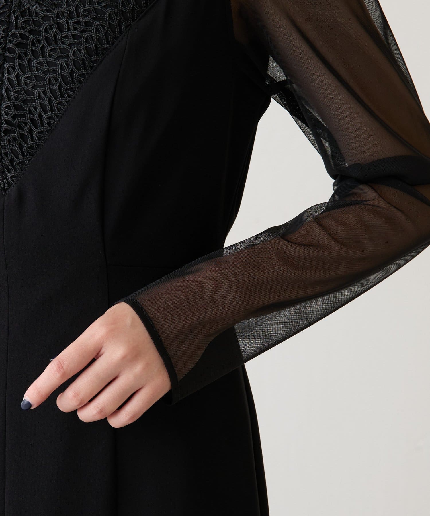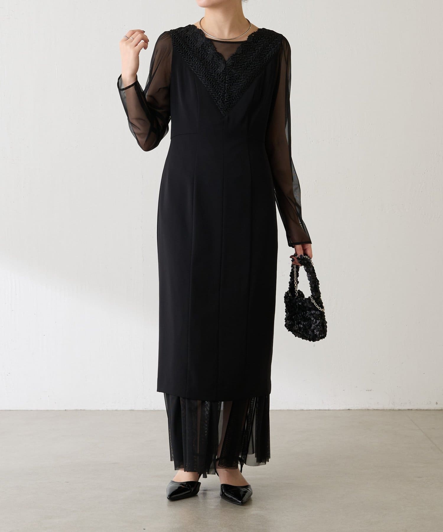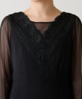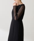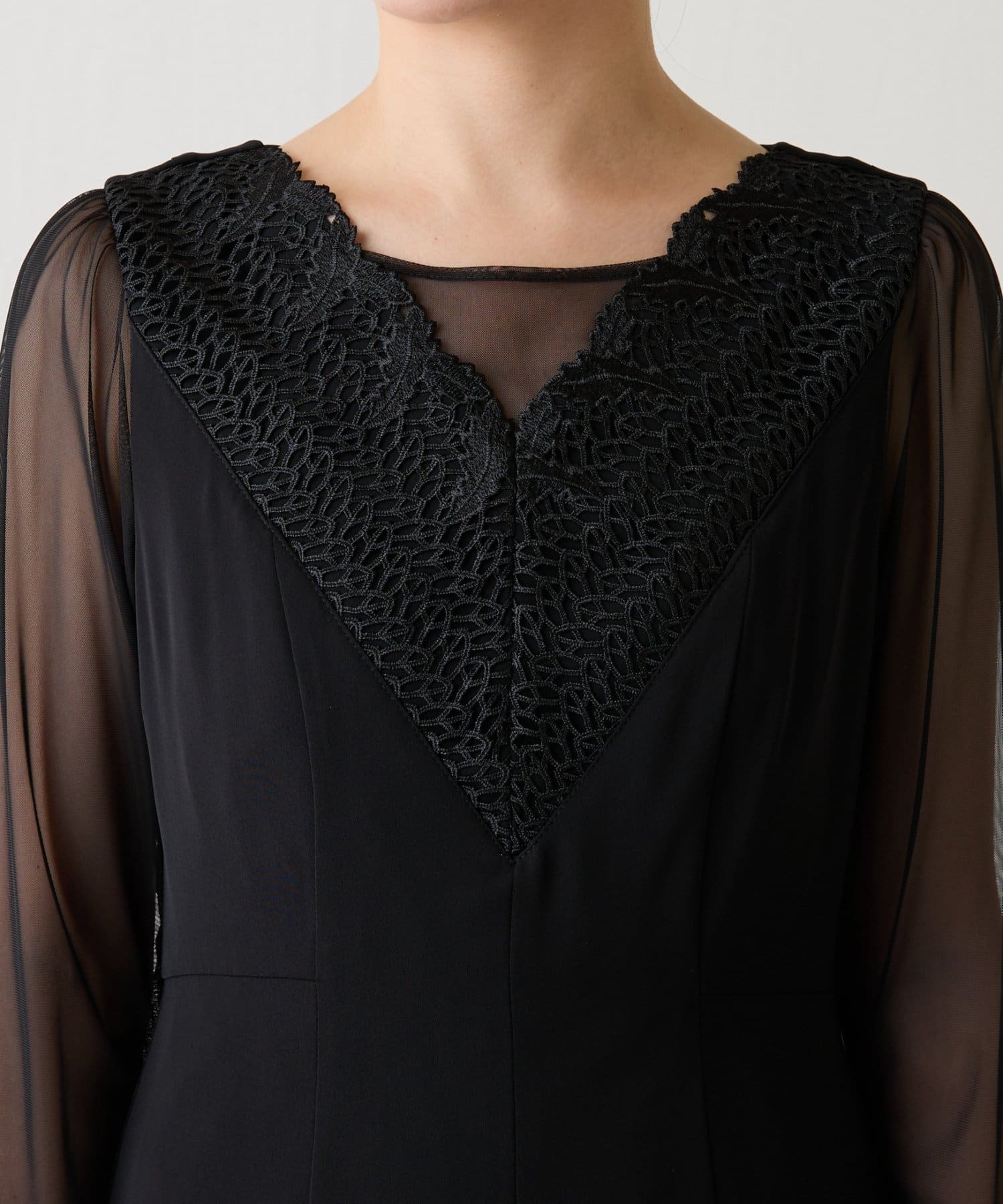 ・胸元のレースと程よい透け感のあるシアー素材がデコルテをきれいに見せてくれます。