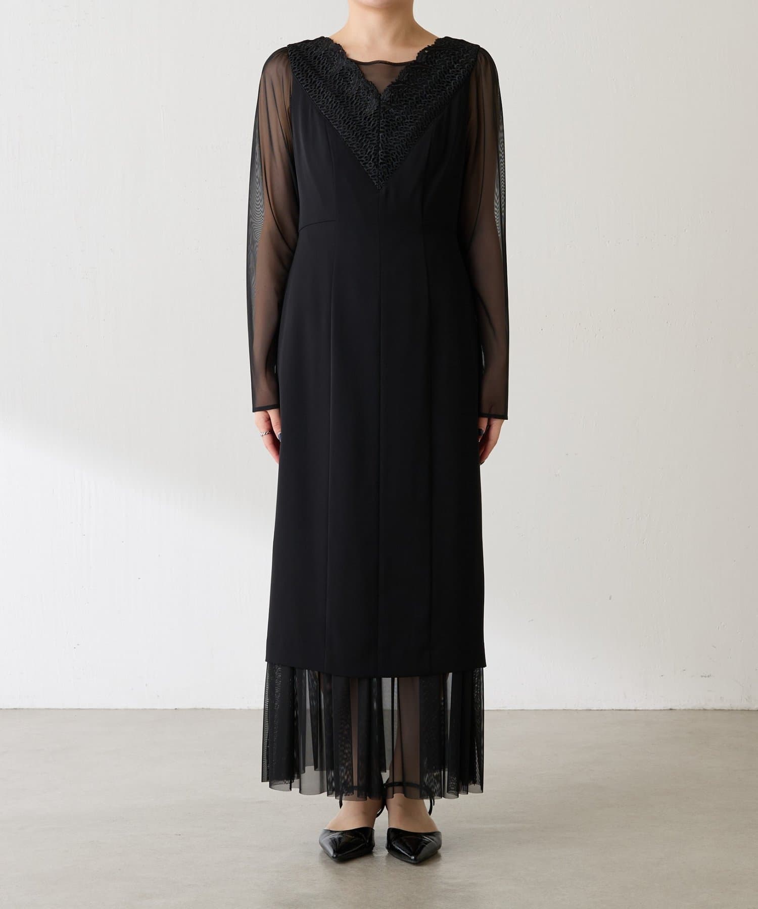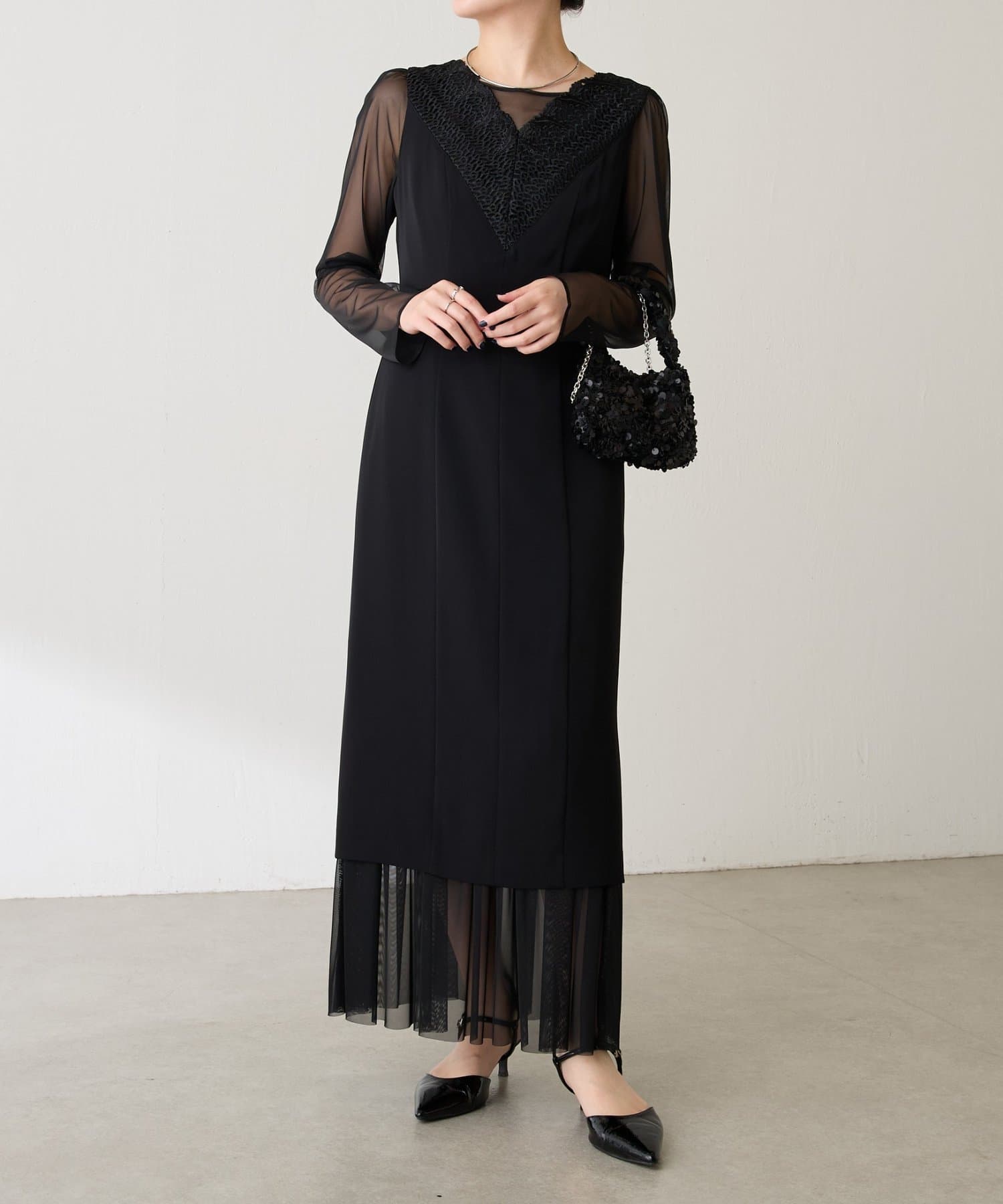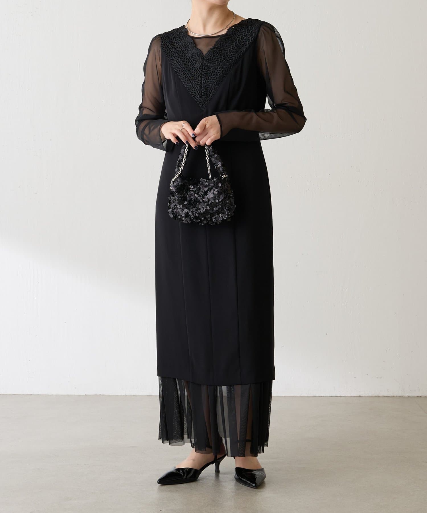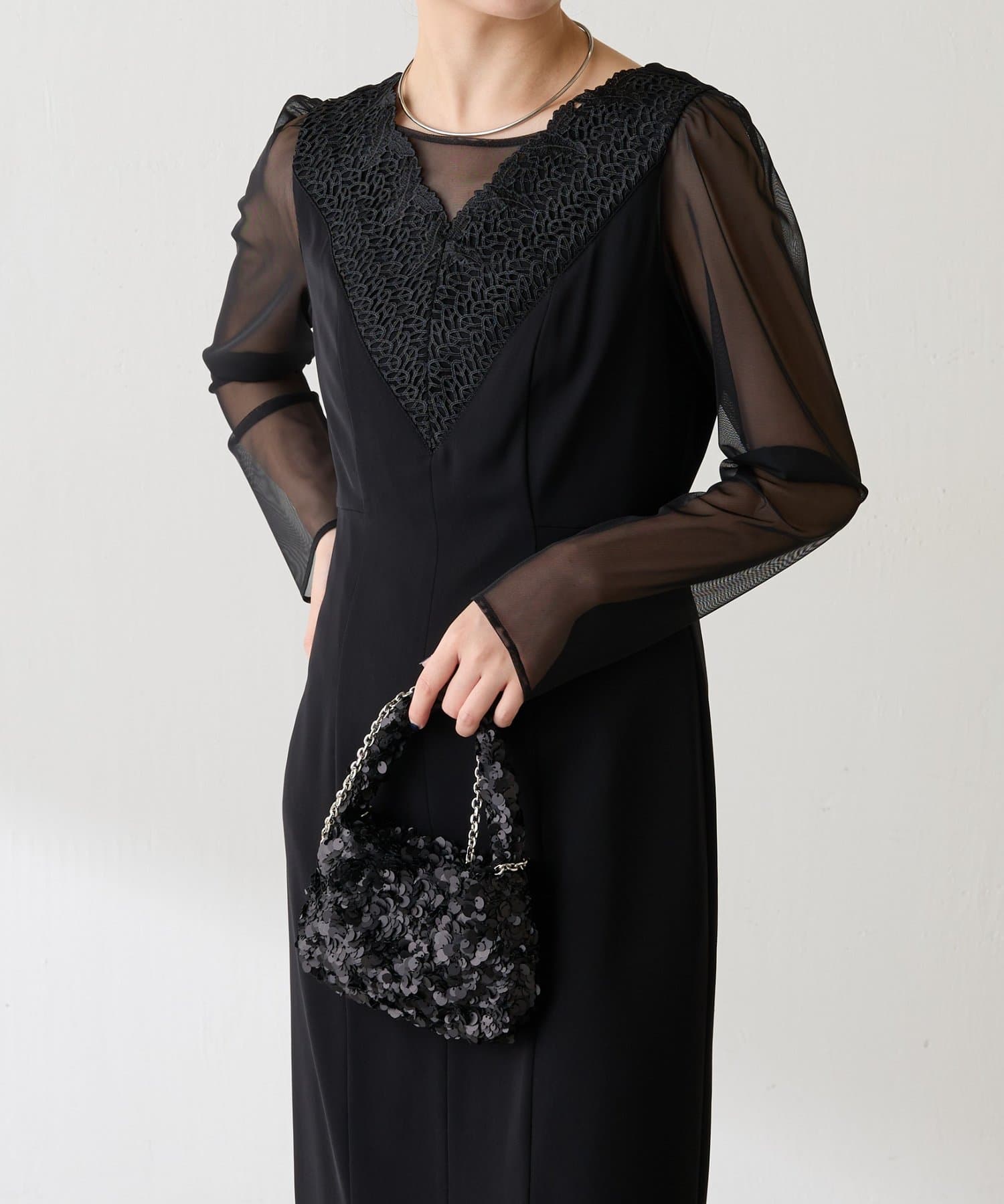 ・胸元のレースと程よい透け感のあるシアー素材がデコルテをきれいに見せてくれます。
