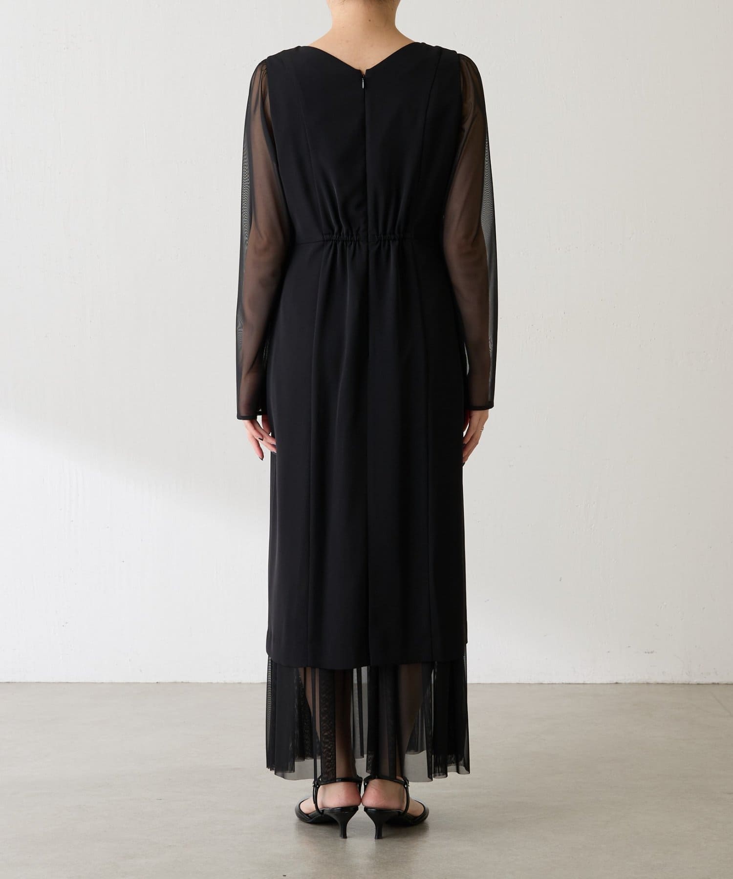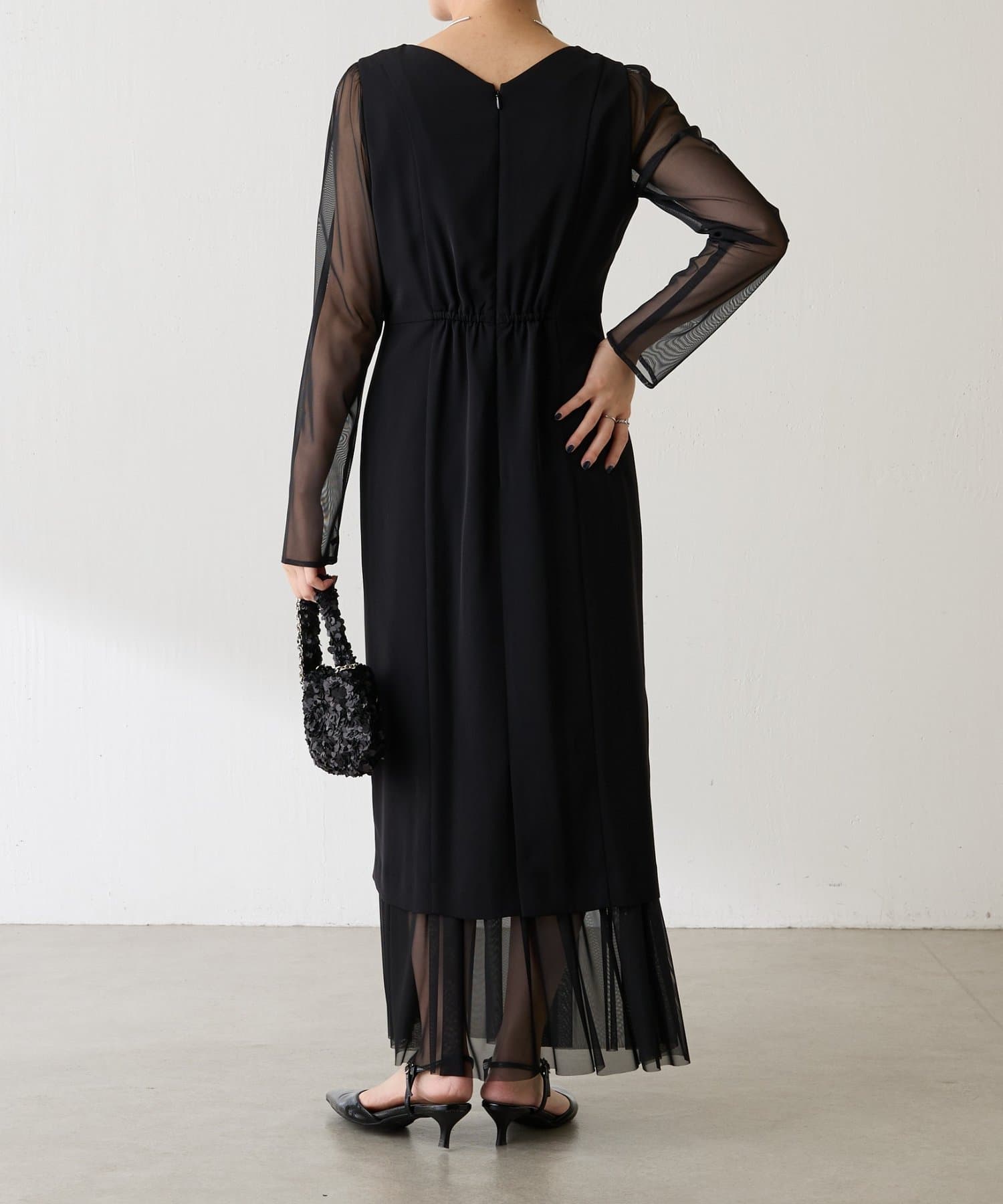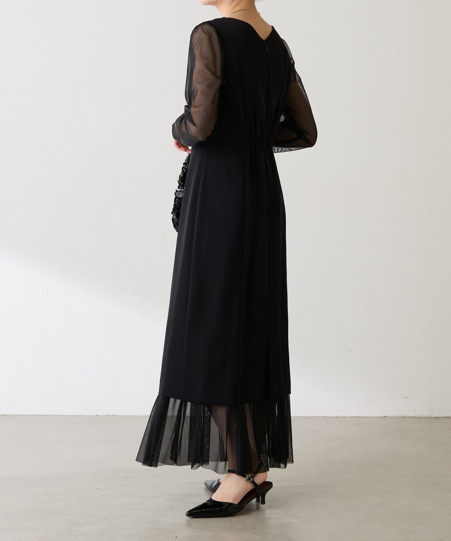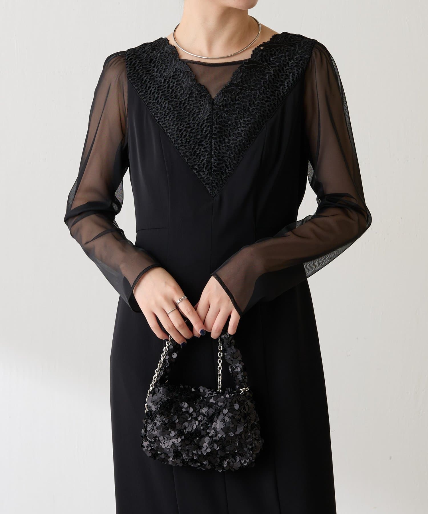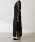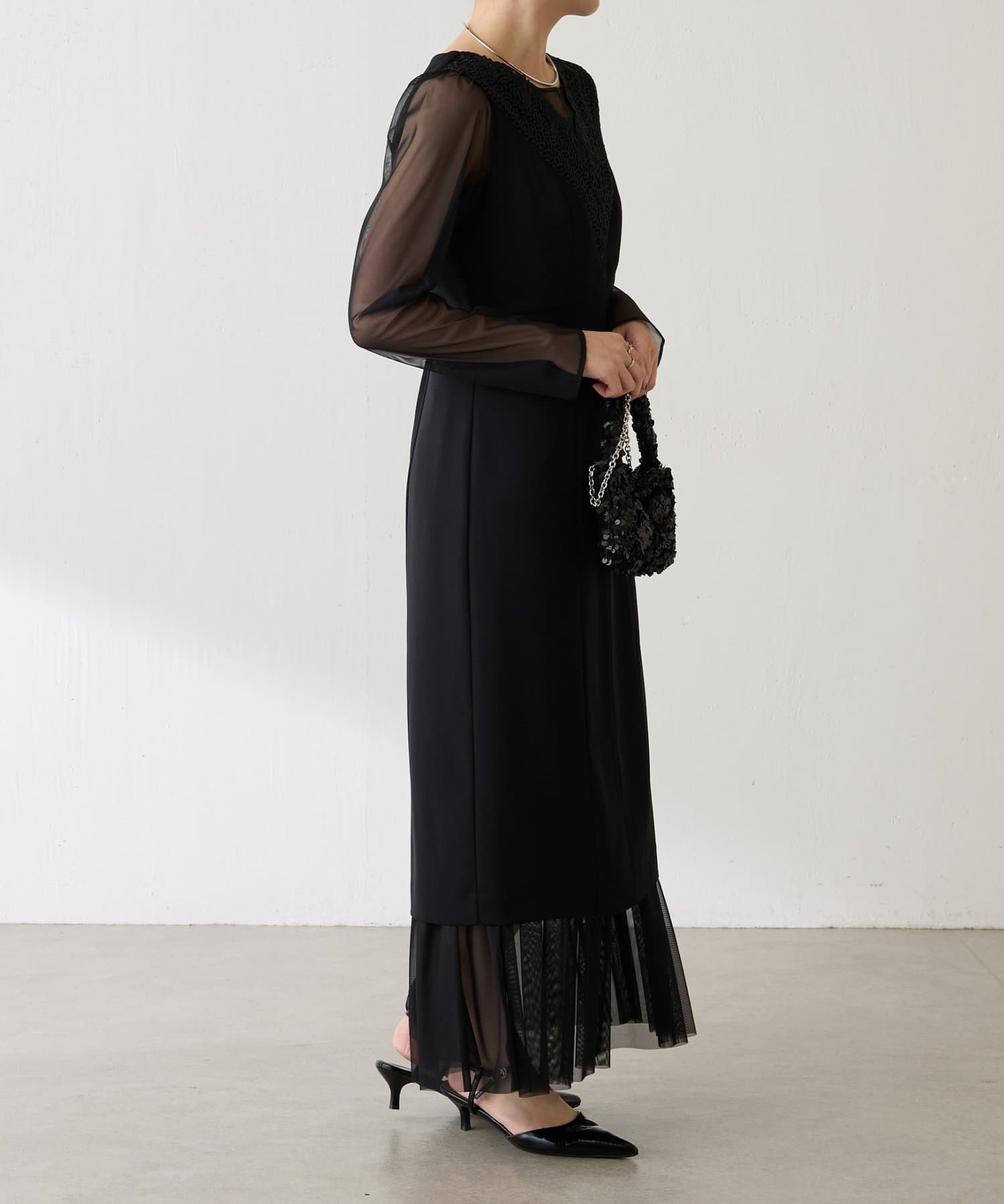 ・胸元のレースと程よい透け感のあるシアー素材がデコルテをきれいに見せてくれます。